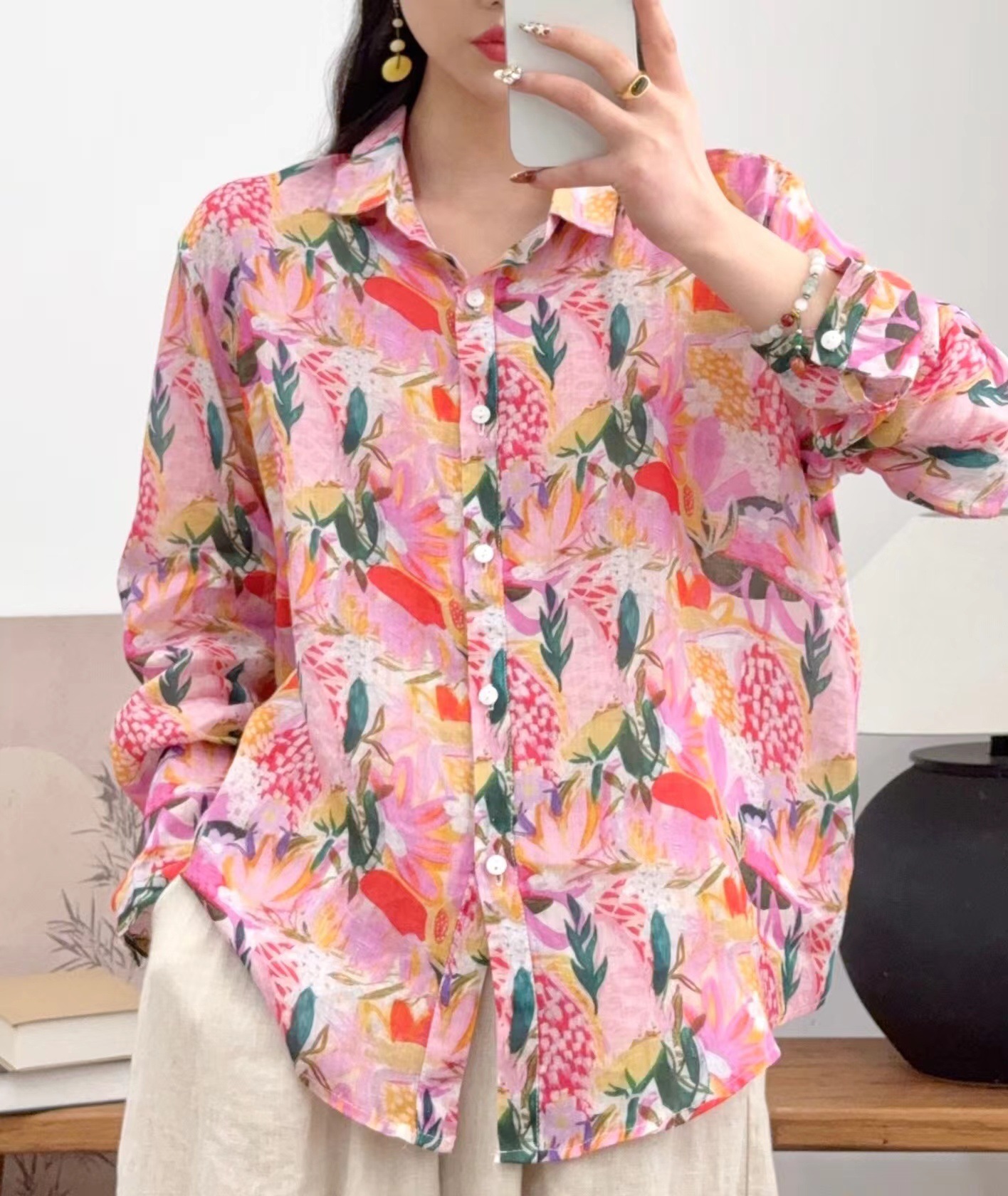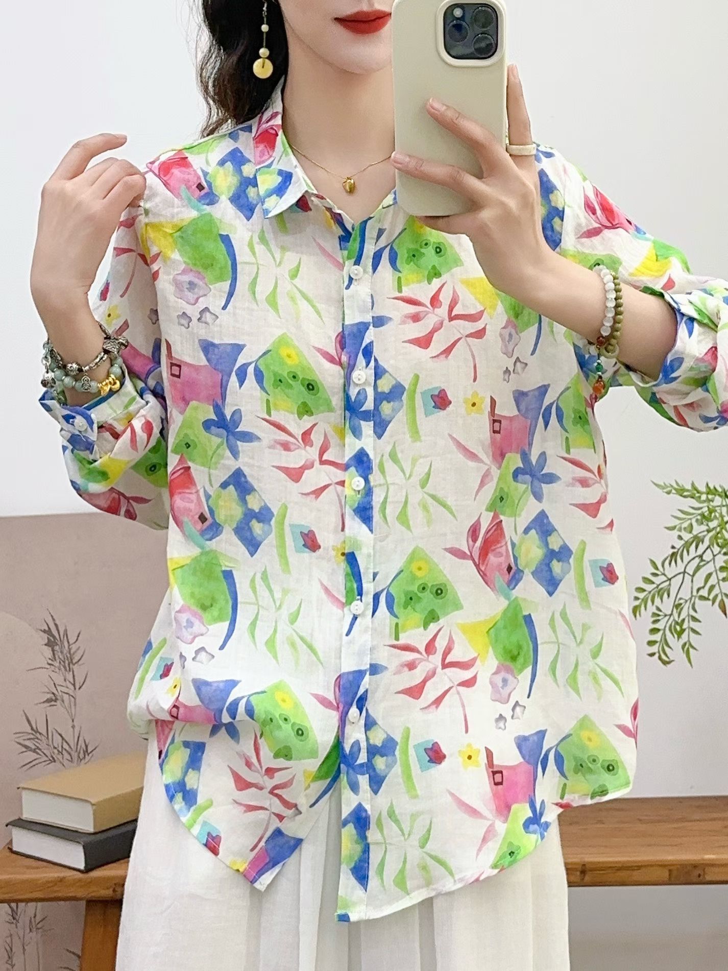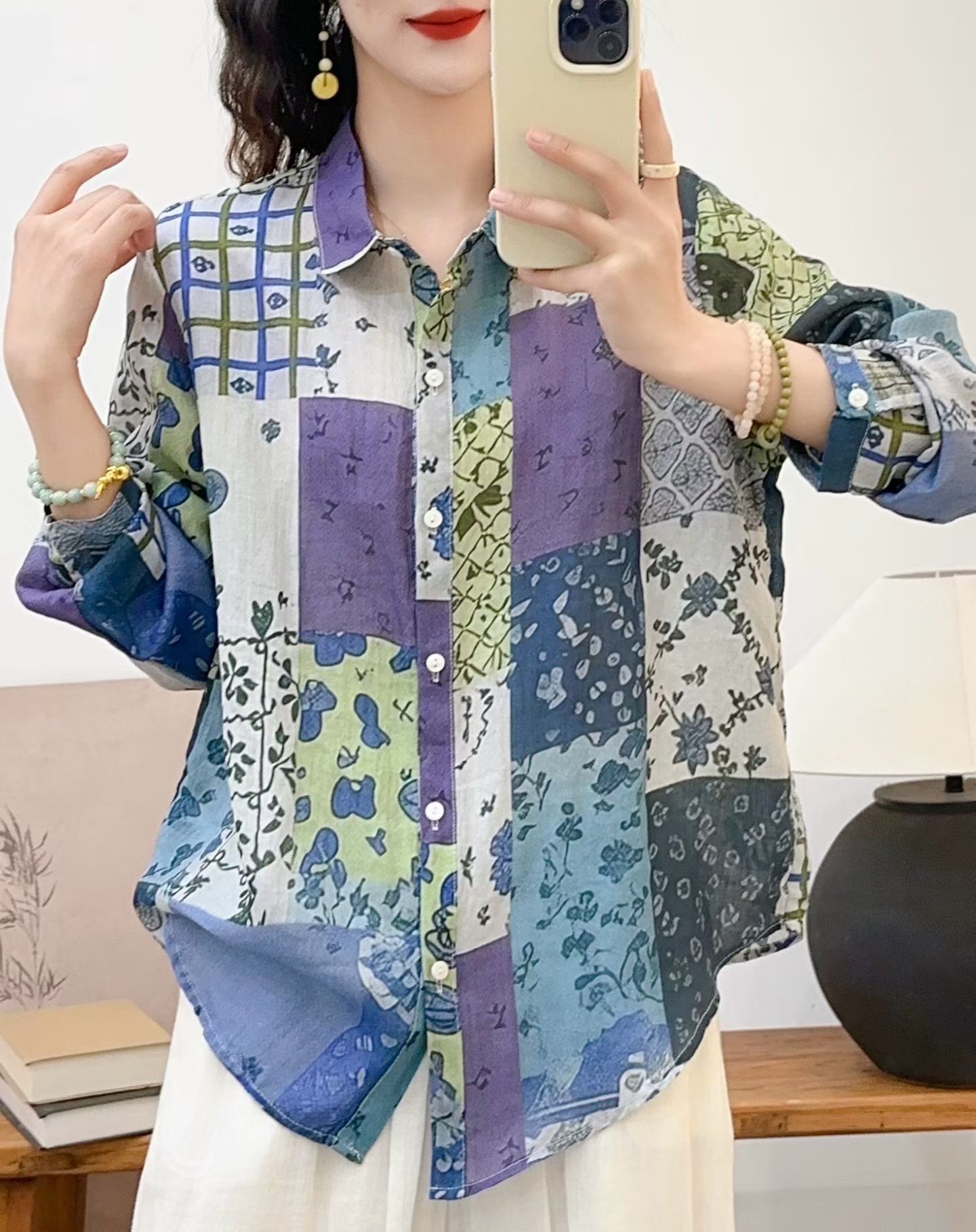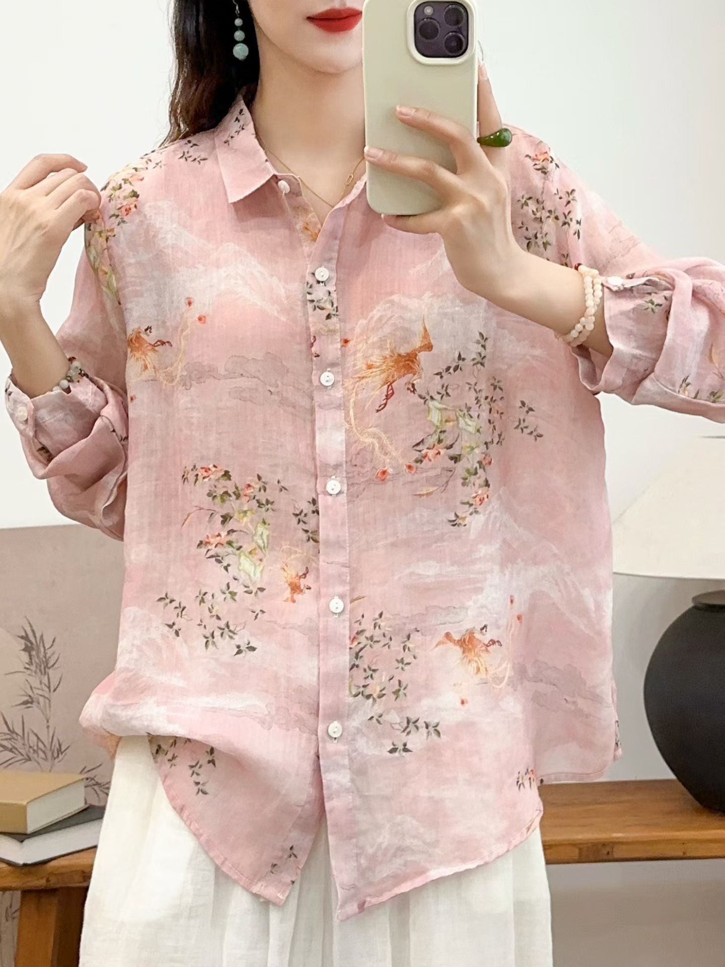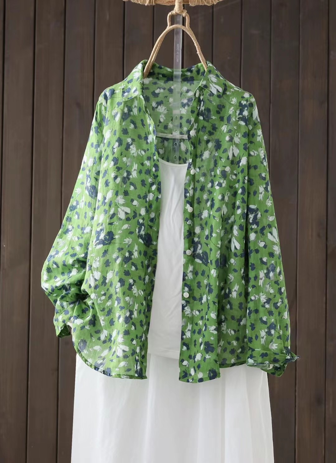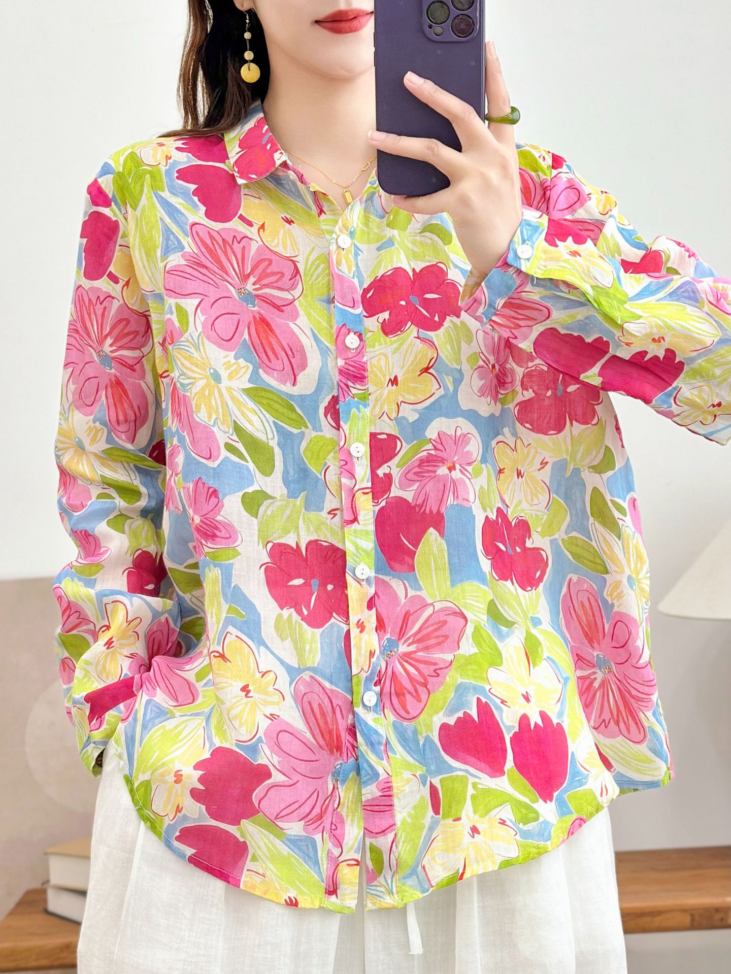 모리 소녀 예술적 라미 인쇄 셔츠 긴팔 여성용 옷깃 꽃 탑베이스 셔츠 라미 셔츠 탑 여성 의류스토어 가기