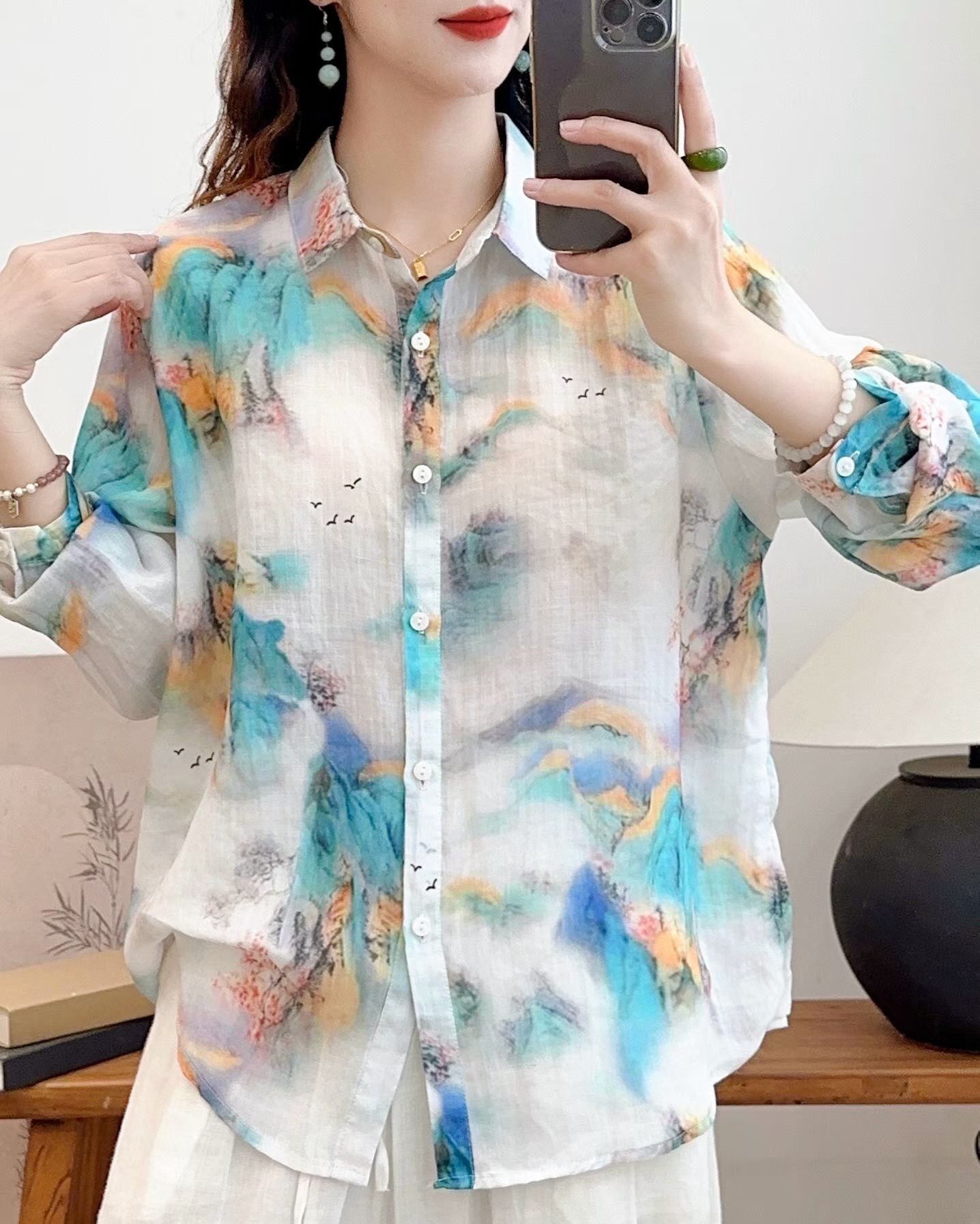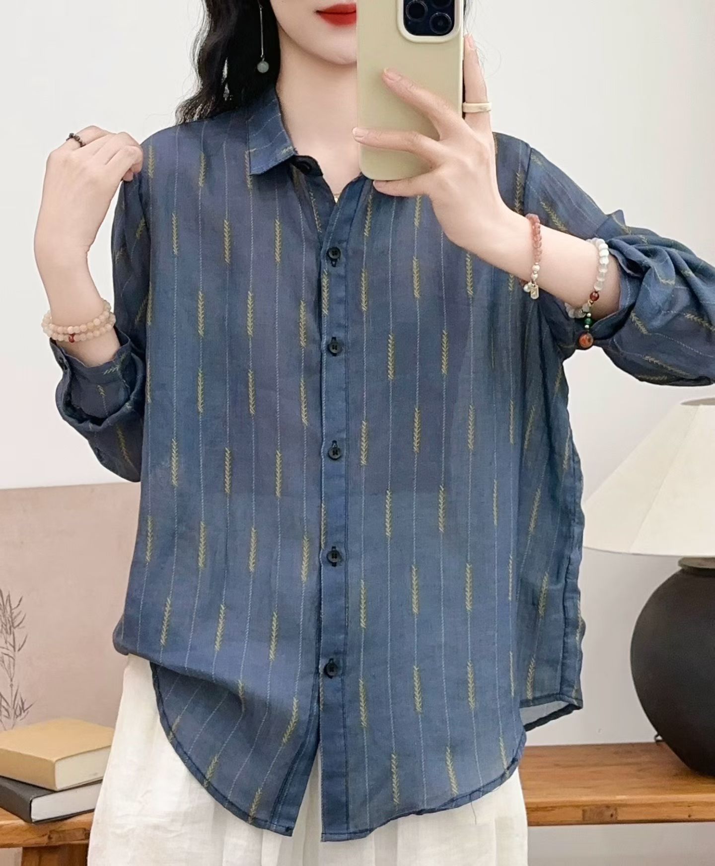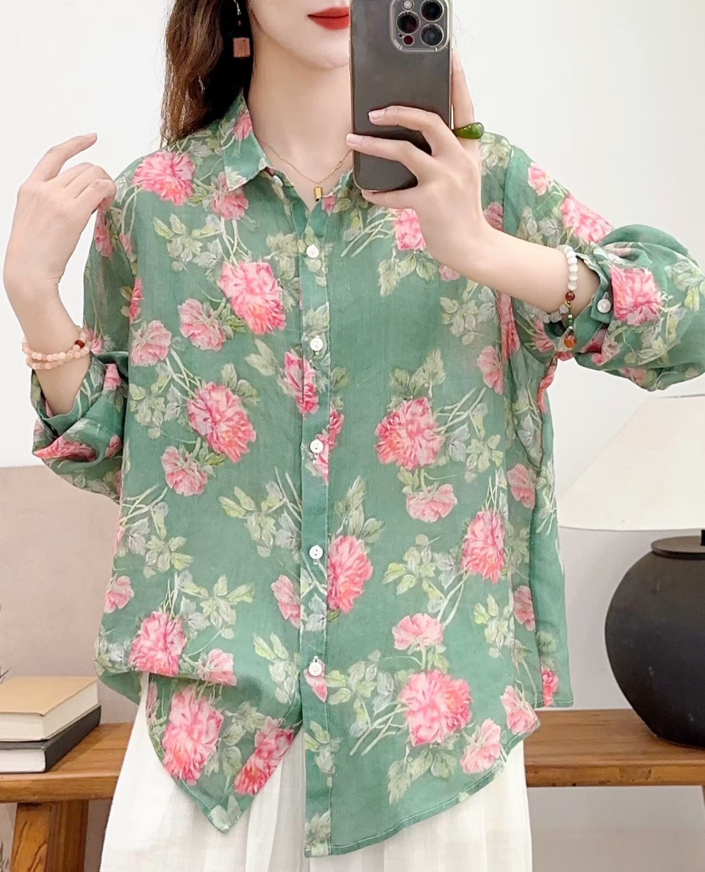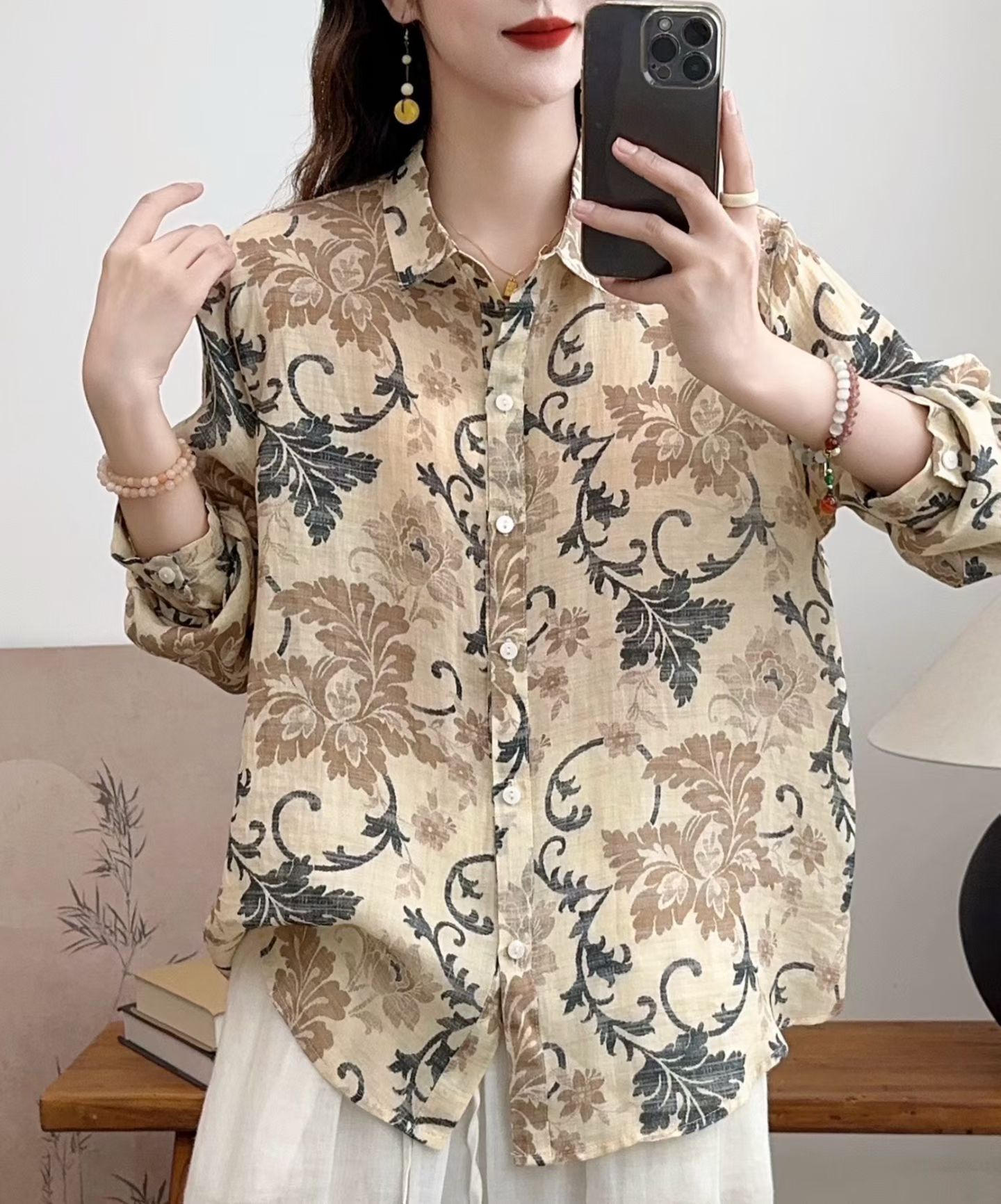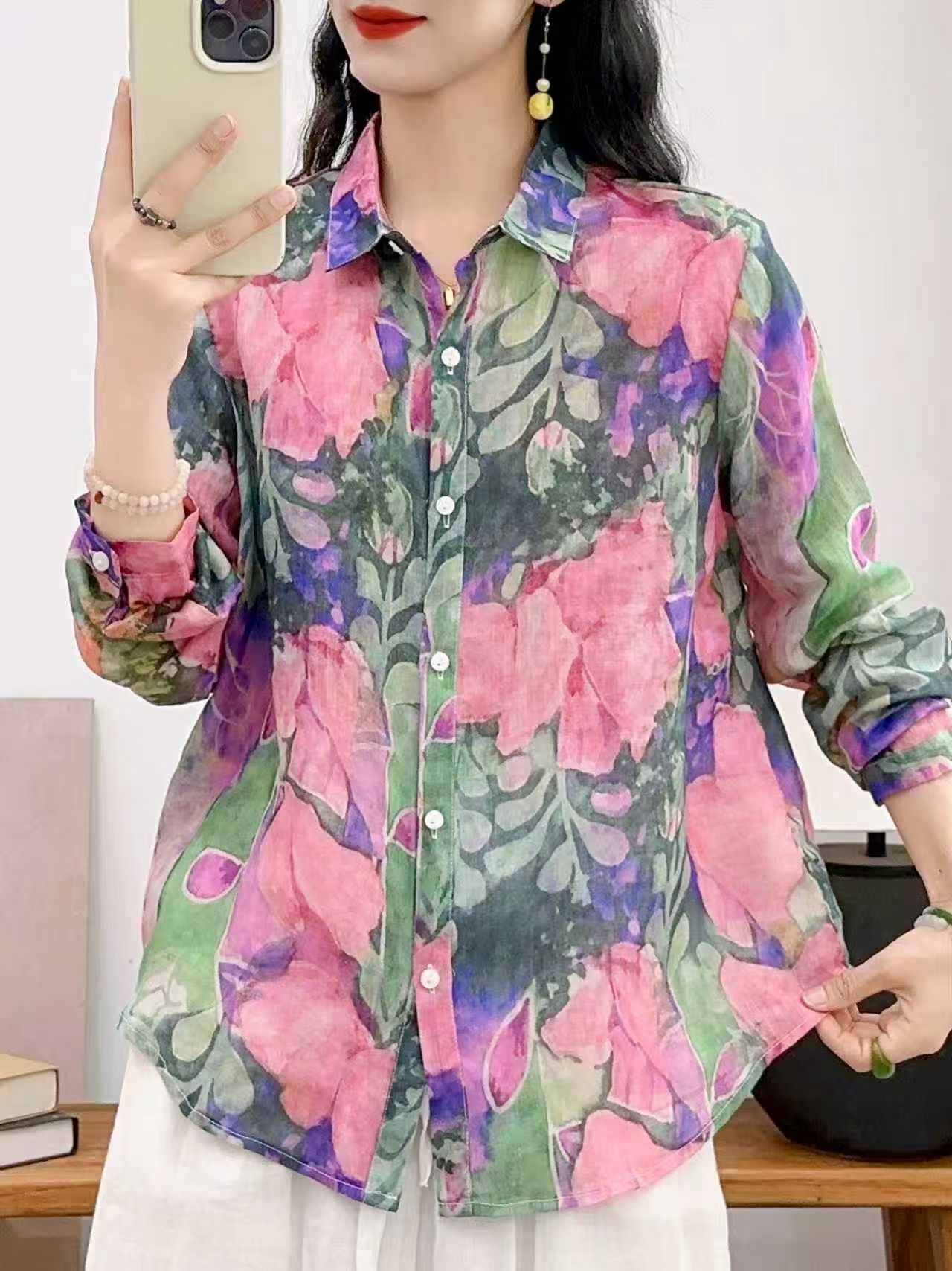 모리 소녀 예술적 라미 인쇄 셔츠 긴팔 여성용 옷깃 꽃 탑베이스 셔츠 라미 셔츠 탑 여성 의류스토어 가기