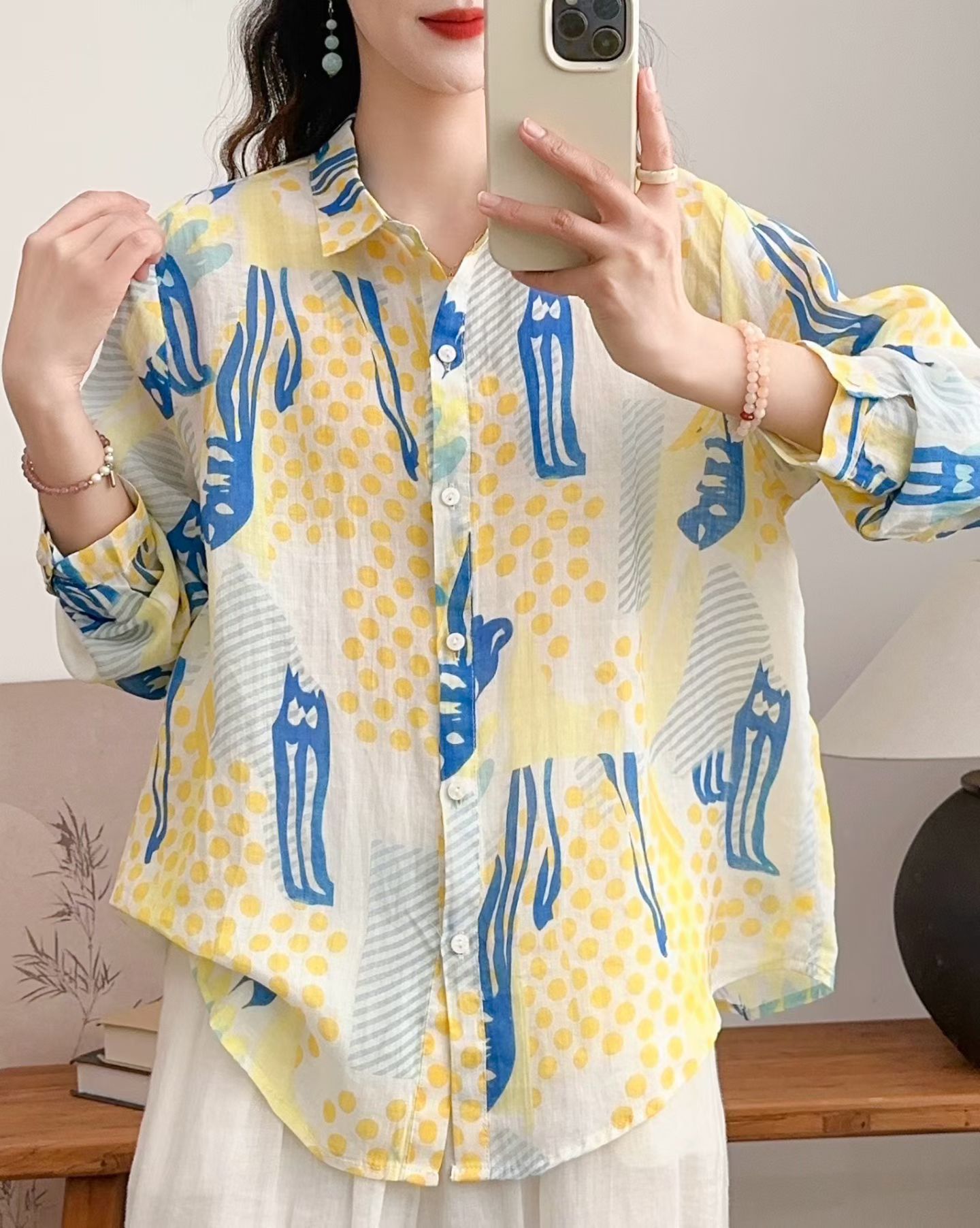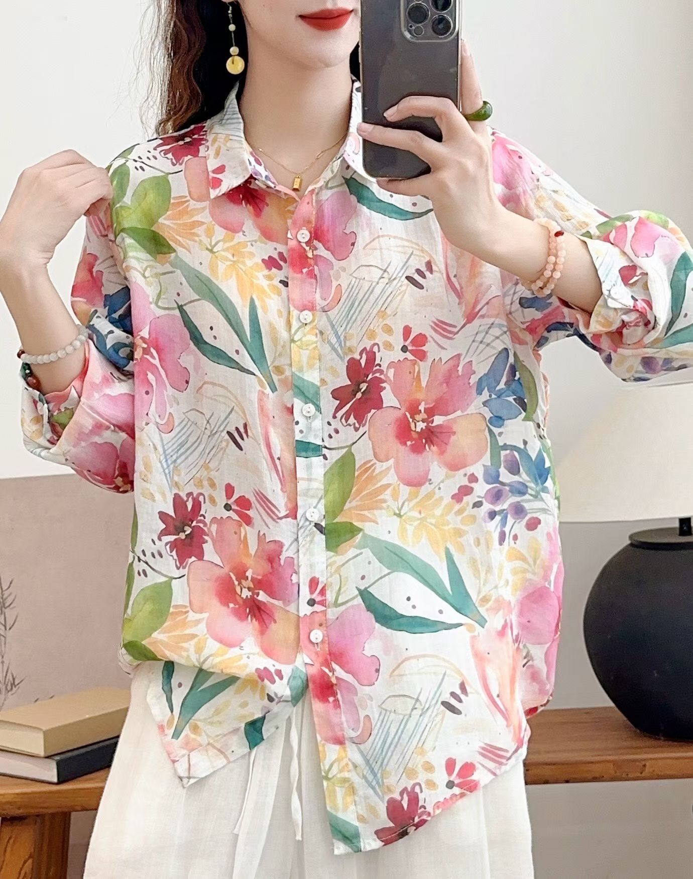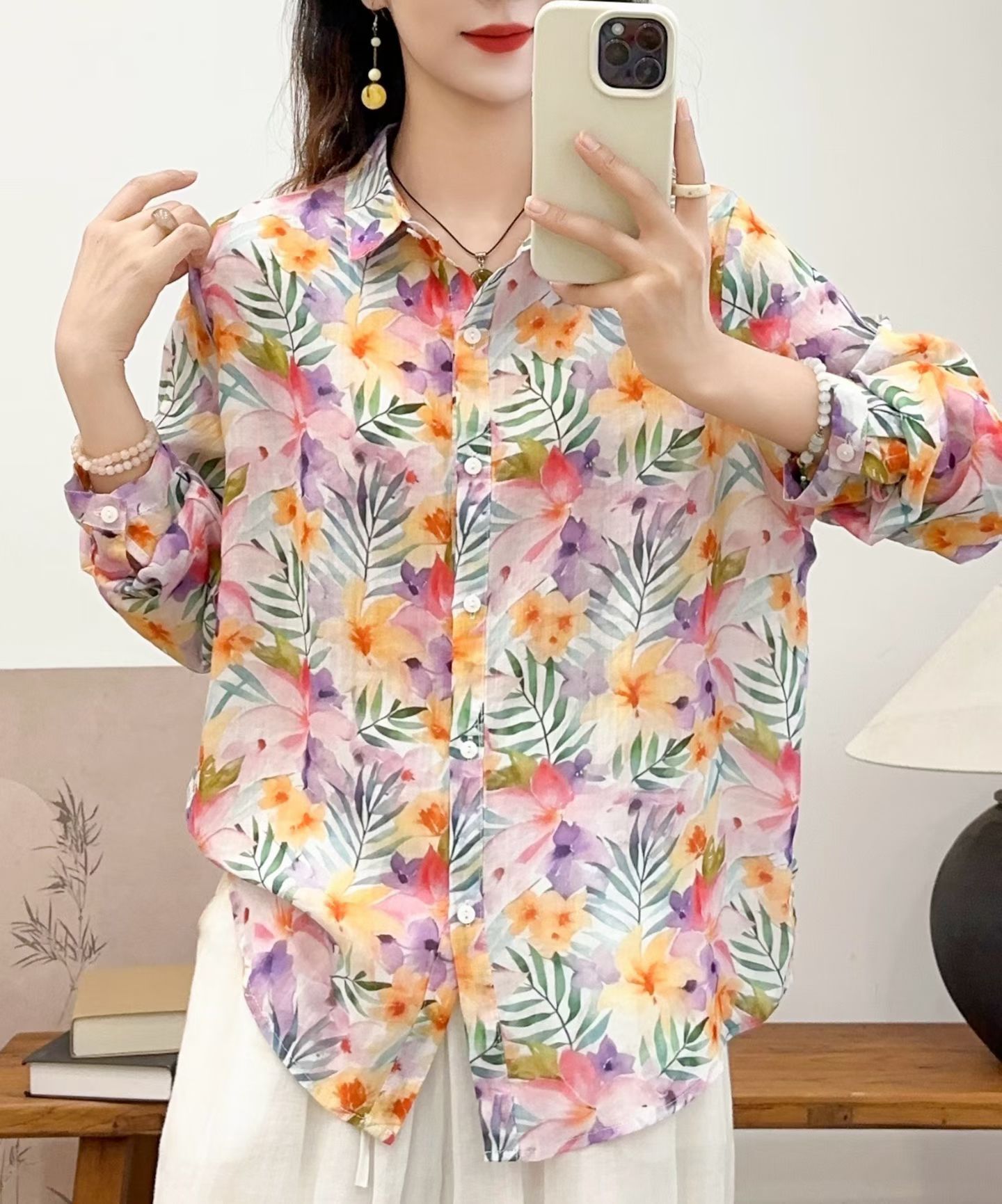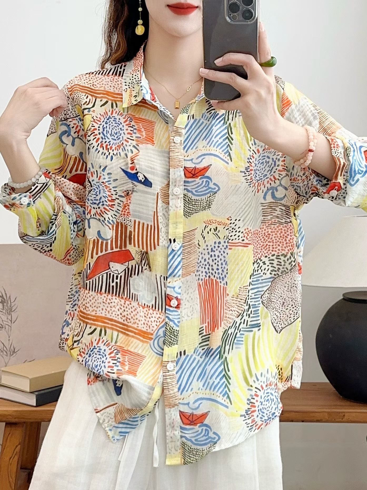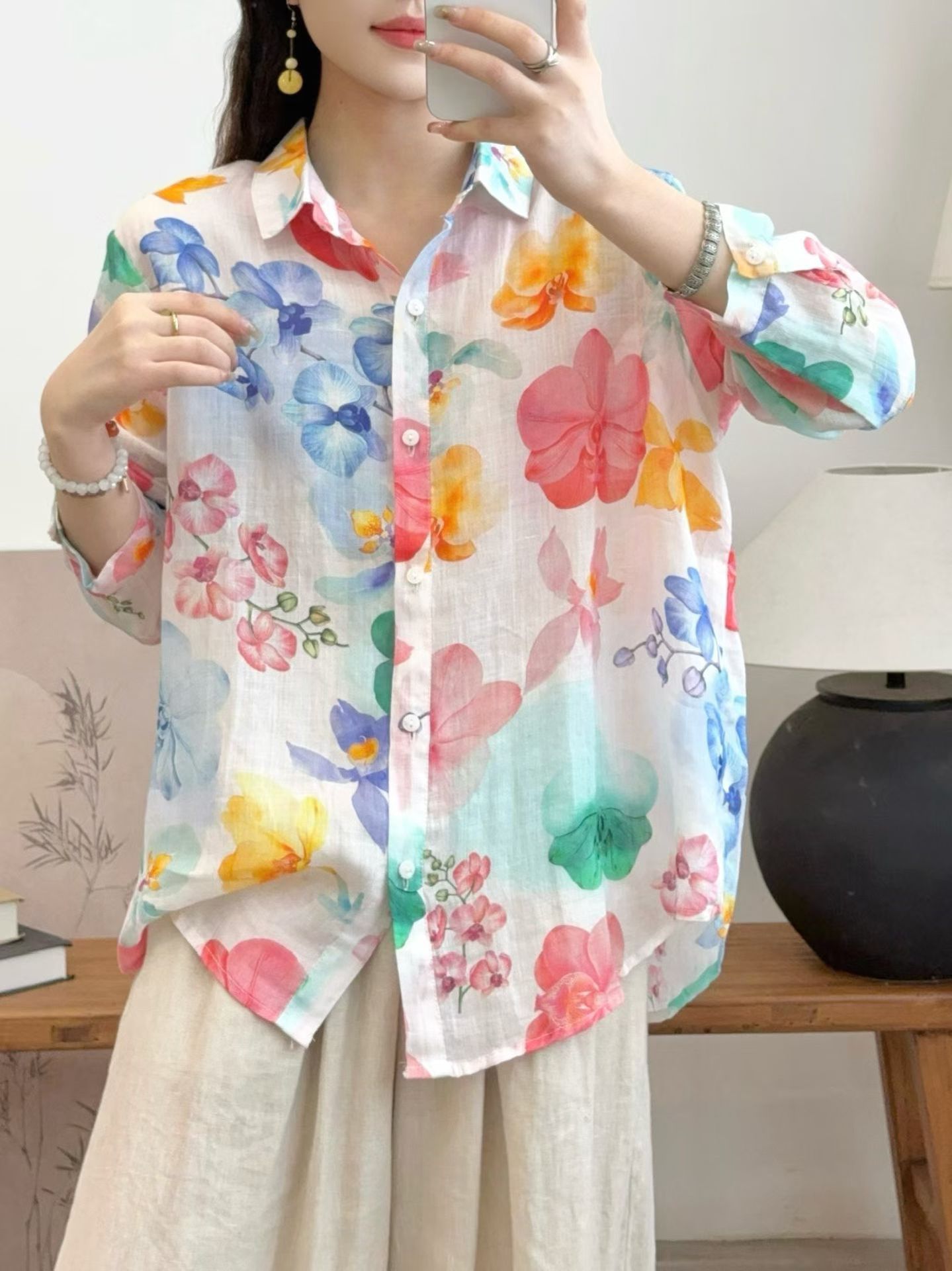 모리 소녀 예술적 라미 인쇄 셔츠 긴팔 여성용 옷깃 꽃 탑베이스 셔츠 라미 셔츠 탑 여성 의류스토어 가기