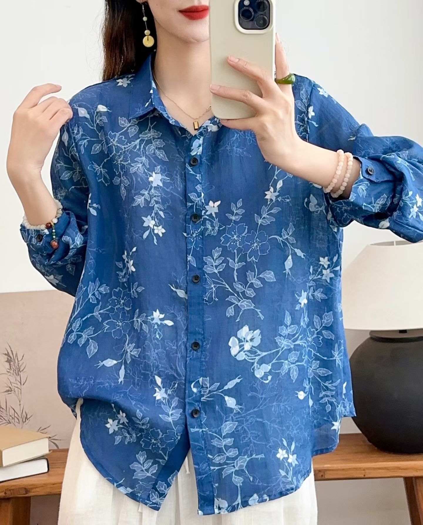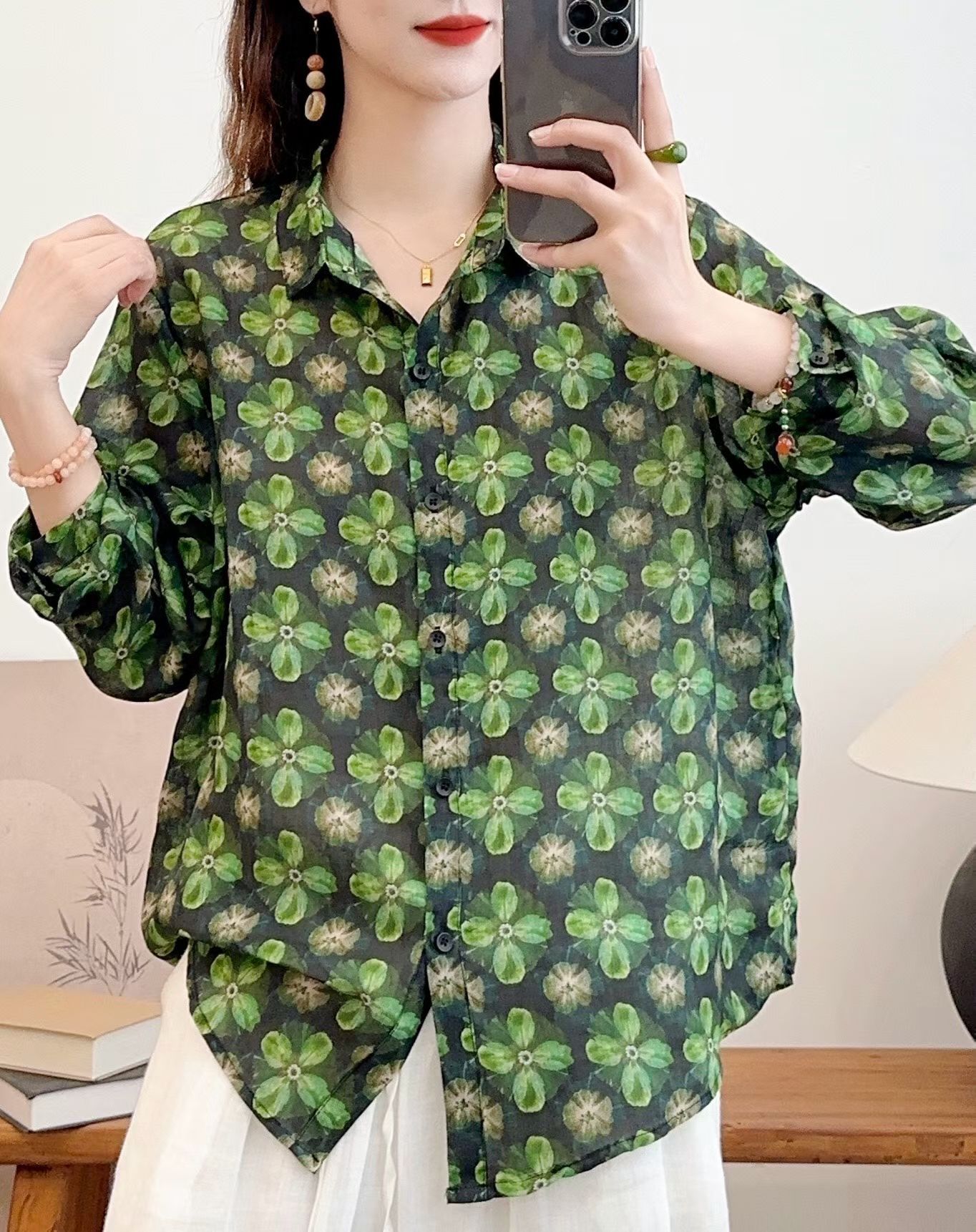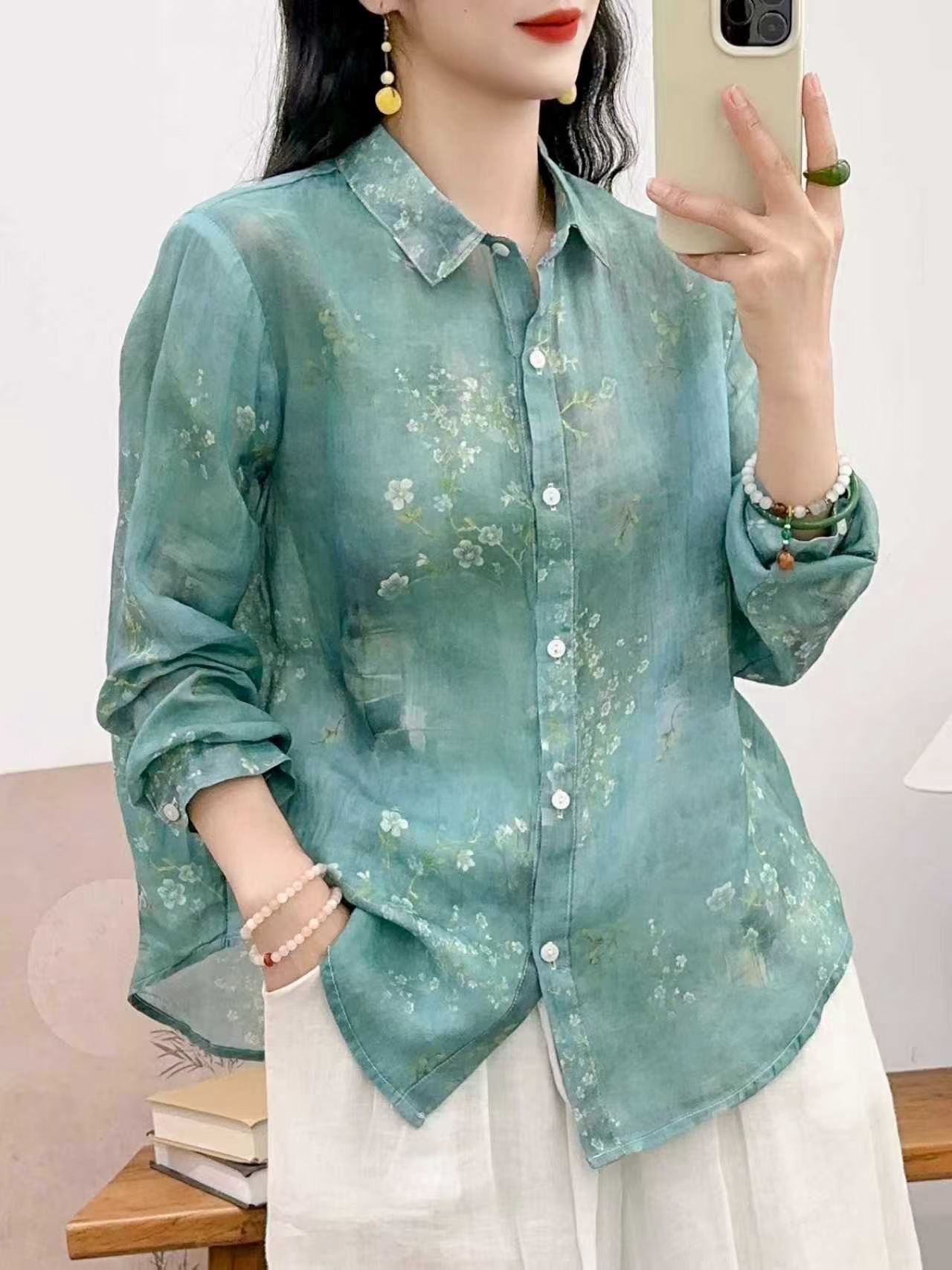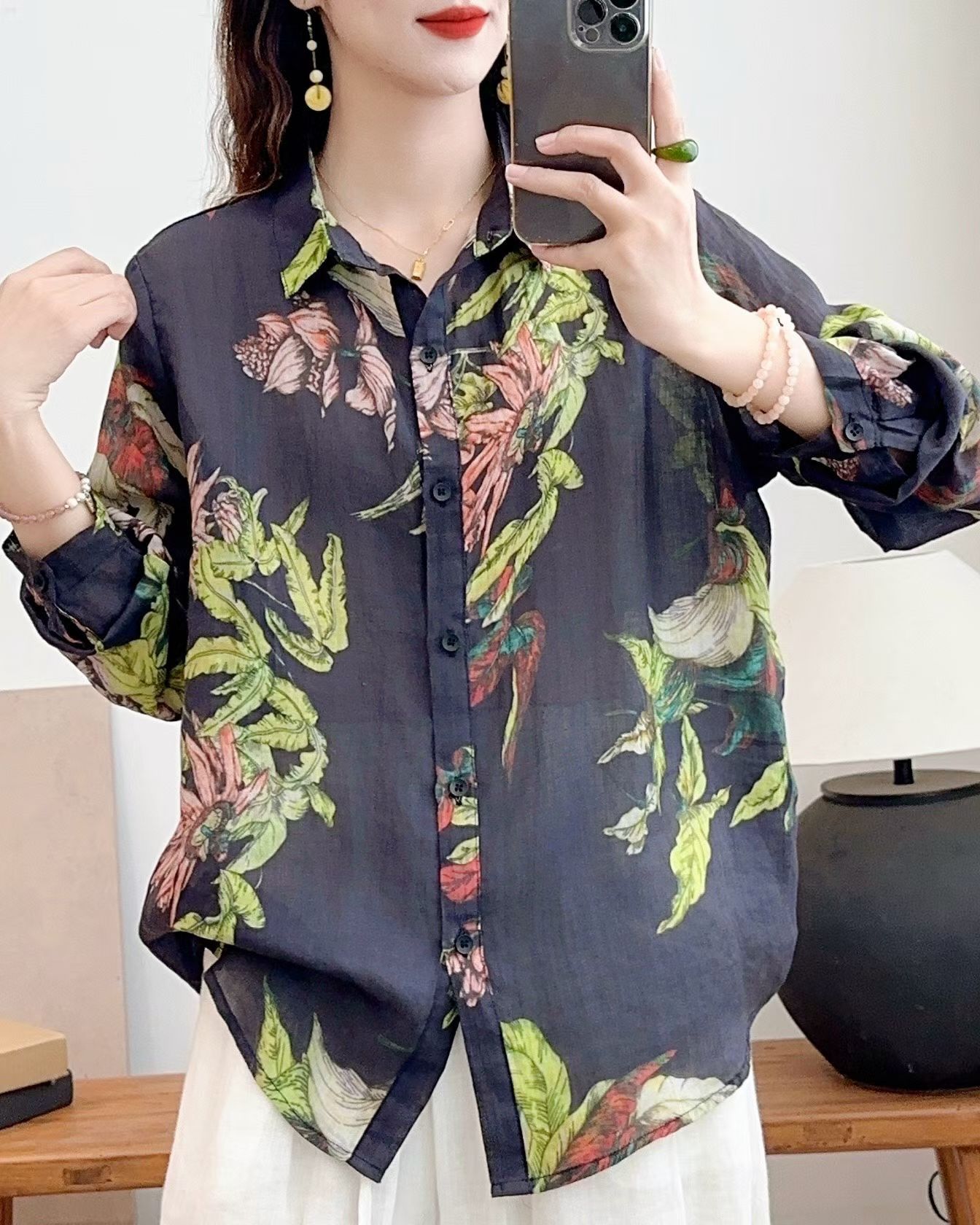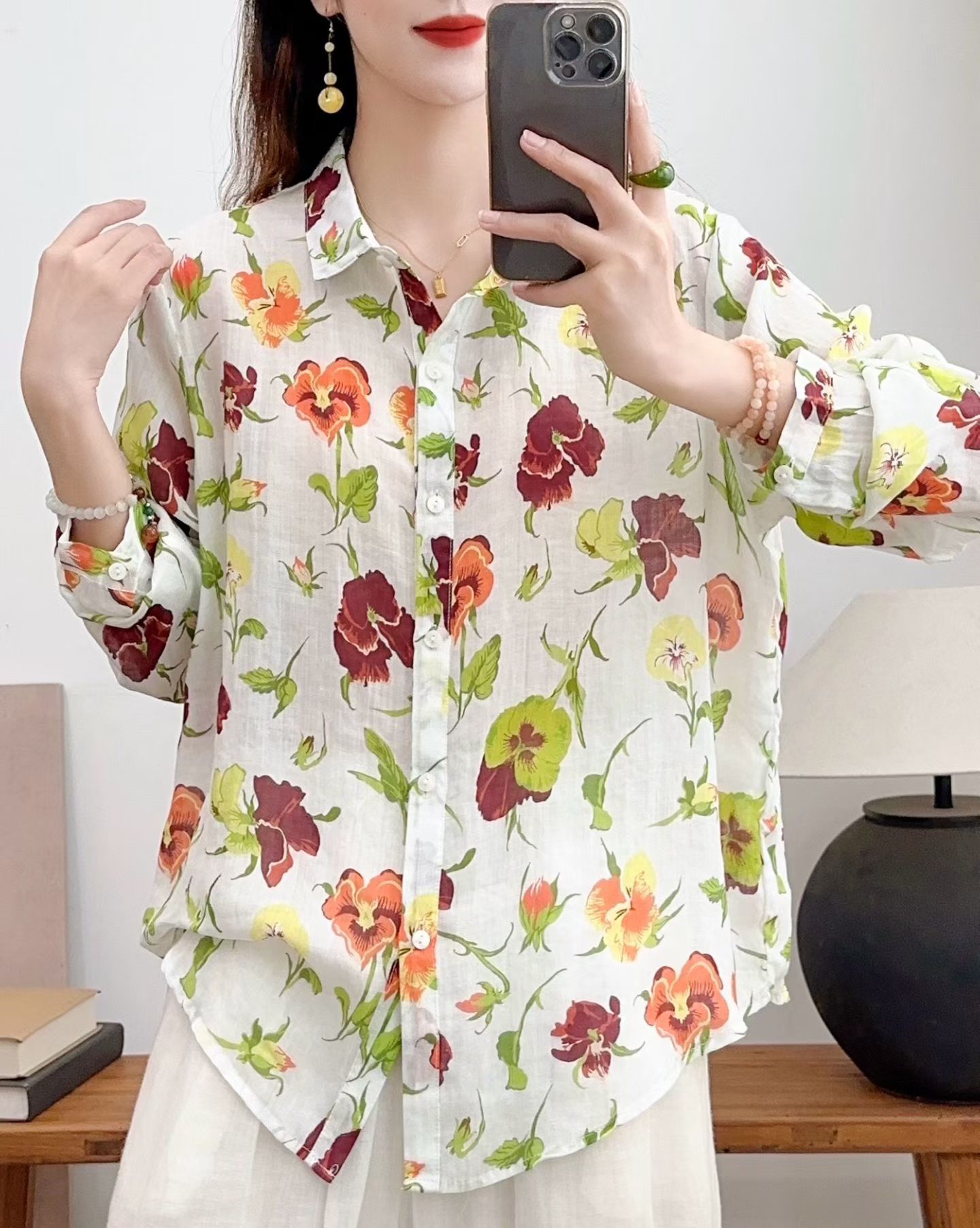 모리 소녀 예술적 라미 인쇄 셔츠 긴팔 여성용 옷깃 꽃 탑베이스 셔츠 라미 셔츠 탑 여성 의류스토어 가기