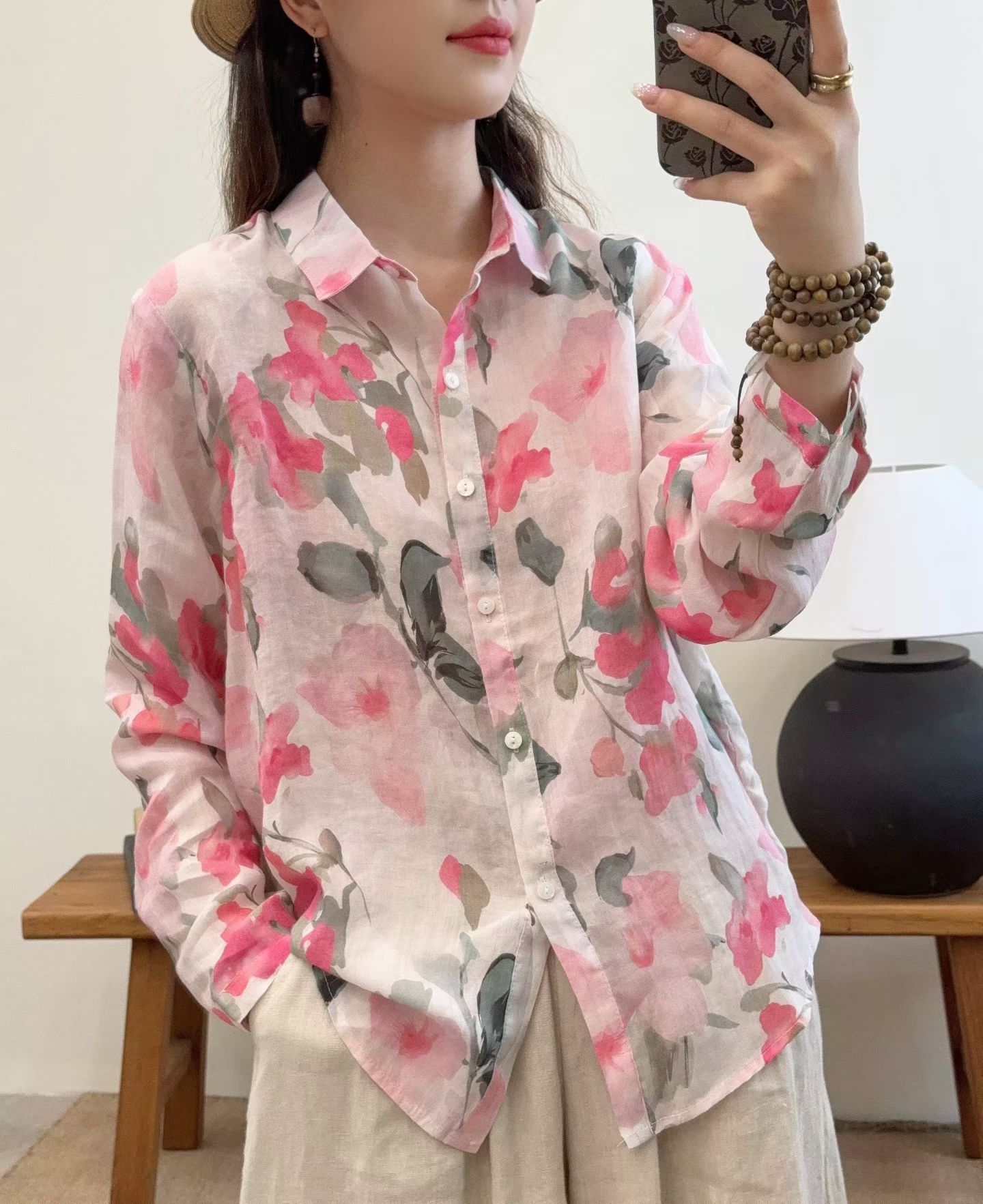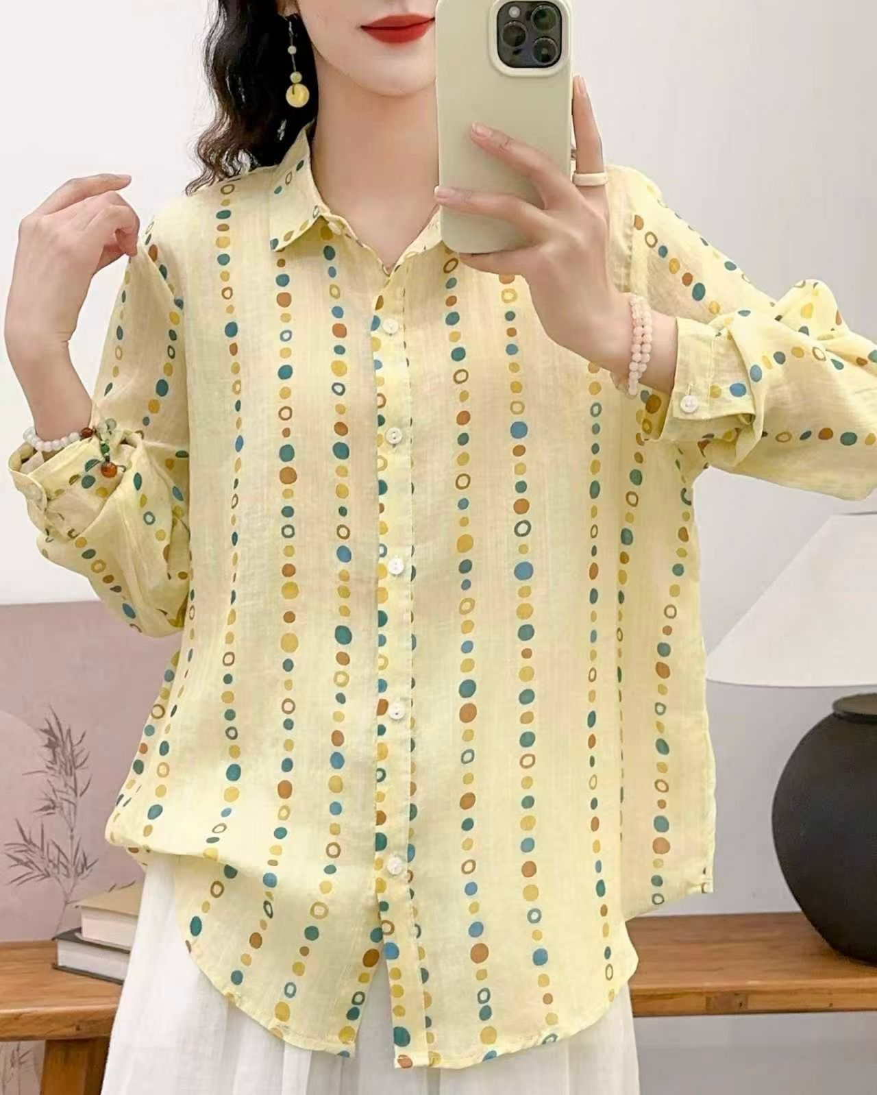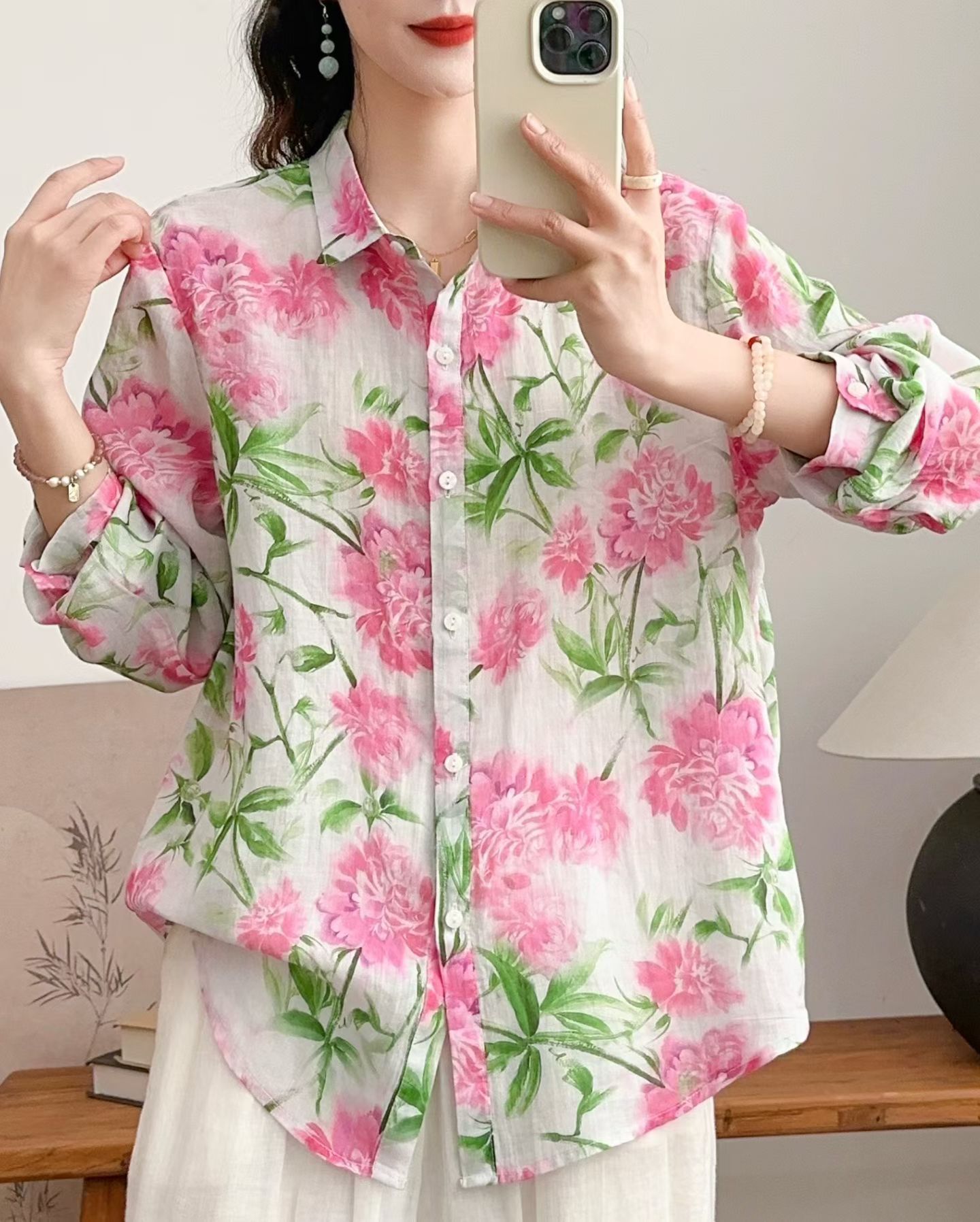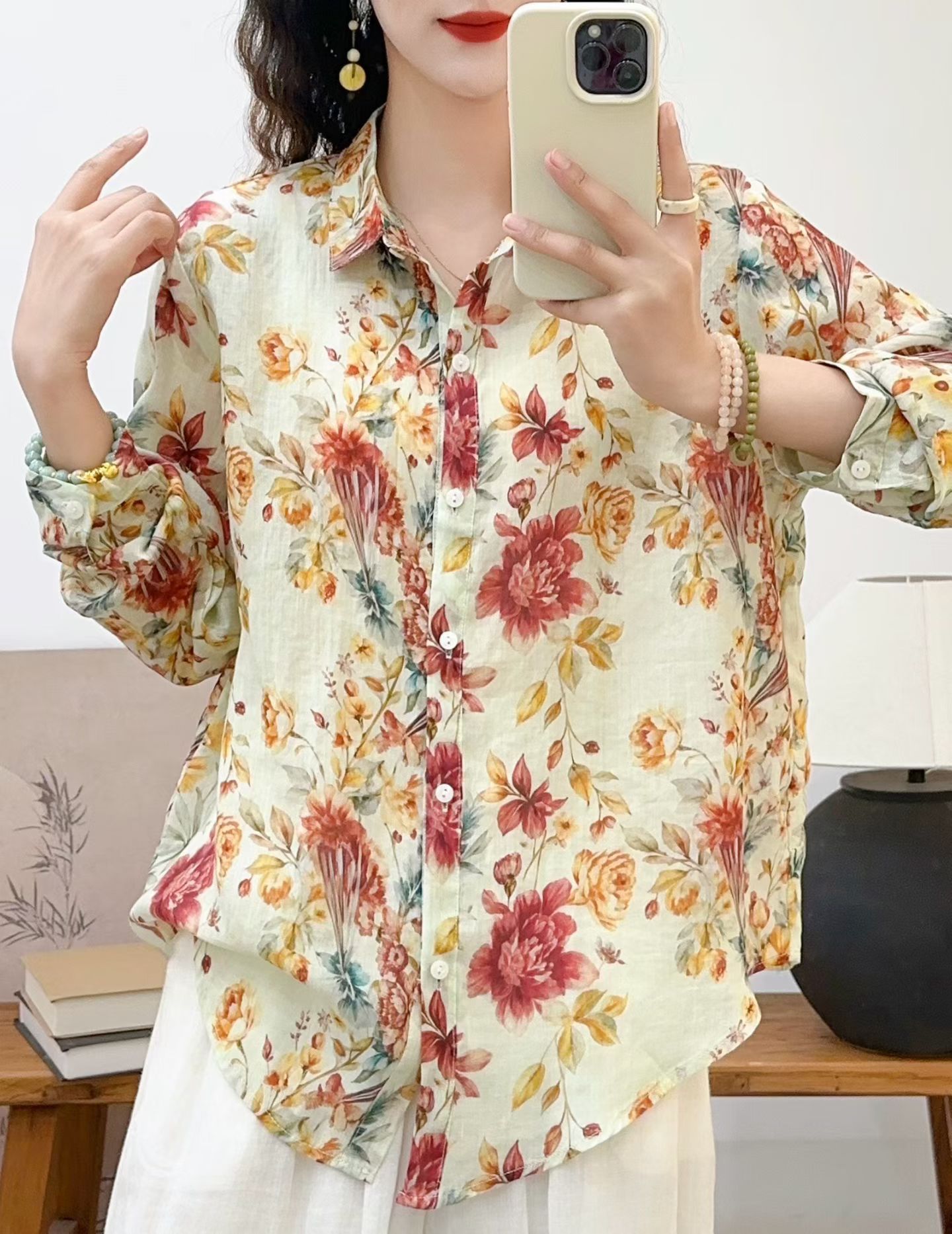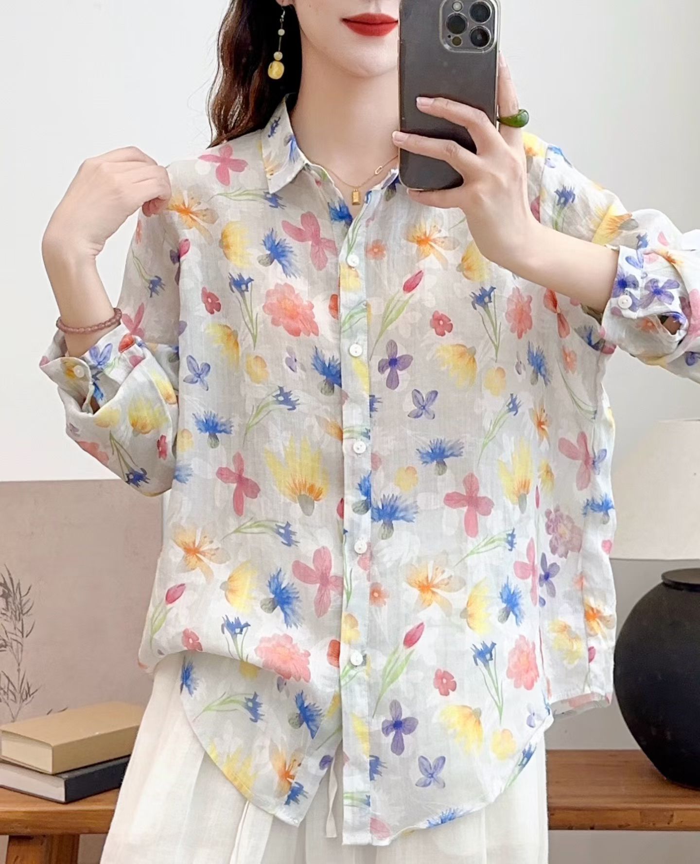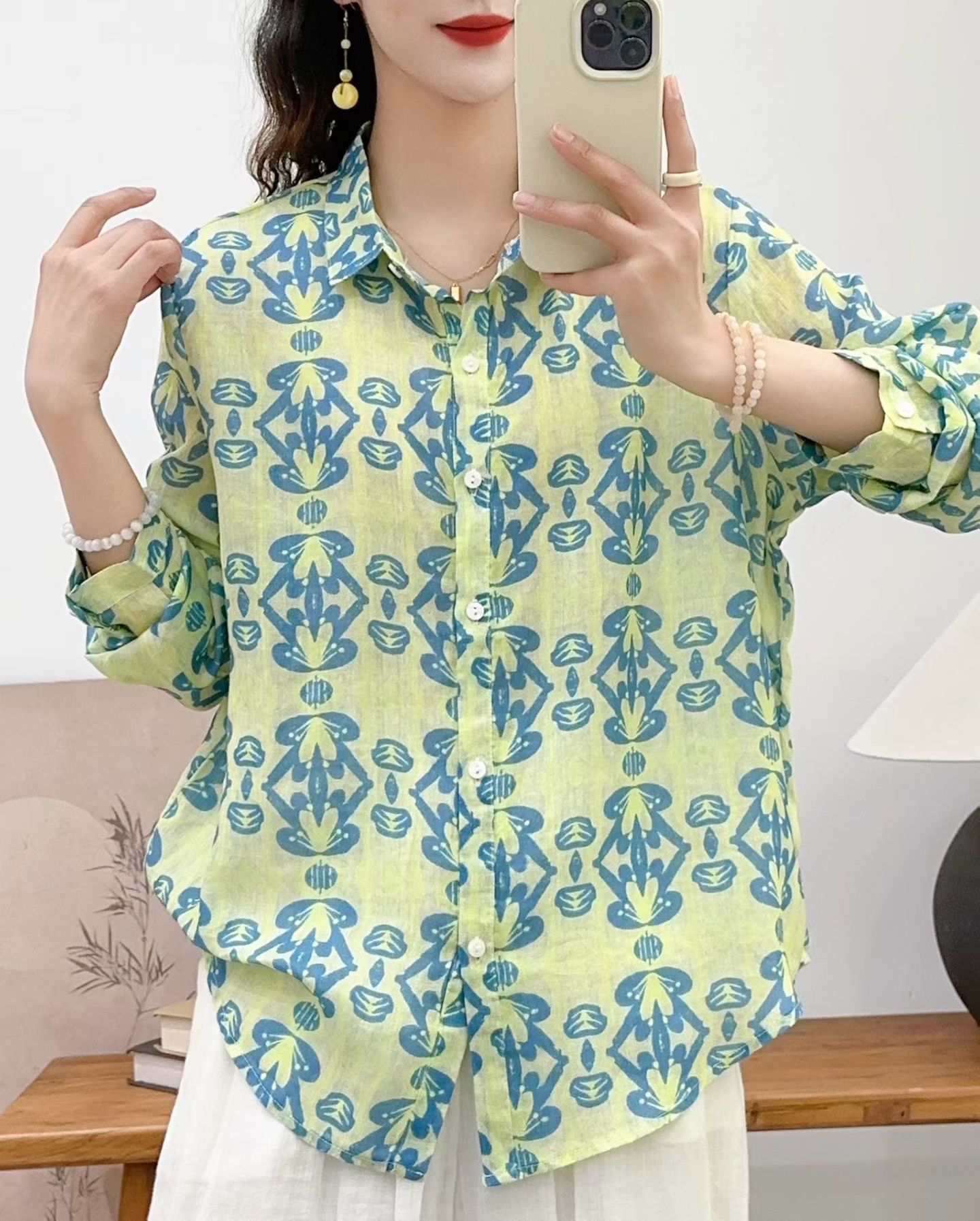 모리 소녀 예술적 라미 인쇄 셔츠 긴팔 여성용 옷깃 꽃 탑베이스 셔츠 라미 셔츠 탑 여성 의류스토어 가기