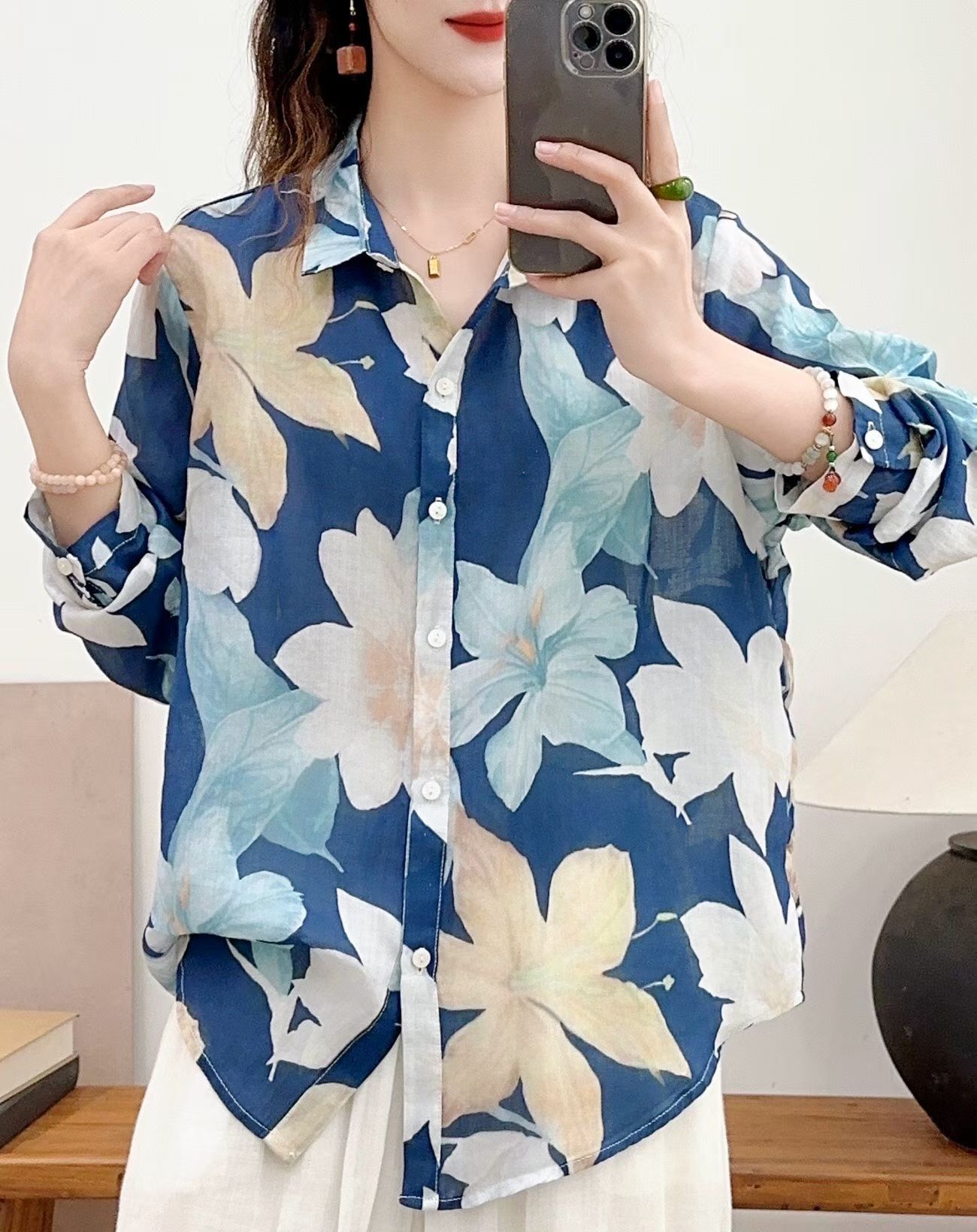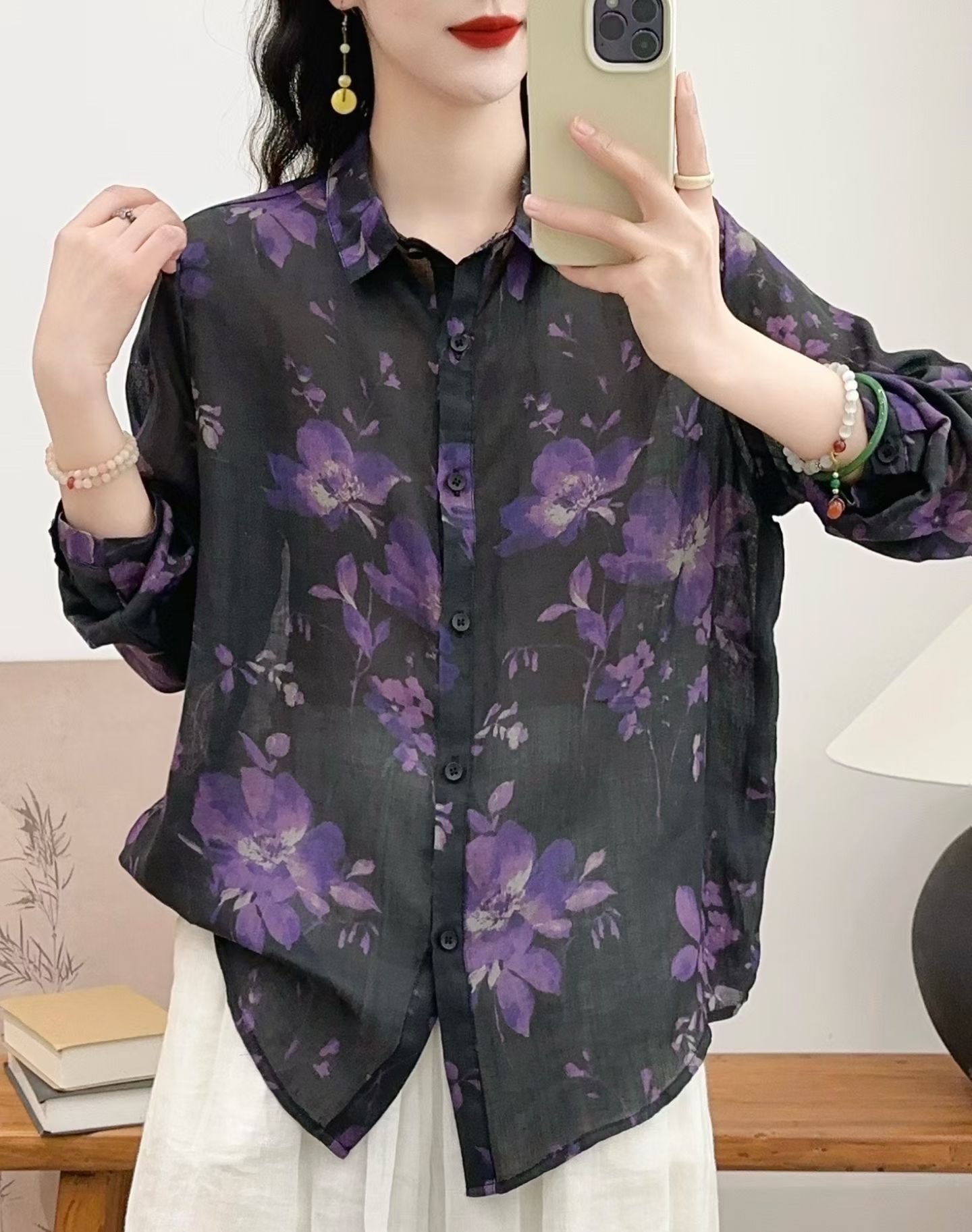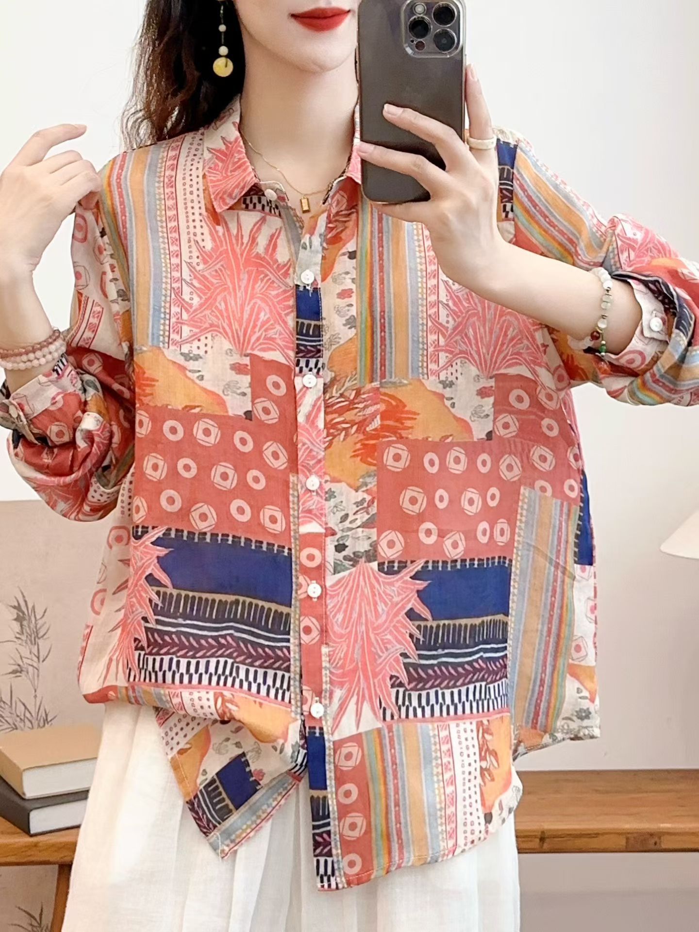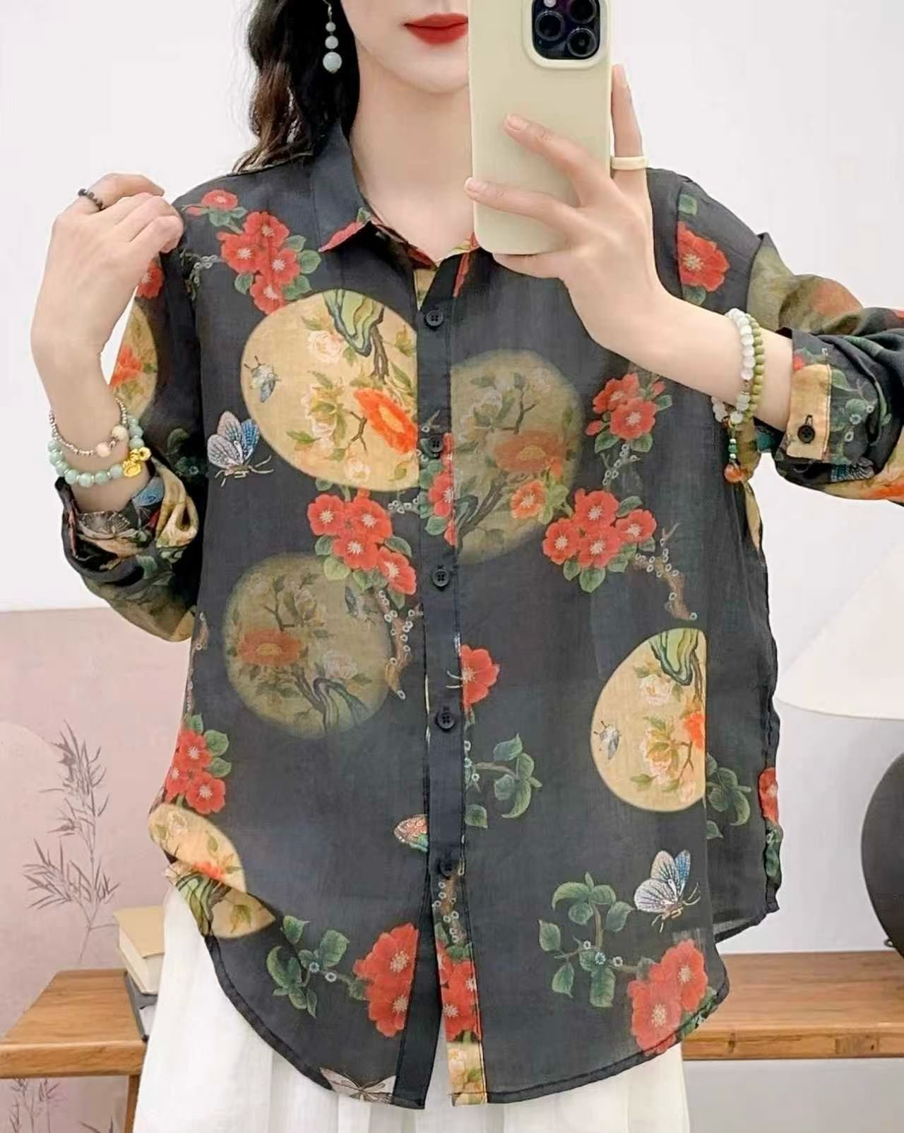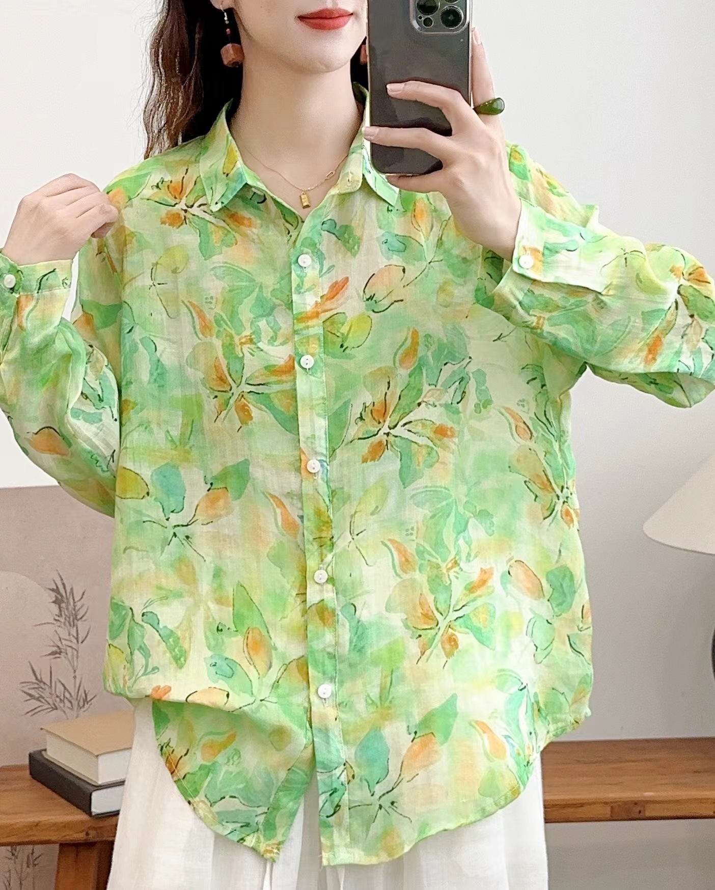 모리 소녀 예술적 라미 인쇄 셔츠 긴팔 여성용 옷깃 꽃 탑베이스 셔츠 라미 셔츠 탑 여성 의류스토어 가기