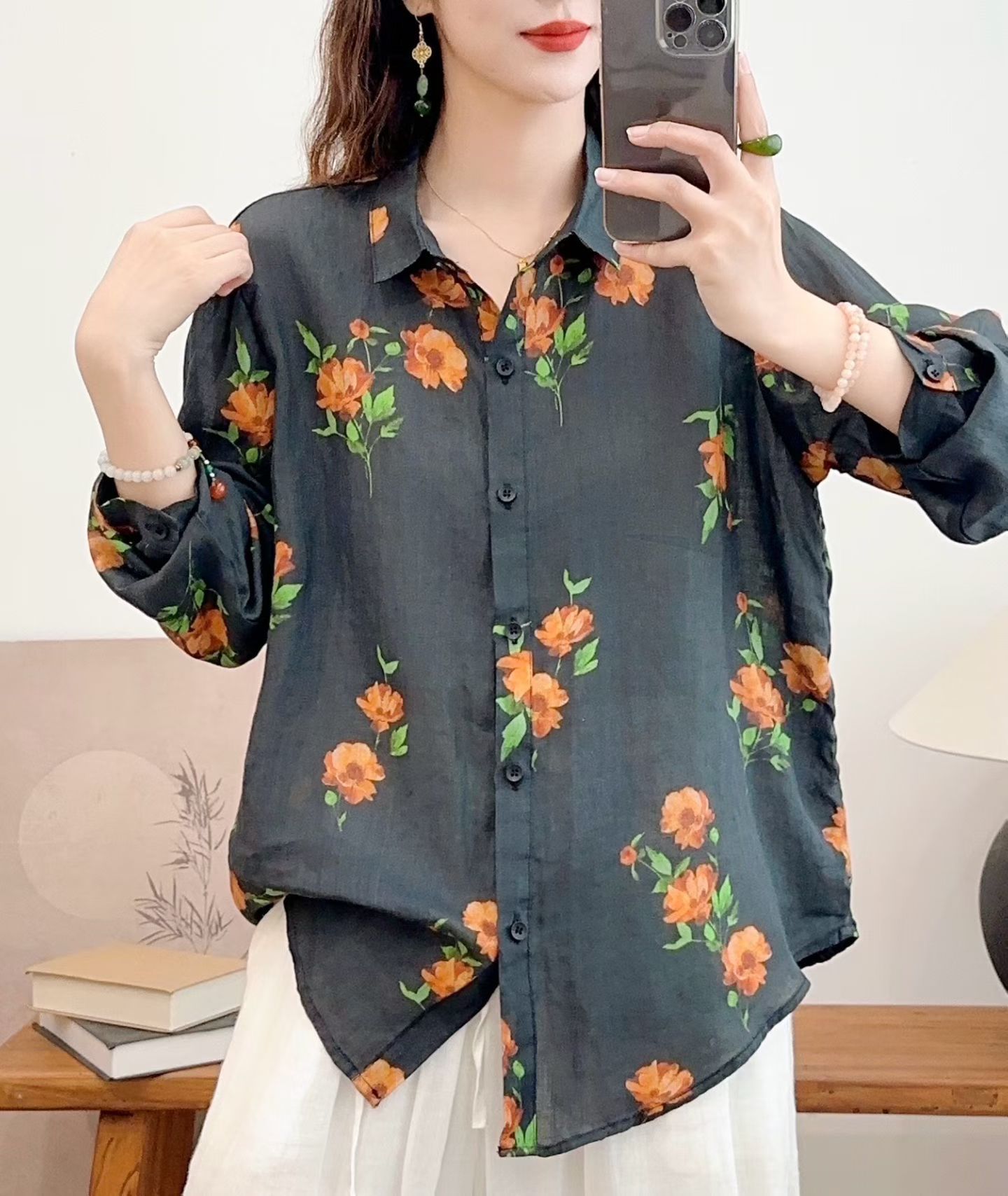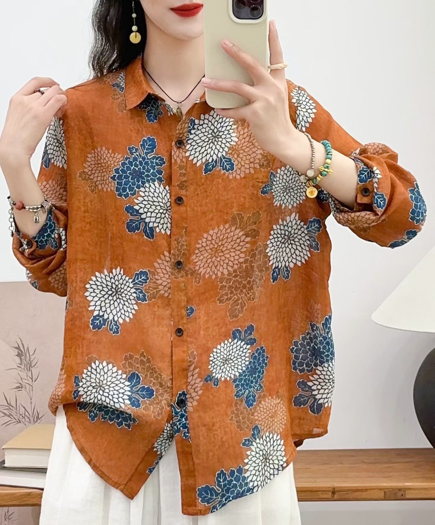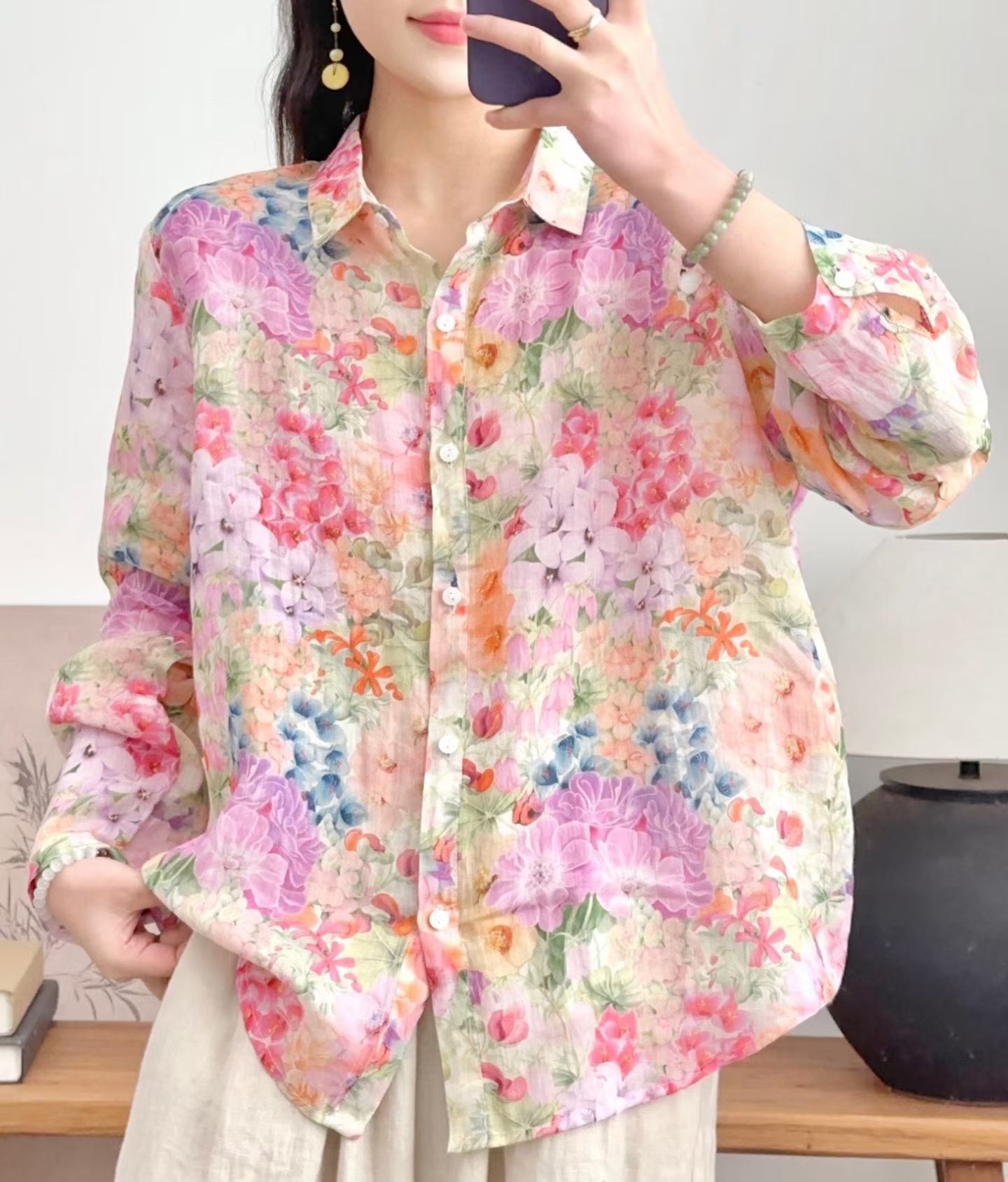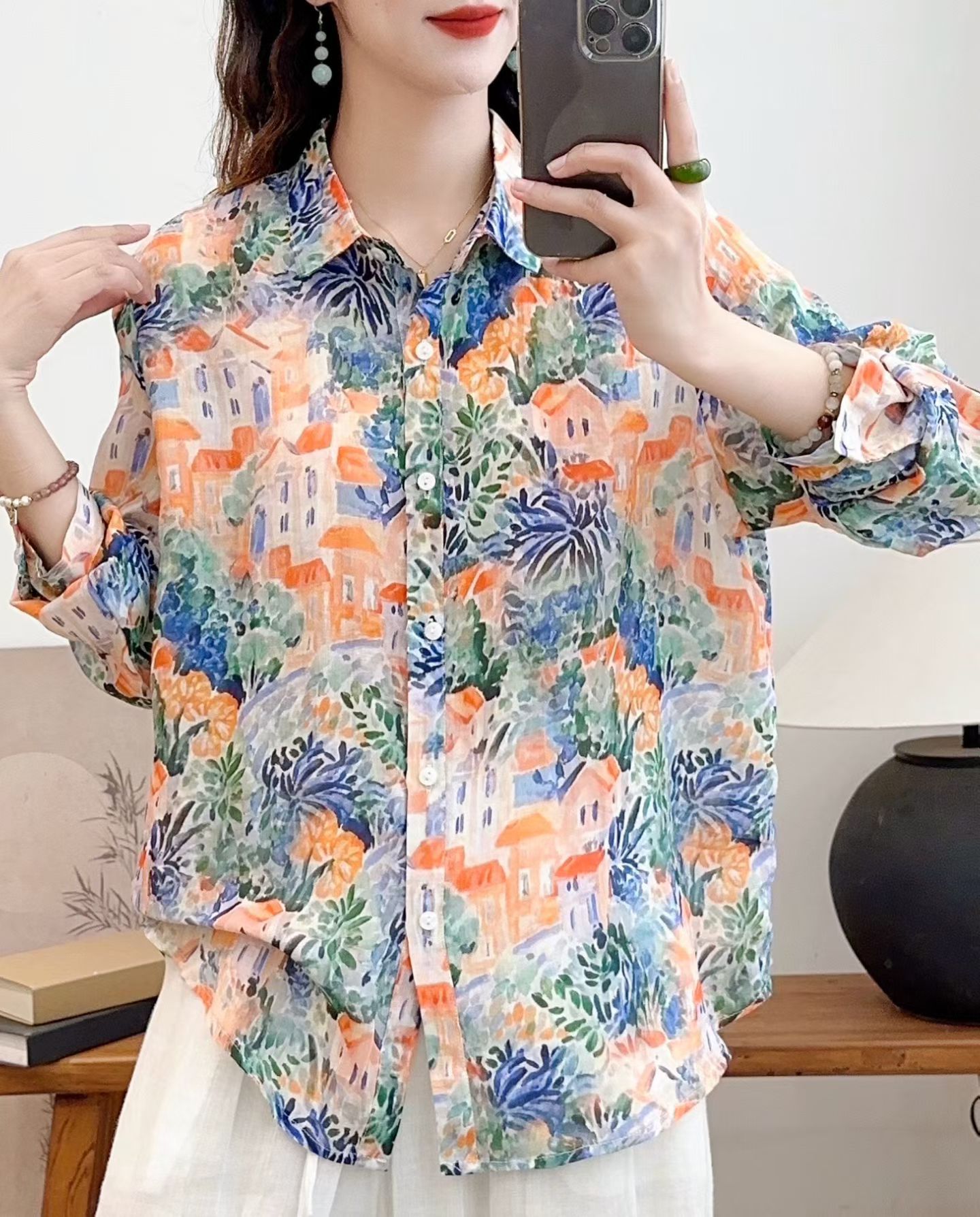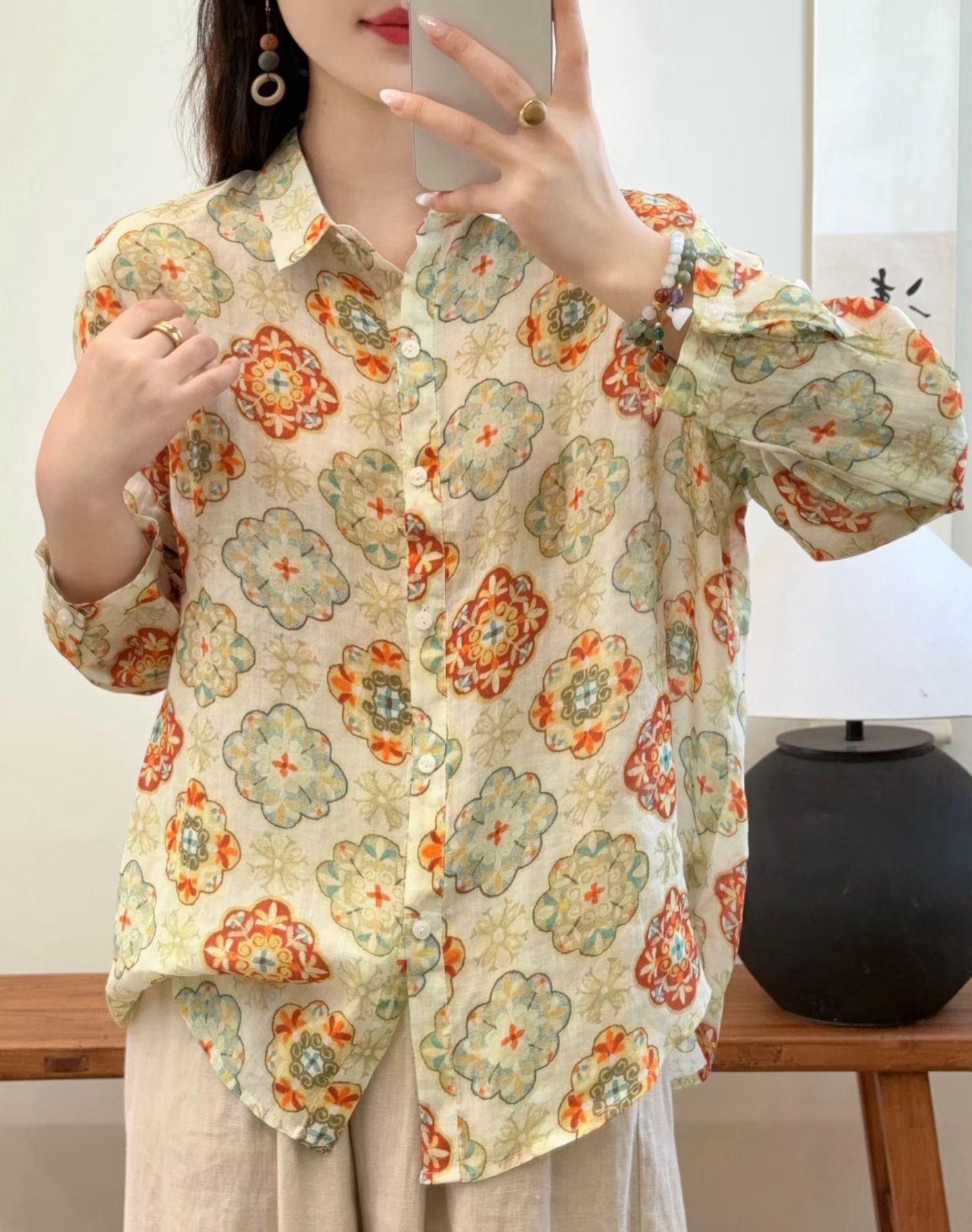 모리 소녀 예술적 라미 인쇄 셔츠 긴팔 여성용 옷깃 꽃 탑베이스 셔츠 라미 셔츠 탑 여성 의류스토어 가기