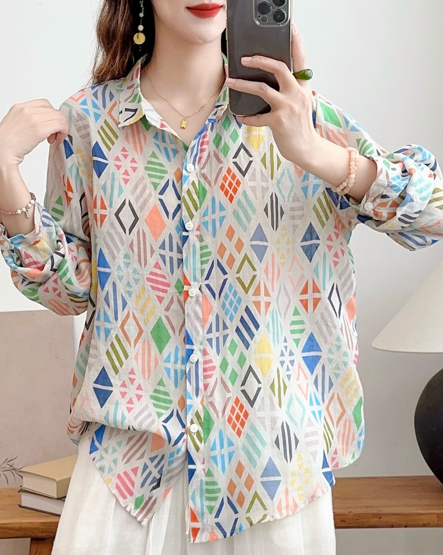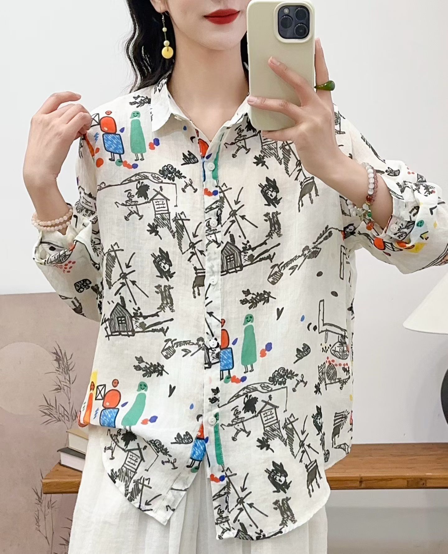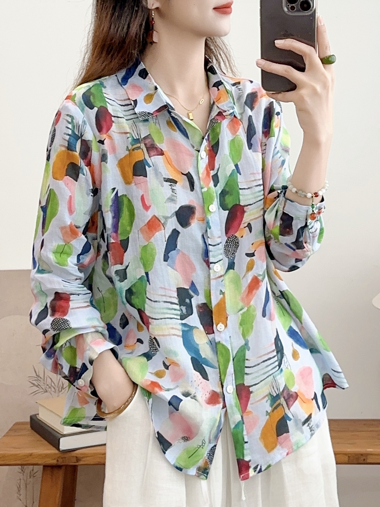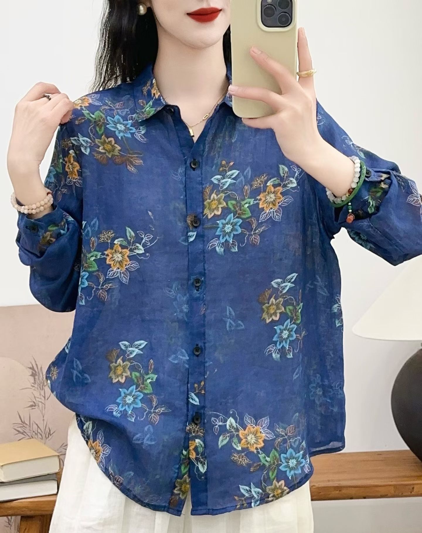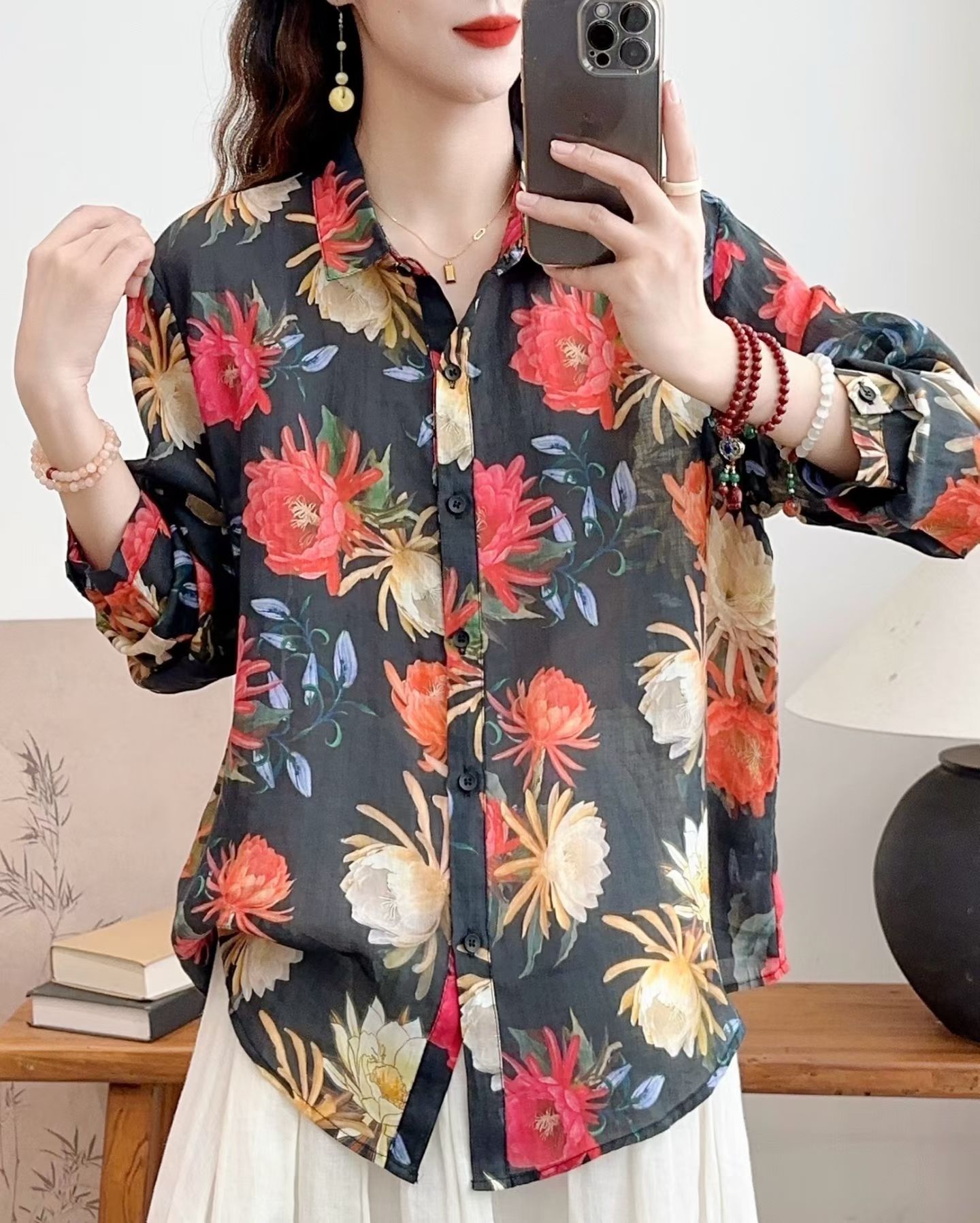 모리 소녀 예술적 라미 인쇄 셔츠 긴팔 여성용 옷깃 꽃 탑베이스 셔츠 라미 셔츠 탑 여성 의류스토어 가기