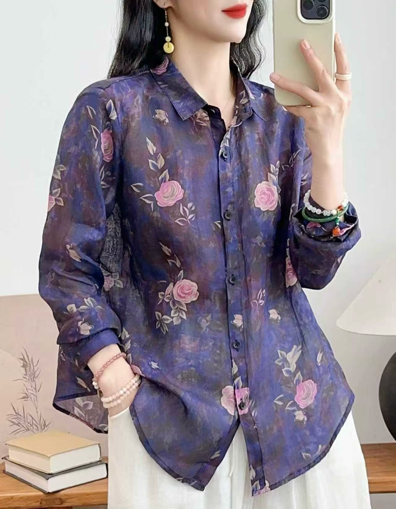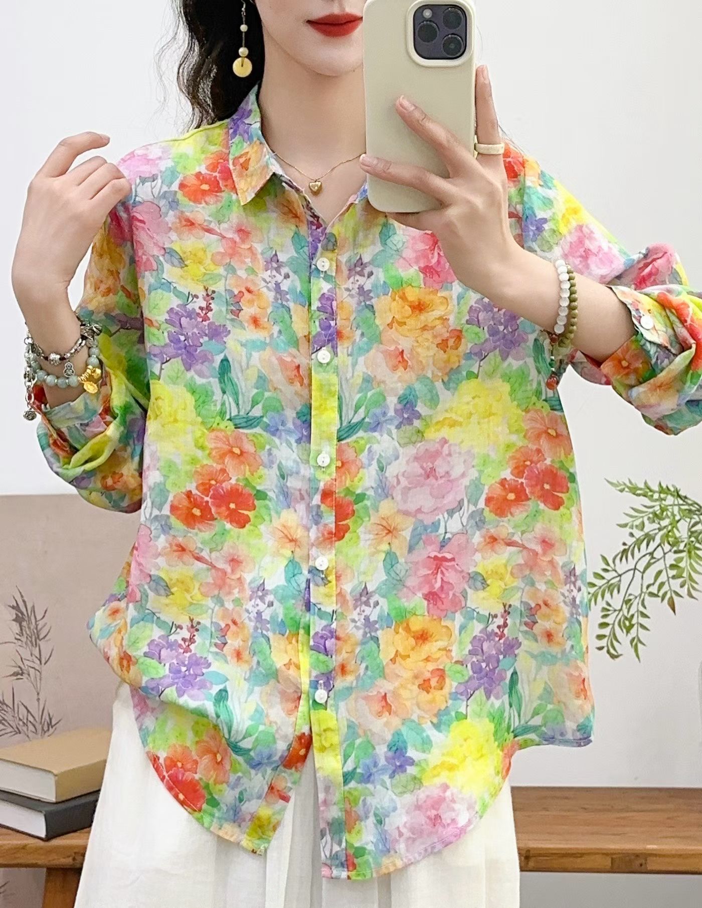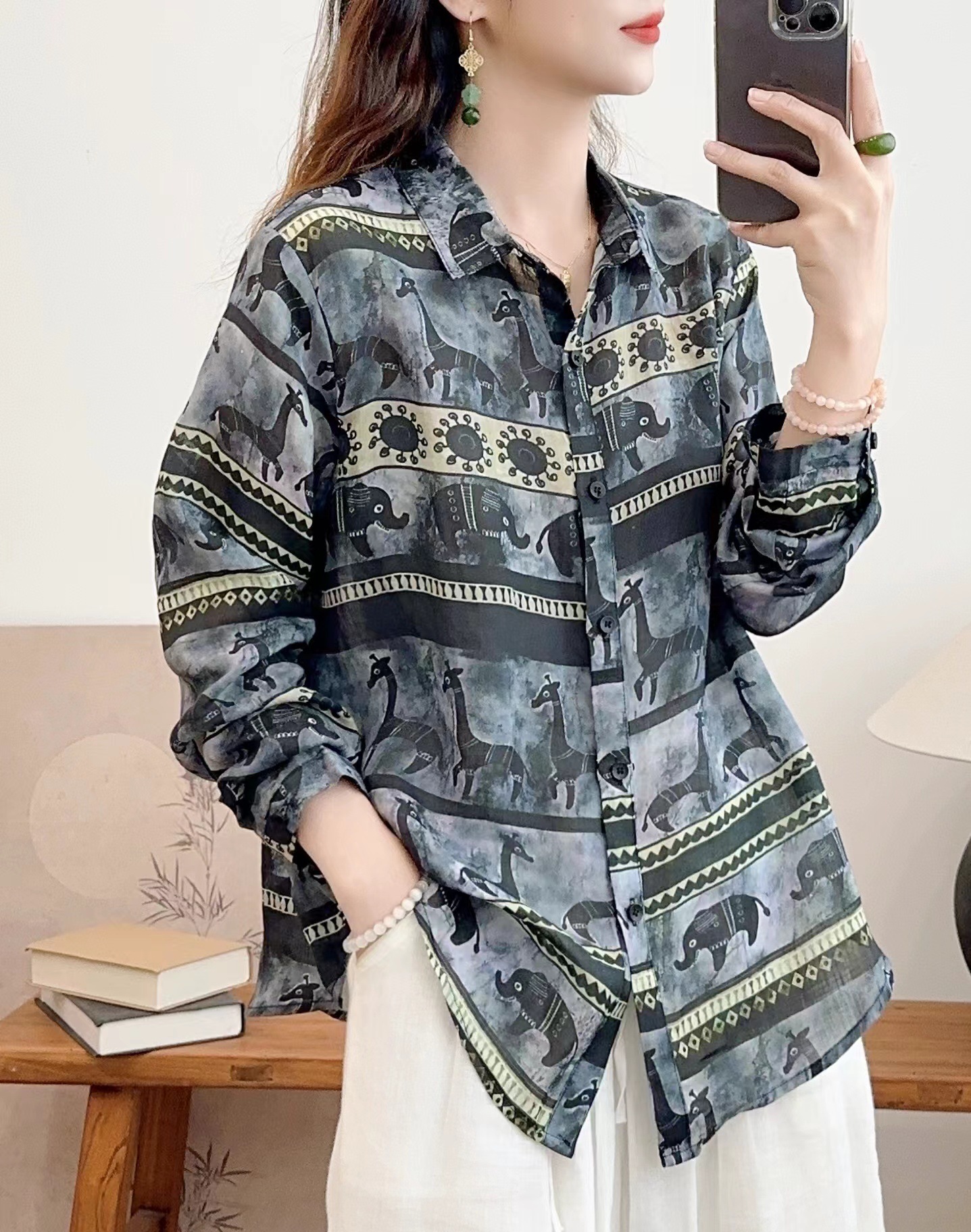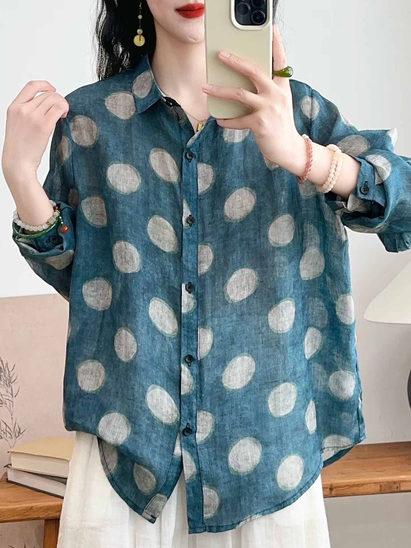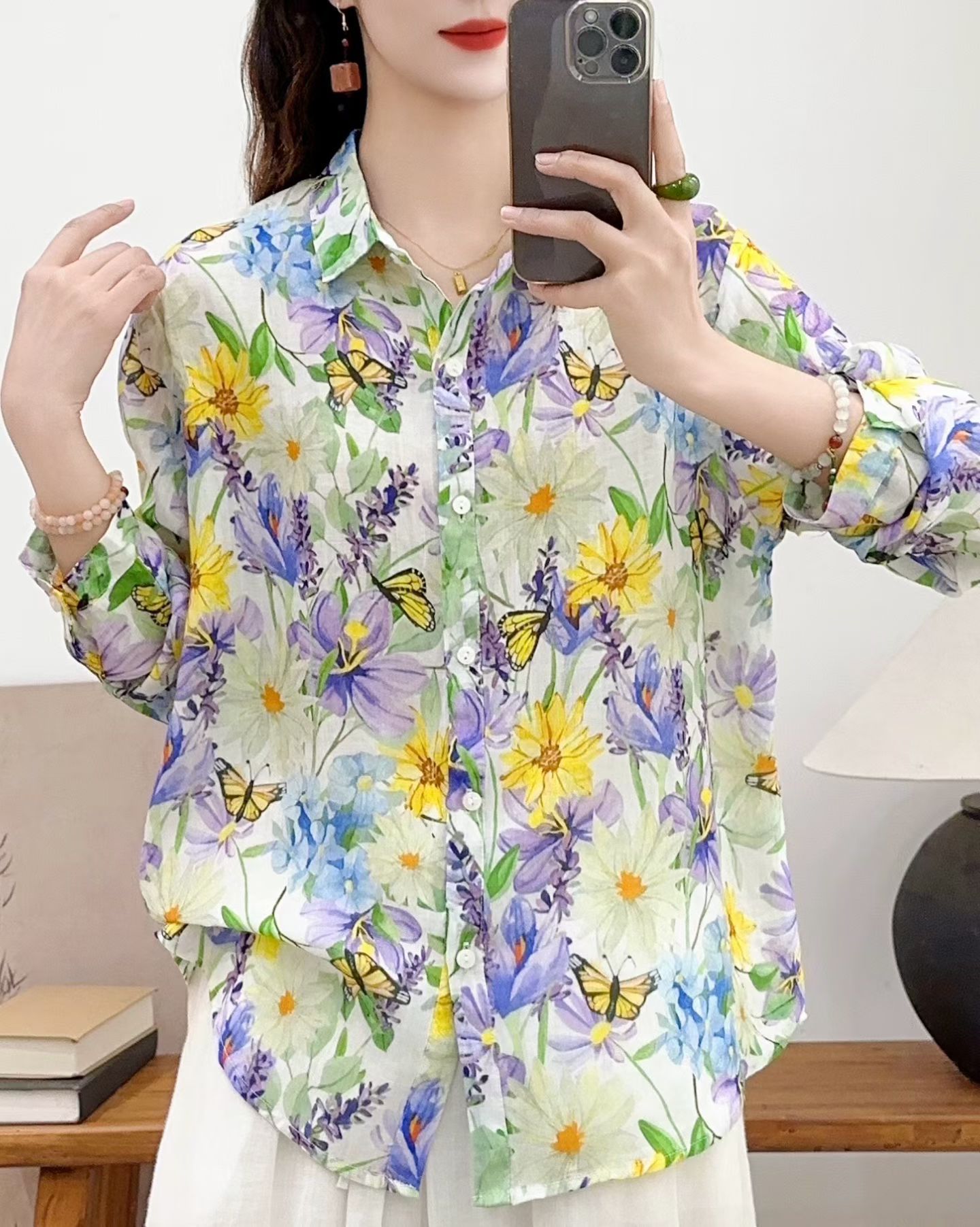 모리 소녀 예술적 라미 인쇄 셔츠 긴팔 여성용 옷깃 꽃 탑베이스 셔츠 라미 셔츠 탑 여성 의류스토어 가기