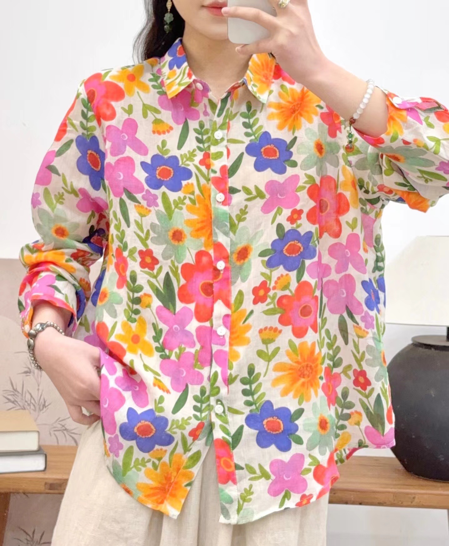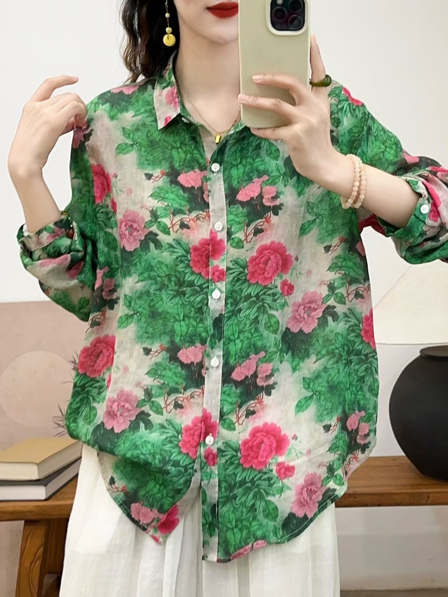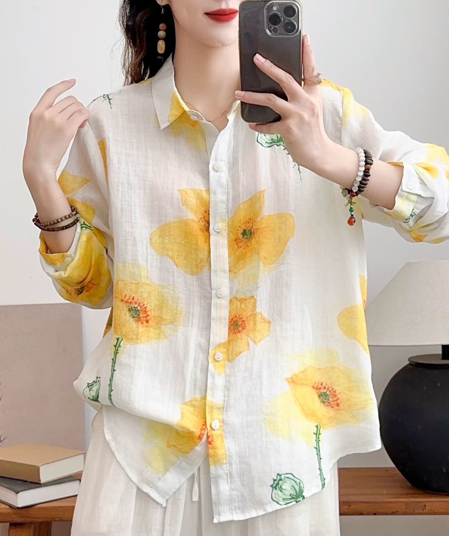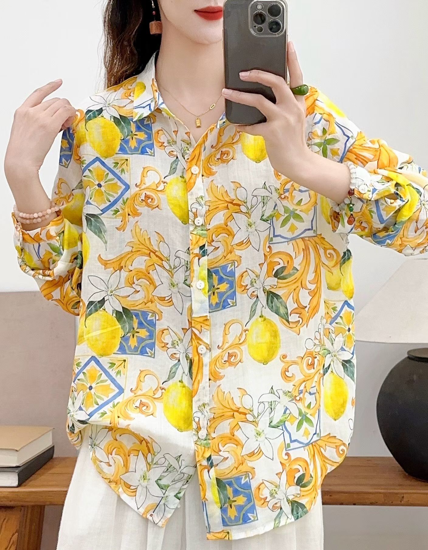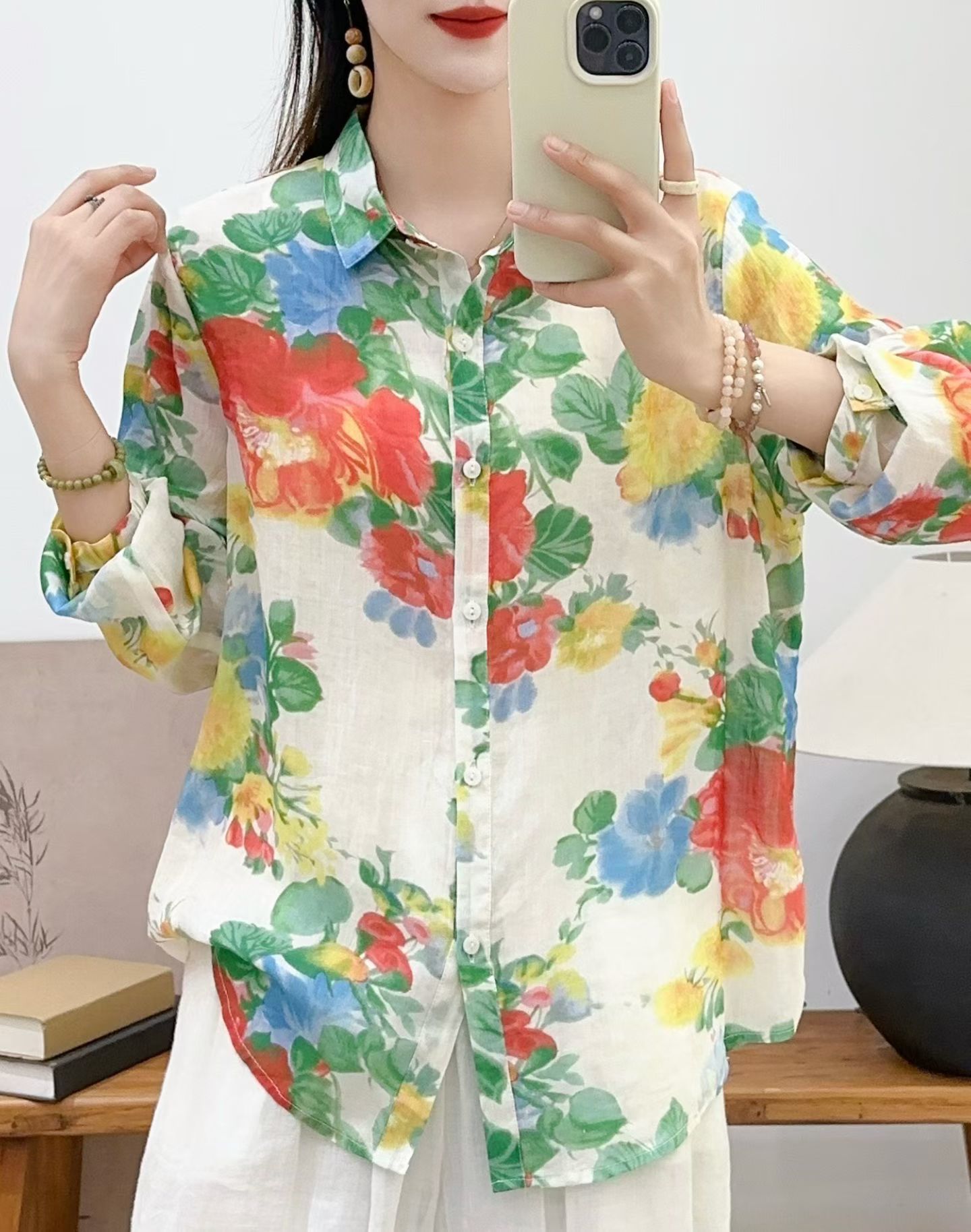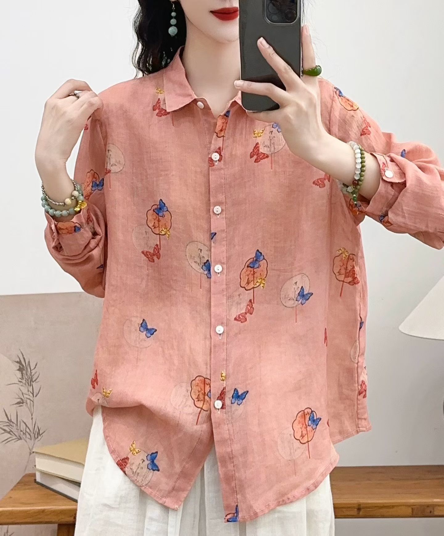 모리 소녀 예술적 라미 인쇄 셔츠 긴팔 여성용 옷깃 꽃 탑베이스 셔츠 라미 셔츠 탑 여성 의류스토어 가기