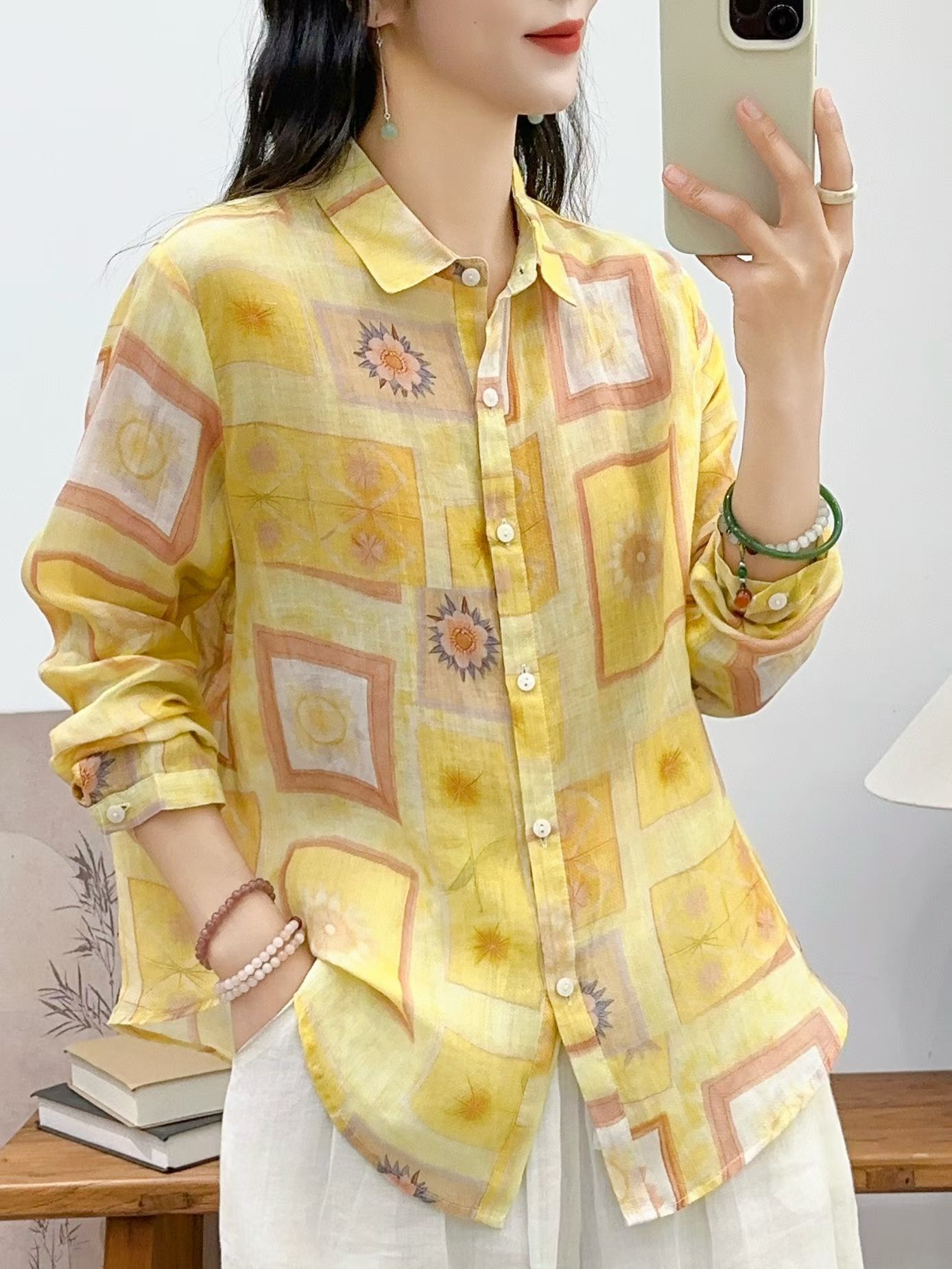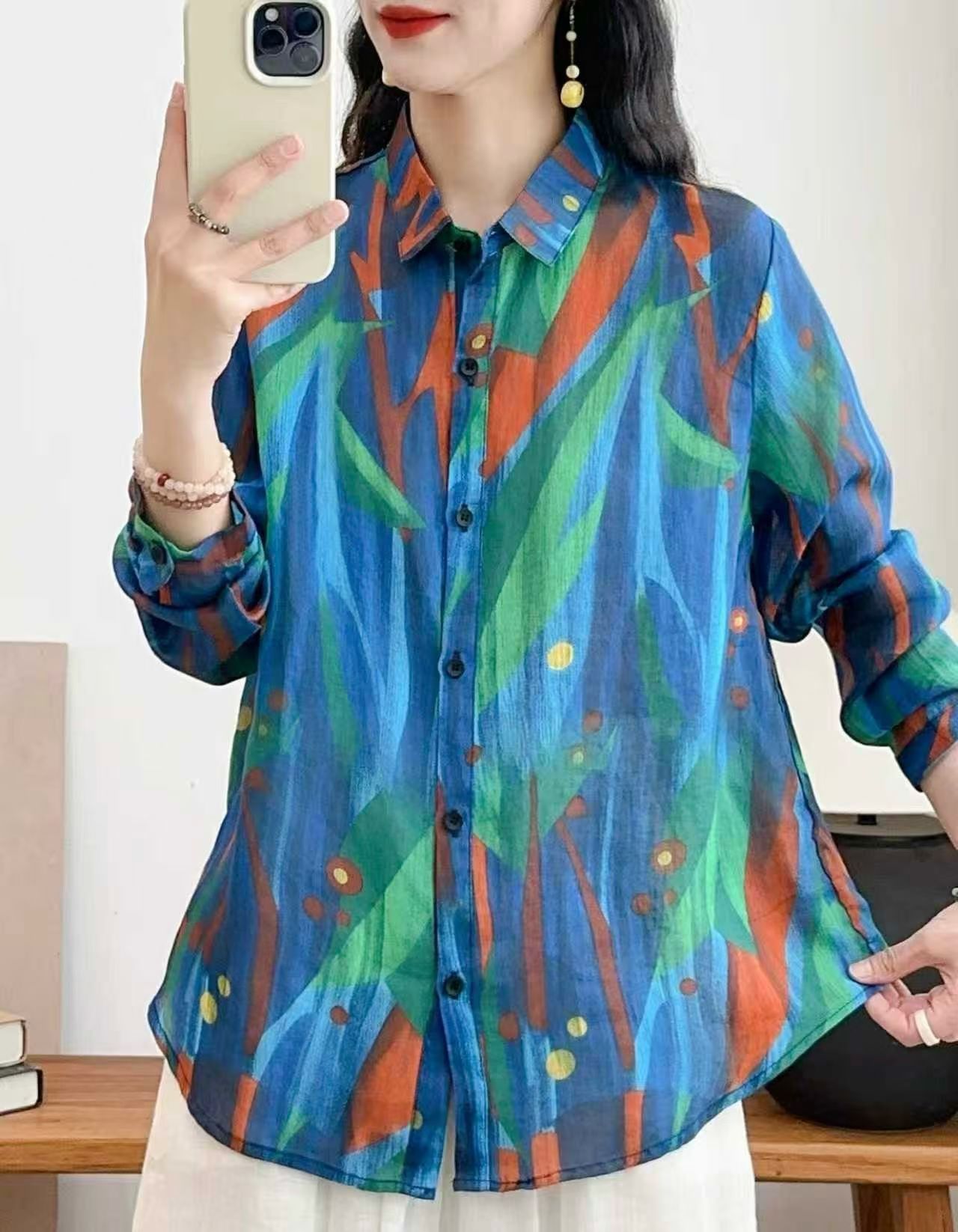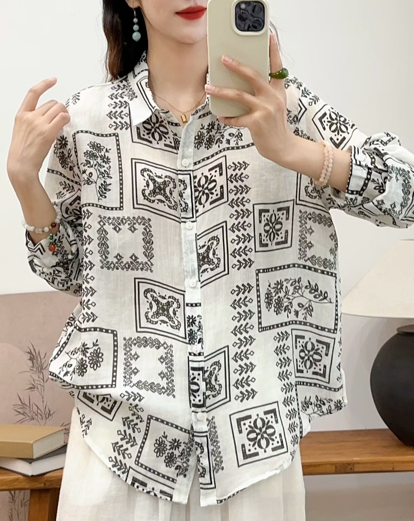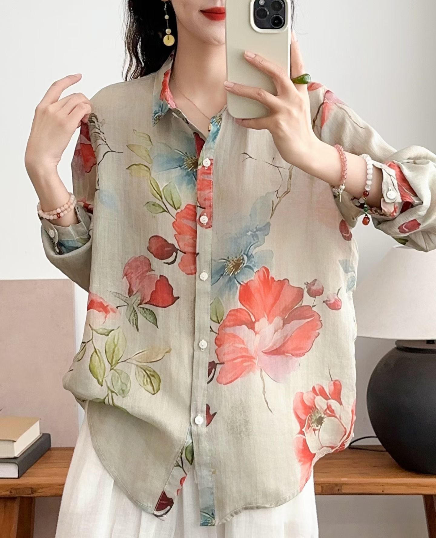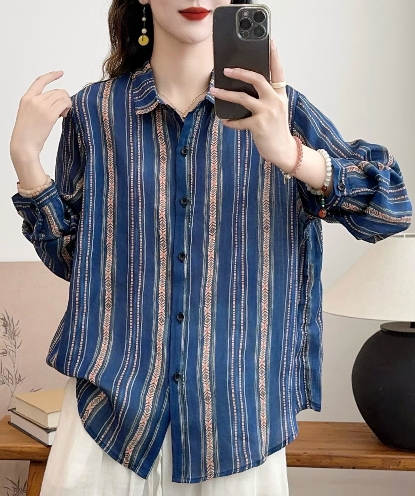 모리 소녀 예술적 라미 인쇄 셔츠 긴팔 여성용 옷깃 꽃 탑베이스 셔츠 라미 셔츠 탑 여성 의류스토어 가기