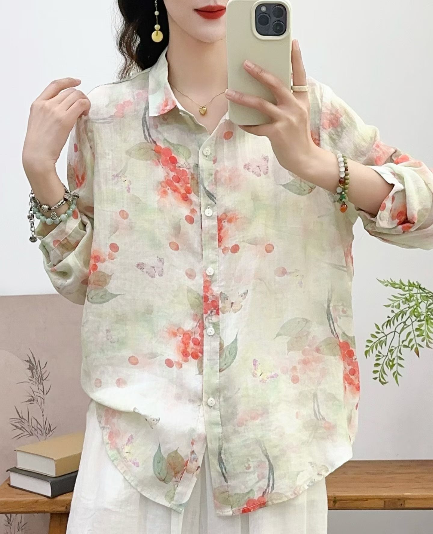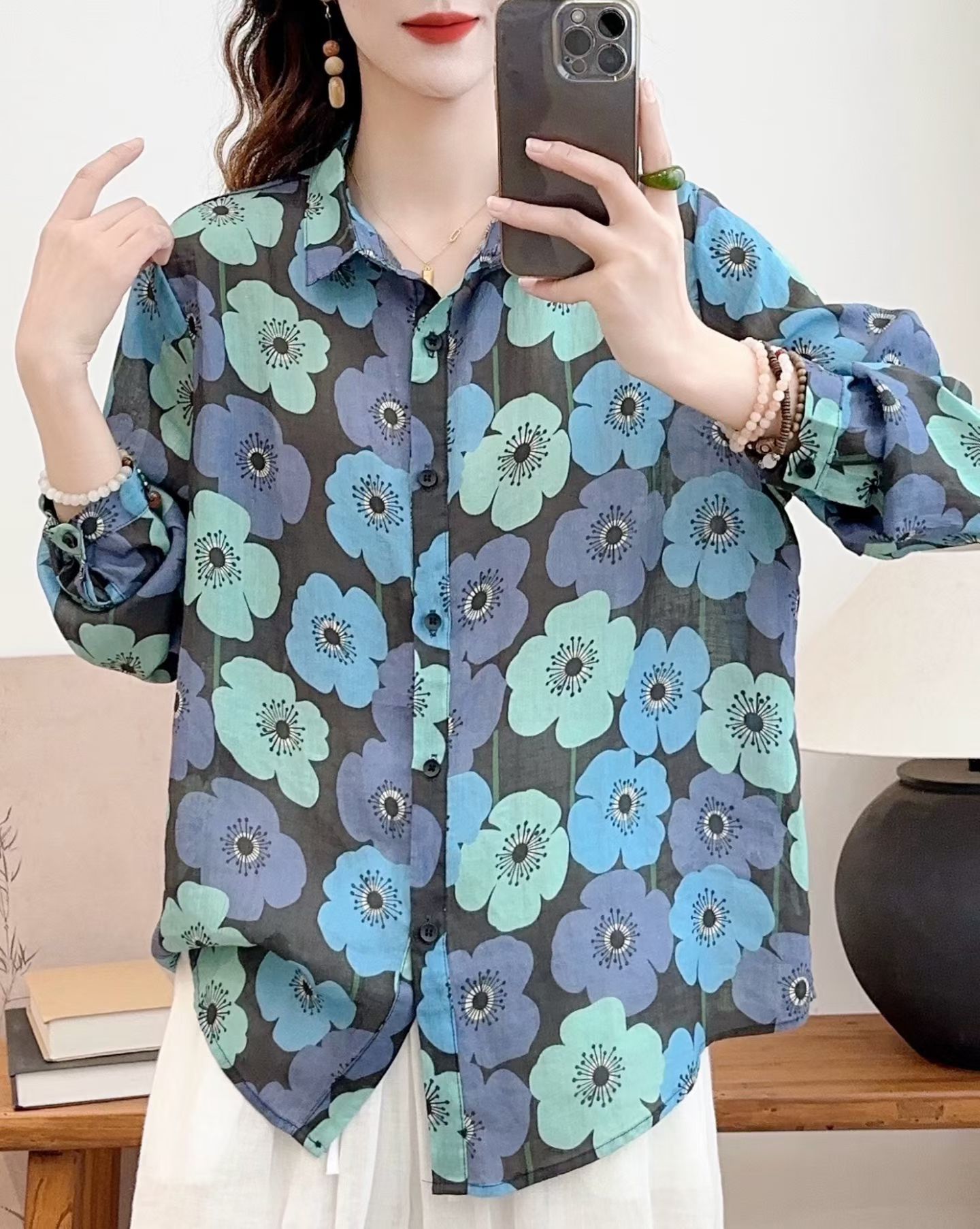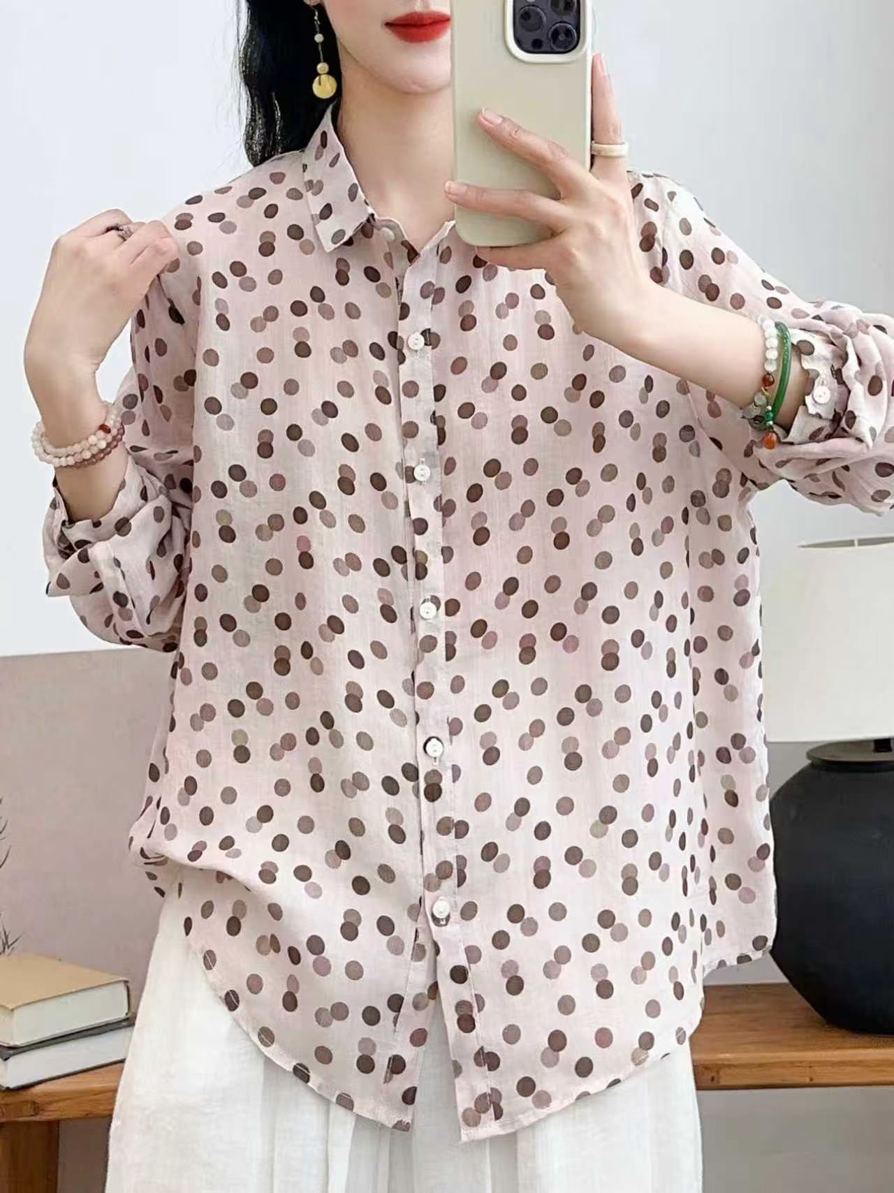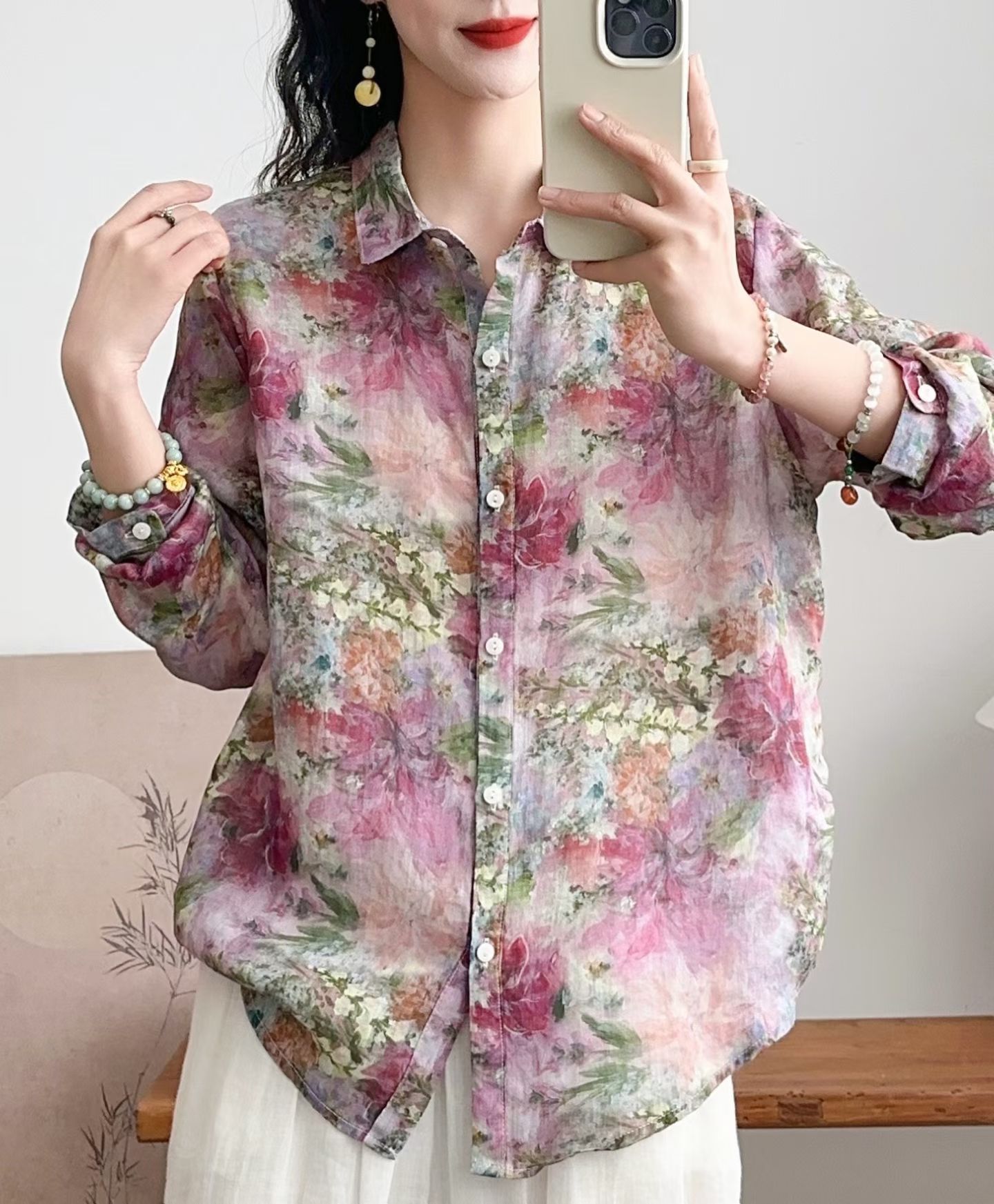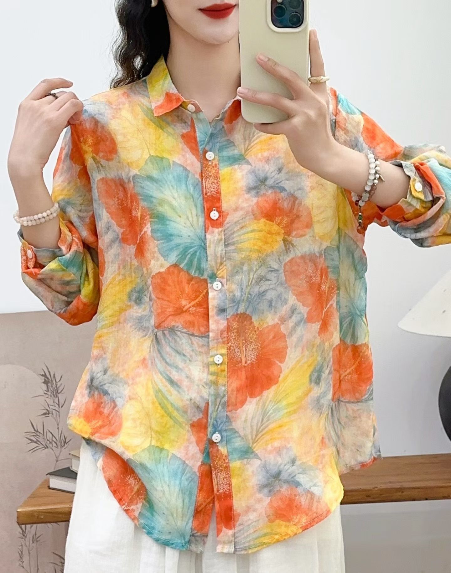 모리 소녀 예술적 라미 인쇄 셔츠 긴팔 여성용 옷깃 꽃 탑베이스 셔츠 라미 셔츠 탑 여성 의류스토어 가기