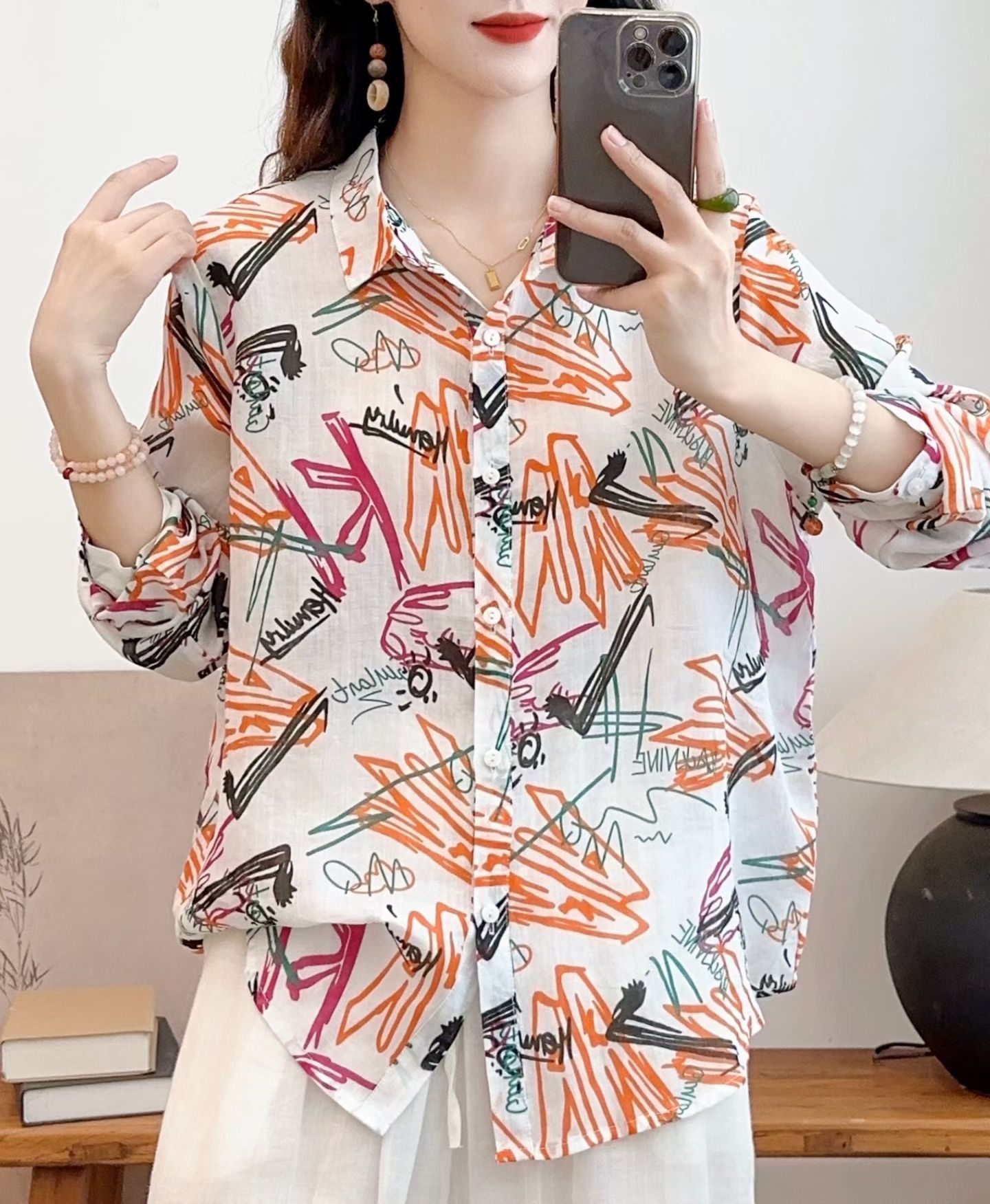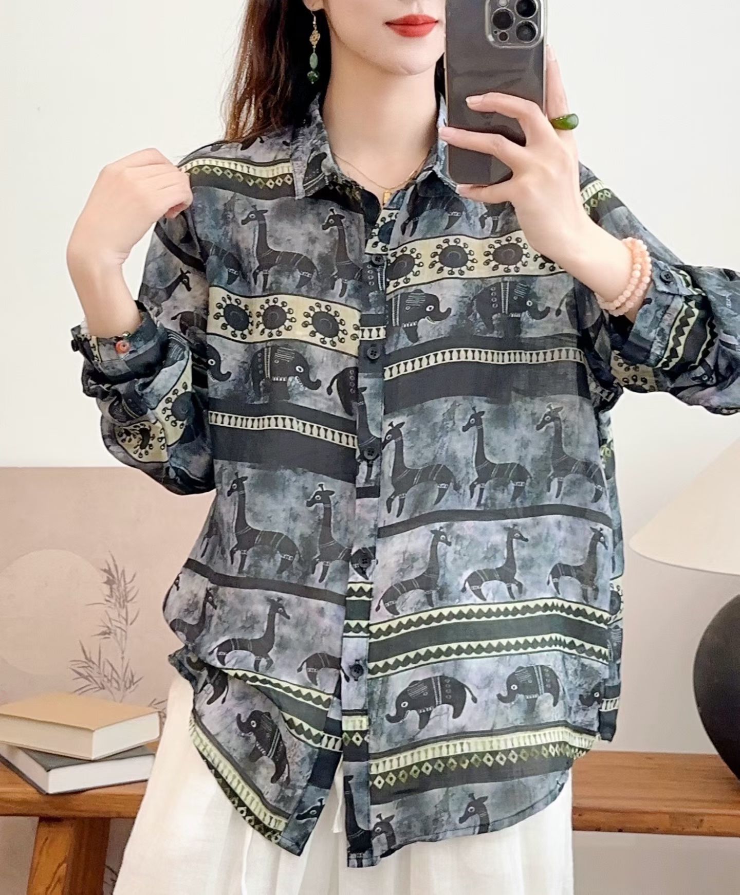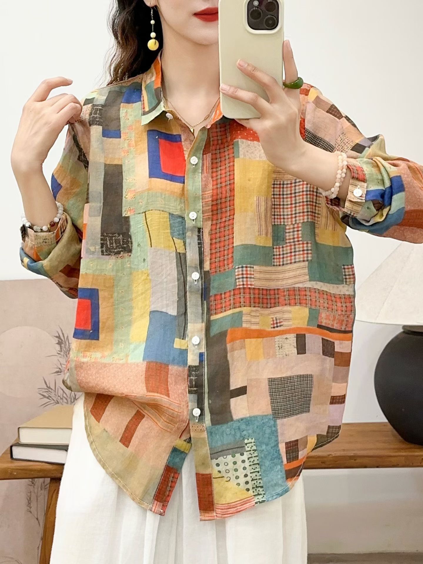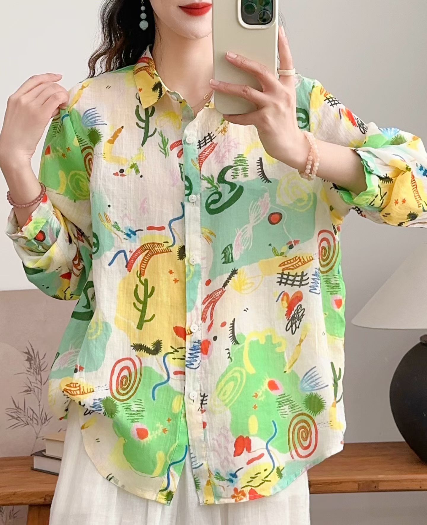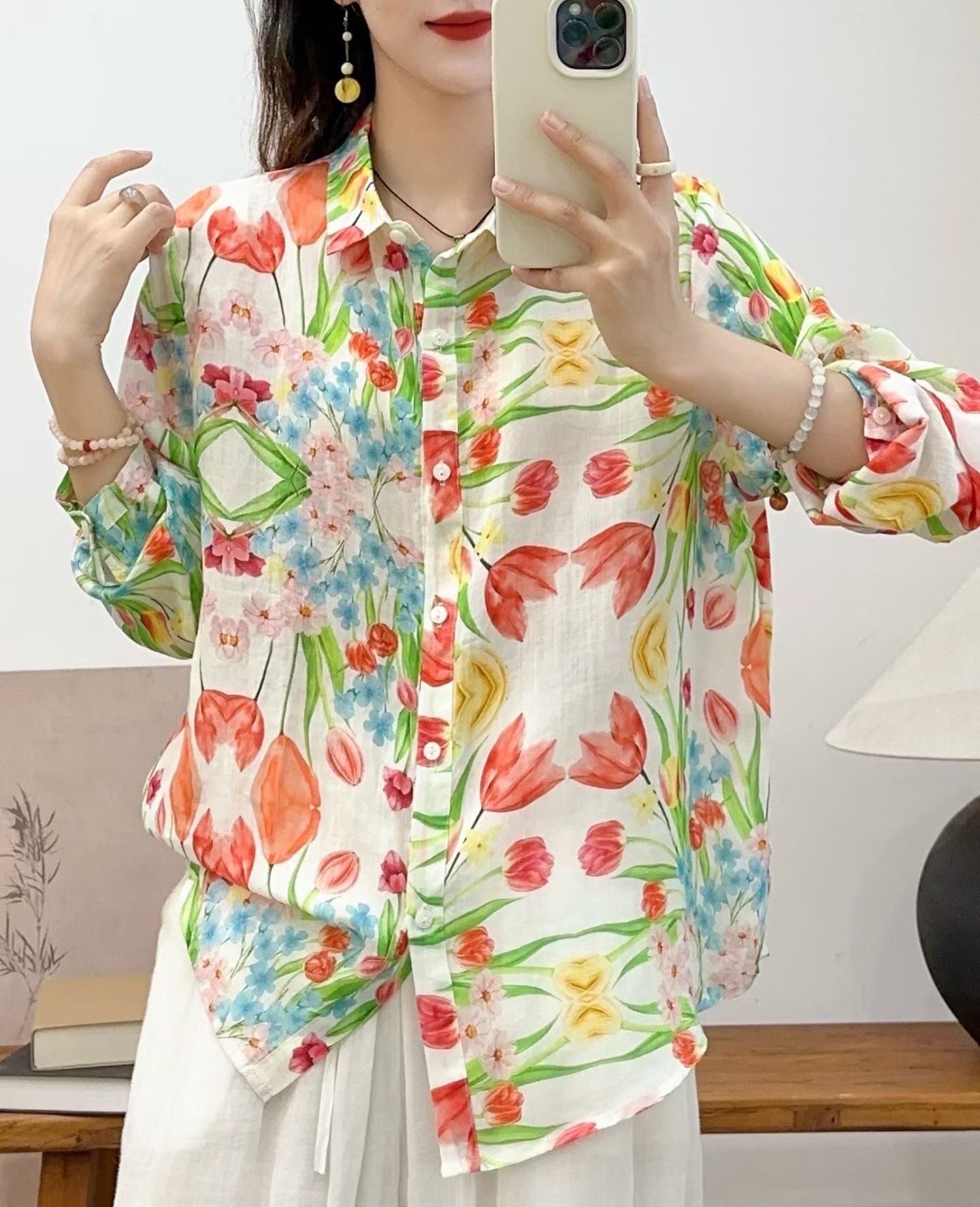모리 소녀 예술적 라미 인쇄 셔츠 긴팔 여성용 옷깃 꽃 탑베이스 셔츠 라미 셔츠 탑 여성 의류스토어 가기