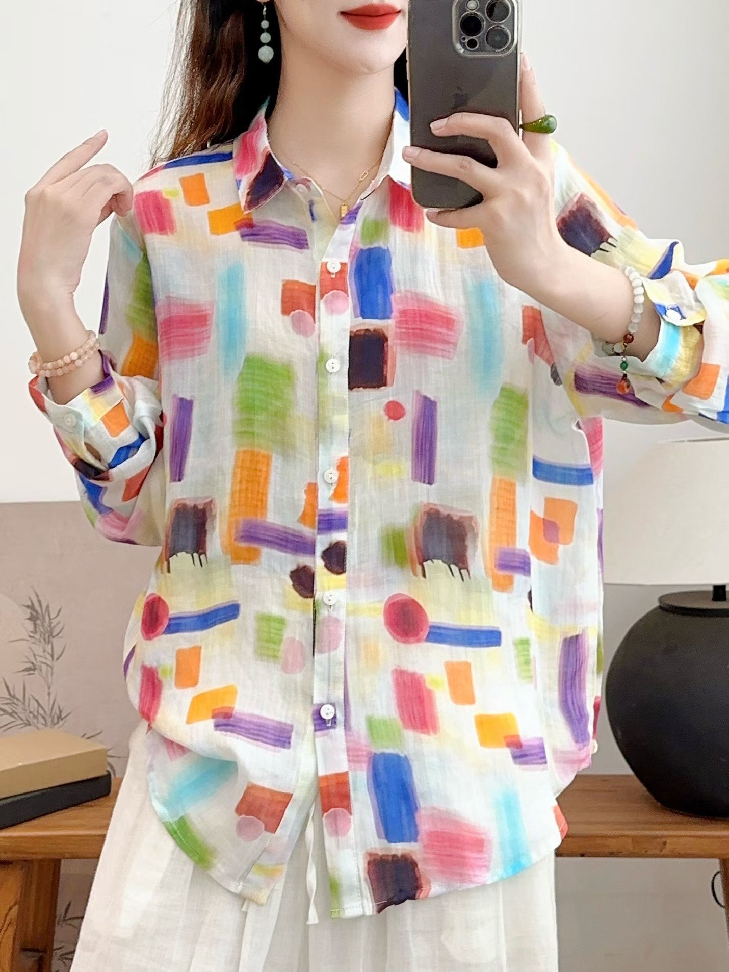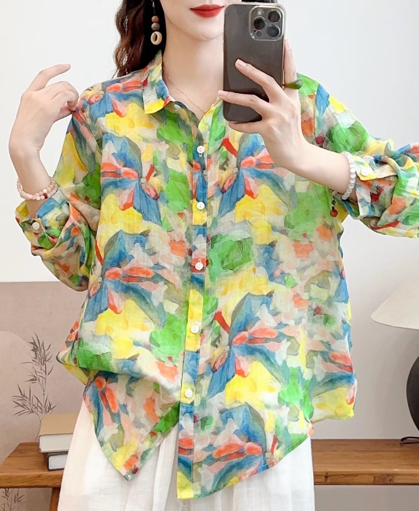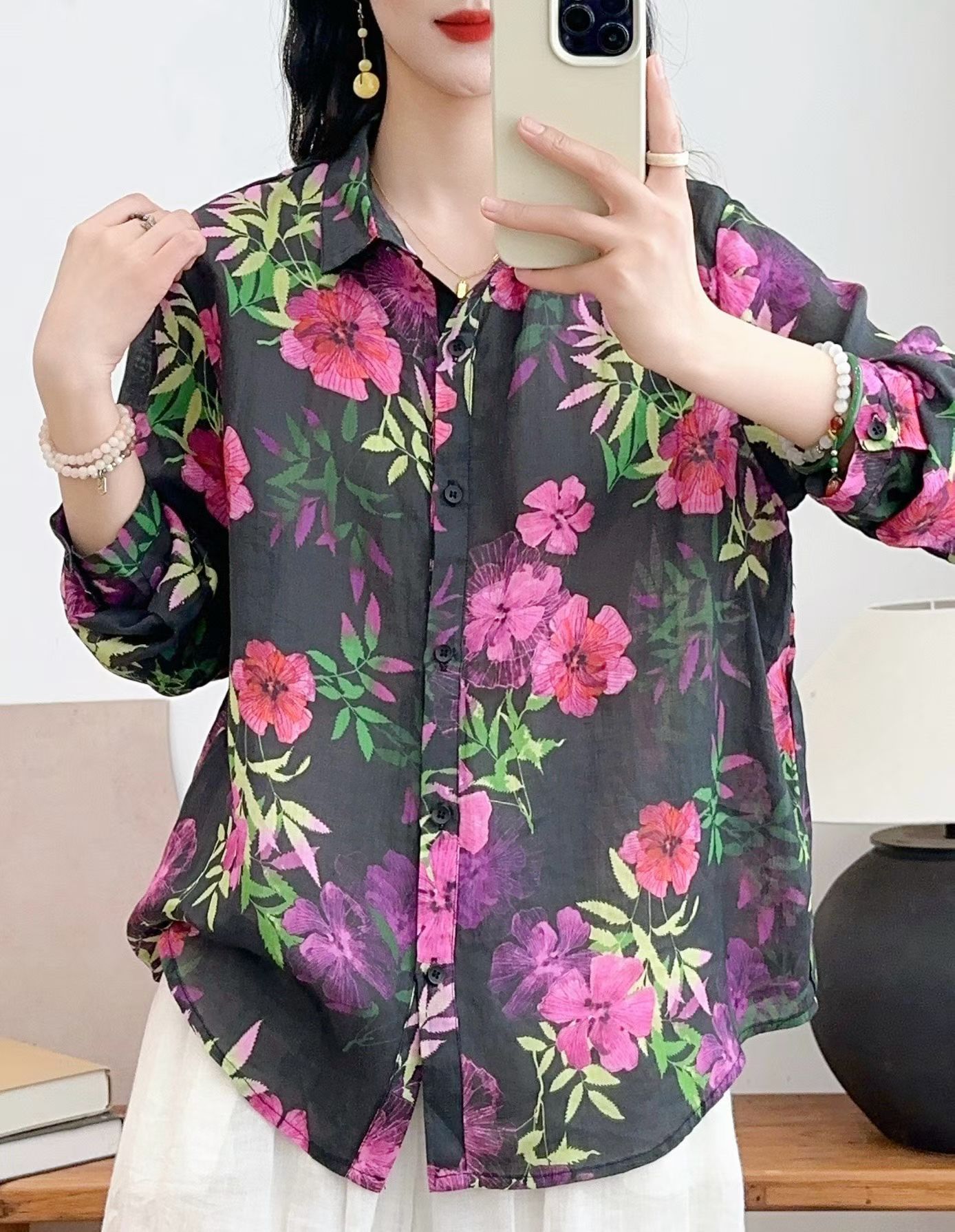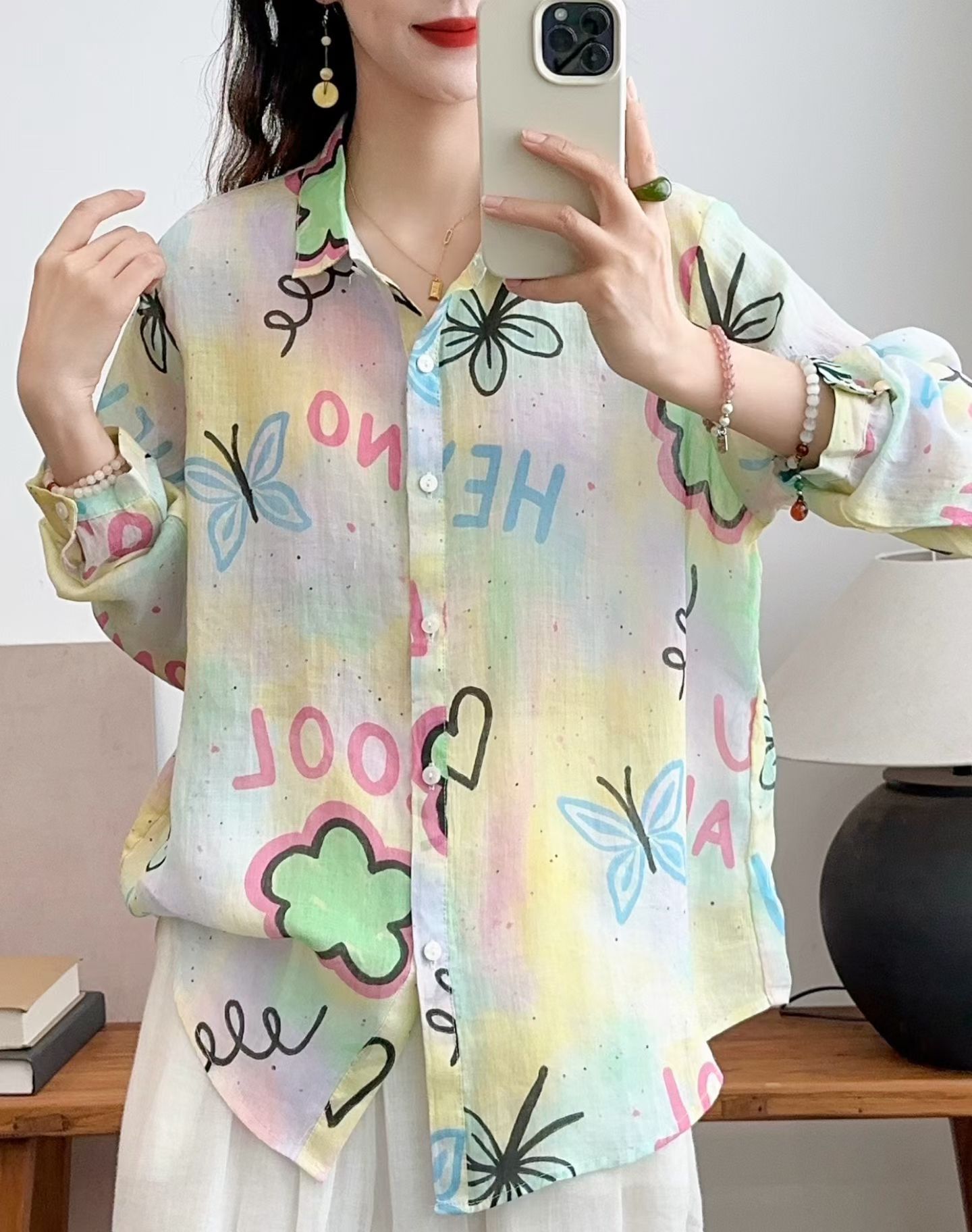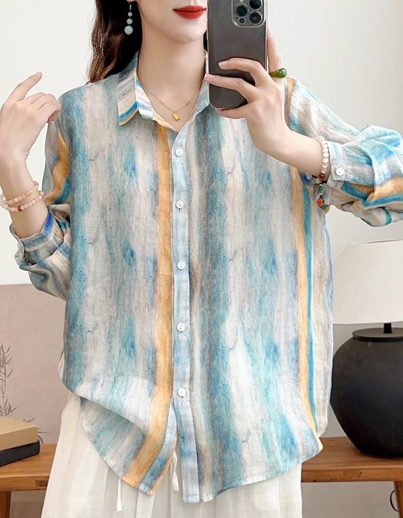 모리 소녀 예술적 라미 인쇄 셔츠 긴팔 여성용 옷깃 꽃 탑베이스 셔츠 라미 셔츠 탑 여성 의류스토어 가기