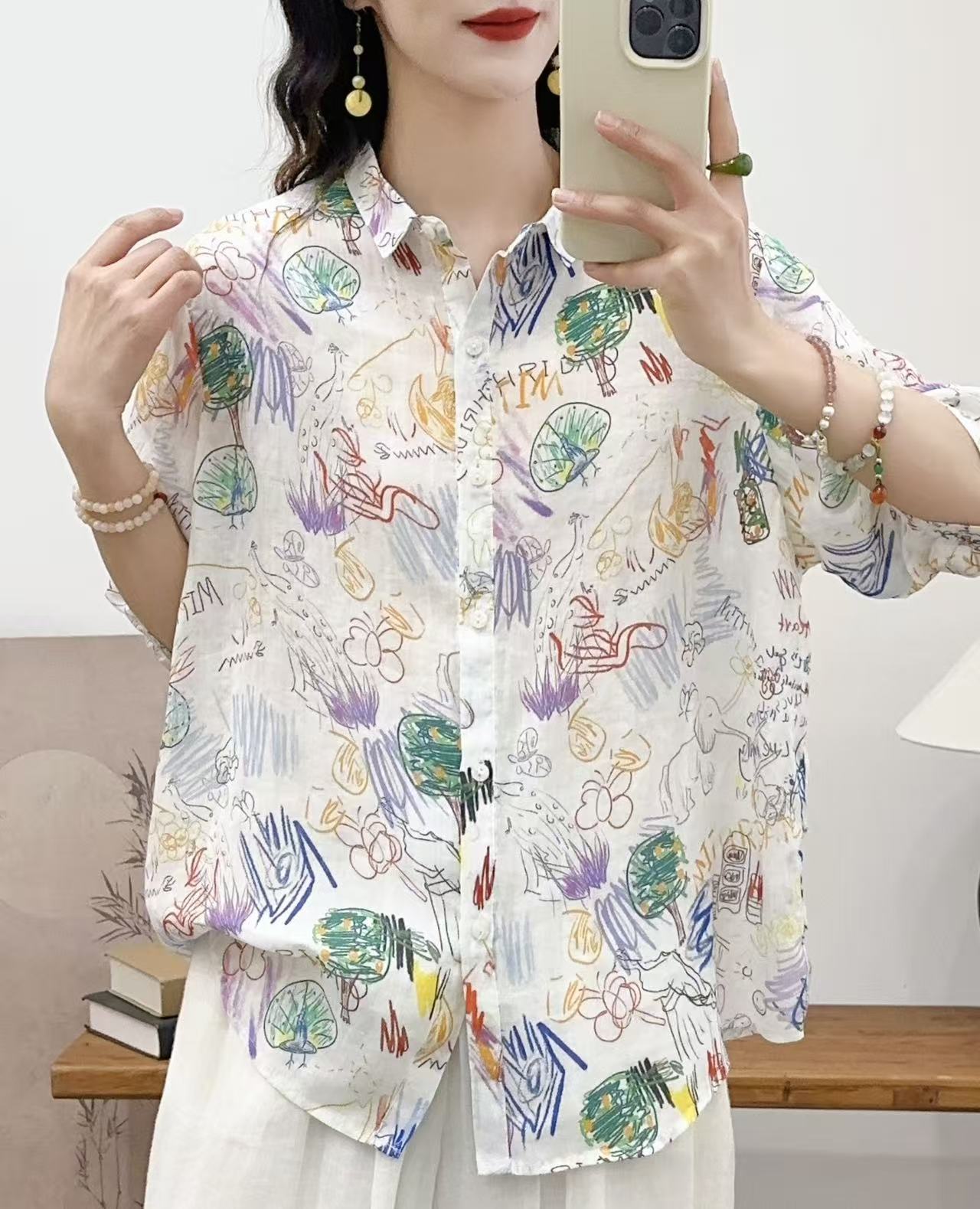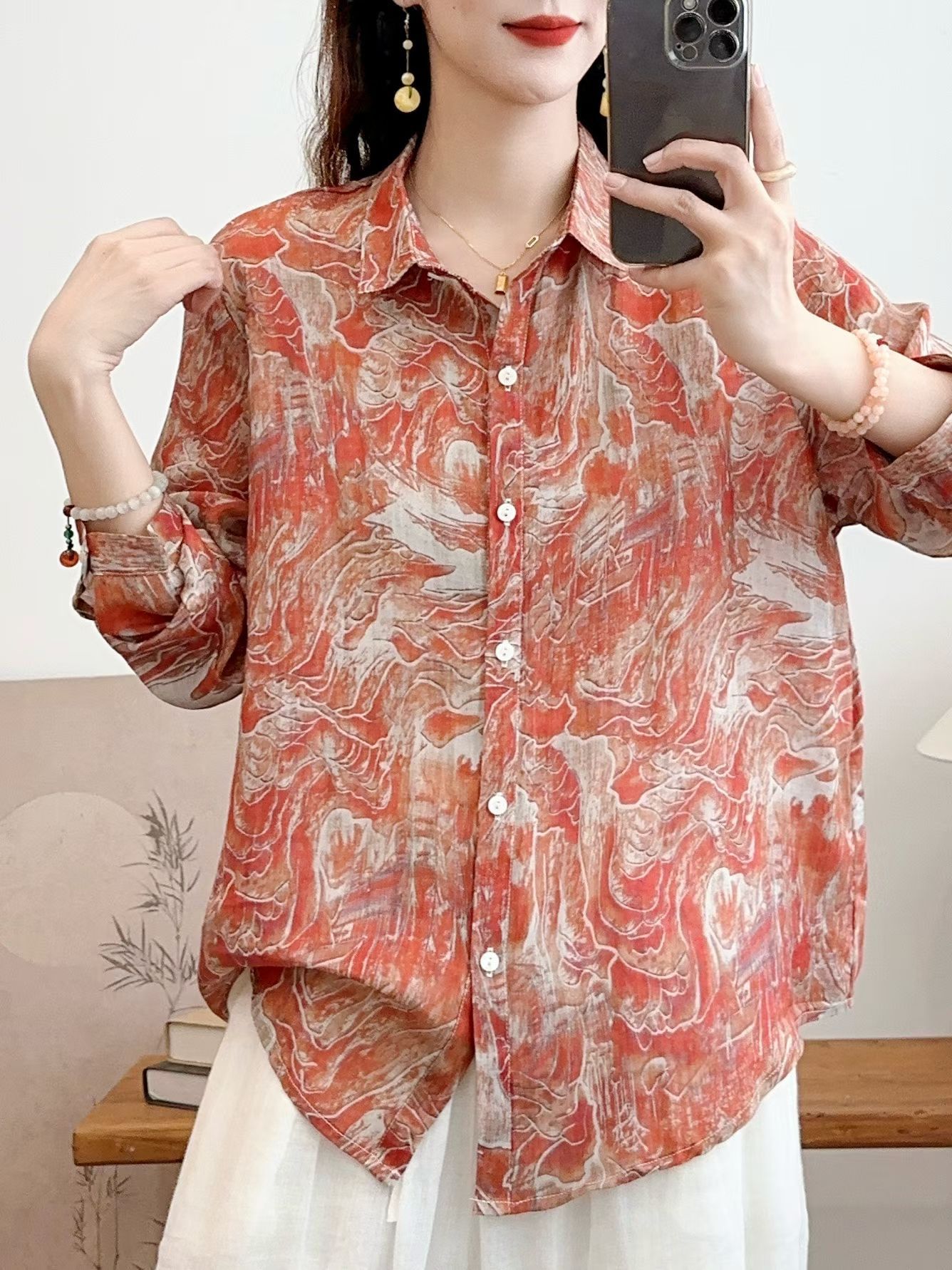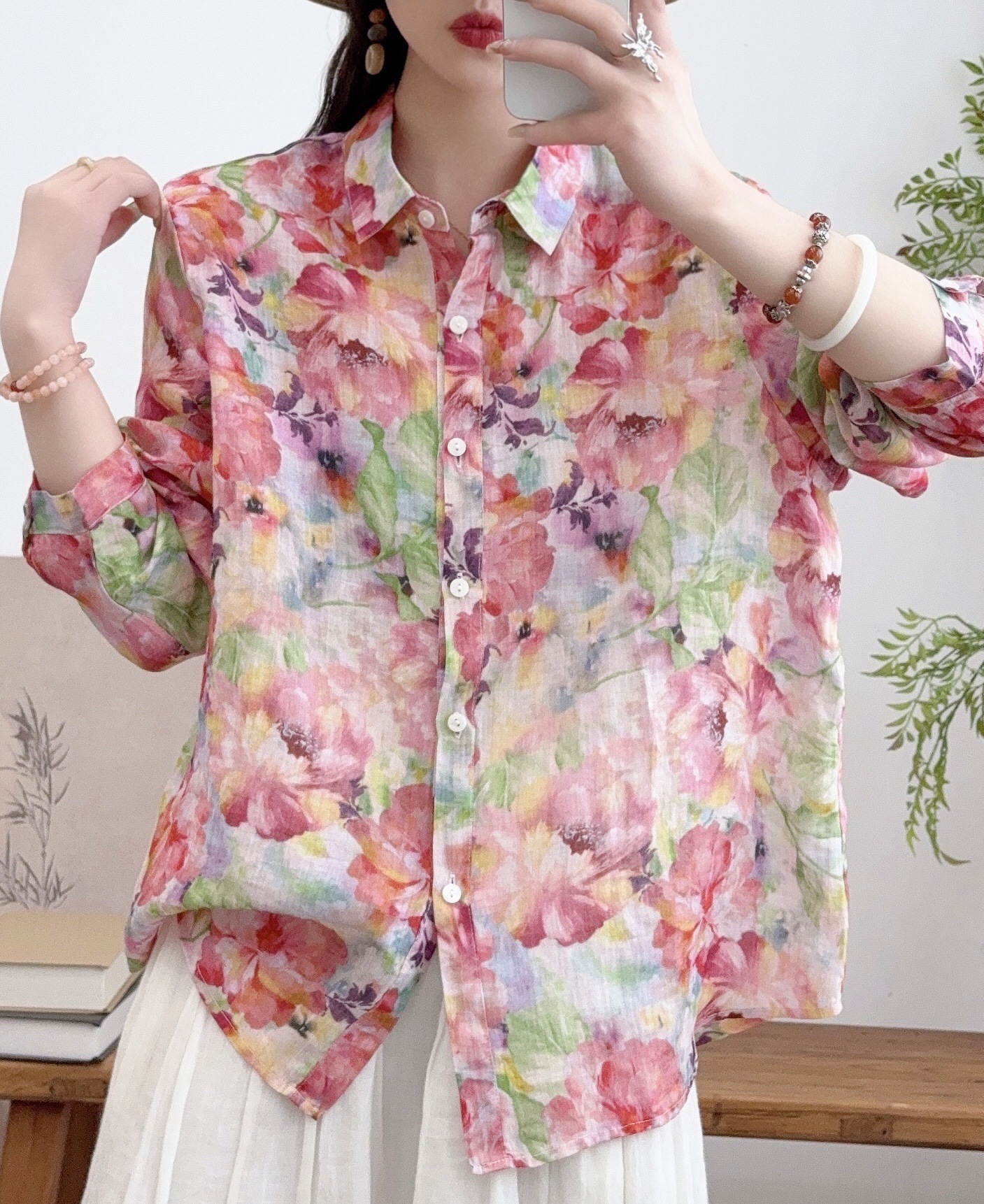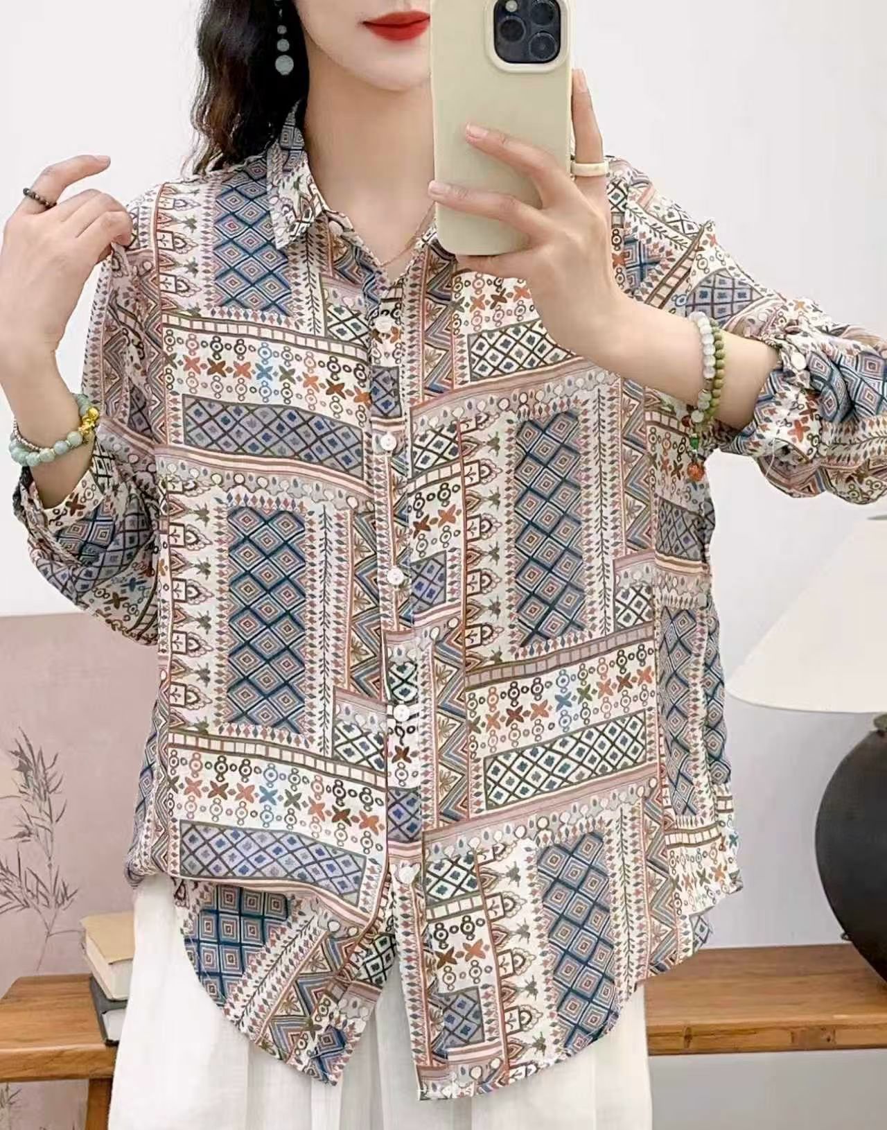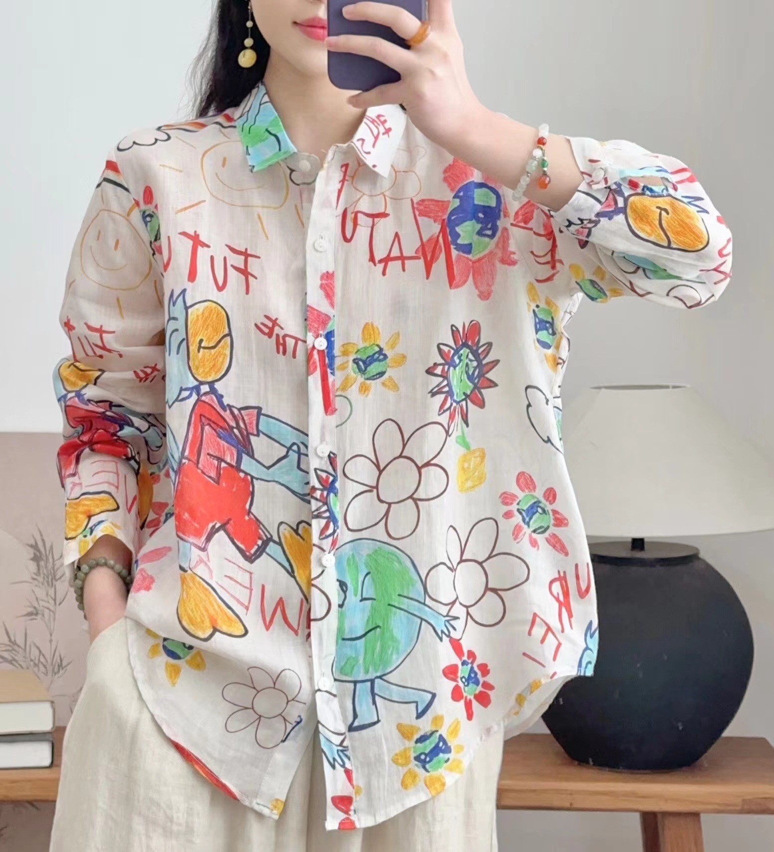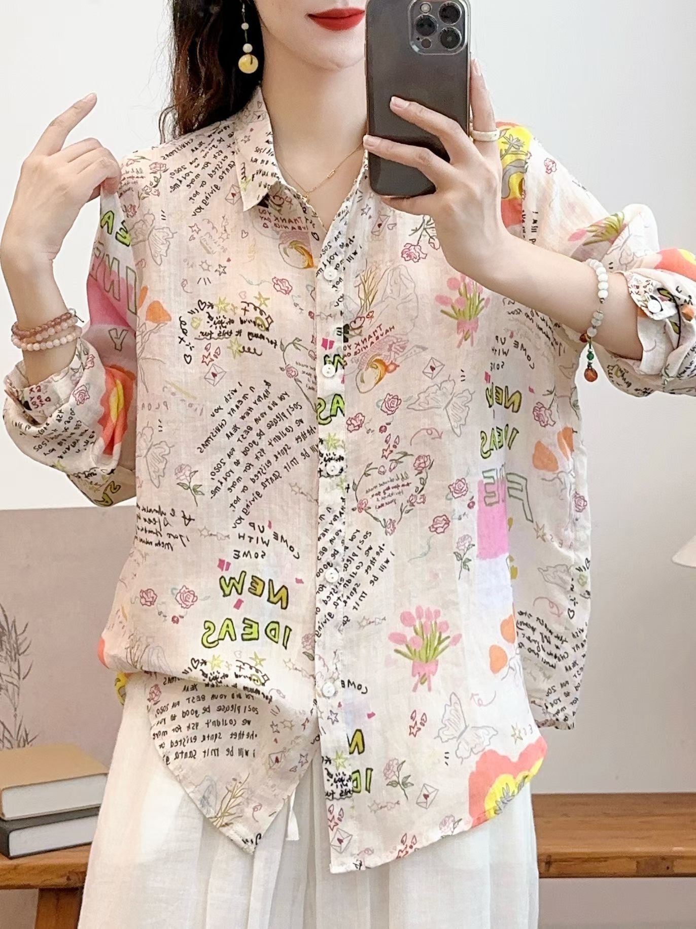 모리 소녀 예술적 라미 인쇄 셔츠 긴팔 여성용 옷깃 꽃 탑베이스 셔츠 라미 셔츠 탑 여성 의류스토어 가기