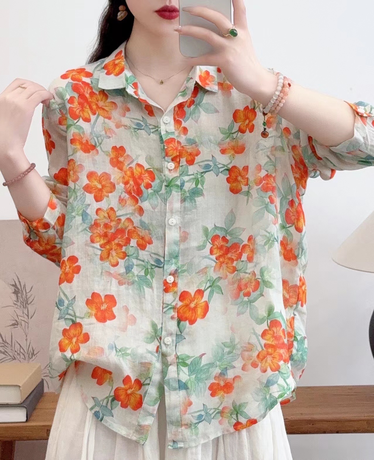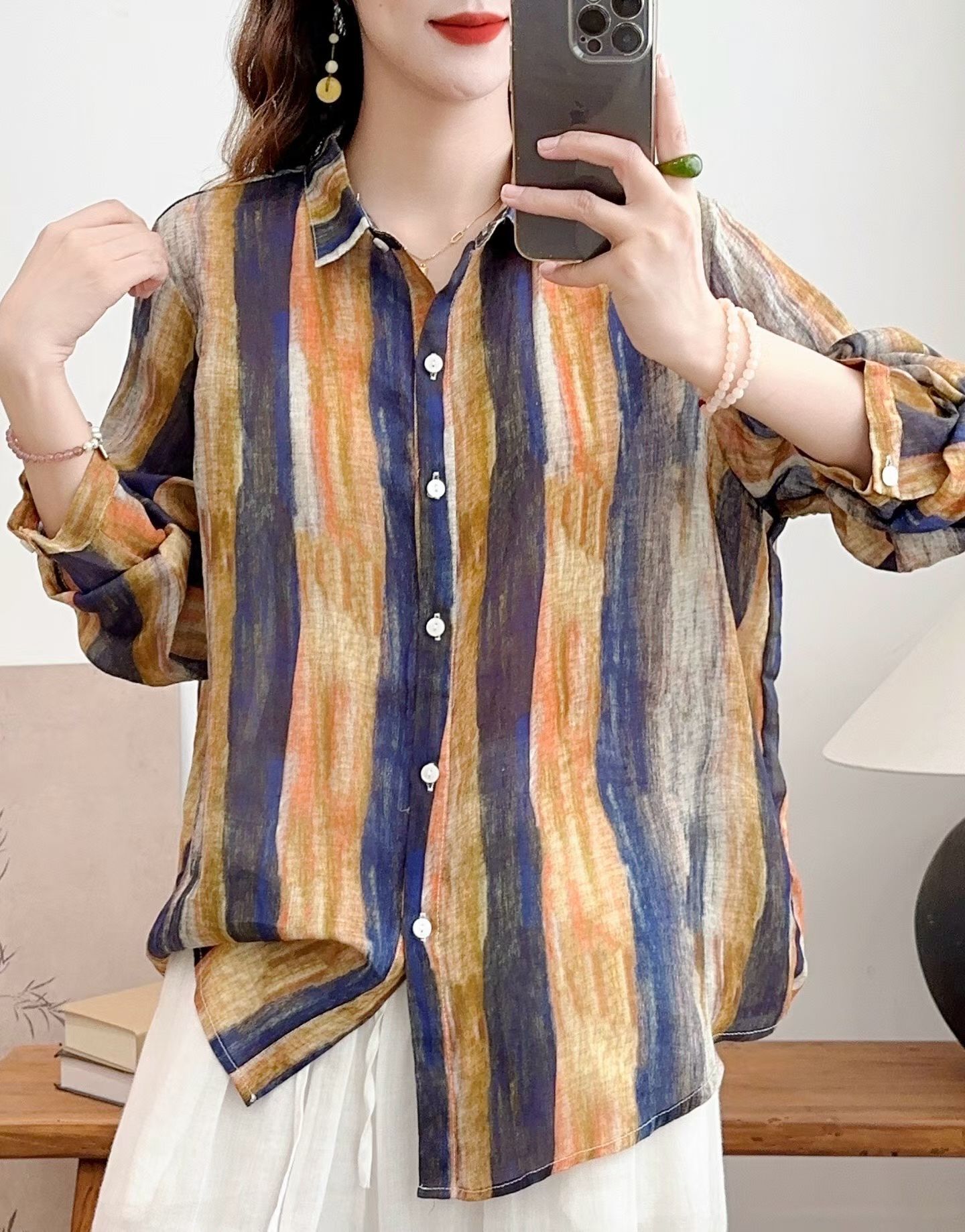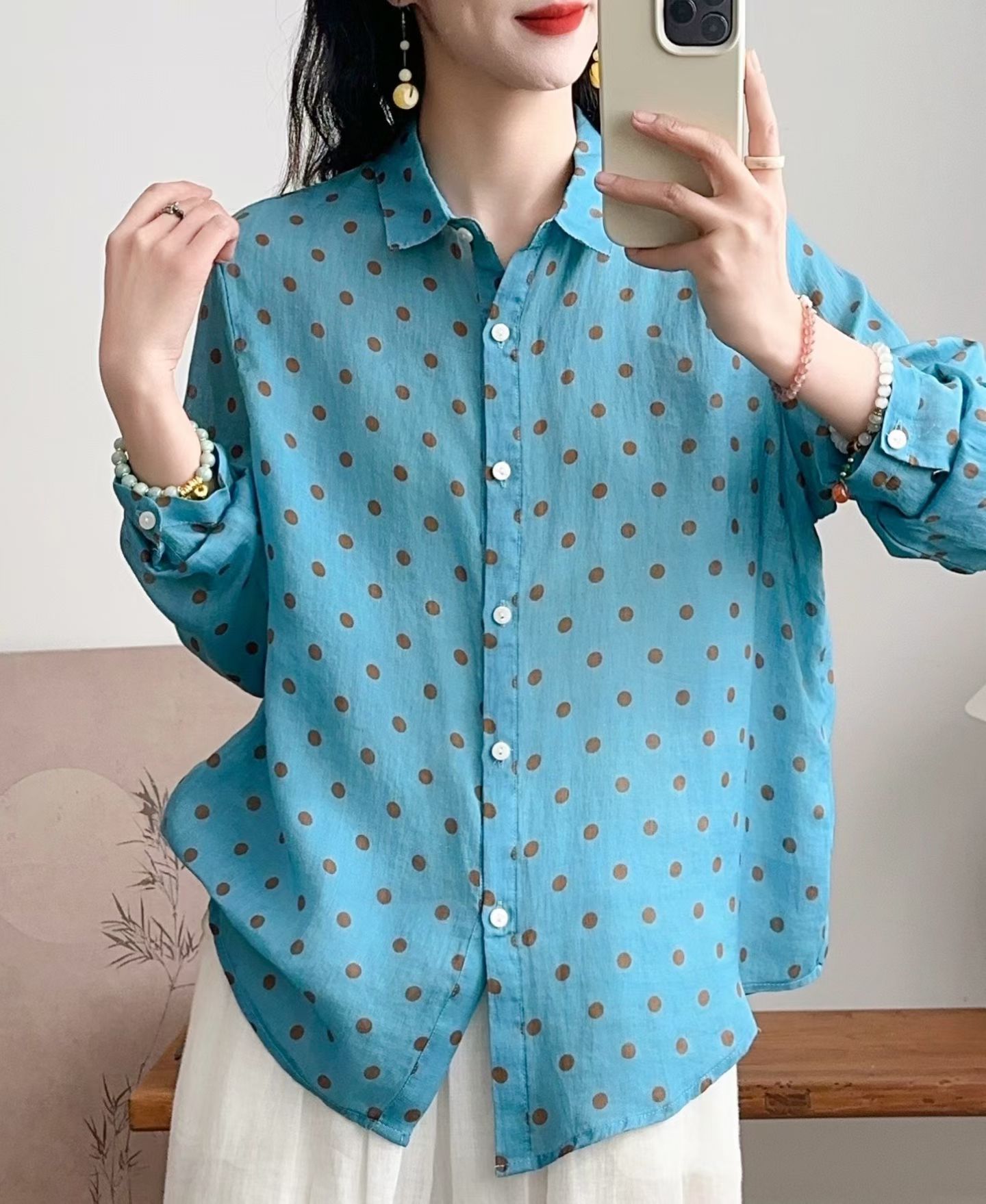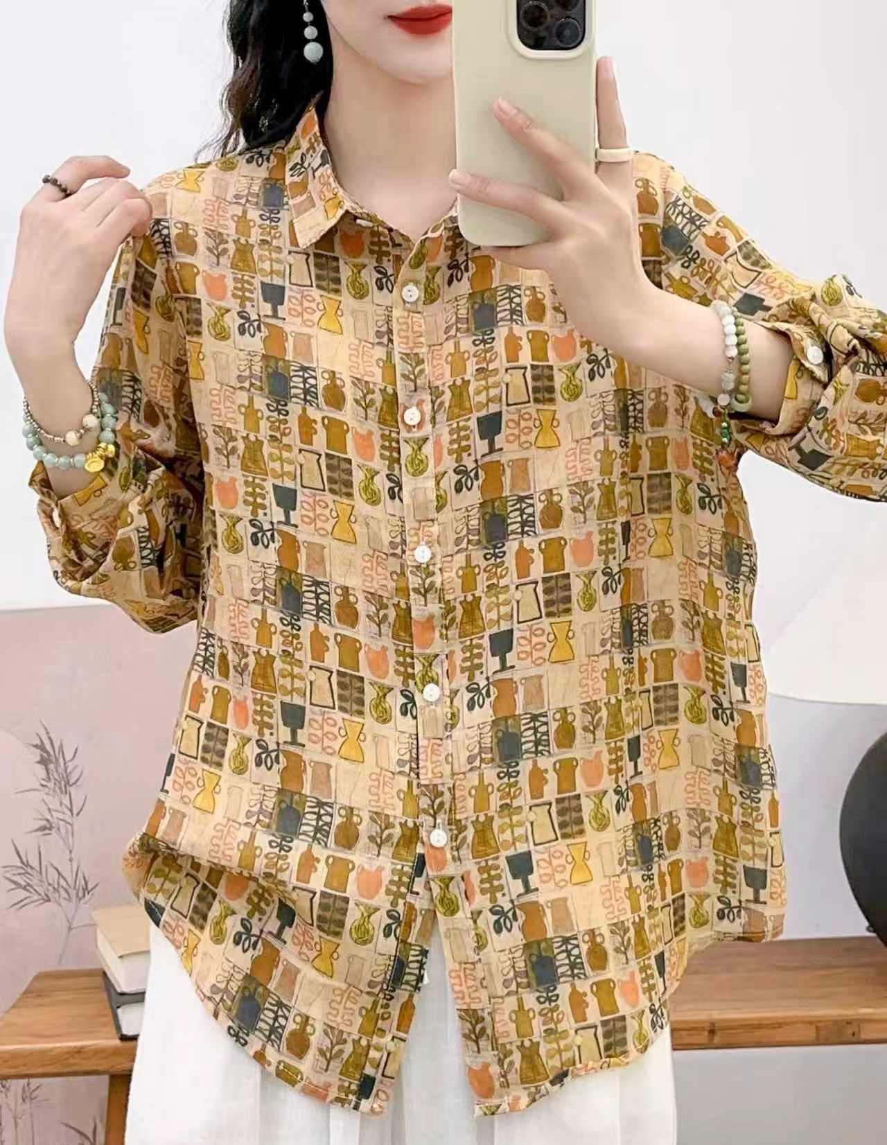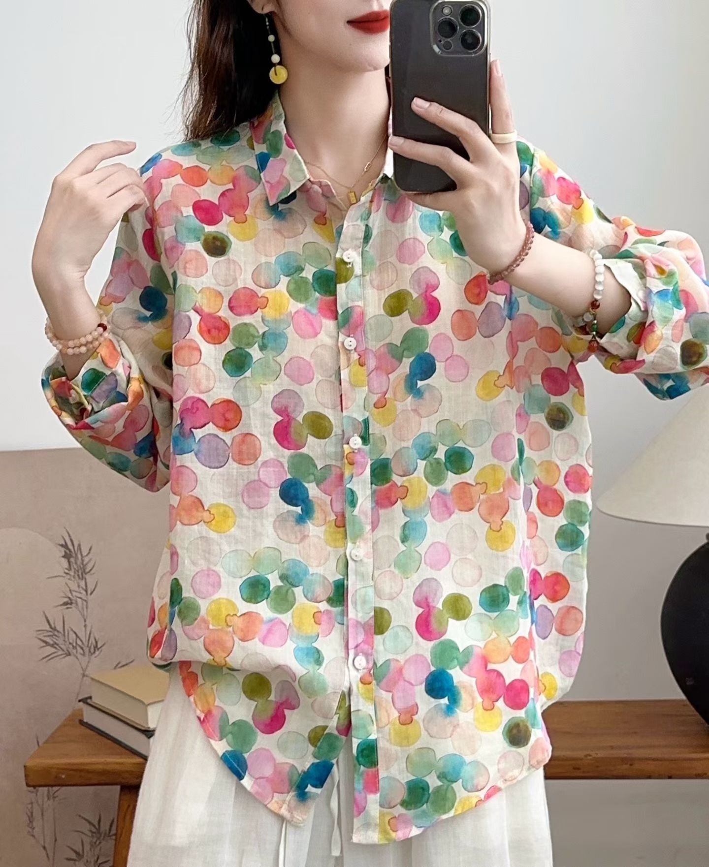 모리 소녀 예술적 라미 인쇄 셔츠 긴팔 여성용 옷깃 꽃 탑베이스 셔츠 라미 셔츠 탑 여성 의류스토어 가기