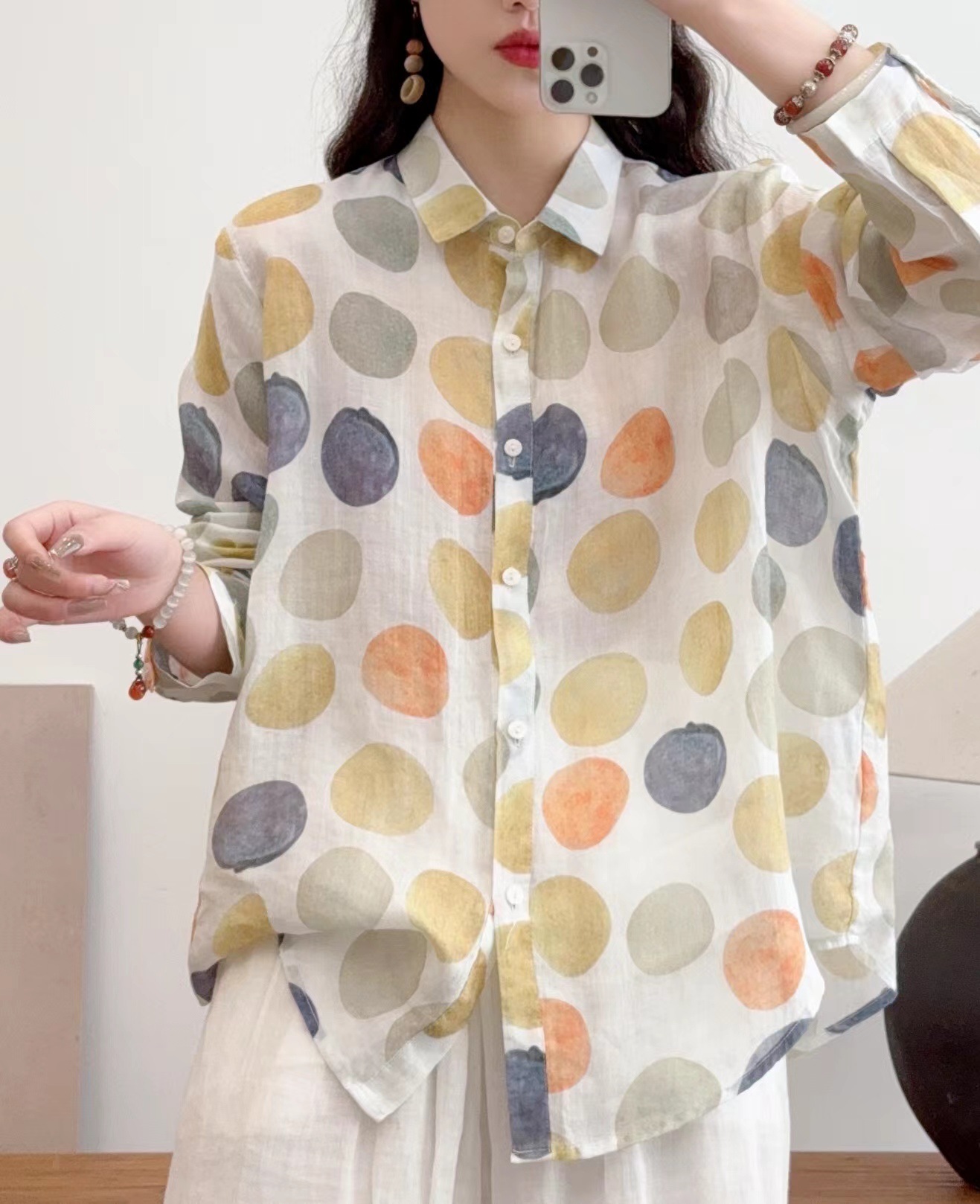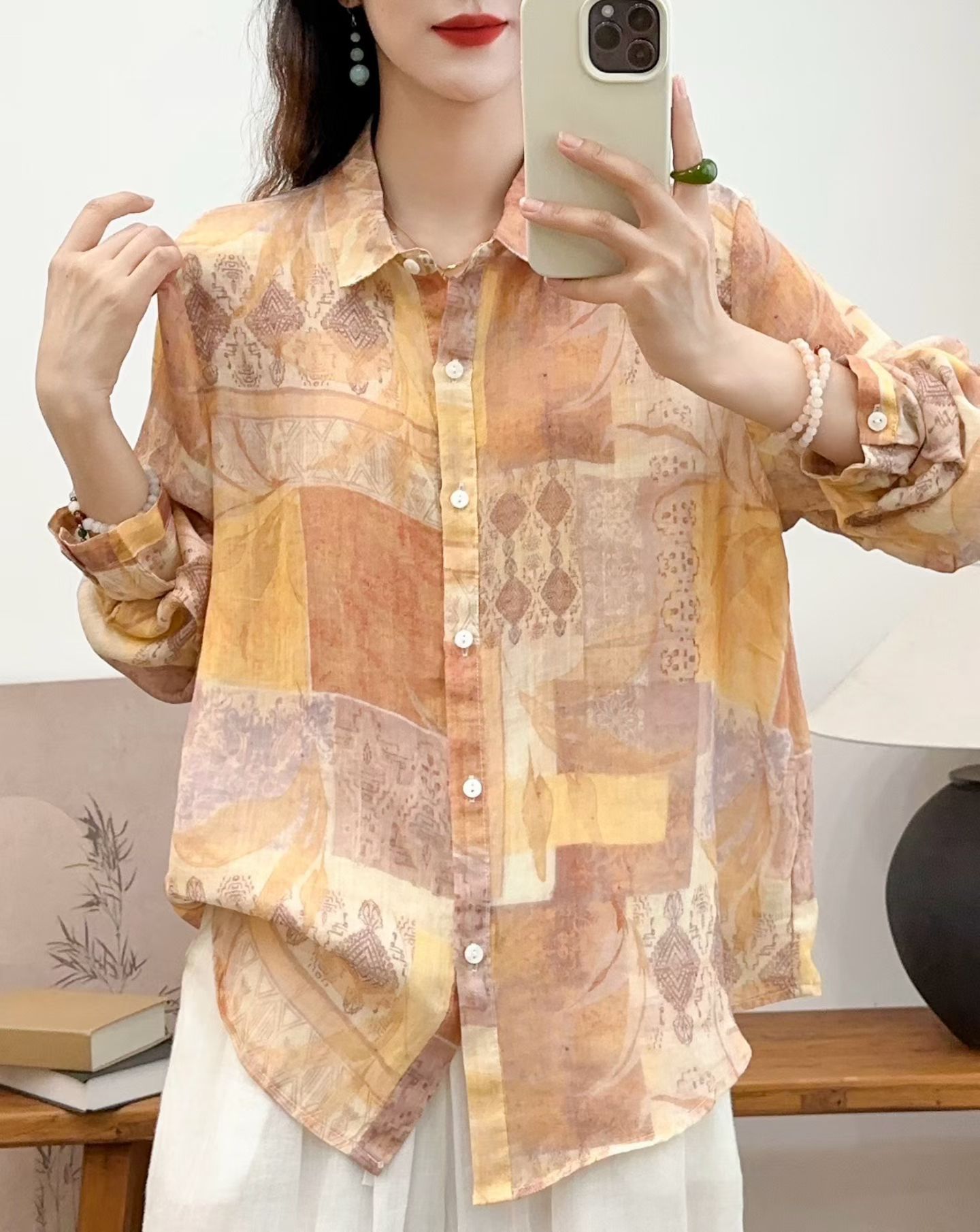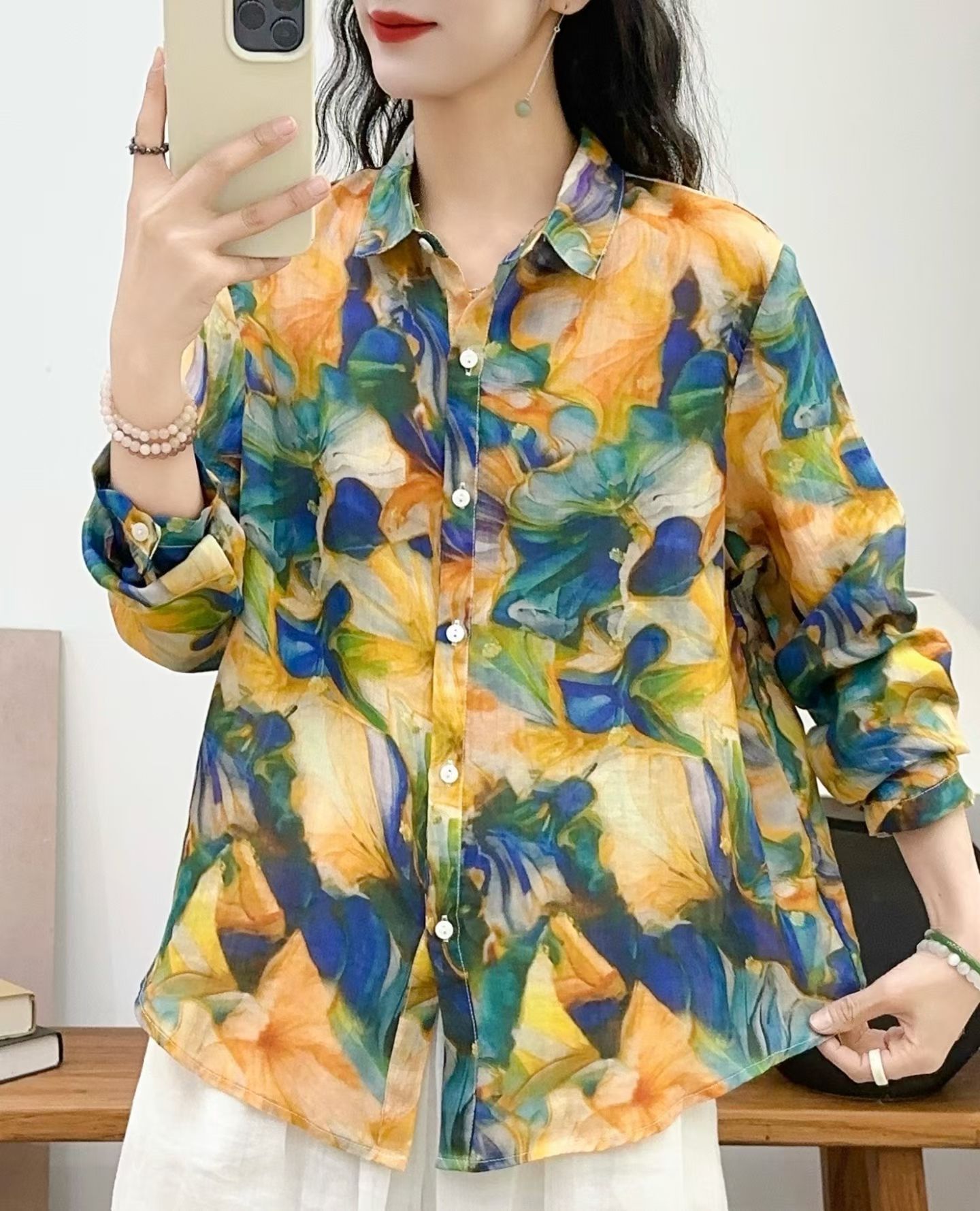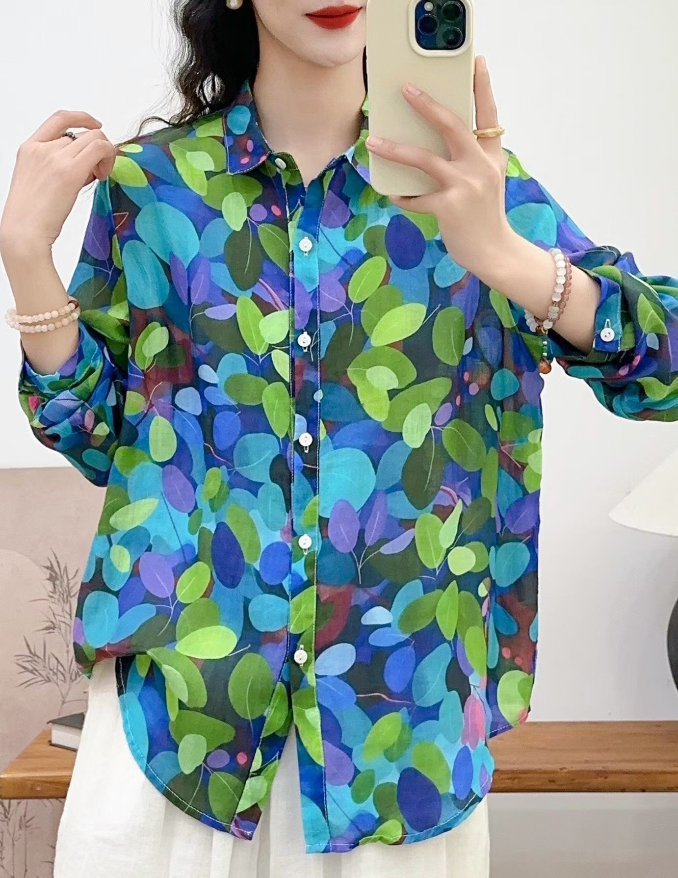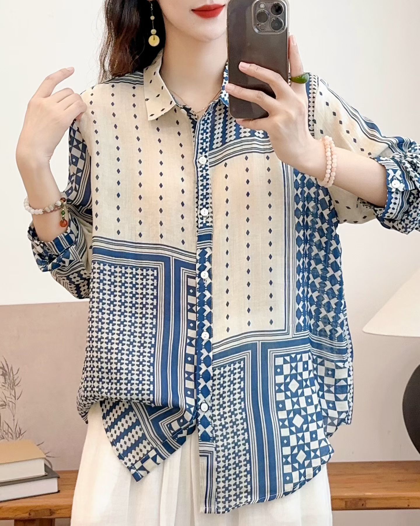 모리 소녀 예술적 라미 인쇄 셔츠 긴팔 여성용 옷깃 꽃 탑베이스 셔츠 라미 셔츠 탑 여성 의류스토어 가기