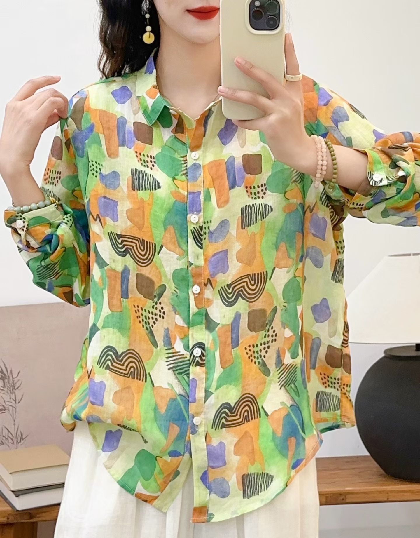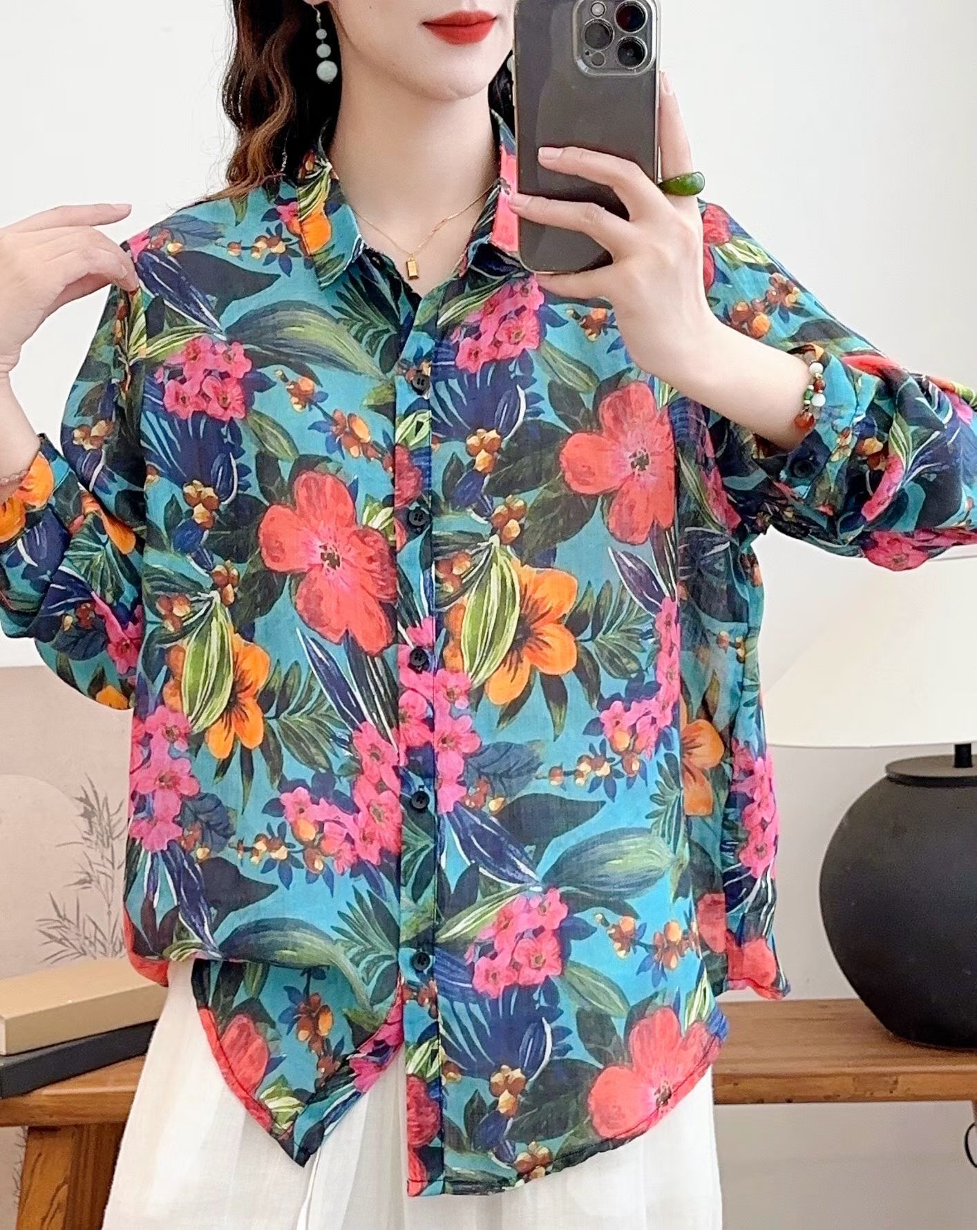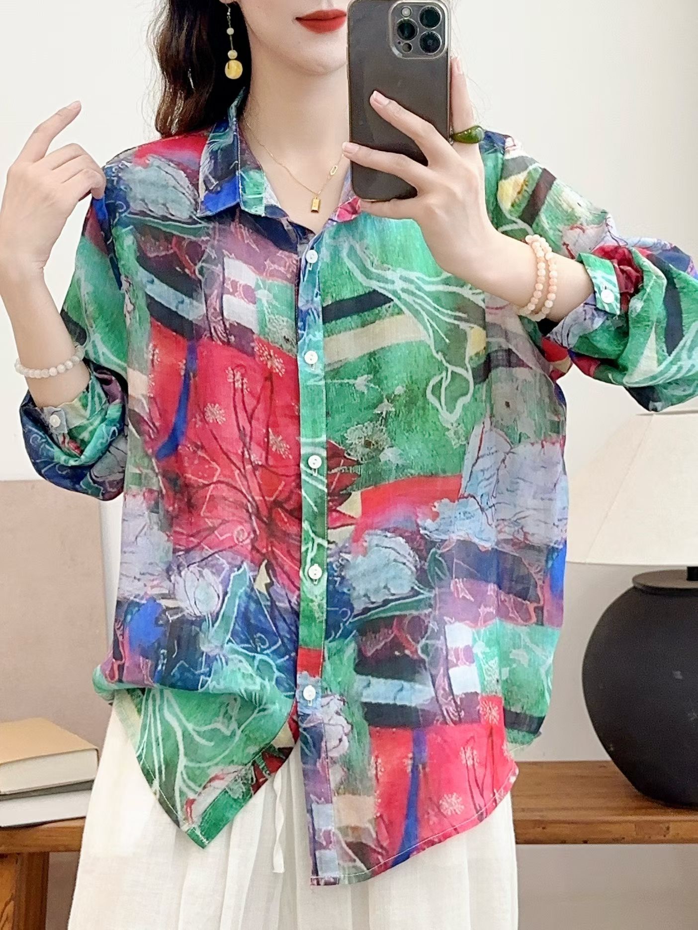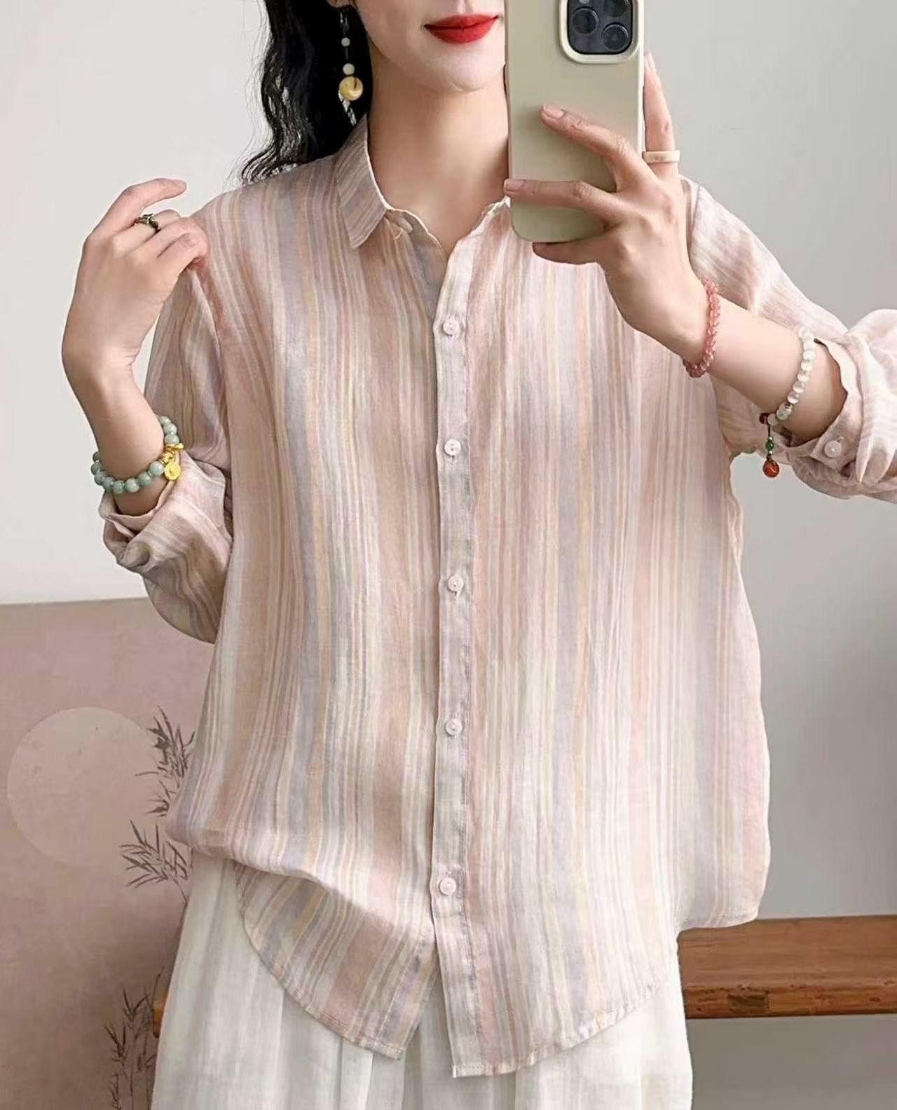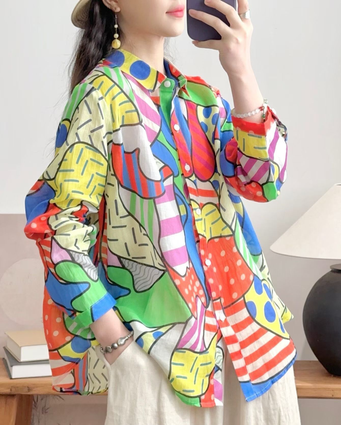 모리 소녀 예술적 라미 인쇄 셔츠 긴팔 여성용 옷깃 꽃 탑베이스 셔츠 라미 셔츠 탑 여성 의류스토어 가기
