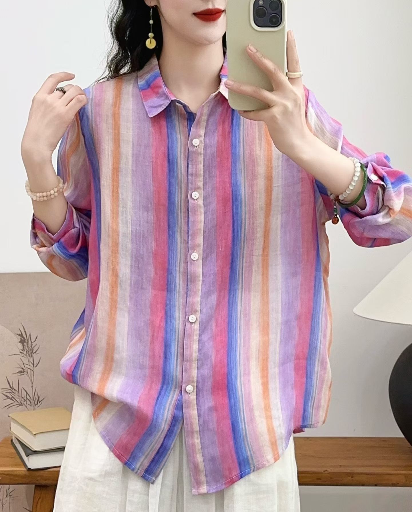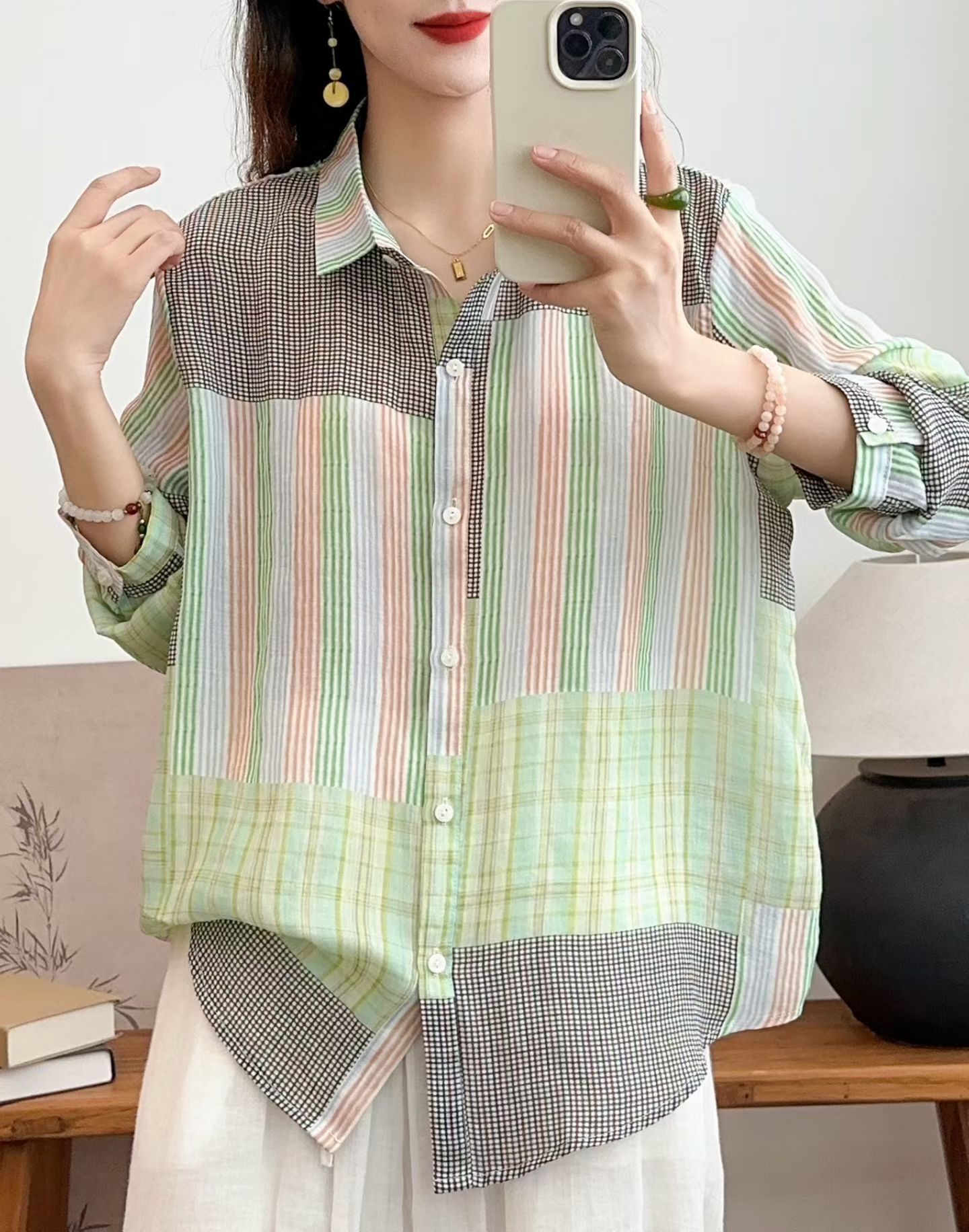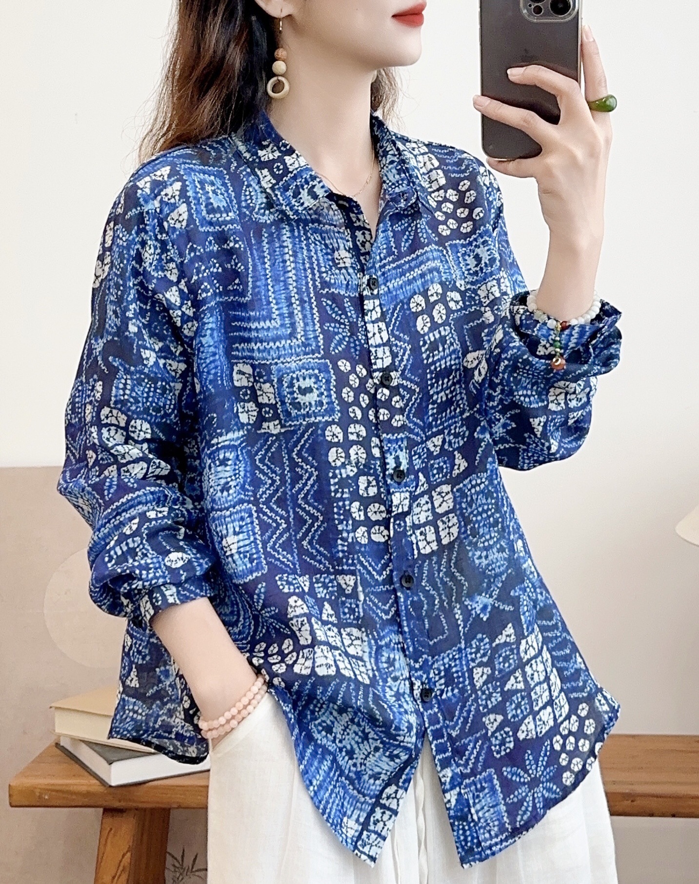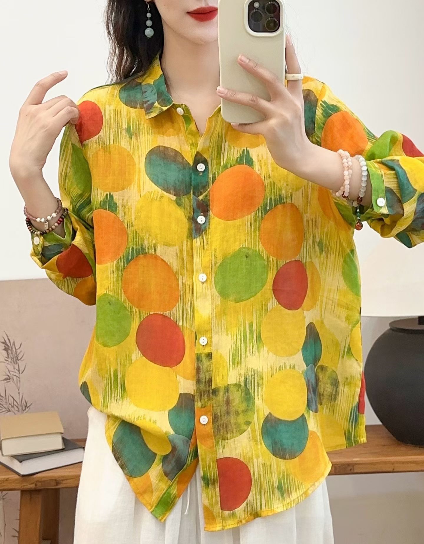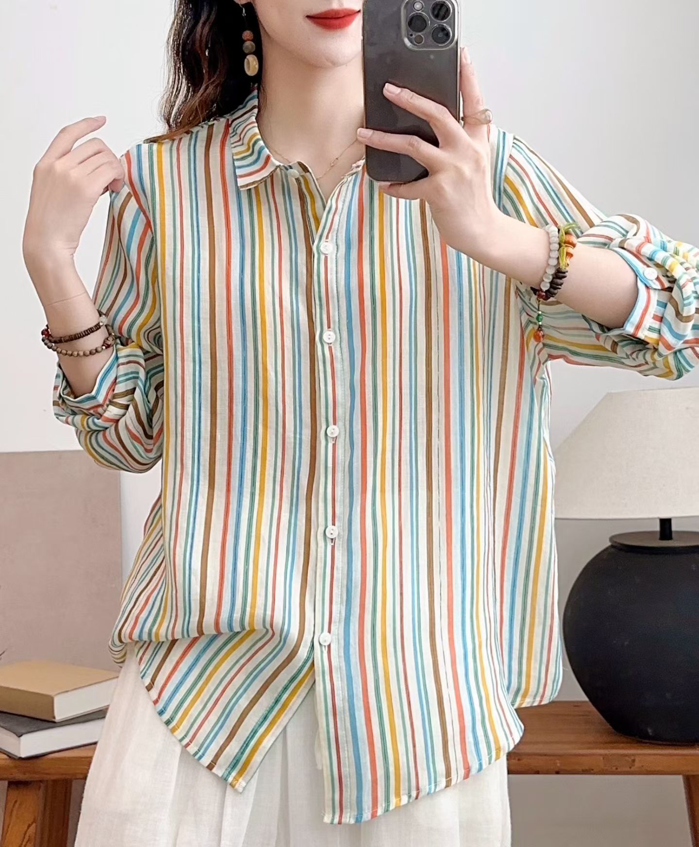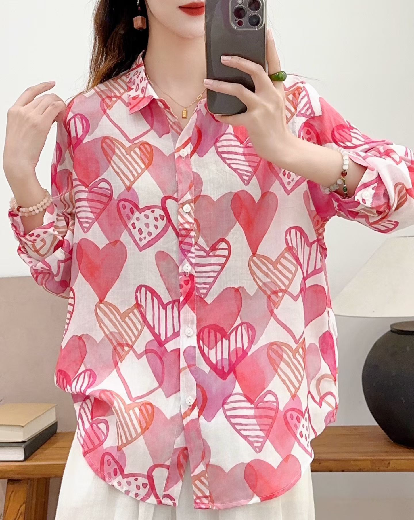 모리 소녀 예술적 라미 인쇄 셔츠 긴팔 여성용 옷깃 꽃 탑베이스 셔츠 라미 셔츠 탑 여성 의류스토어 가기