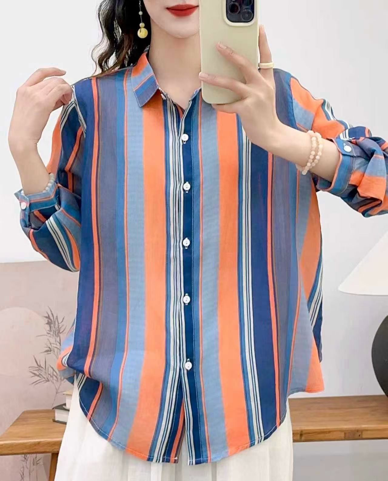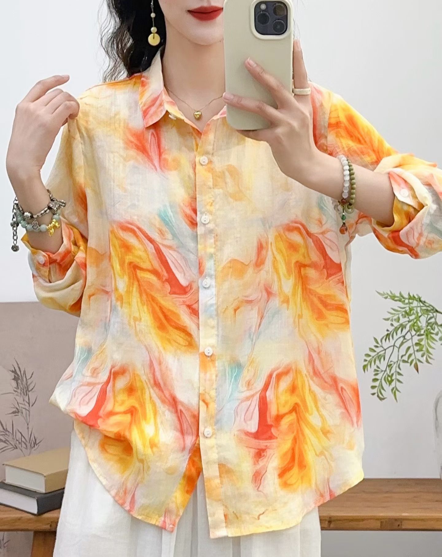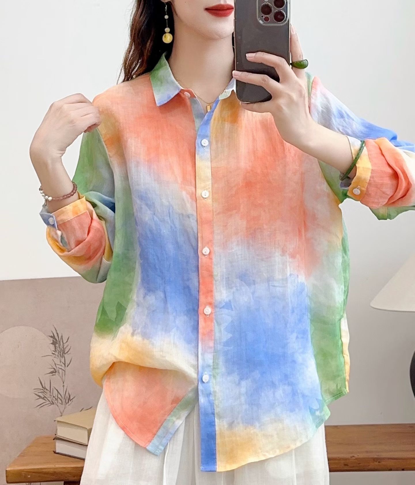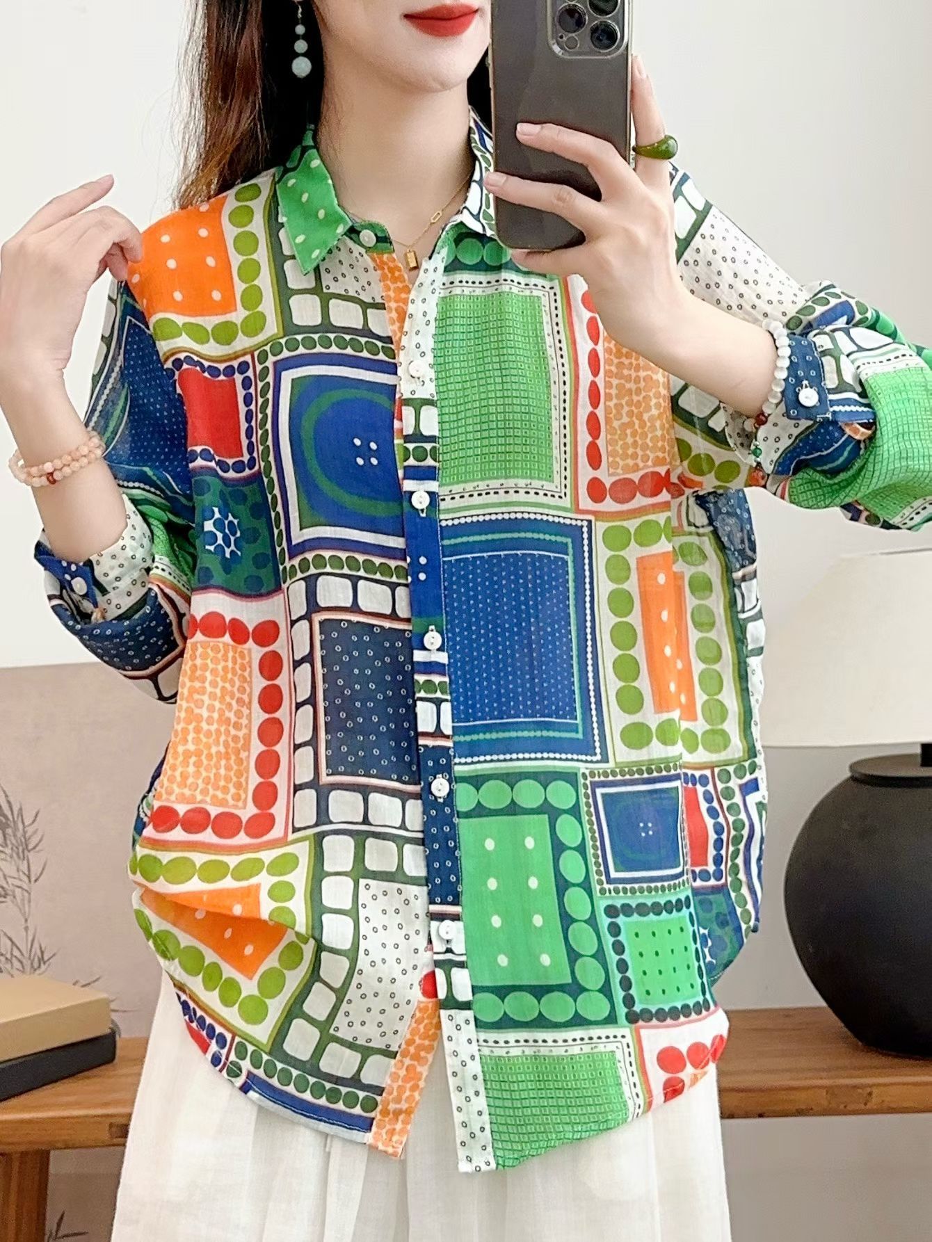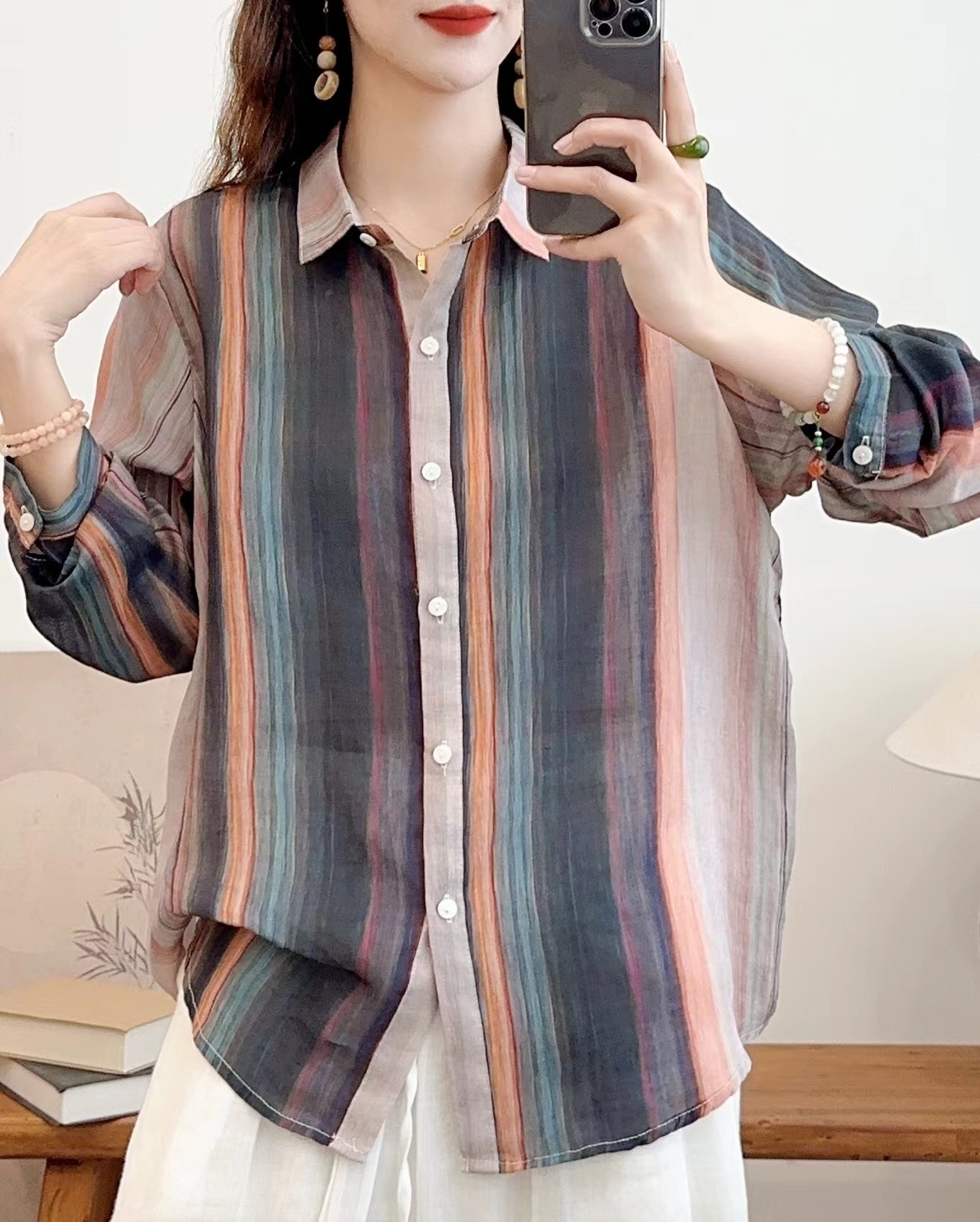 모리 소녀 예술적 라미 인쇄 셔츠 긴팔 여성용 옷깃 꽃 탑베이스 셔츠 라미 셔츠 탑 여성 의류스토어 가기