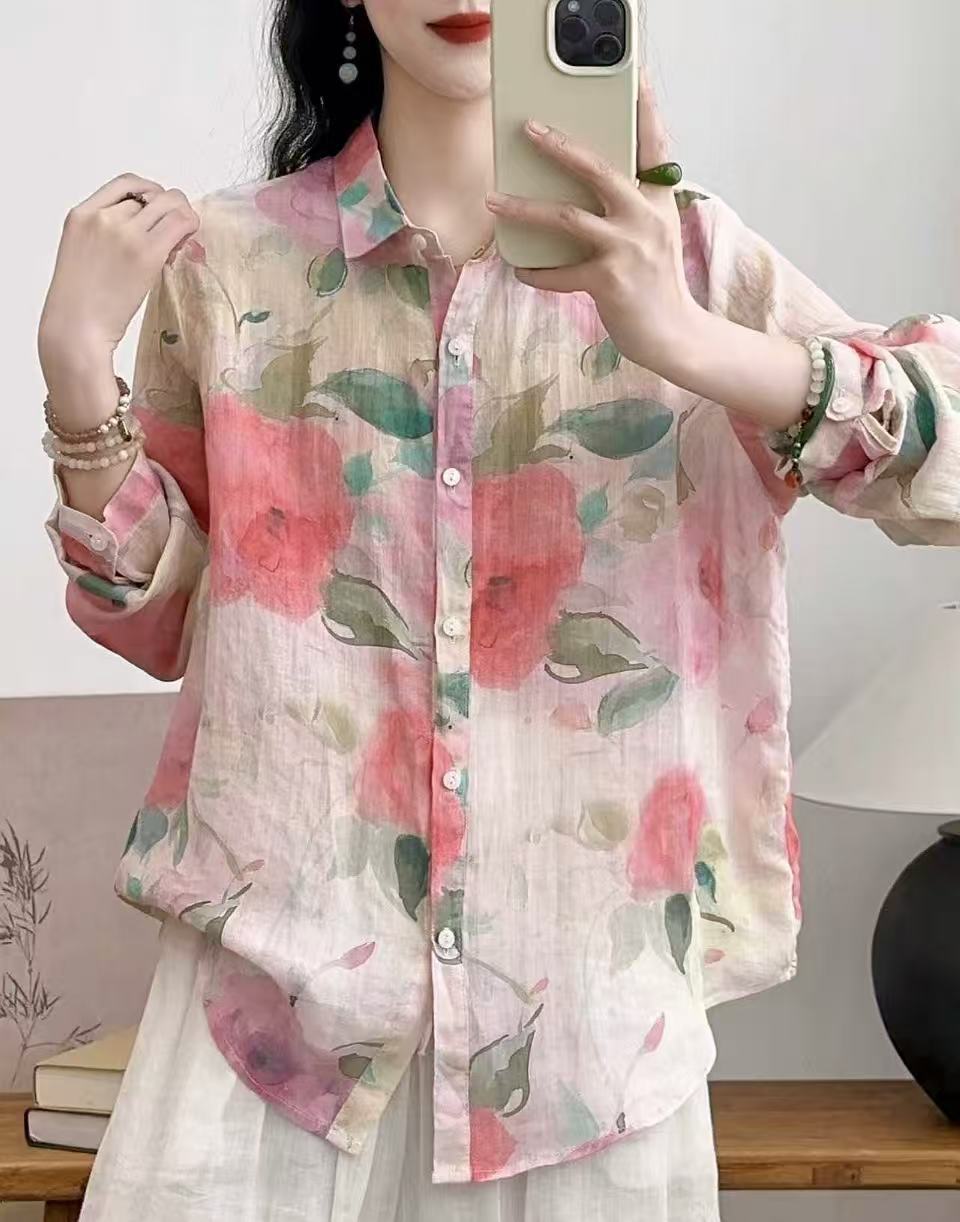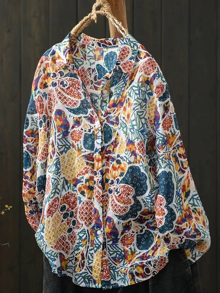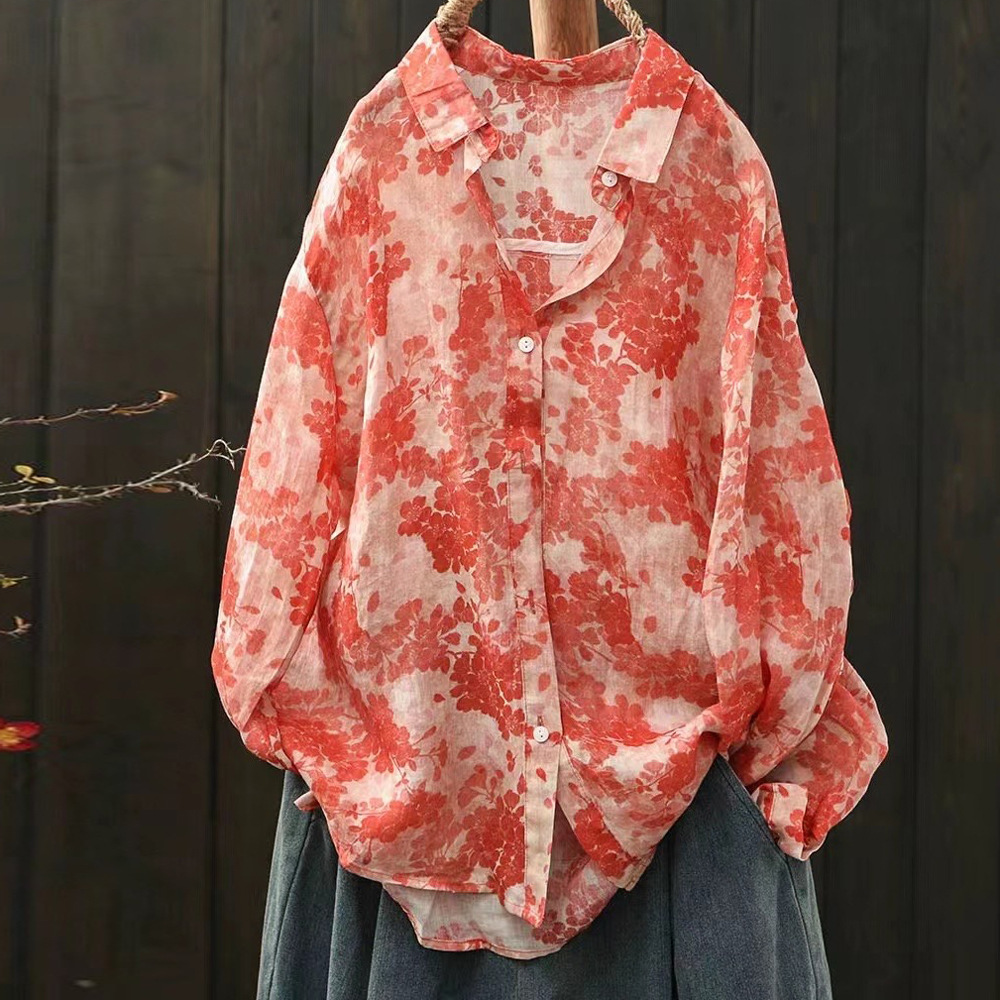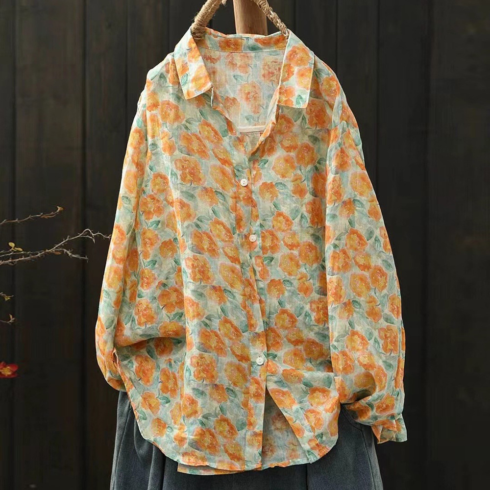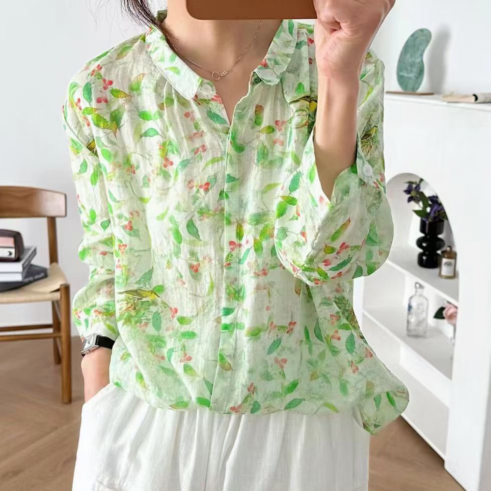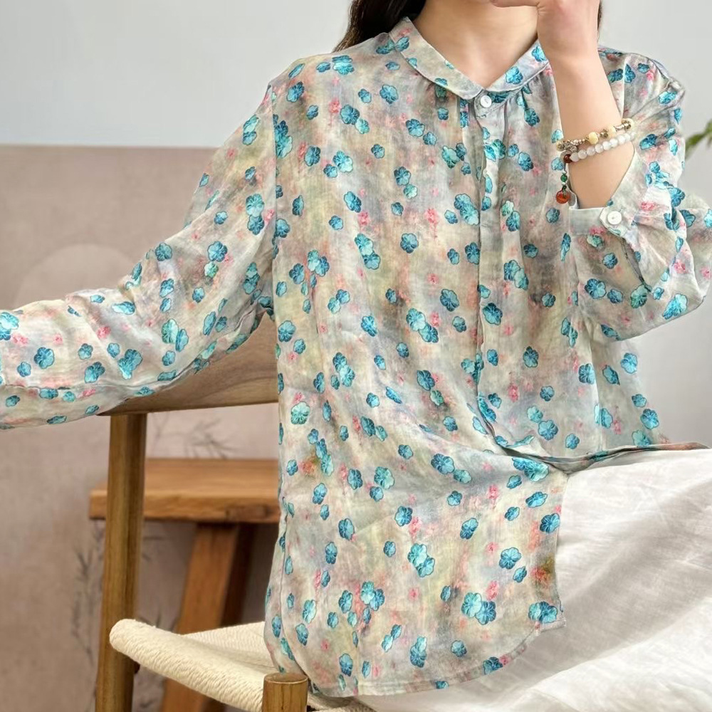 모리 소녀 예술적 라미 인쇄 셔츠 긴팔 여성용 옷깃 꽃 탑베이스 셔츠 라미 셔츠 탑 여성 의류