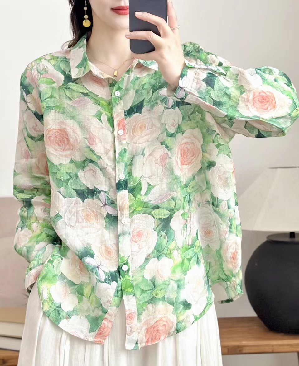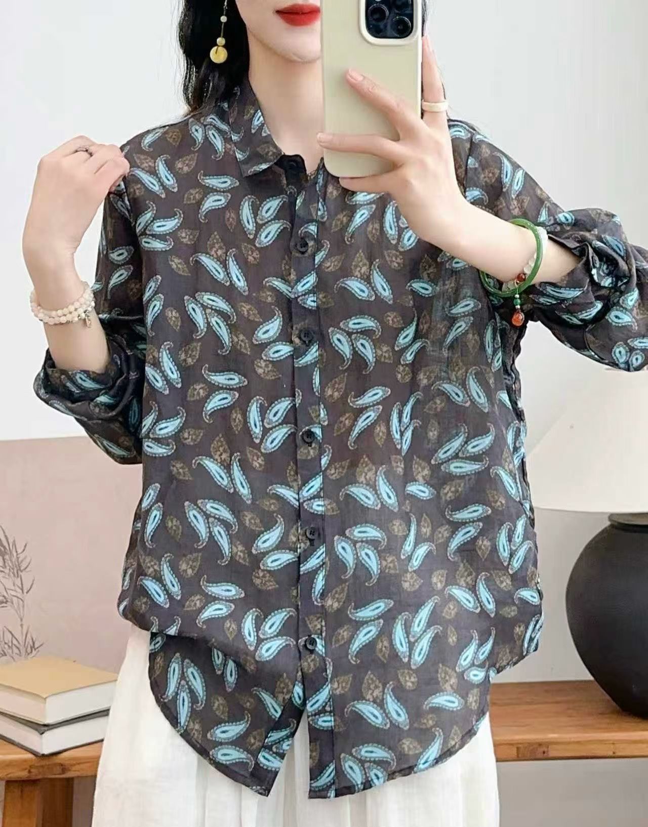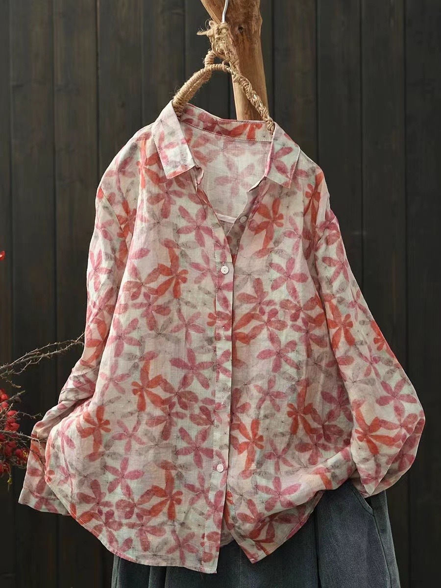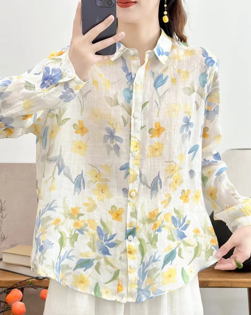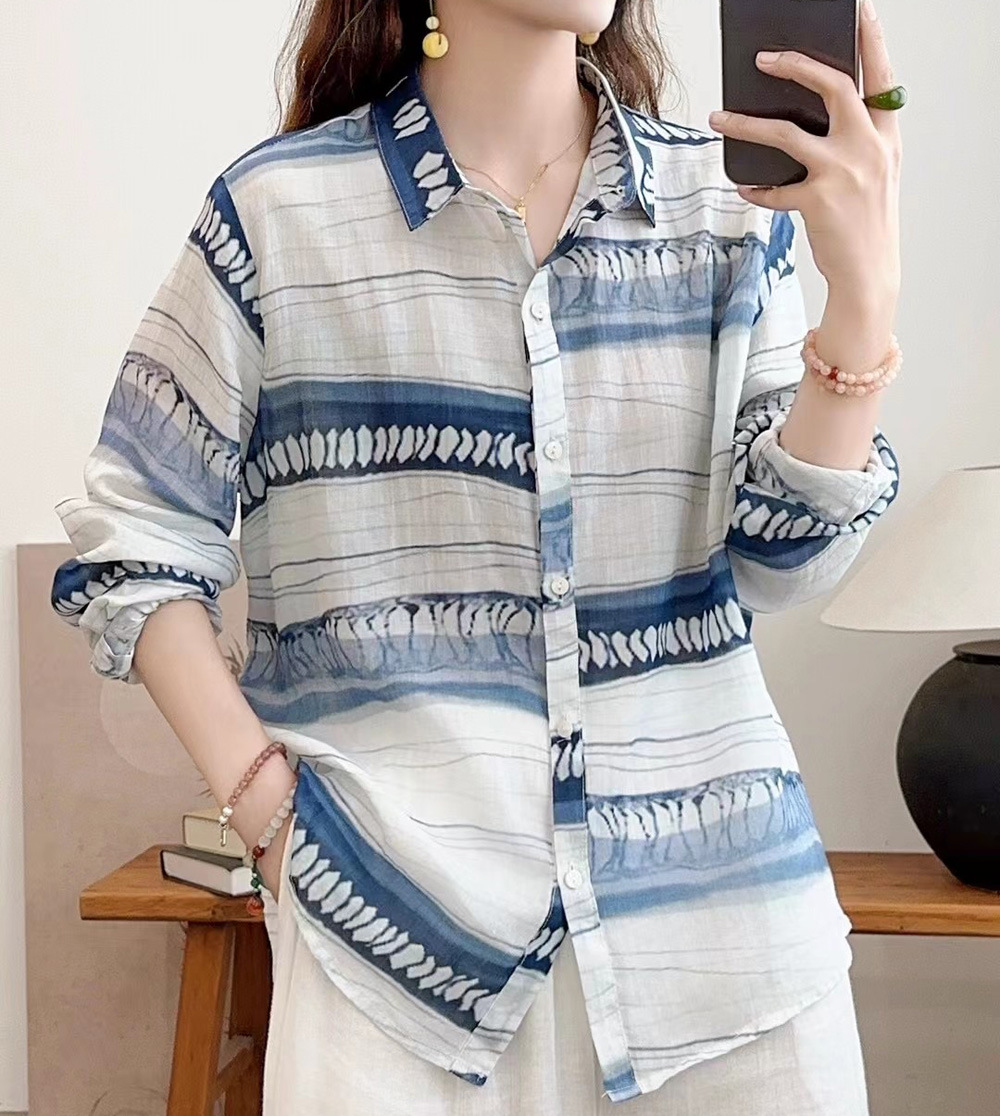 모리 소녀 예술적 라미 인쇄 셔츠 긴팔 여성용 옷깃 꽃 탑베이스 셔츠 라미 셔츠 탑 여성 의류