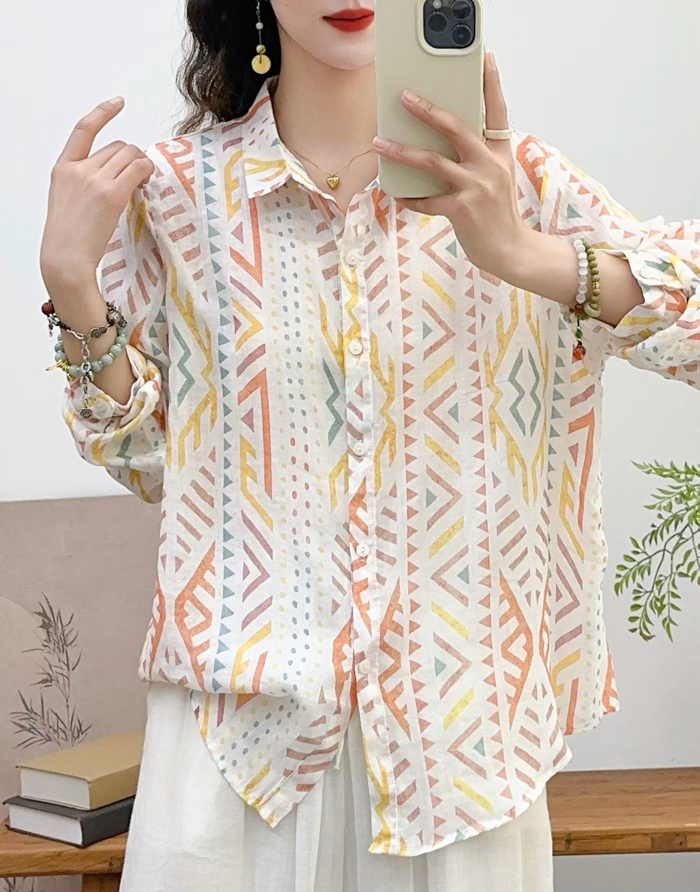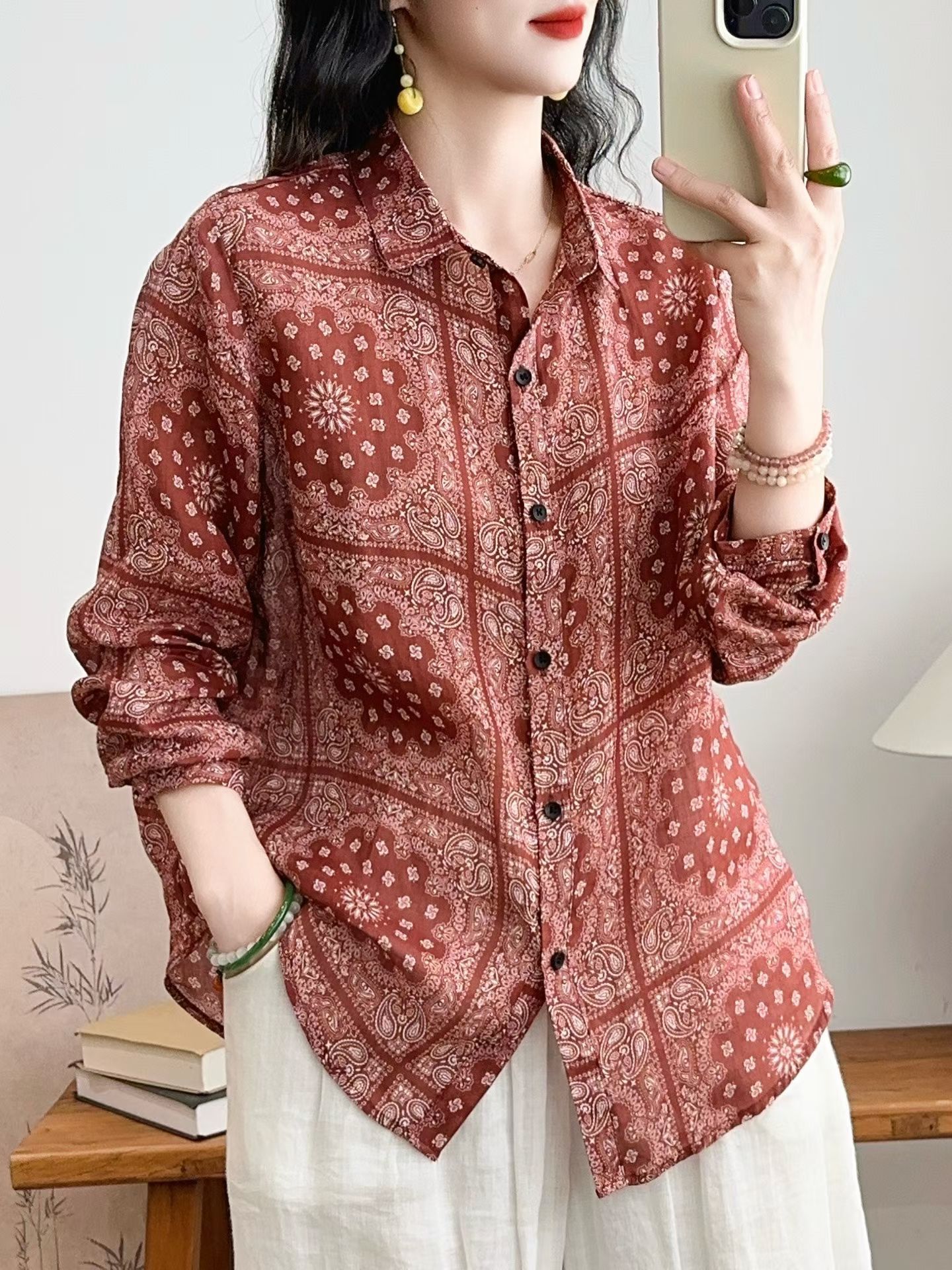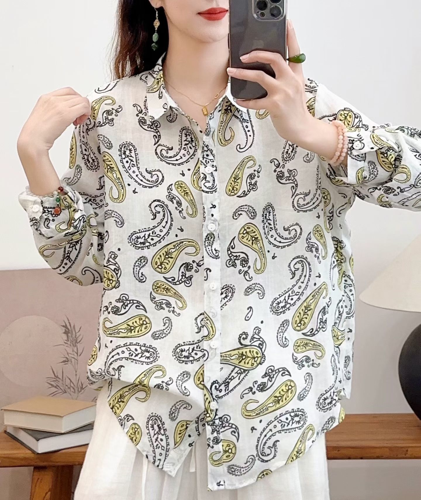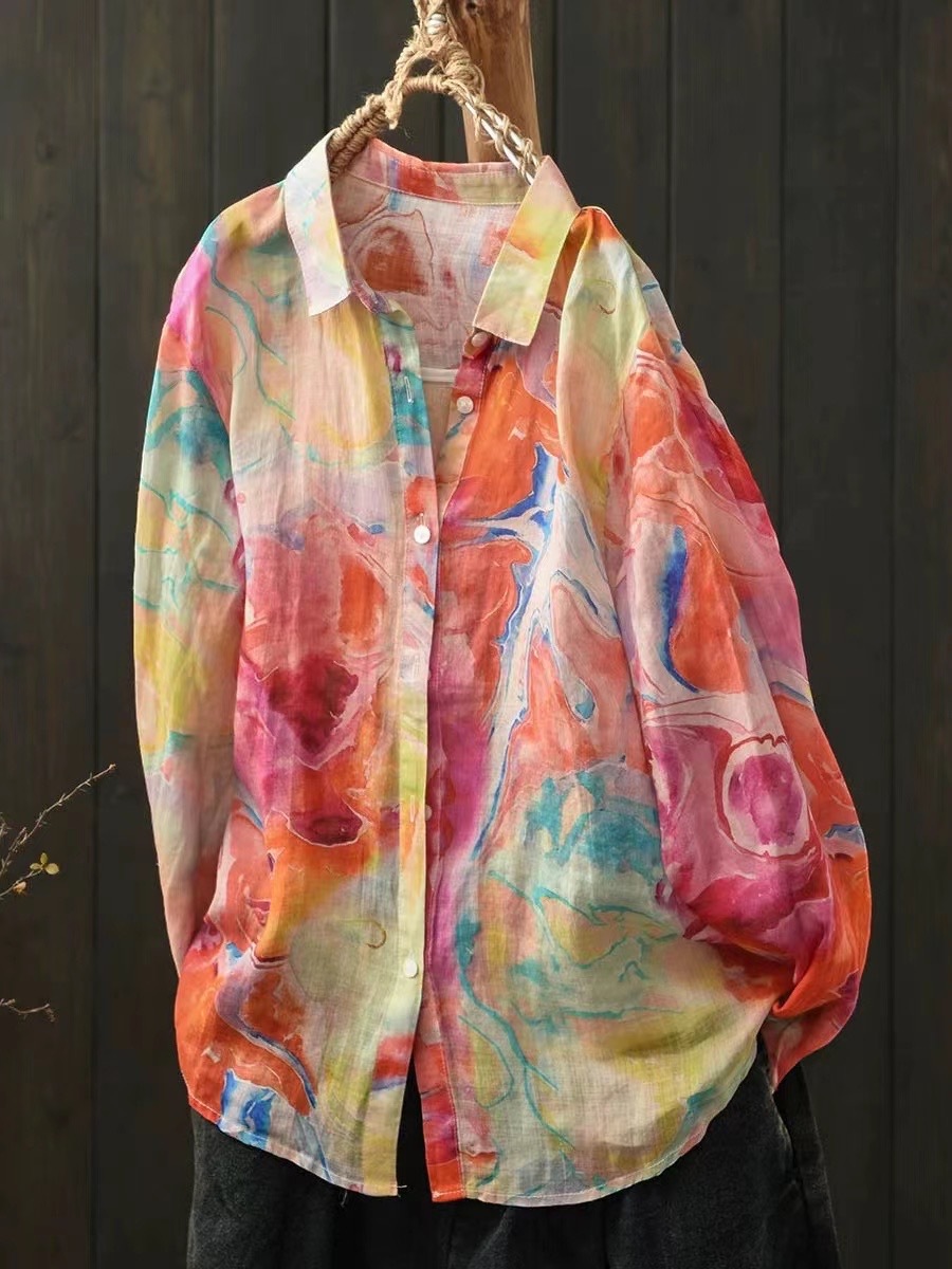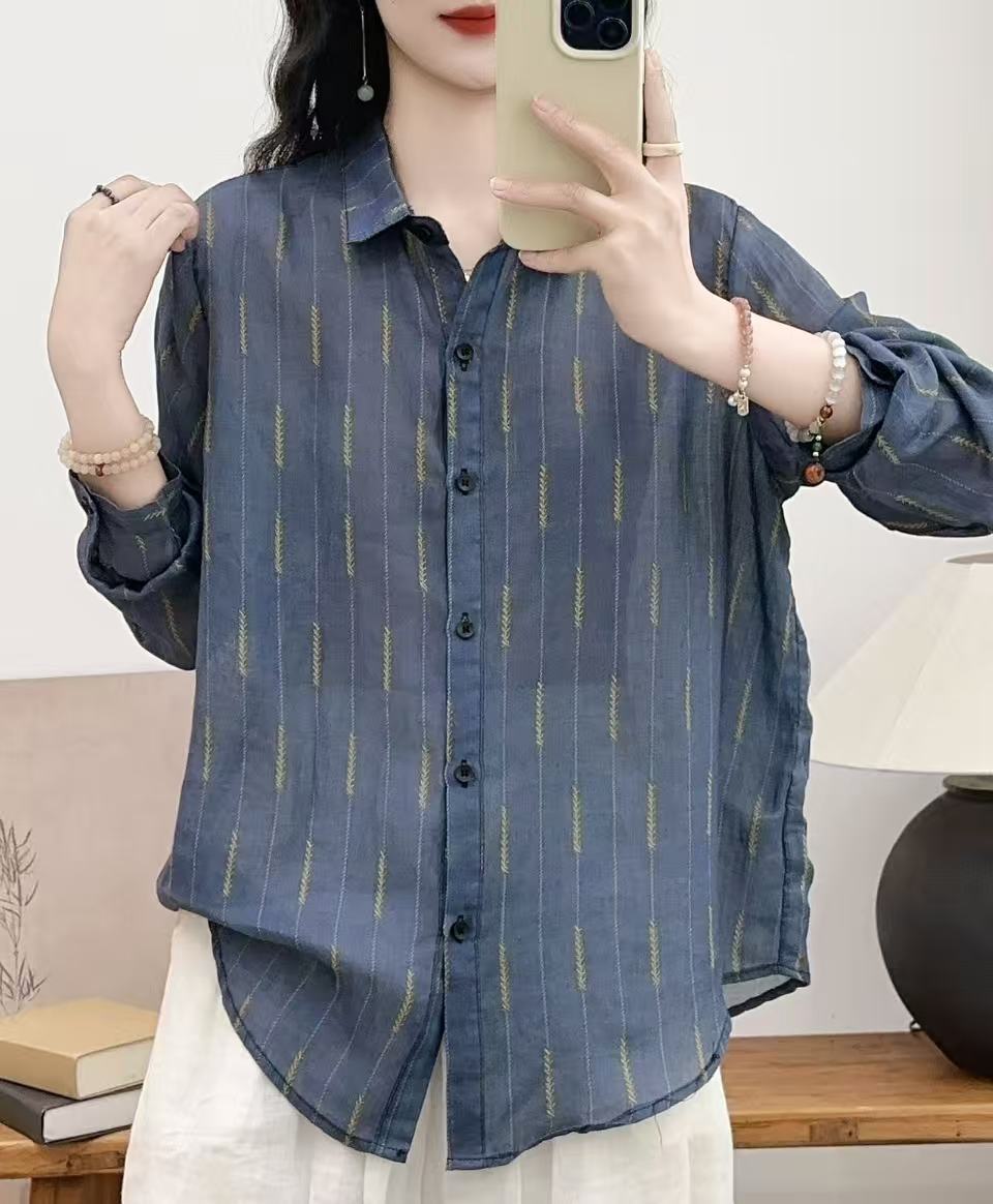 모리 소녀 예술적 라미 인쇄 셔츠 긴팔 여성용 옷깃 꽃 탑베이스 셔츠 라미 셔츠 탑 여성 의류