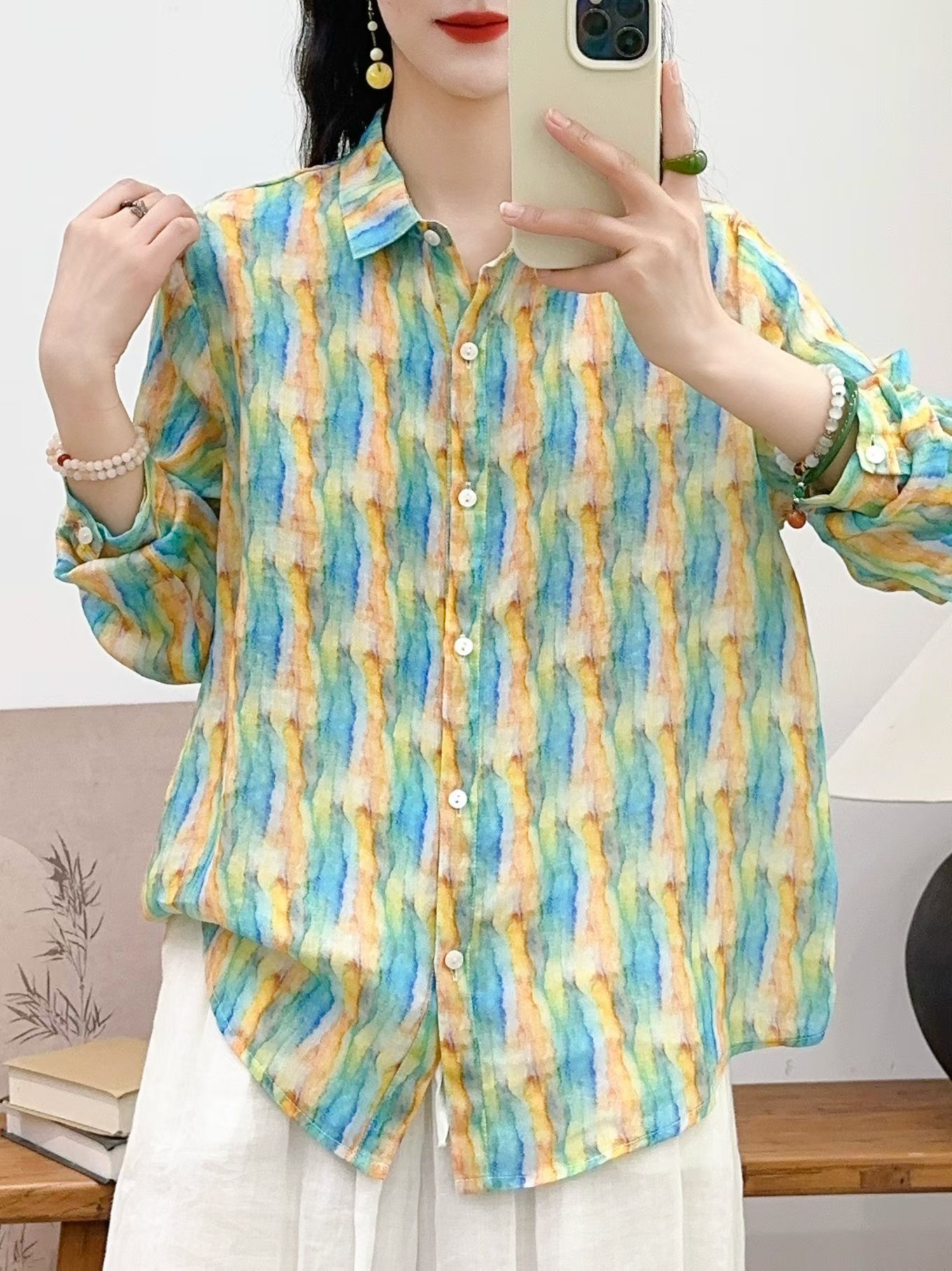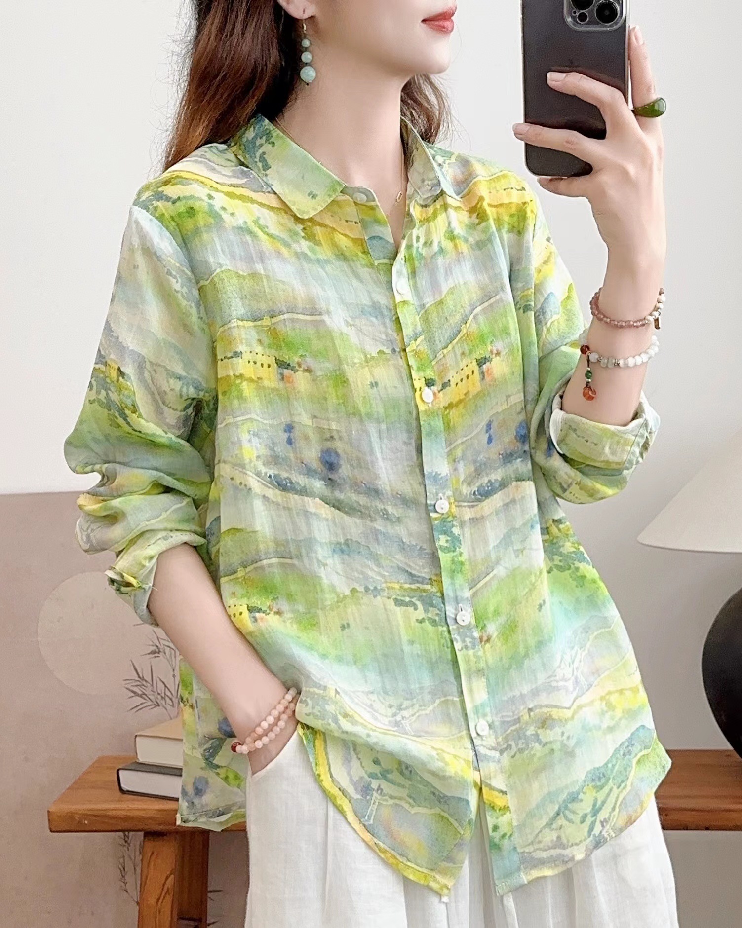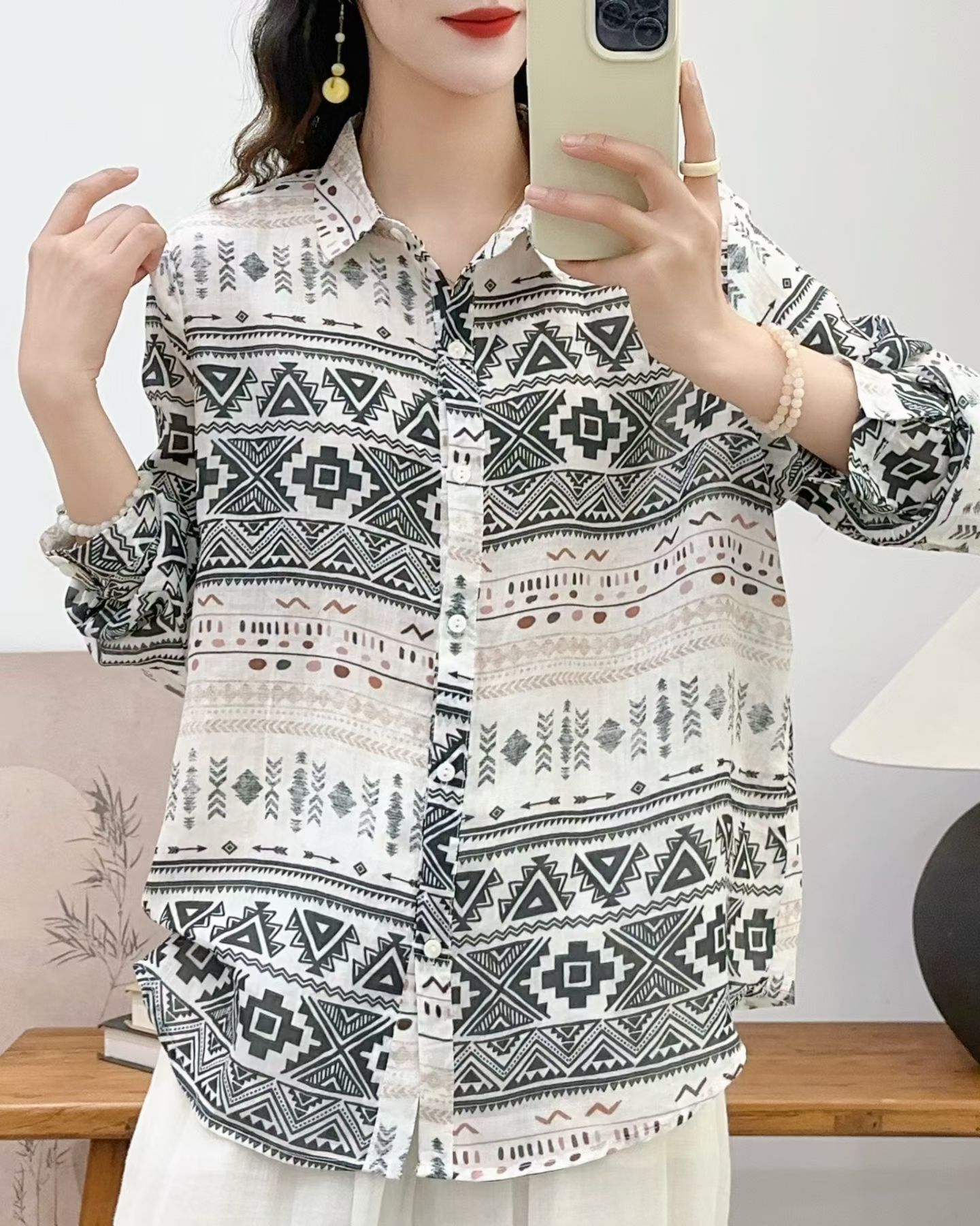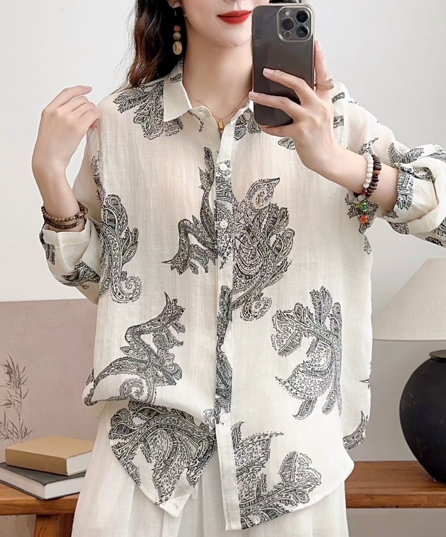 모리 소녀 예술적 라미 인쇄 셔츠 긴팔 여성용 옷깃 꽃 탑베이스 셔츠 라미 셔츠 탑 여성 의류