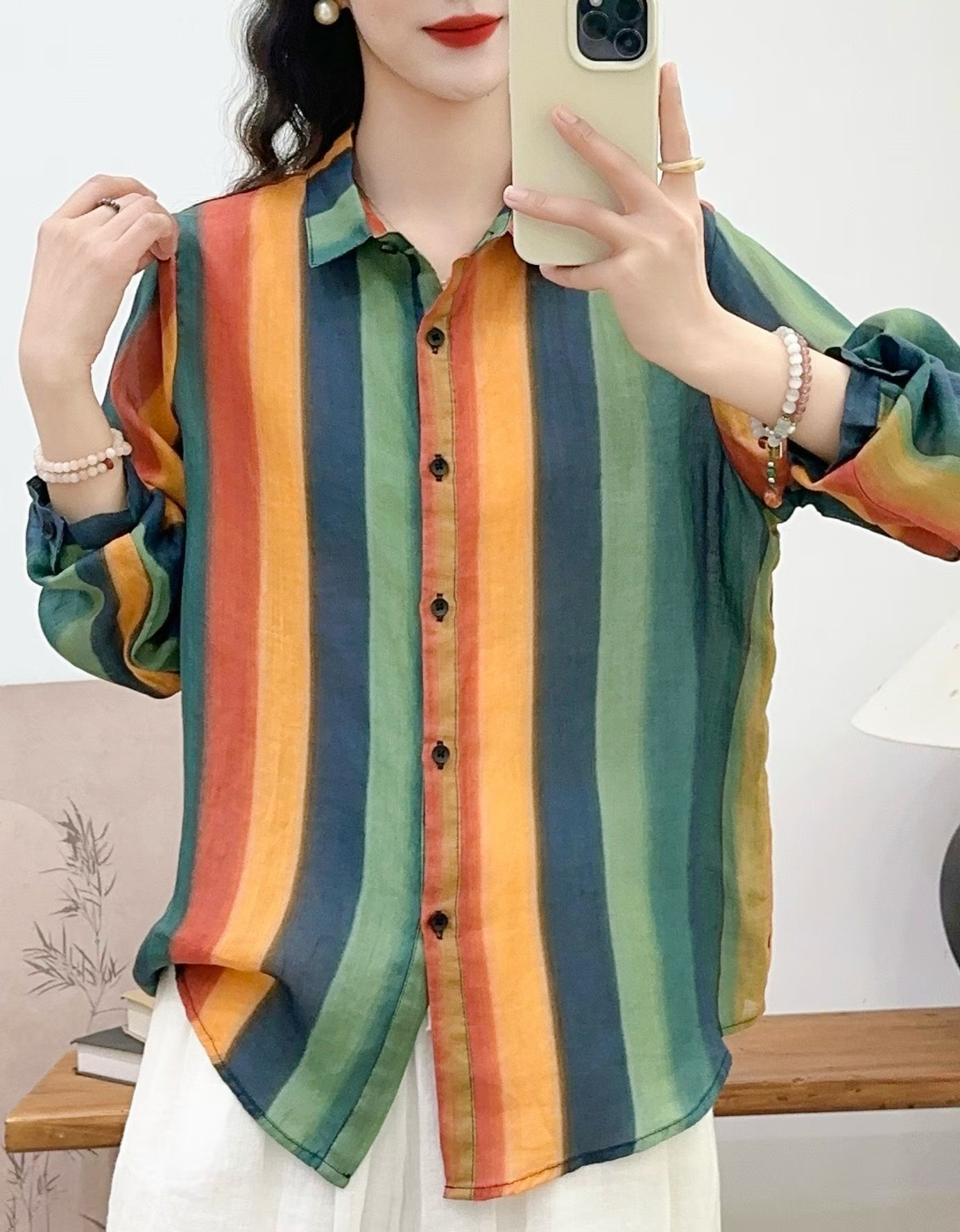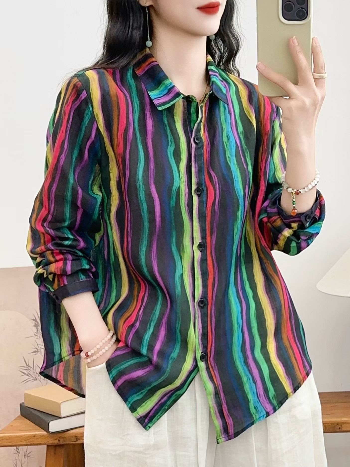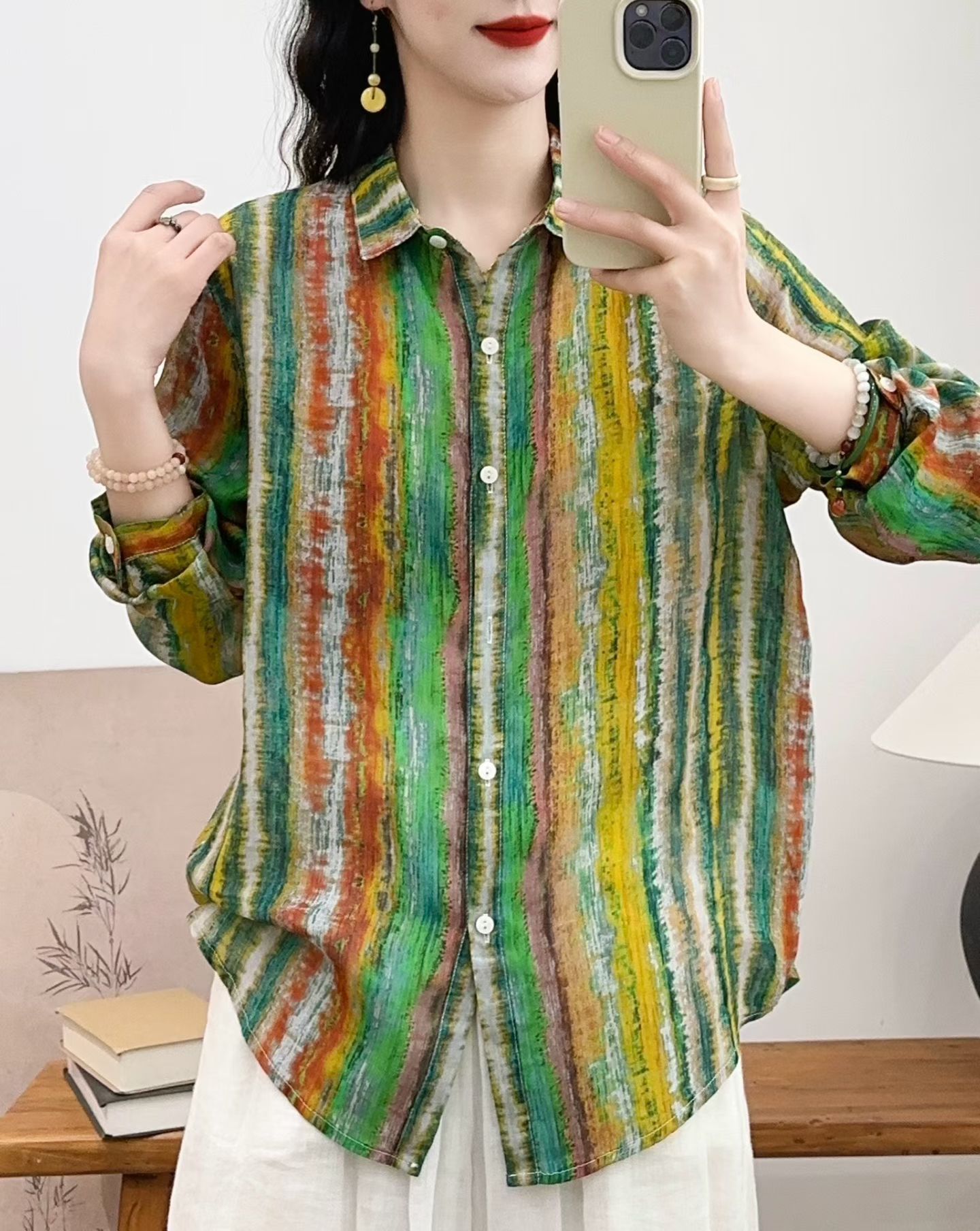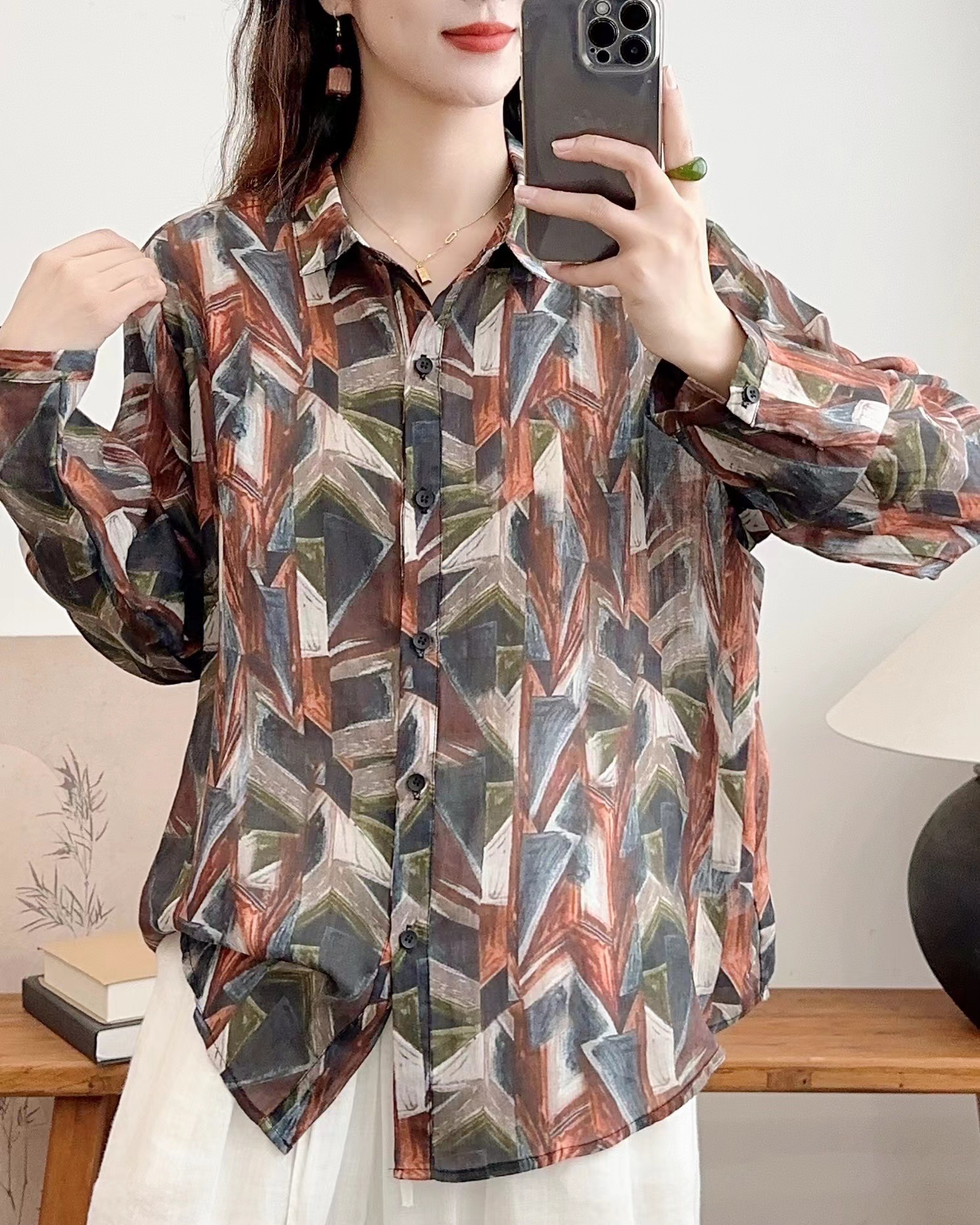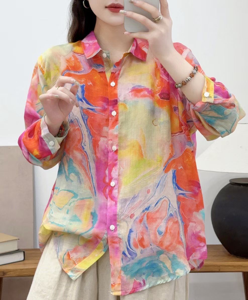 모리 소녀 예술적 라미 인쇄 셔츠 긴팔 여성용 옷깃 꽃 탑베이스 셔츠 라미 셔츠 탑 여성 의류