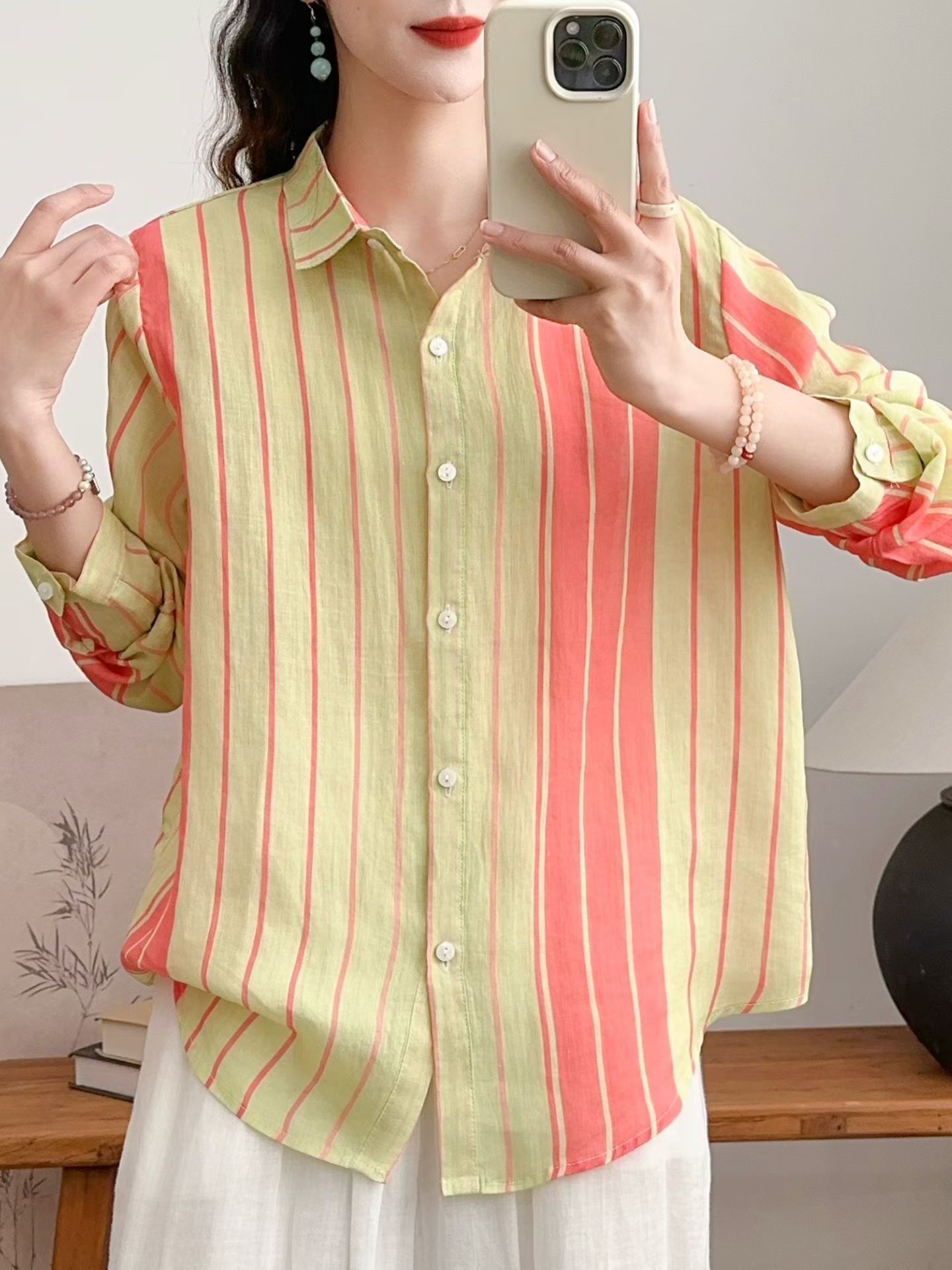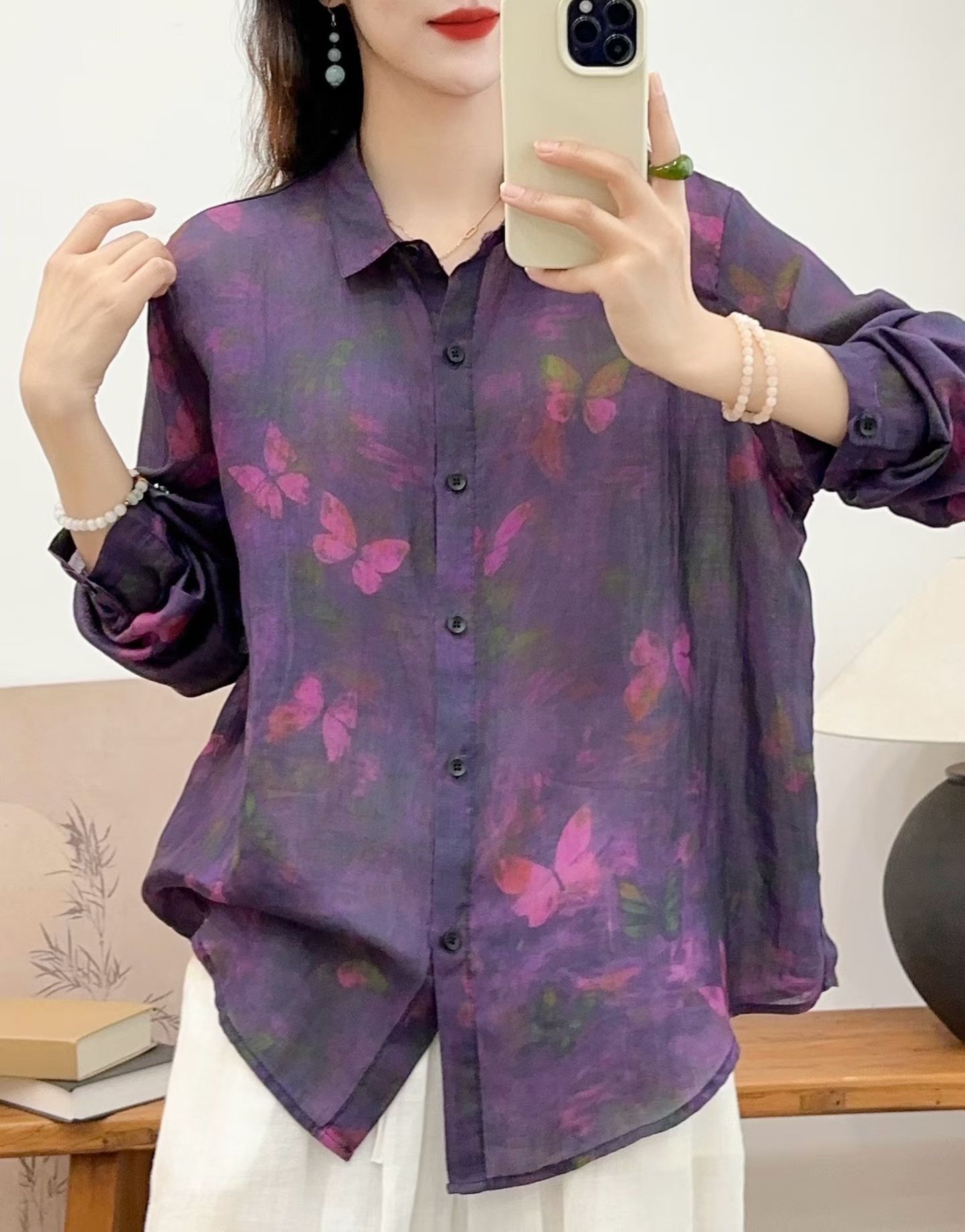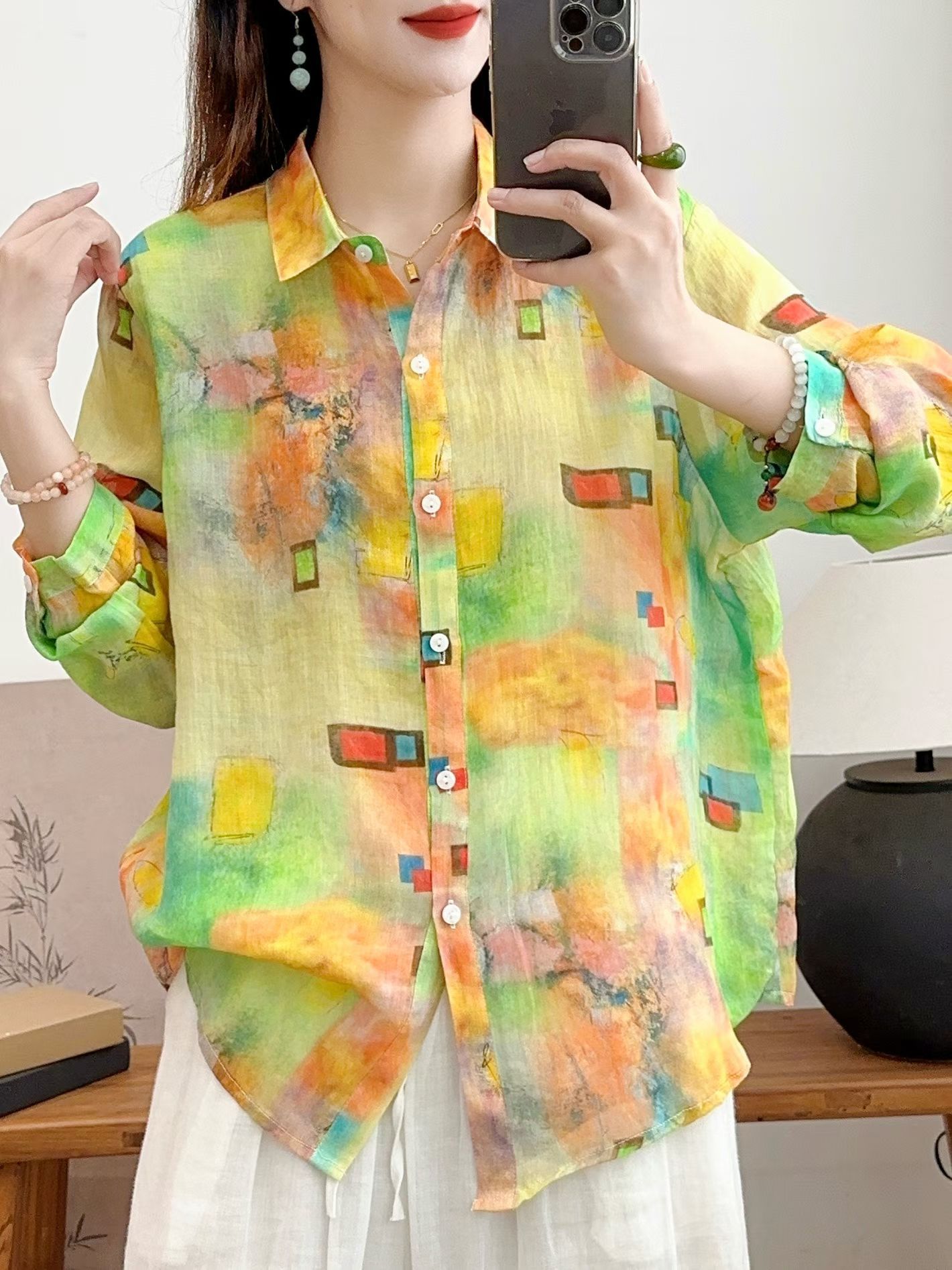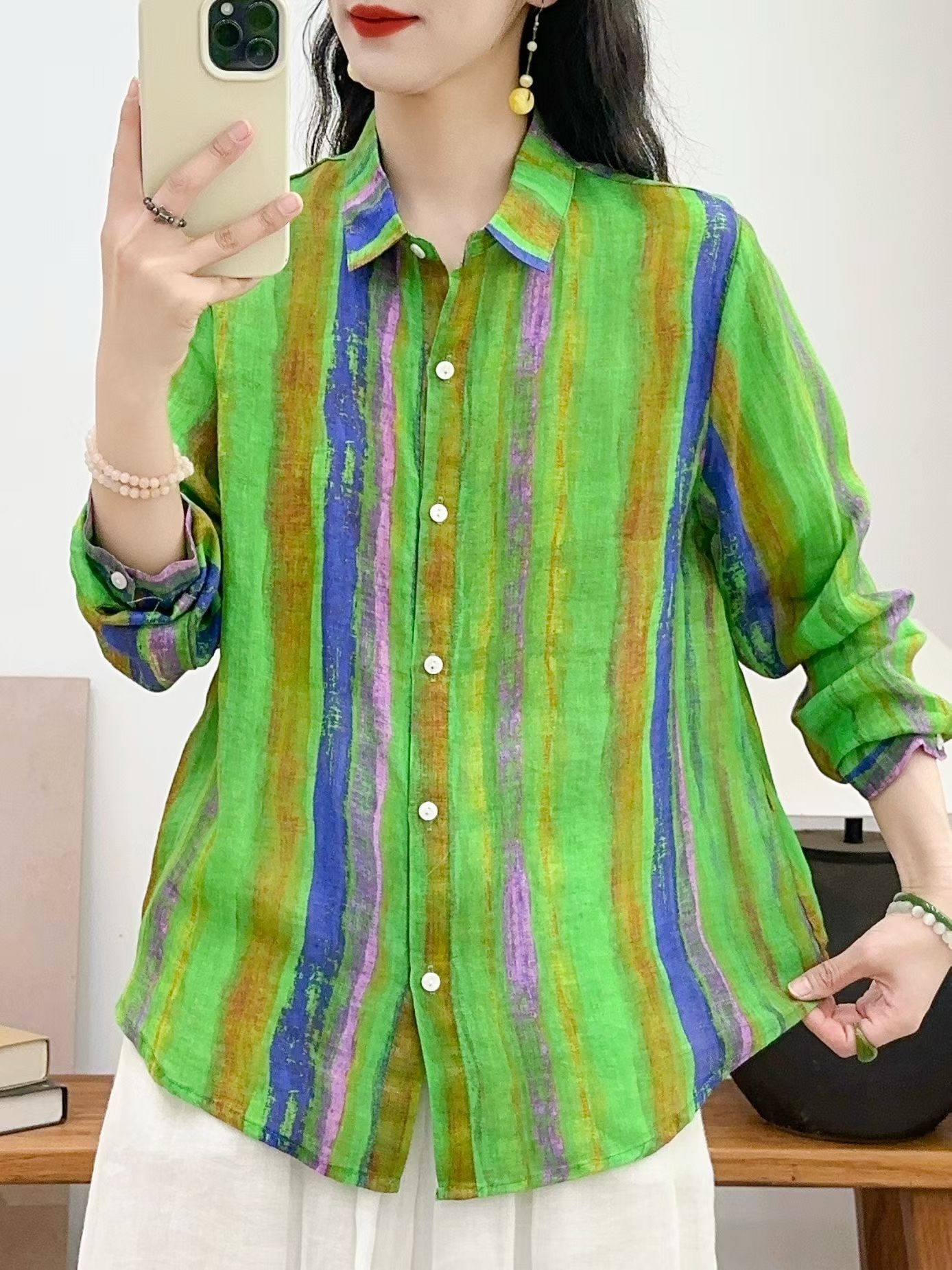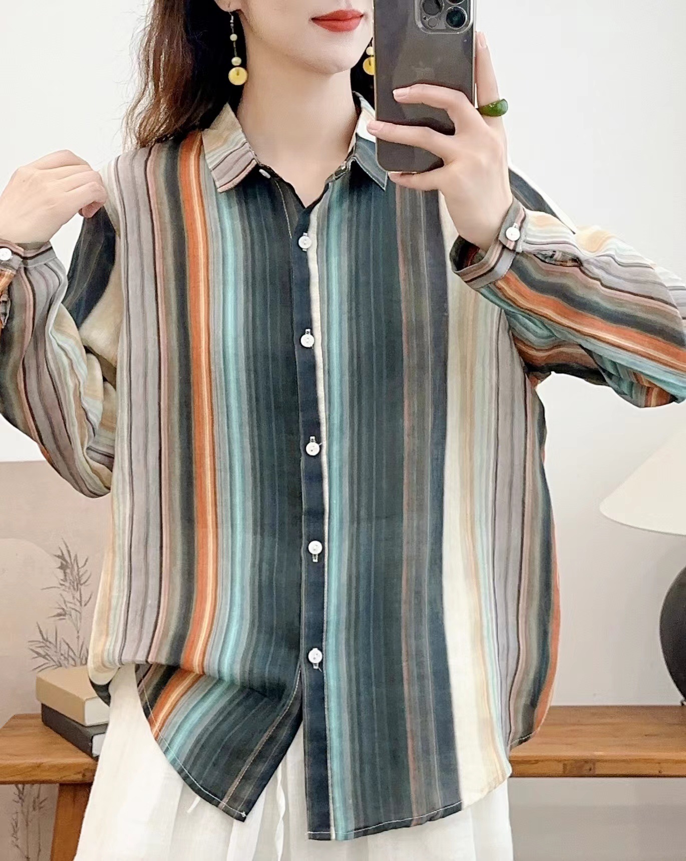 모리 소녀 예술적 라미 인쇄 셔츠 긴팔 여성용 옷깃 꽃 탑베이스 셔츠 라미 셔츠 탑 여성 의류