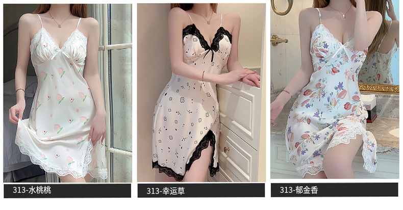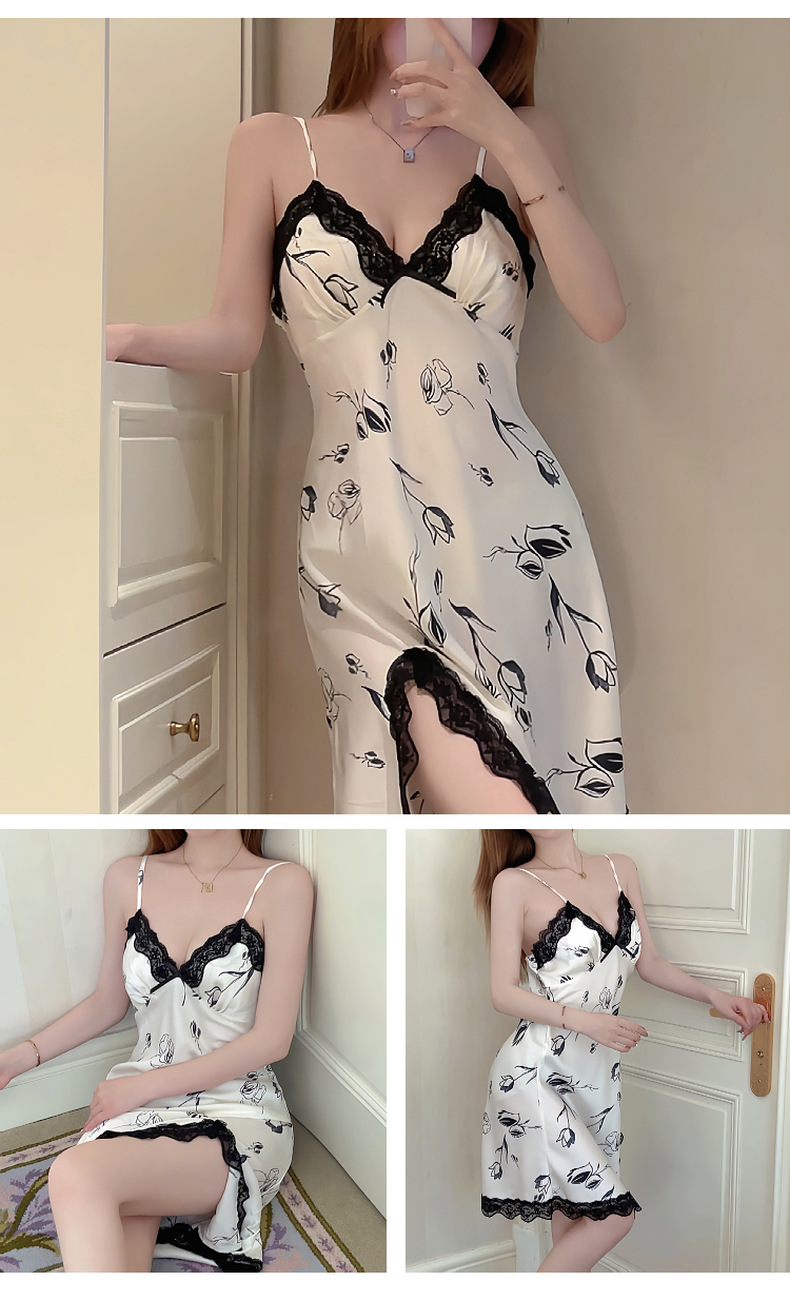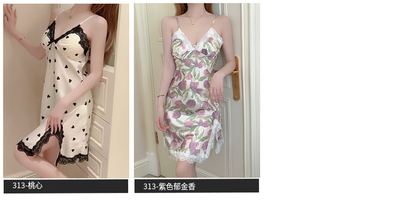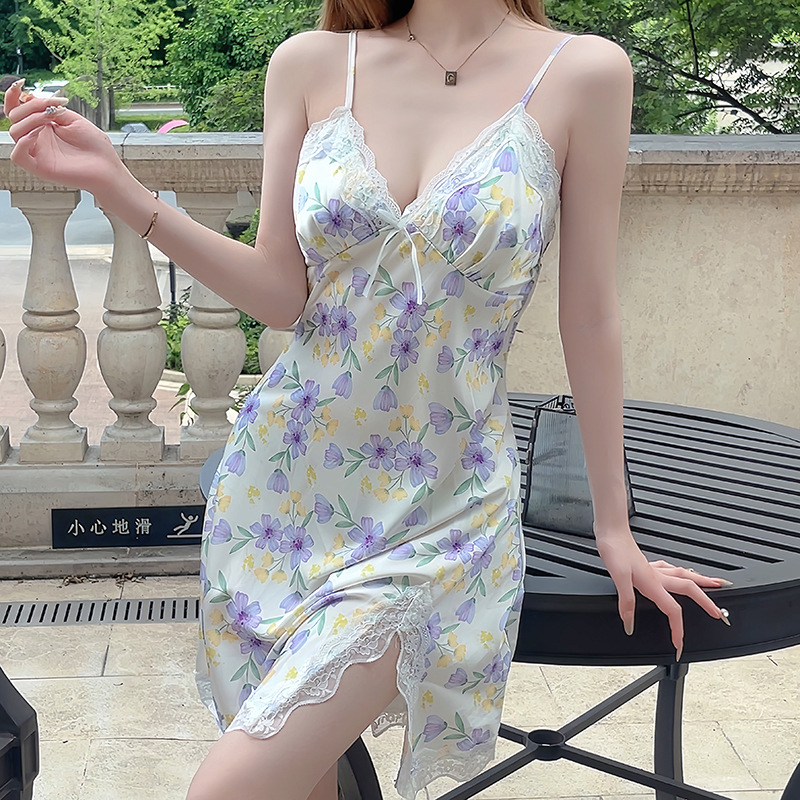 섹시한 나이트 드레스 여성의 여름 레이스 슬링 아이스 실크 파자마는 가슴 패드와 함께 순수한 욕망 달콤한 잠옷을 인쇄했습니다.스토어 가기