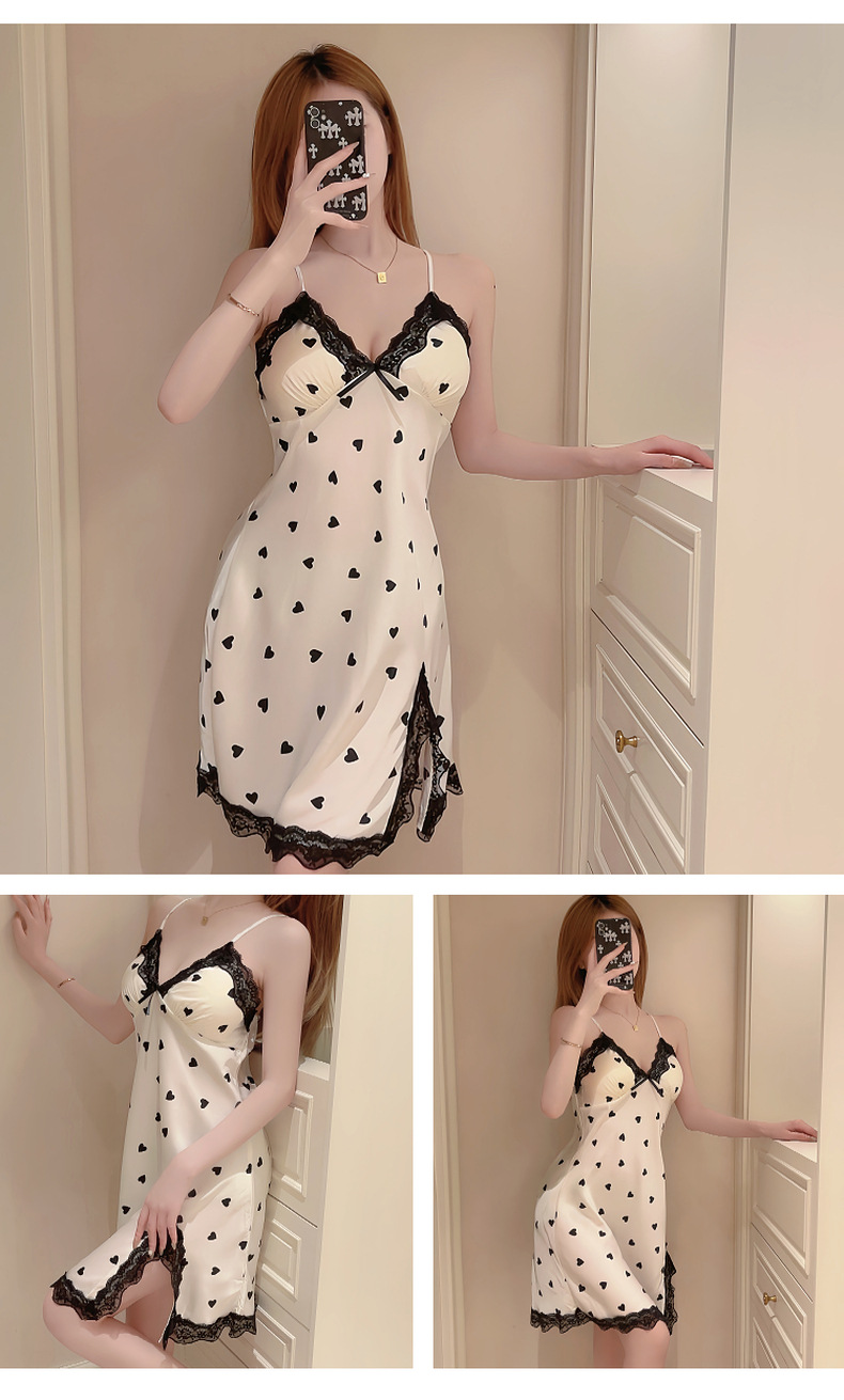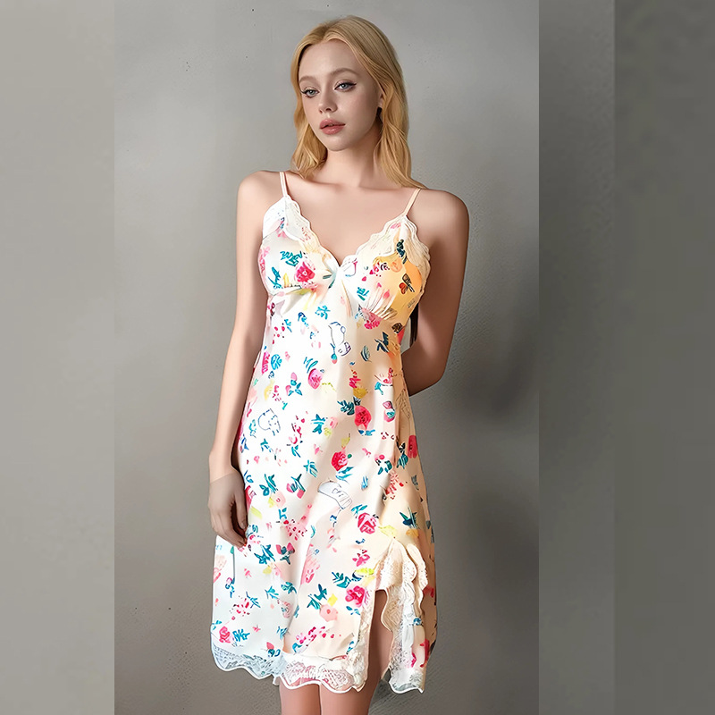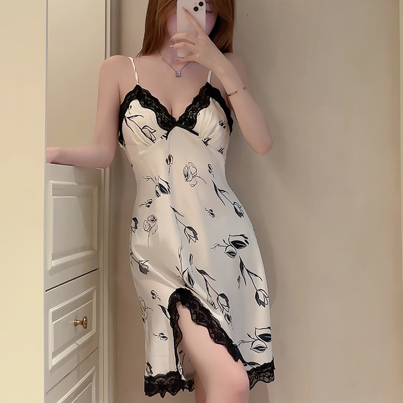 섹시한 나이트 드레스 여성의 여름 레이스 슬링 아이스 실크 파자마는 가슴 패드와 함께 순수한 욕망 달콤한 잠옷을 인쇄했습니다.