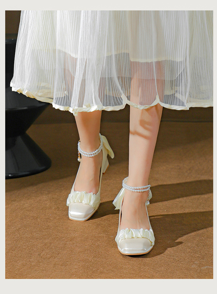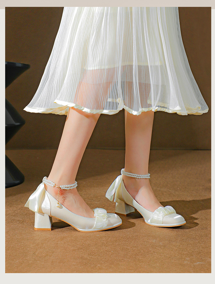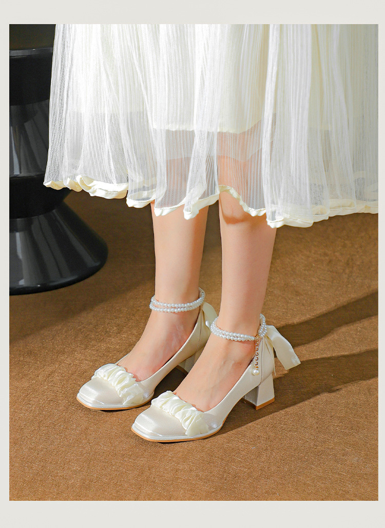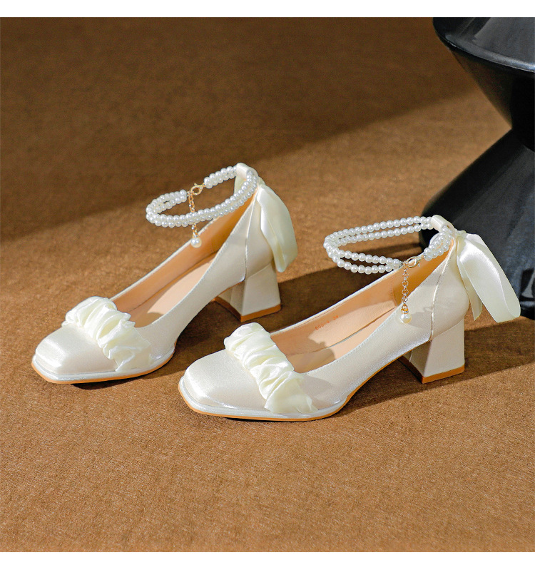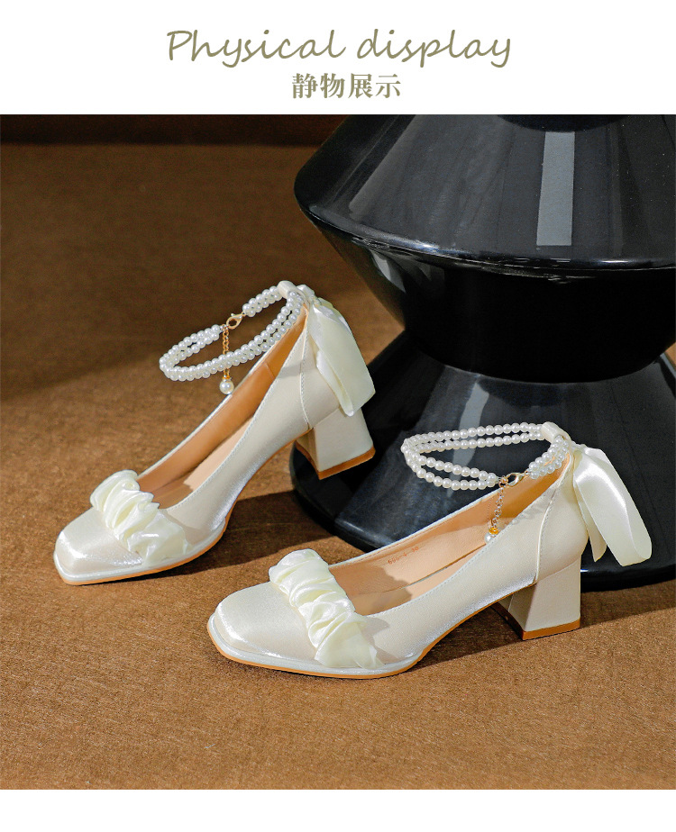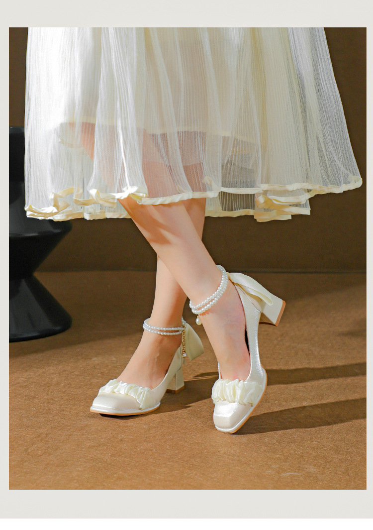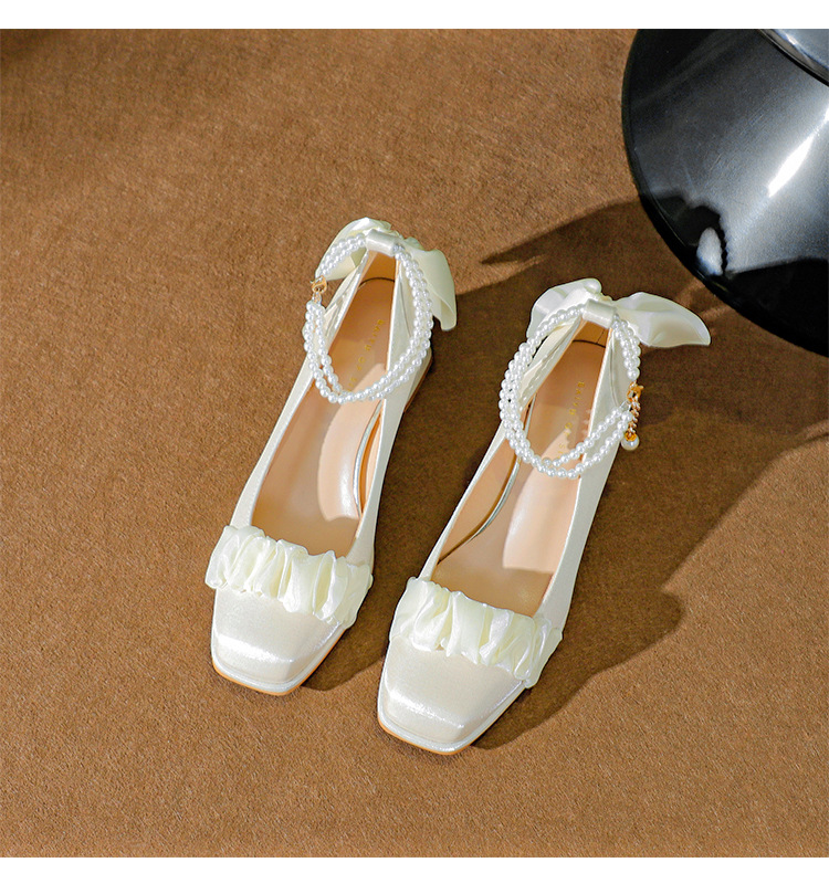 푸 스프링 싱글 레이어 신발 여성 청키 힐 하이힐 2024 메리 제인 신발 진주 스트랩 스퀘어 토 패션 캐주얼 신발