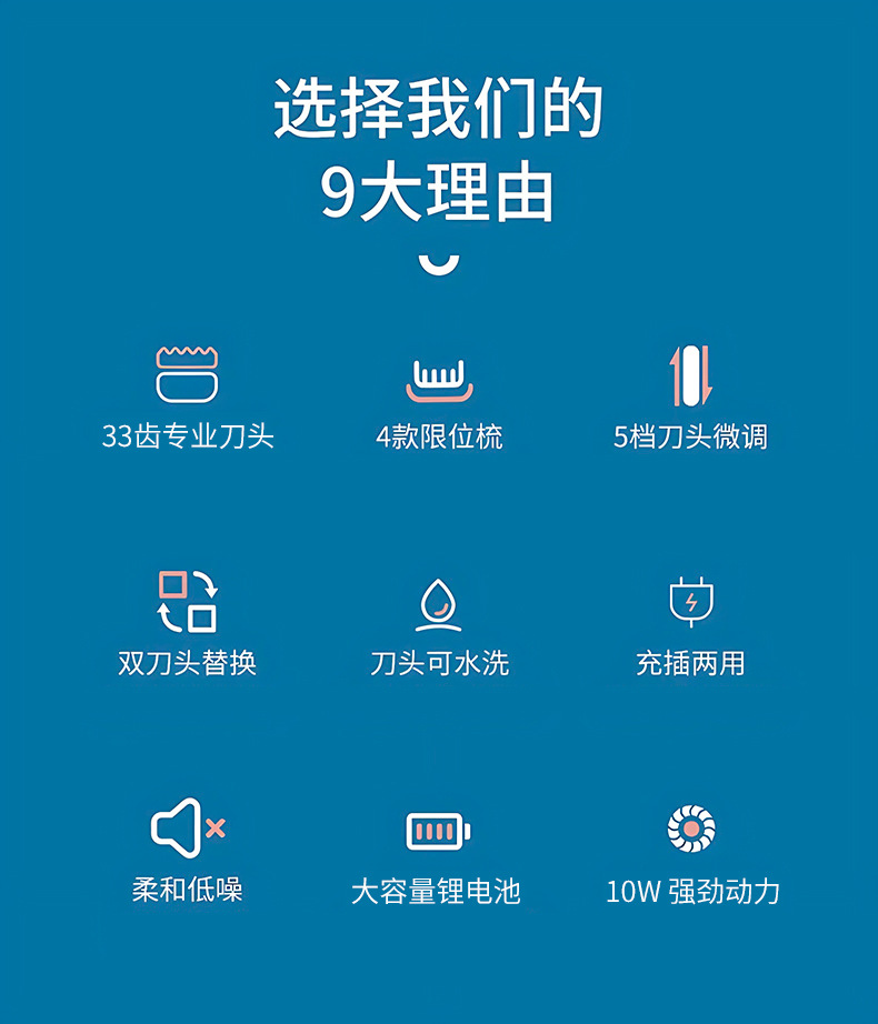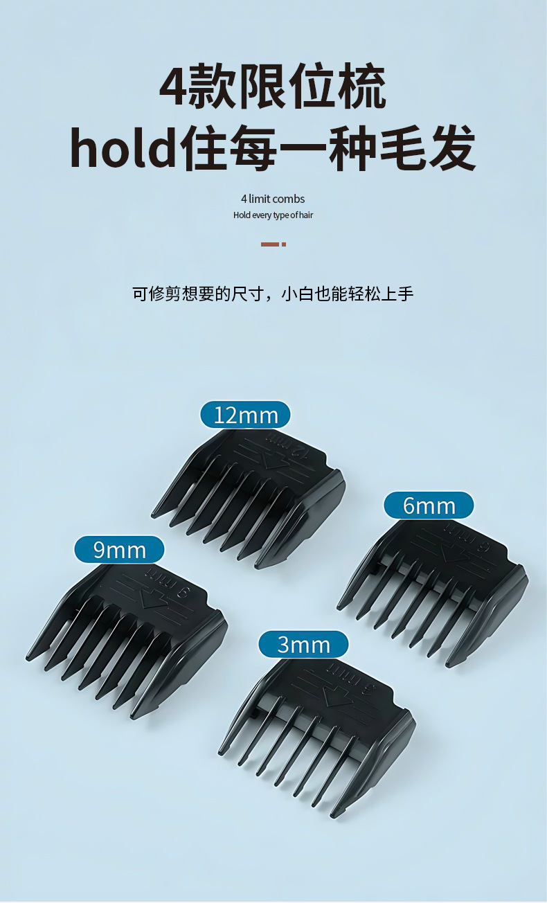 产品配件:包装盒、说明书、四个限位梳、一个适配器(可定制美规,欧规,英规,日规,澳规等)、一瓶润滑油(出口不要请留言)、一根清洁刷