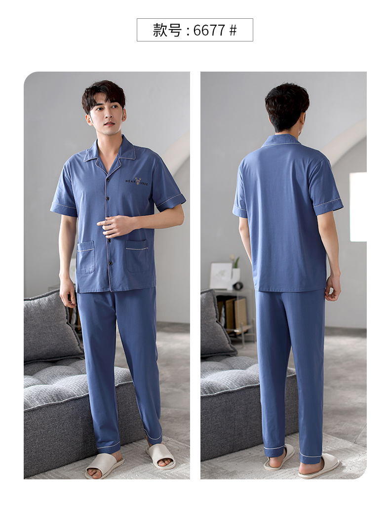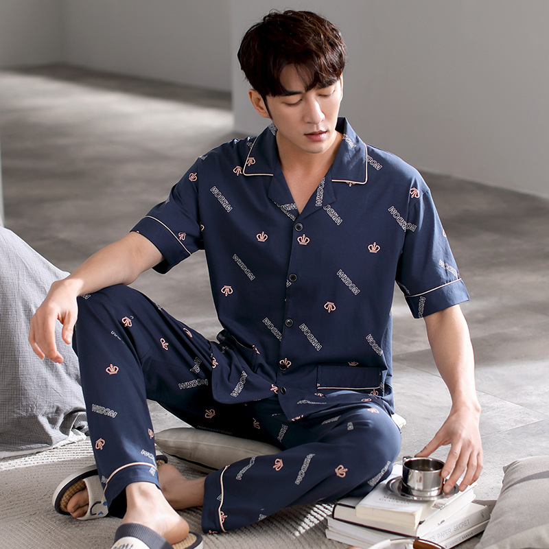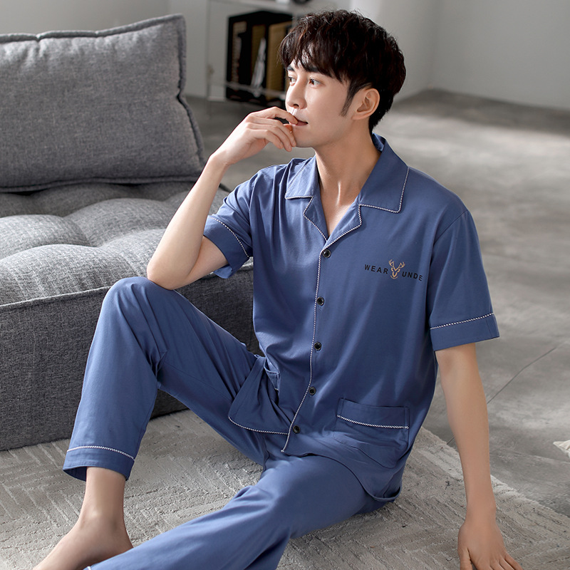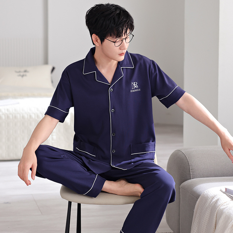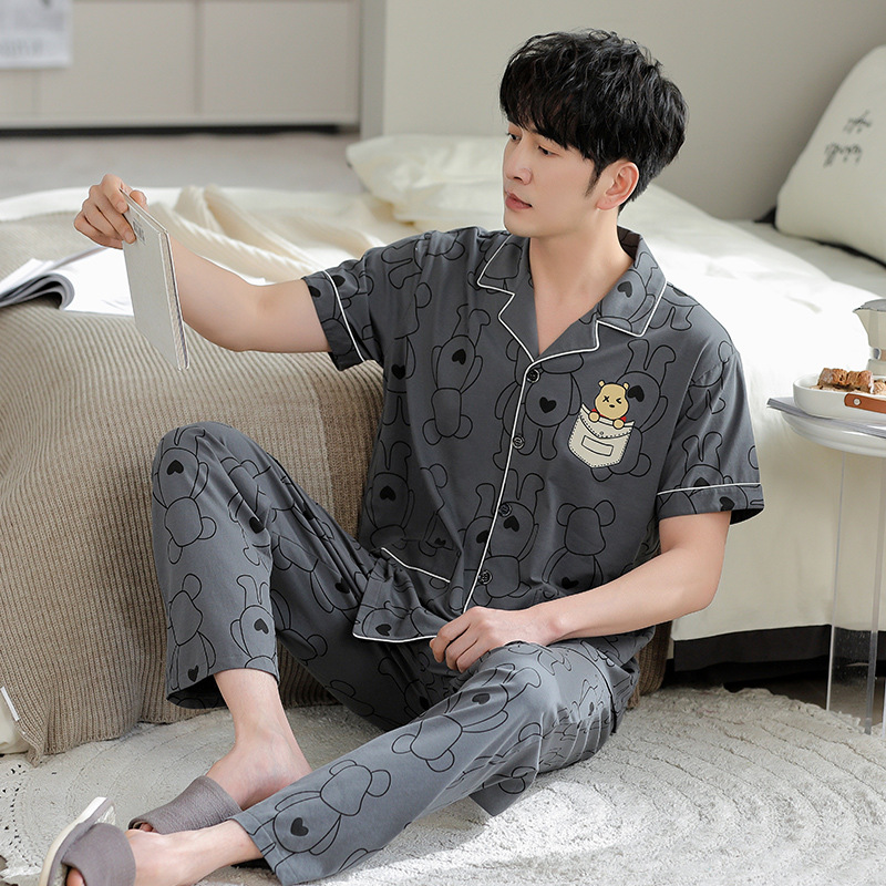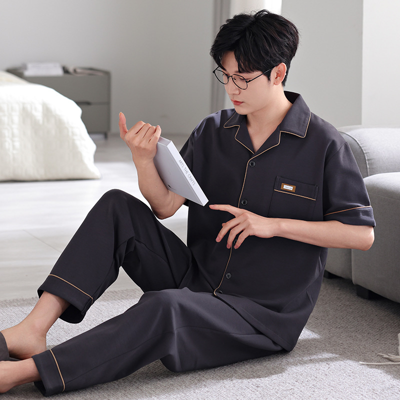100% 타이트한 면 남성용 옷깃 파자마 한국식 반팔 바지 카디건 플러스 사이즈 10 대 홈웨어 세트스토어 가기