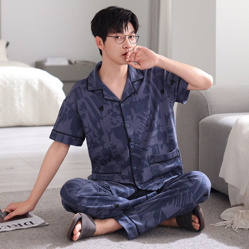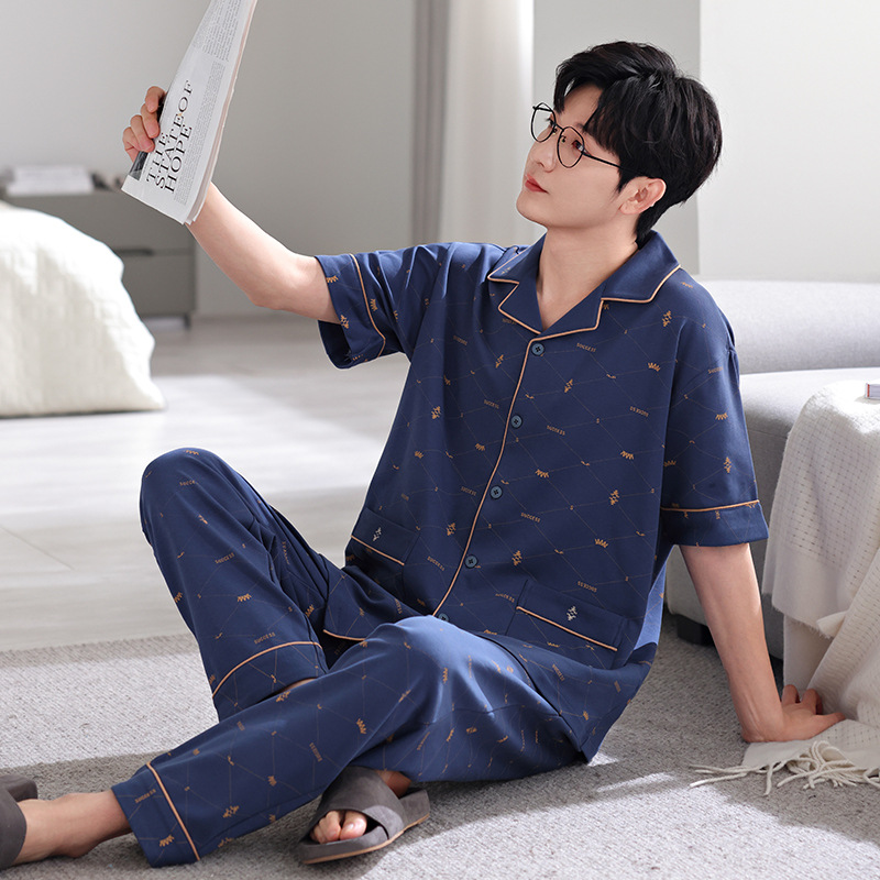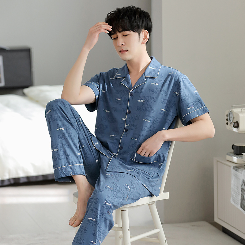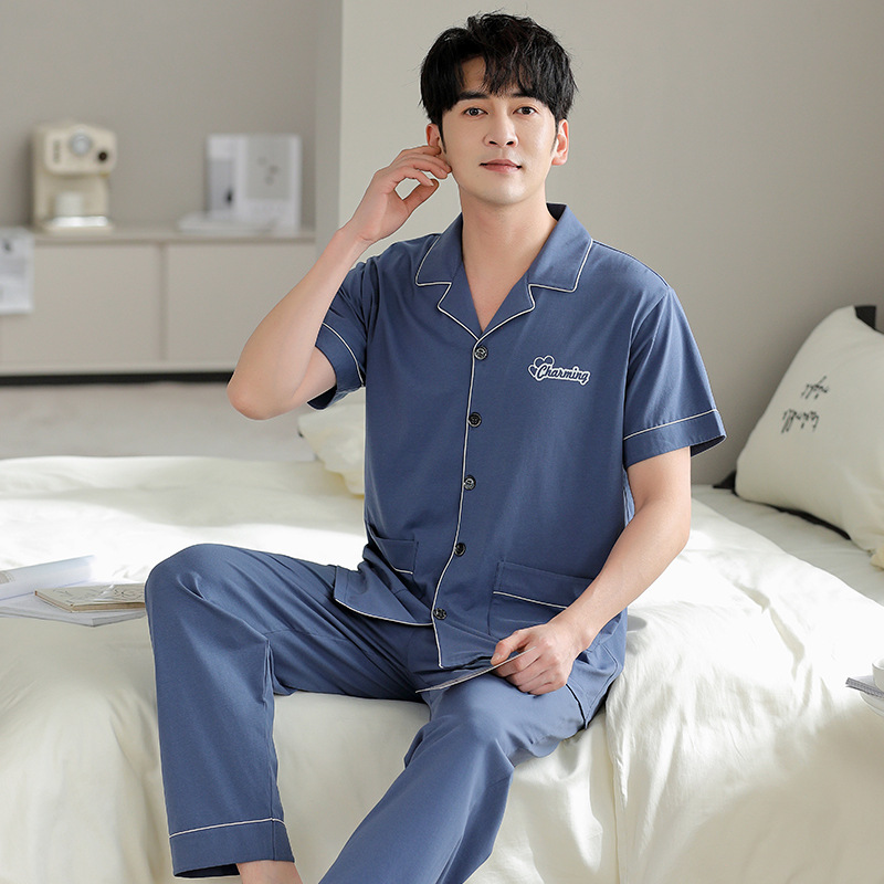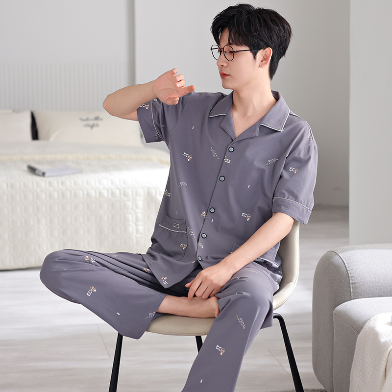 100% 타이트한 면 남성용 옷깃 파자마 한국식 반팔 바지 카디건 플러스 사이즈 10 대 홈웨어 세트
