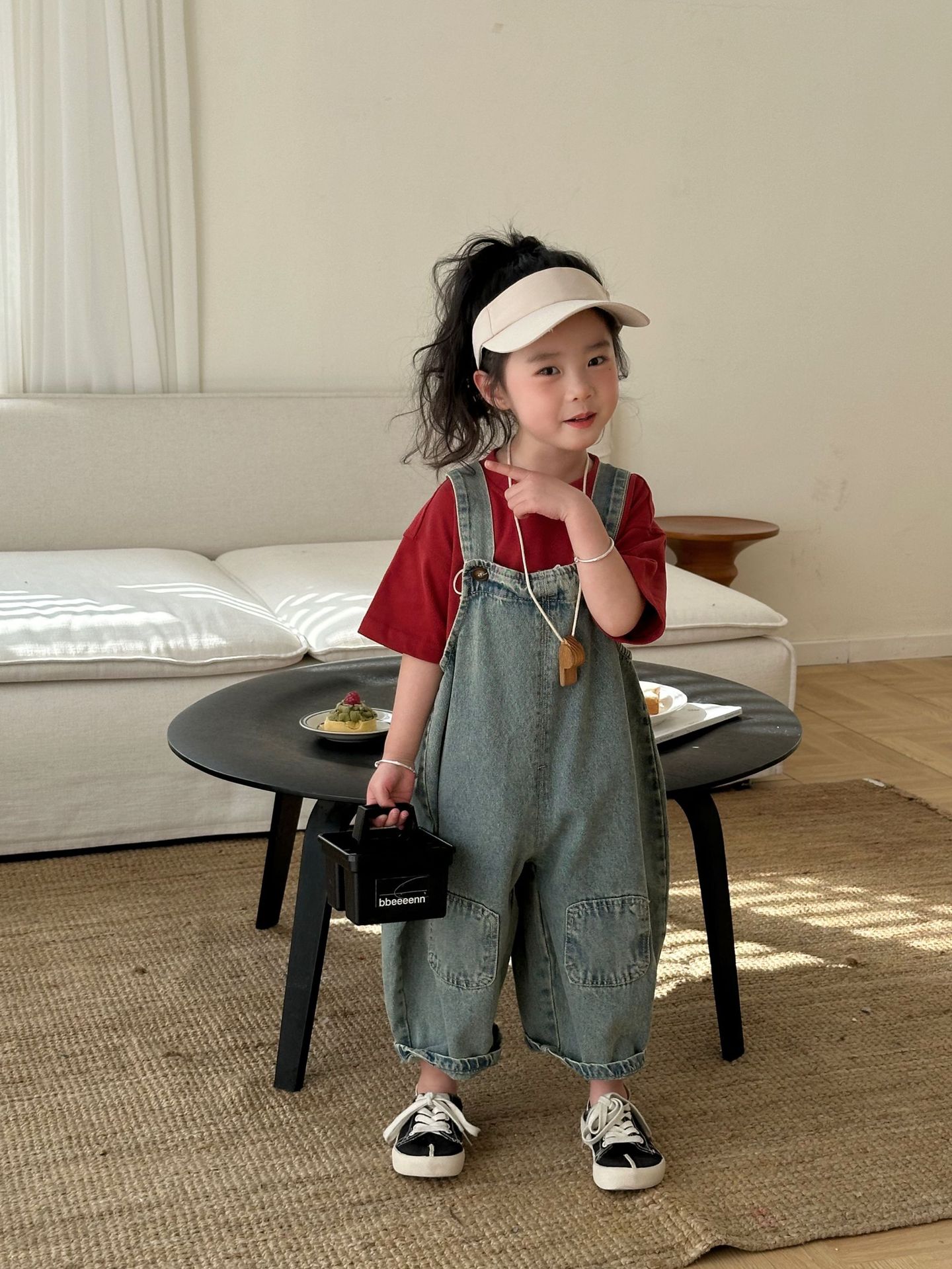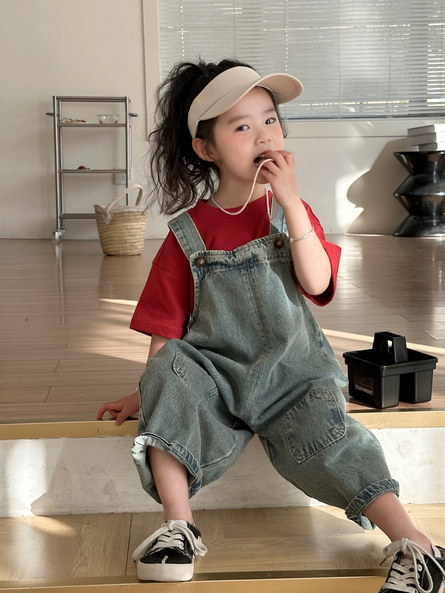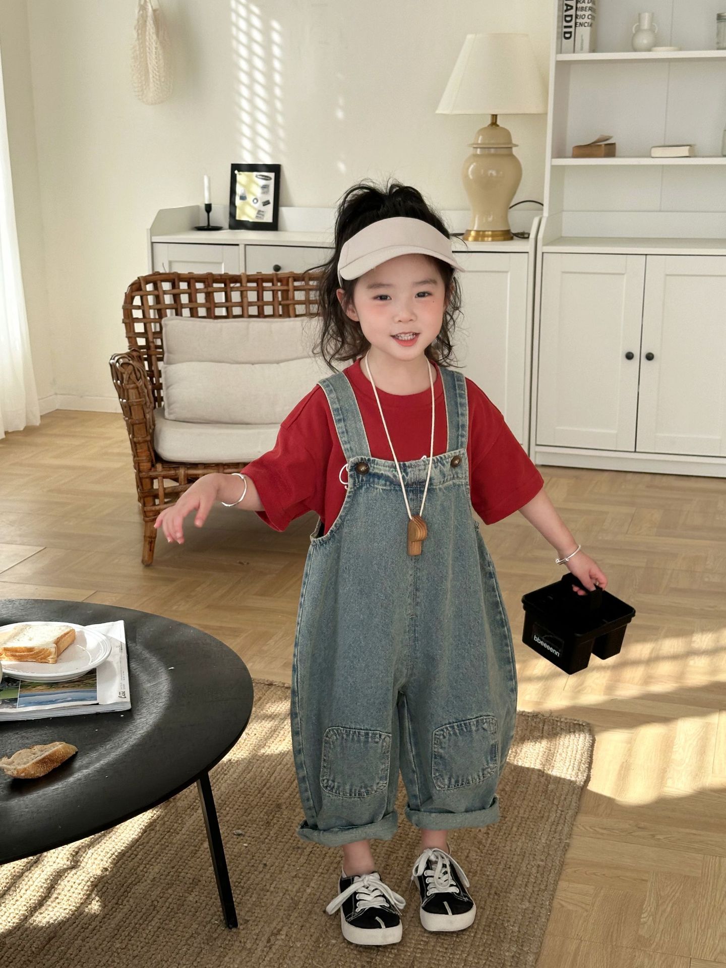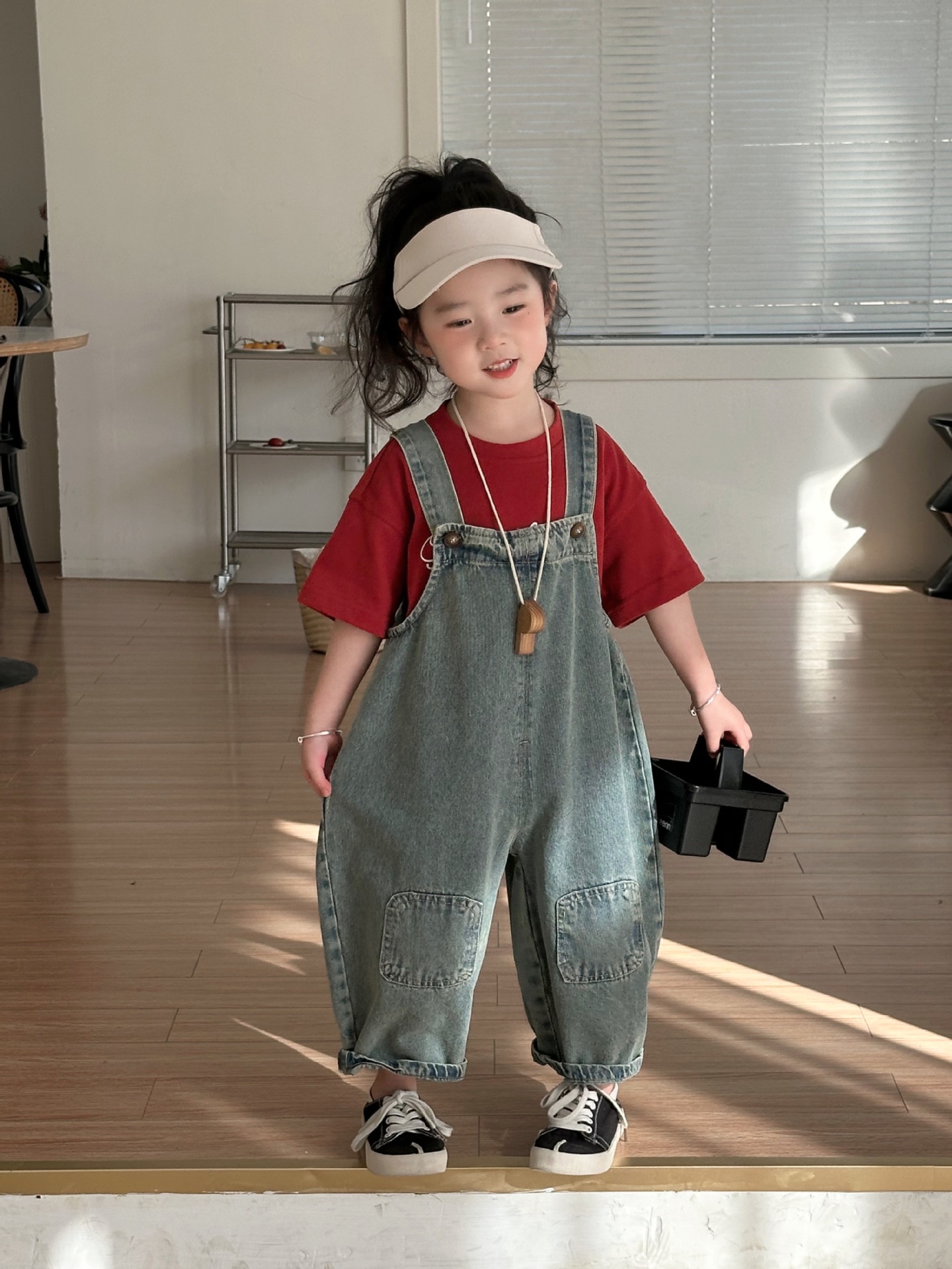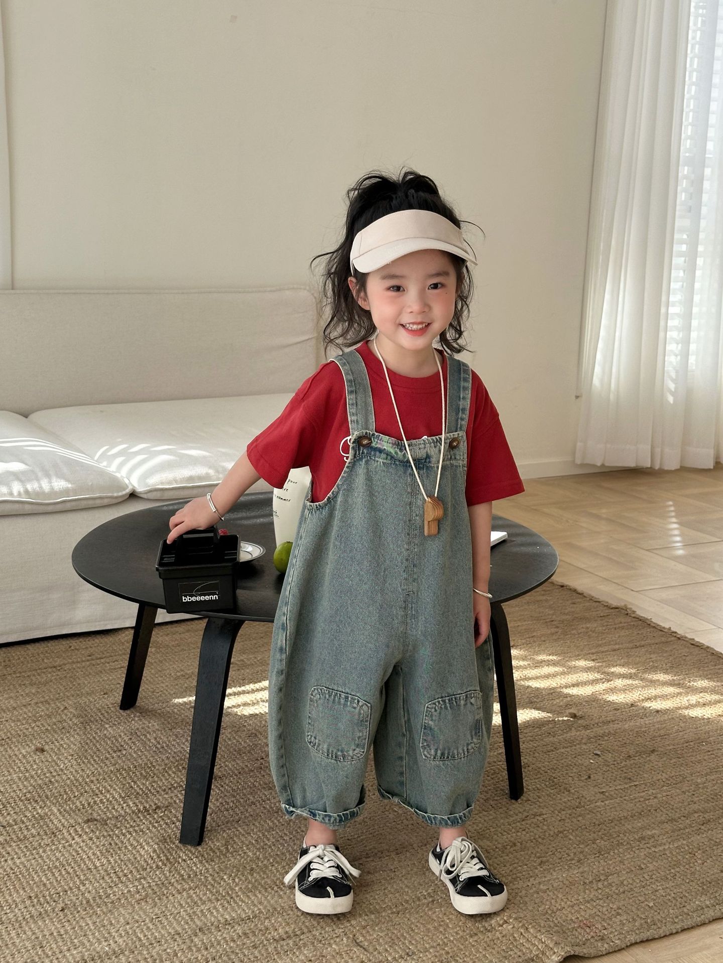 2024 여름 새 소녀 복고풍 패치 데님 서스펜더 바지 한국식 아기 소년의 귀여운 서스펜더 점프 수트스토어 가기