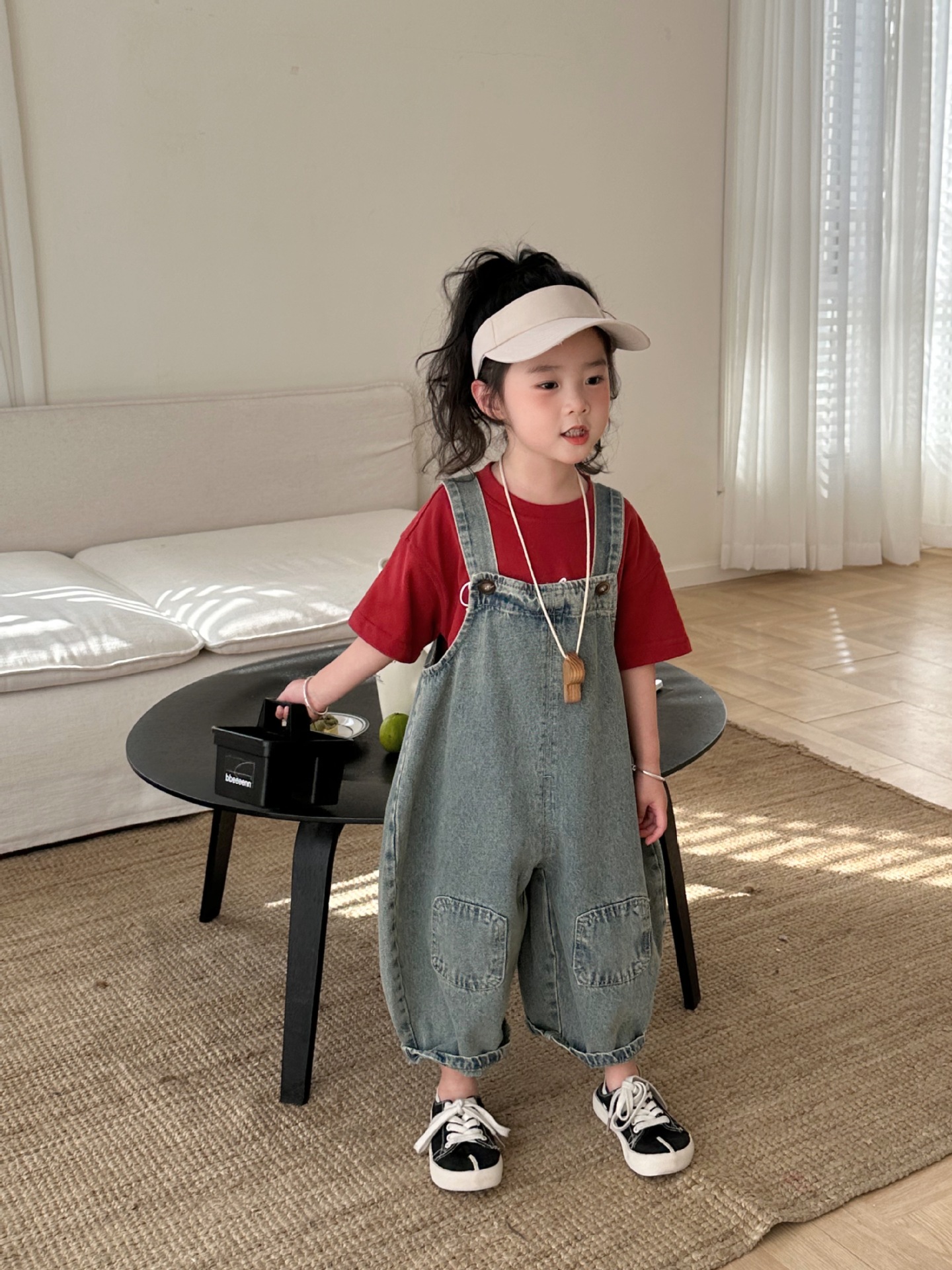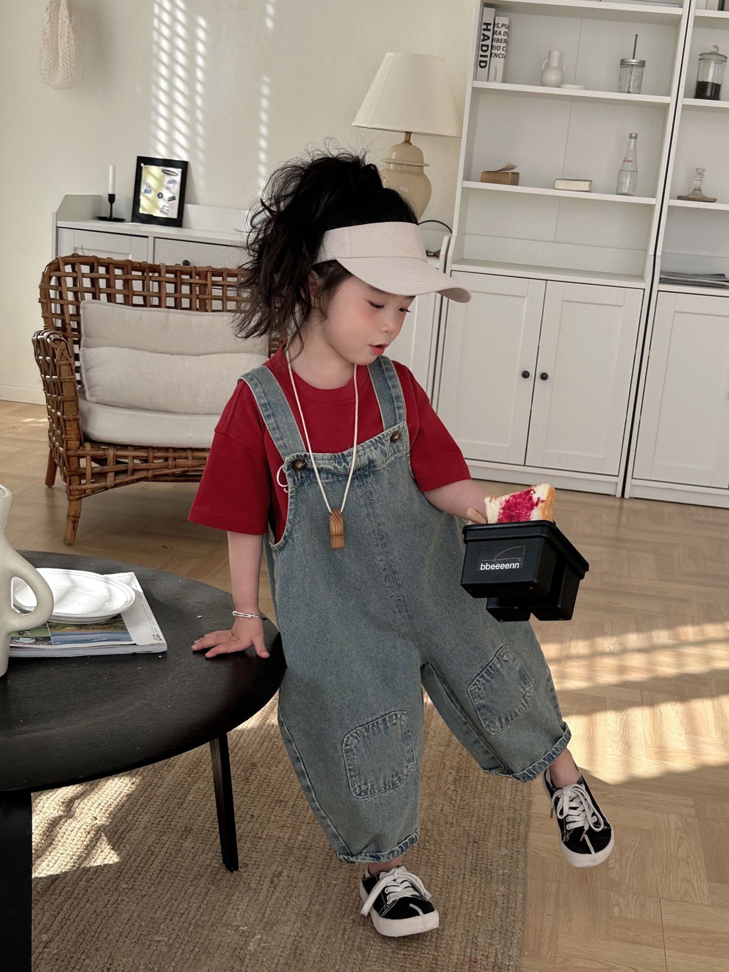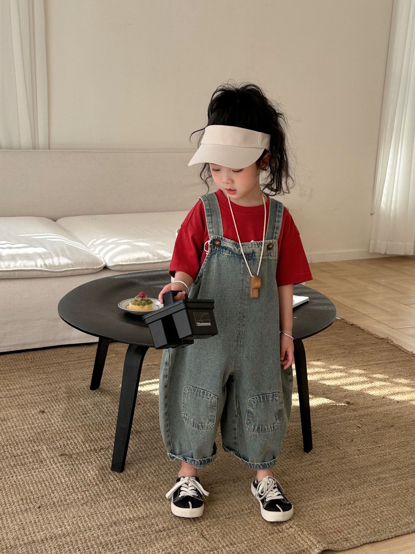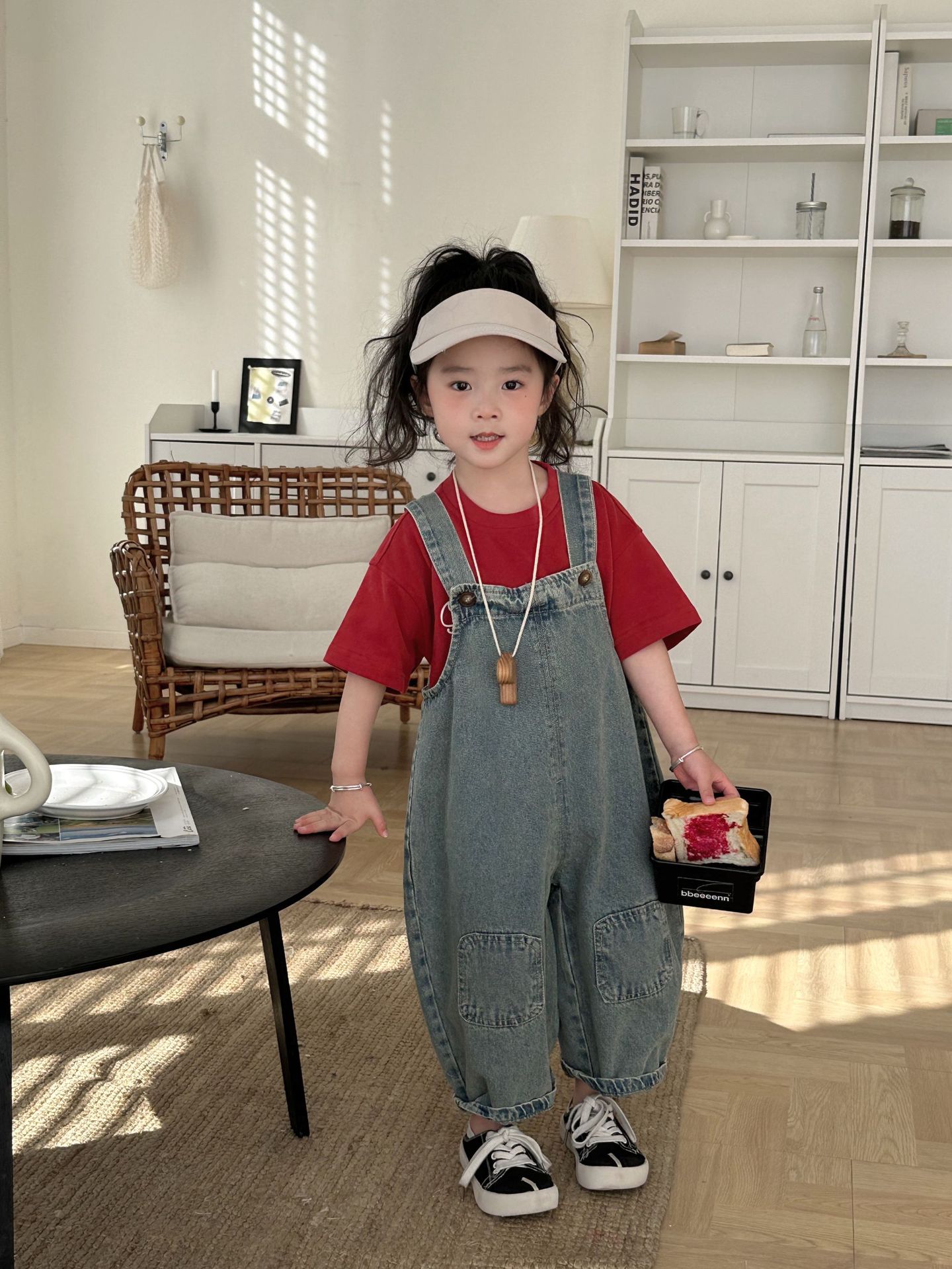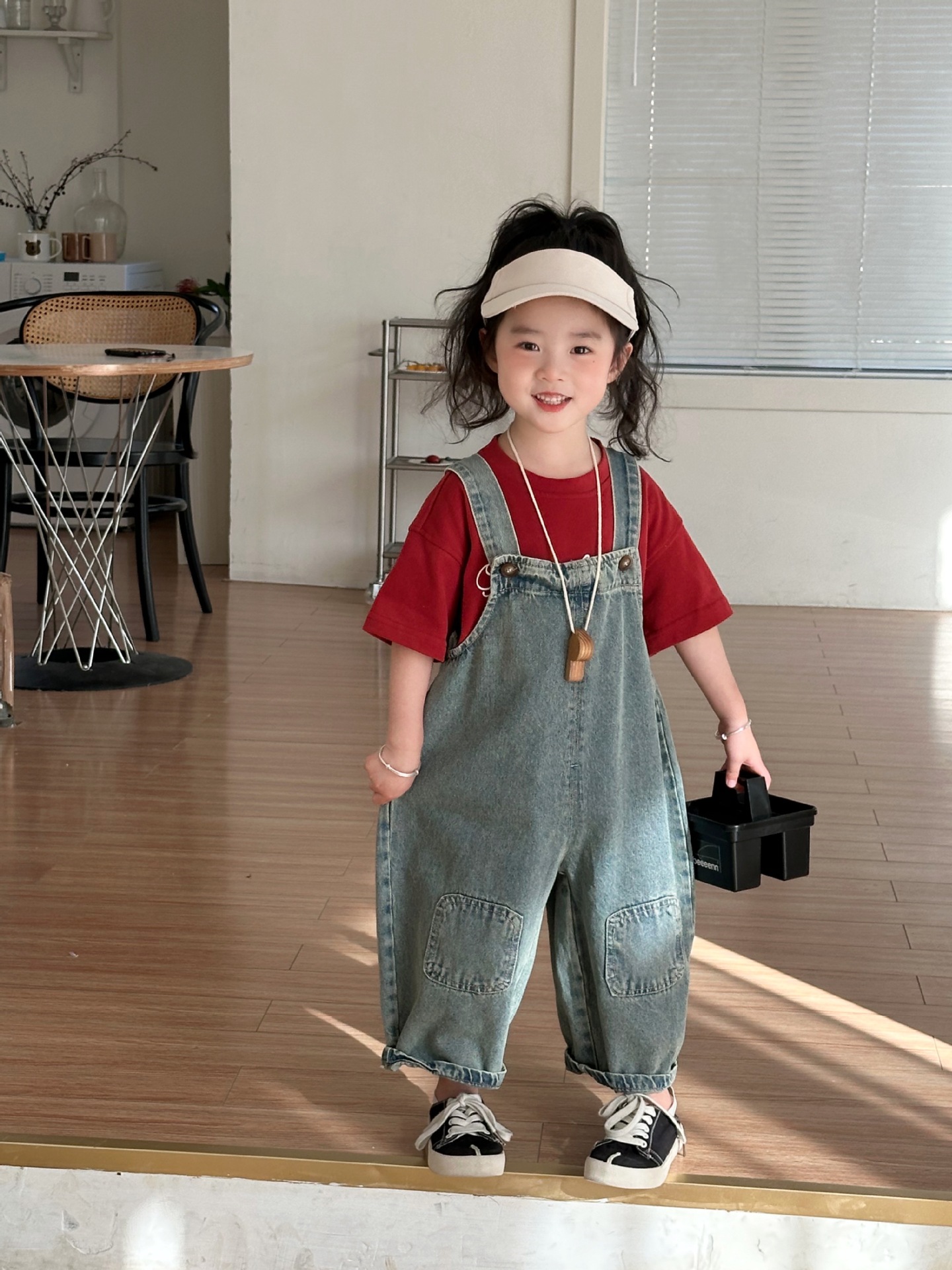 2024 여름 새 소녀 복고풍 패치 데님 서스펜더 바지 한국식 아기 소년의 귀여운 서스펜더 점프 수트스토어 가기