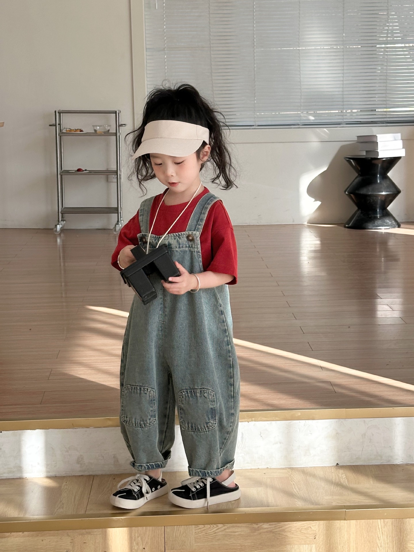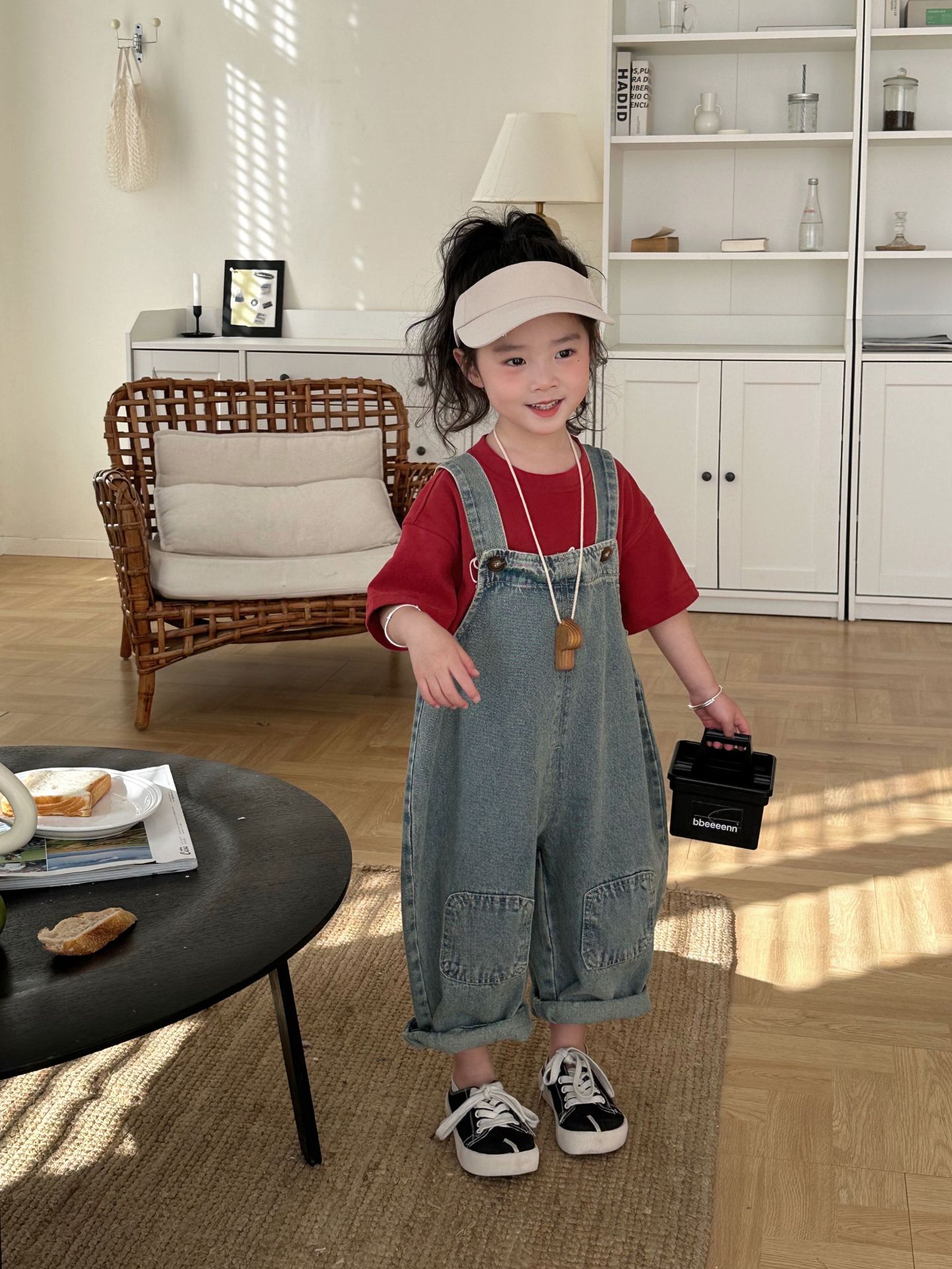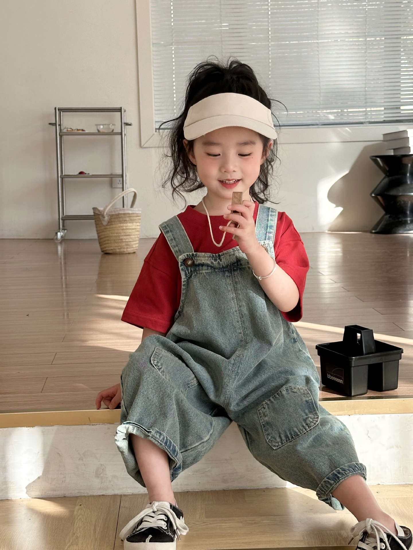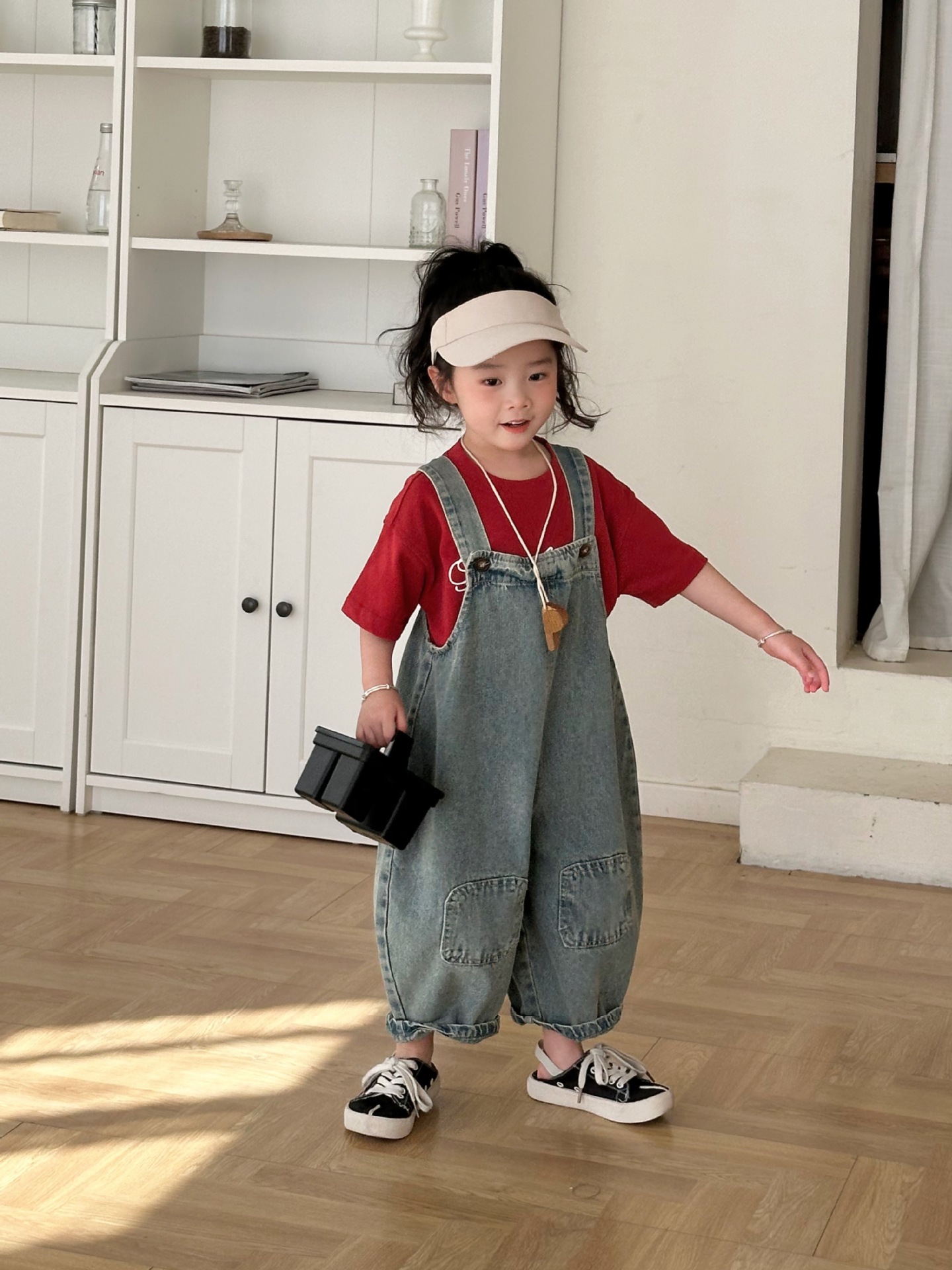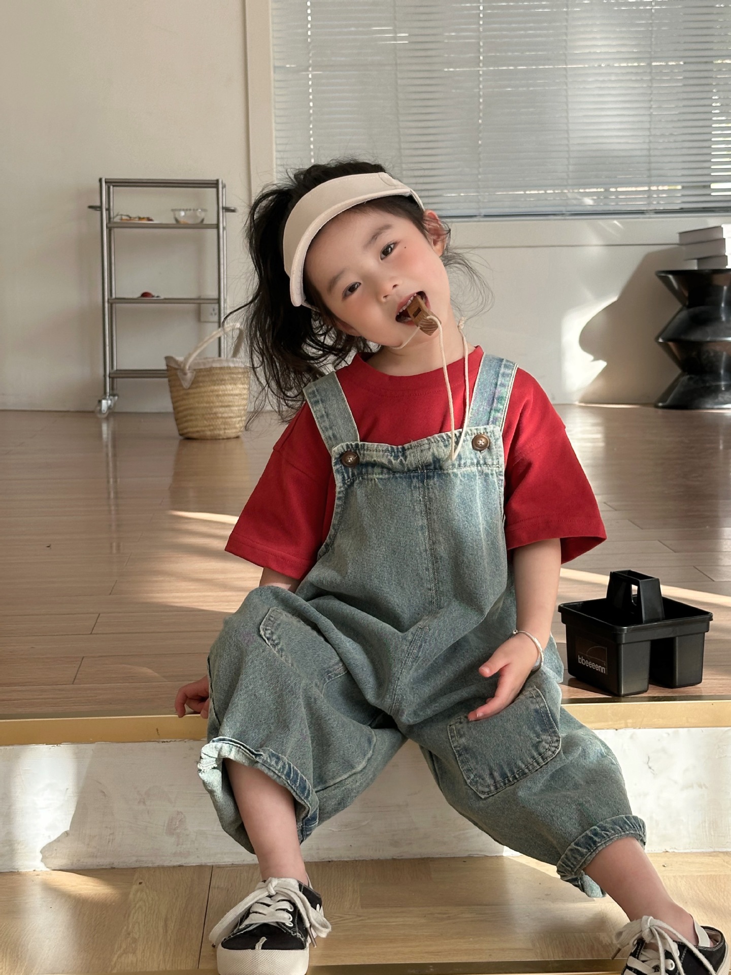 2024 여름 새 소녀 복고풍 패치 데님 서스펜더 바지 한국식 아기 소년의 귀여운 서스펜더 점프 수트스토어 가기