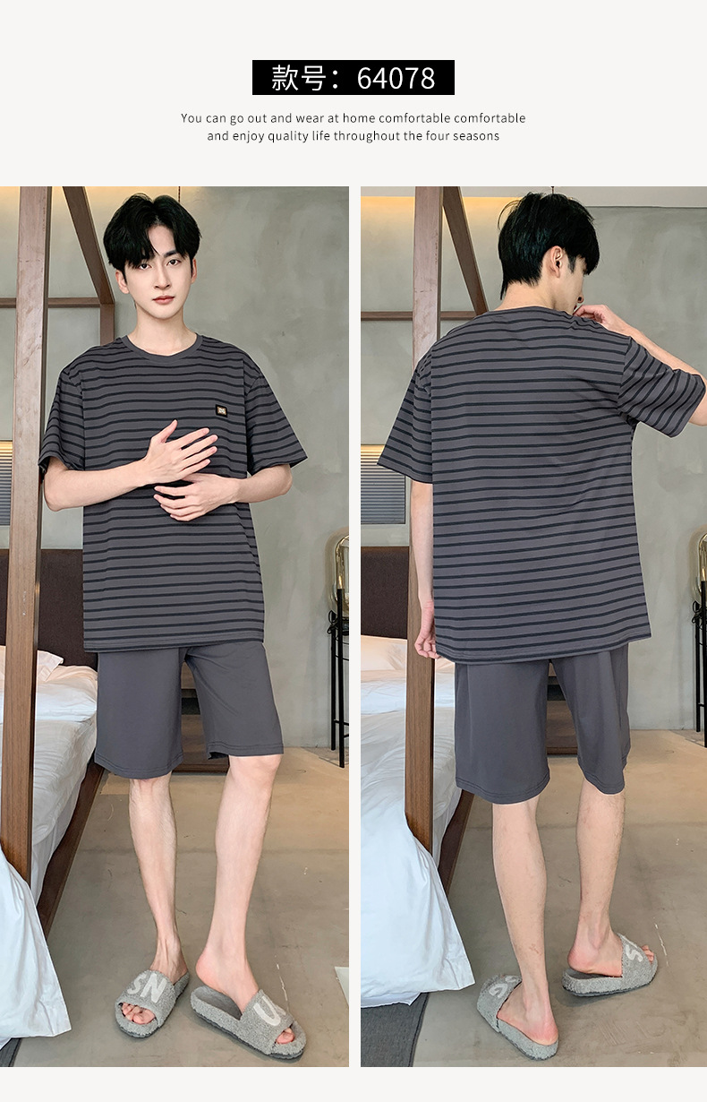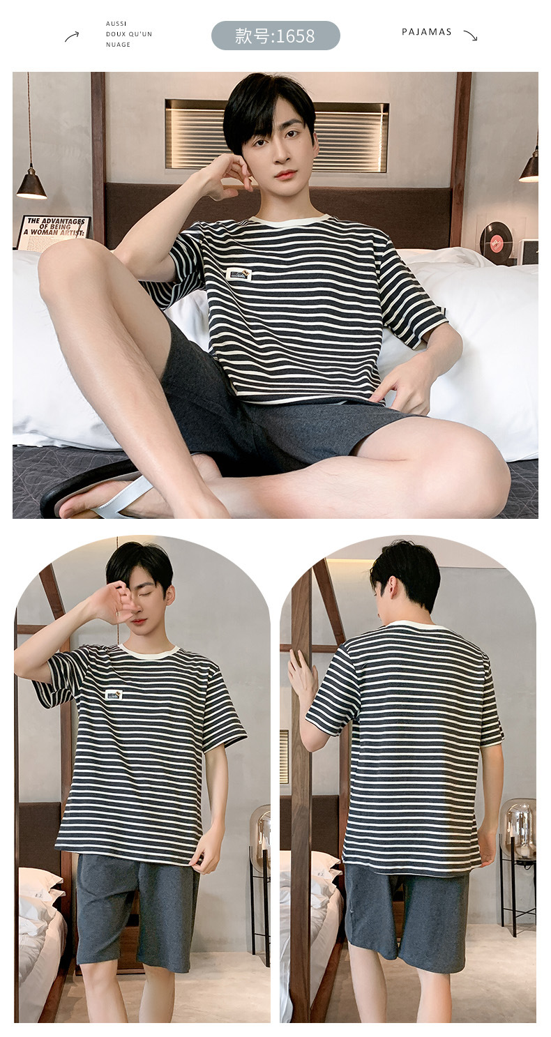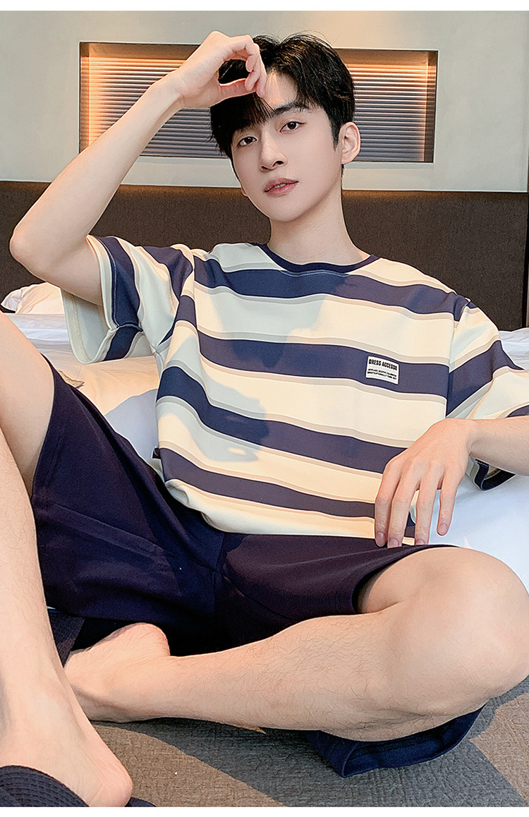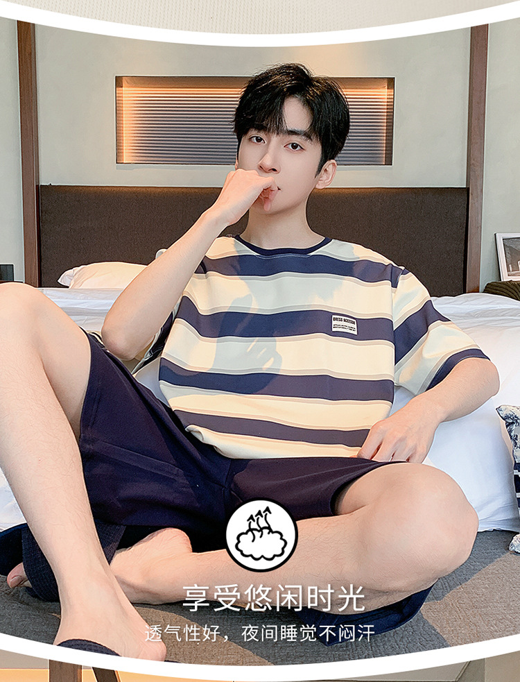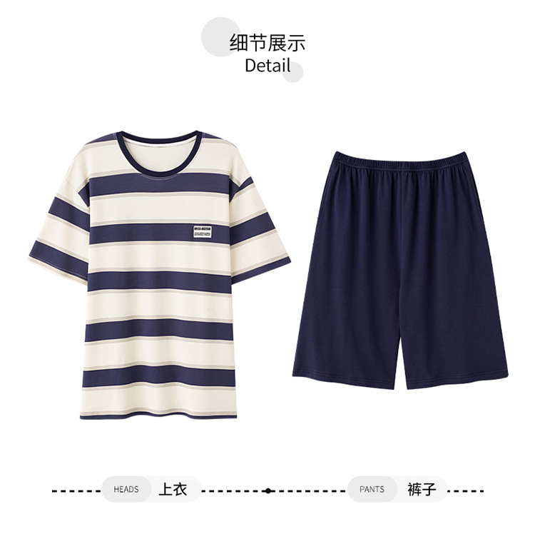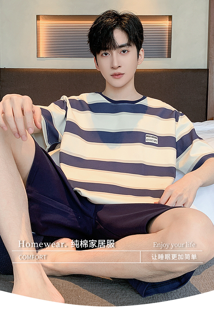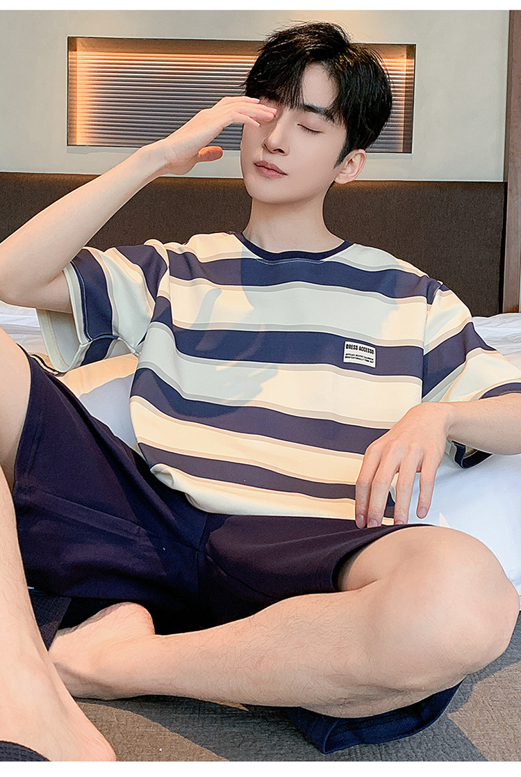 100 면 남자 여름 잠옷 크루 넥 반팔 반바지 투피스 캐주얼 스트라이프 의상 홈 의류스토어 가기
