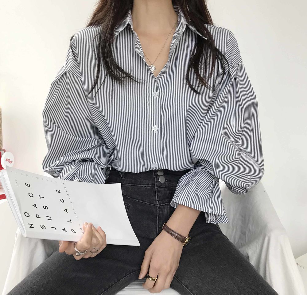 한국 세련된 스트라이프 셔츠 여성용 랜턴 긴 소매 이른 봄과 가을 세련된 탑 디자인 감각 틈새 복고풍 기질스토어 가기