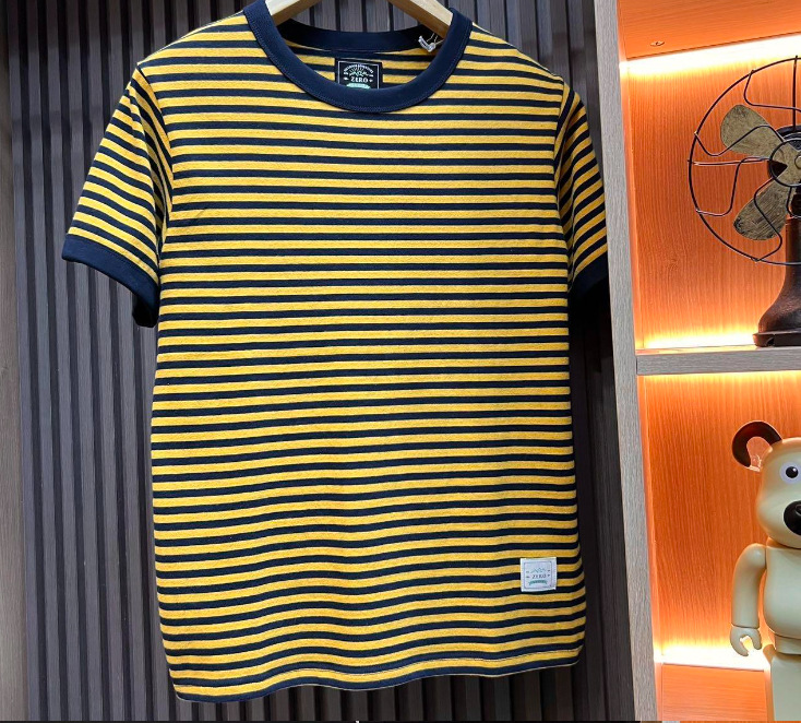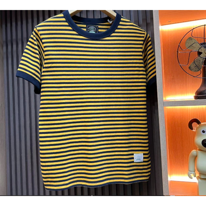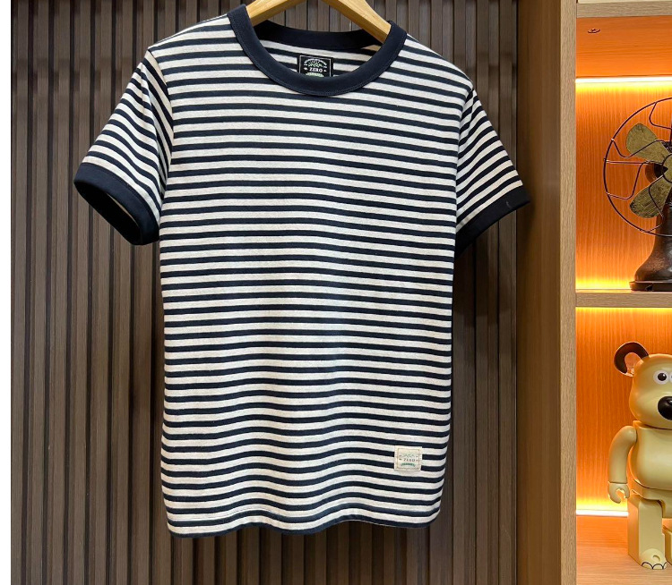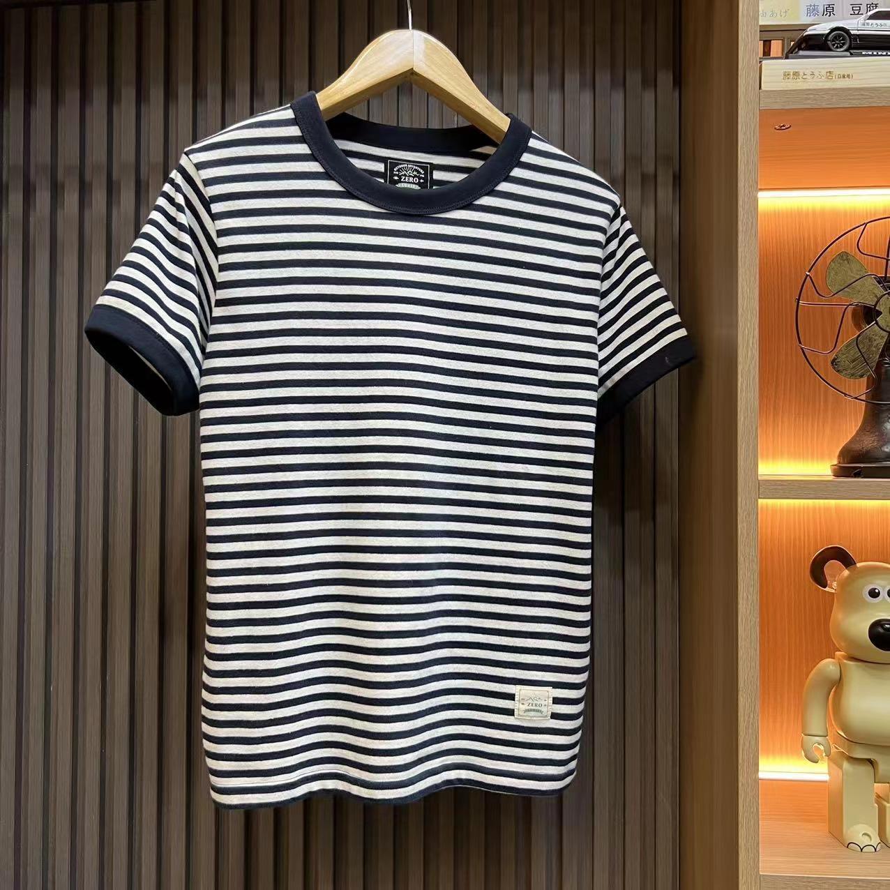 Tiktok 인기있는 스트라이프 반팔 티셔츠 남성용 여름 얇은 스웨터 남성과 여성의 반소매 라운드 넥 티셔츠 탑