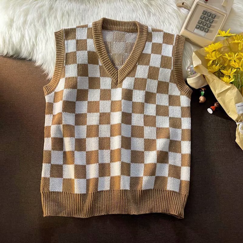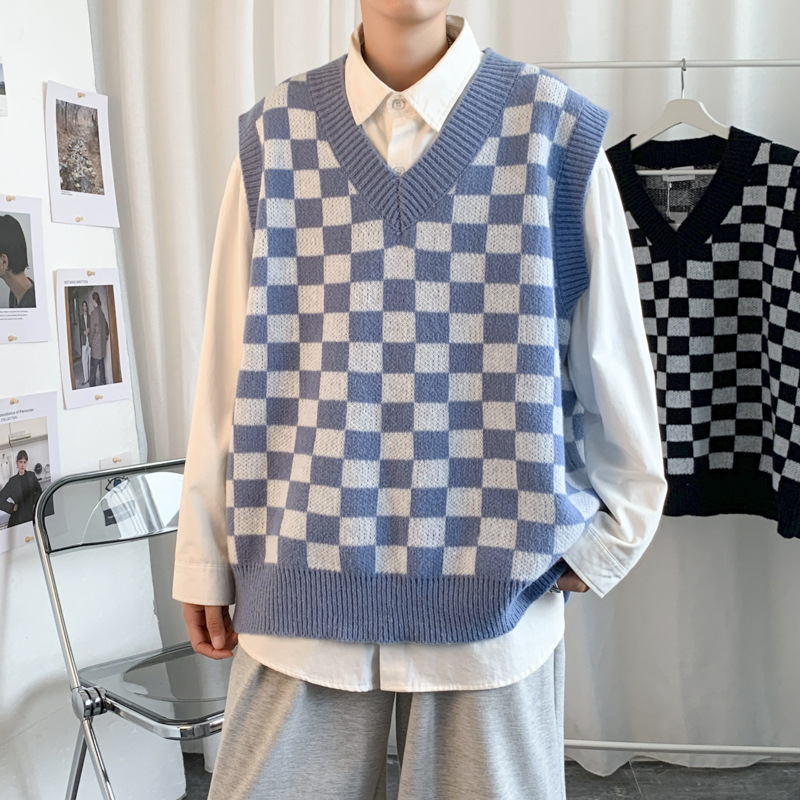가을 격자 무늬 민소매 스웨터 남성용 홍콩 스타일 느슨한 겉옷 조끼 한국식 트렌디 한 니트 V 넥 조끼스토어 가기