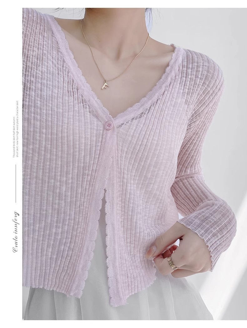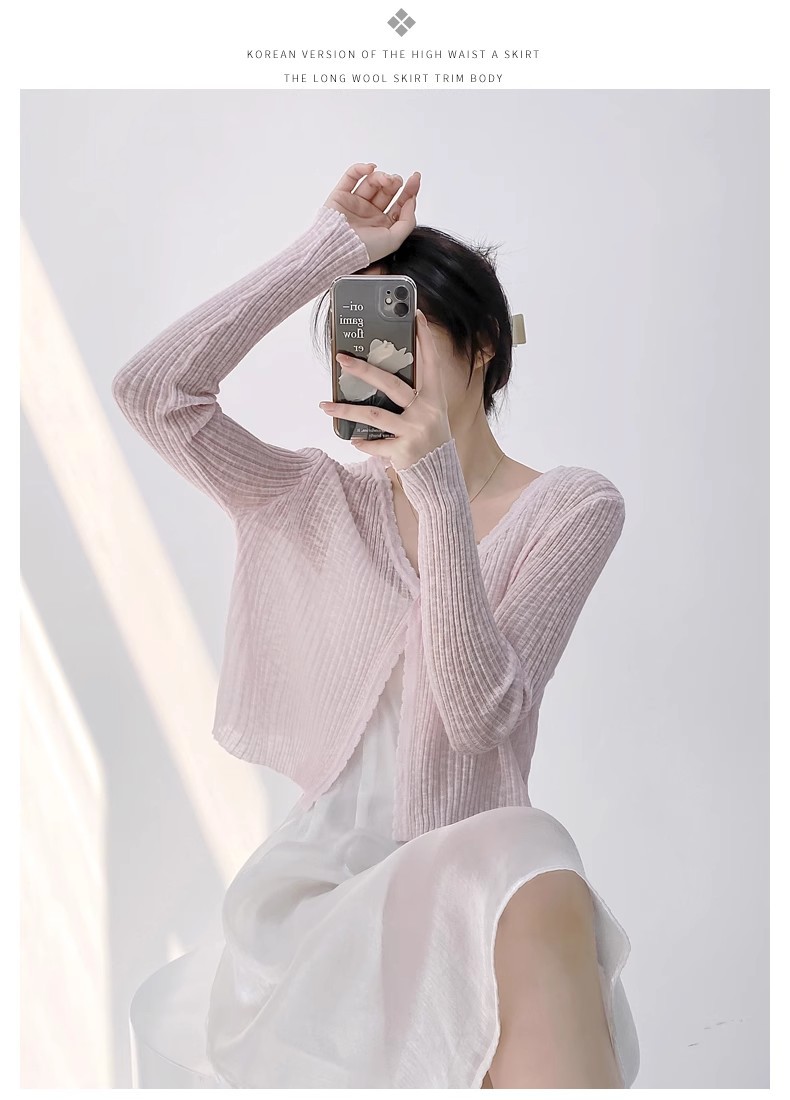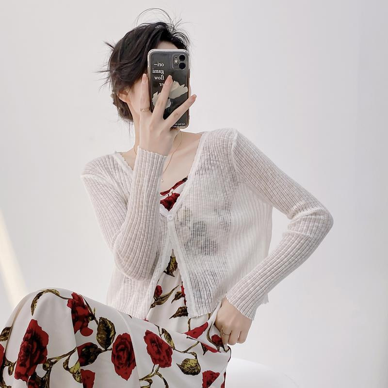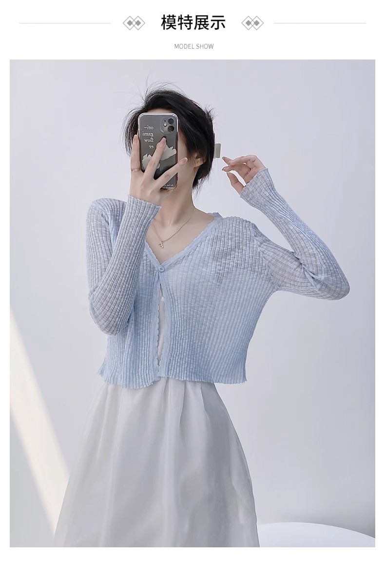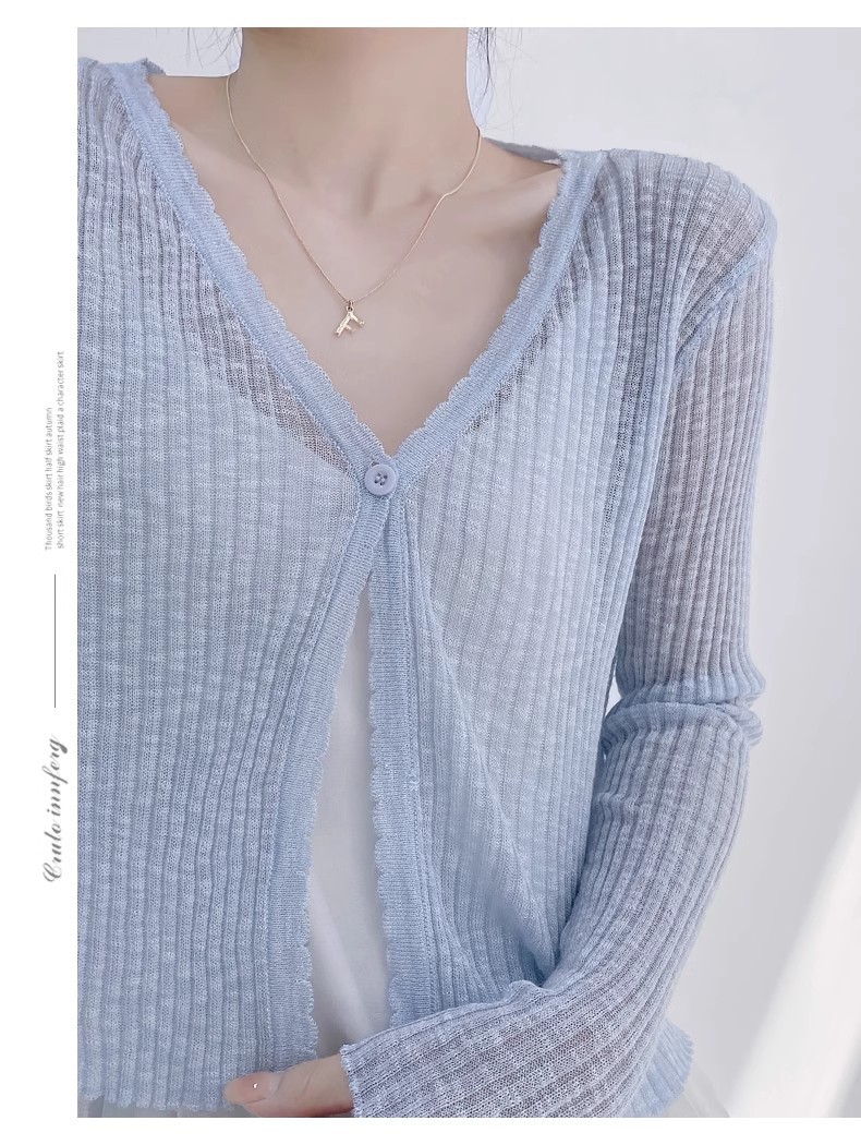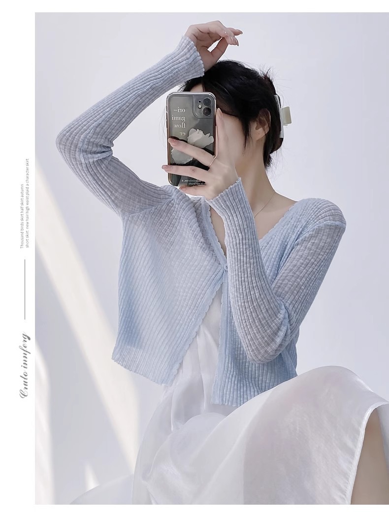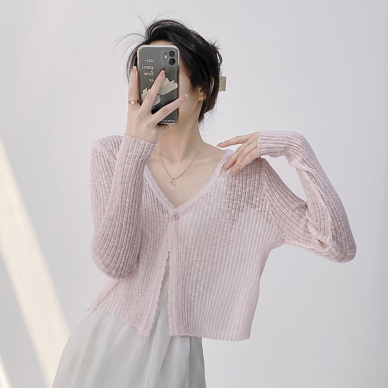 여름 V 넥 니트 카디건 여성의 얇은 부드러운 스타일 긴 소매 짧은 톱 목도리 외부 태양 보호 셔츠 블라우스 코트스토어 가기