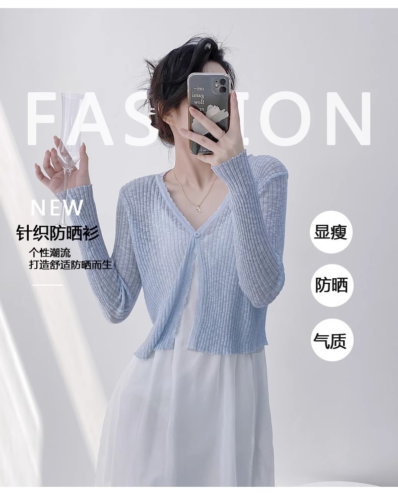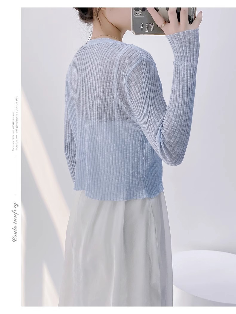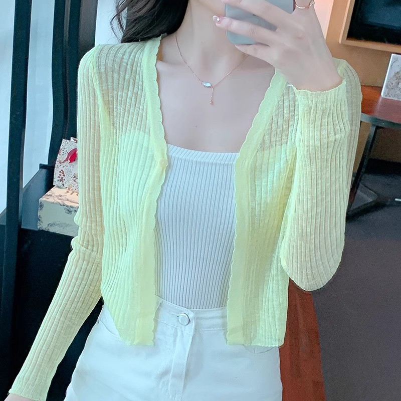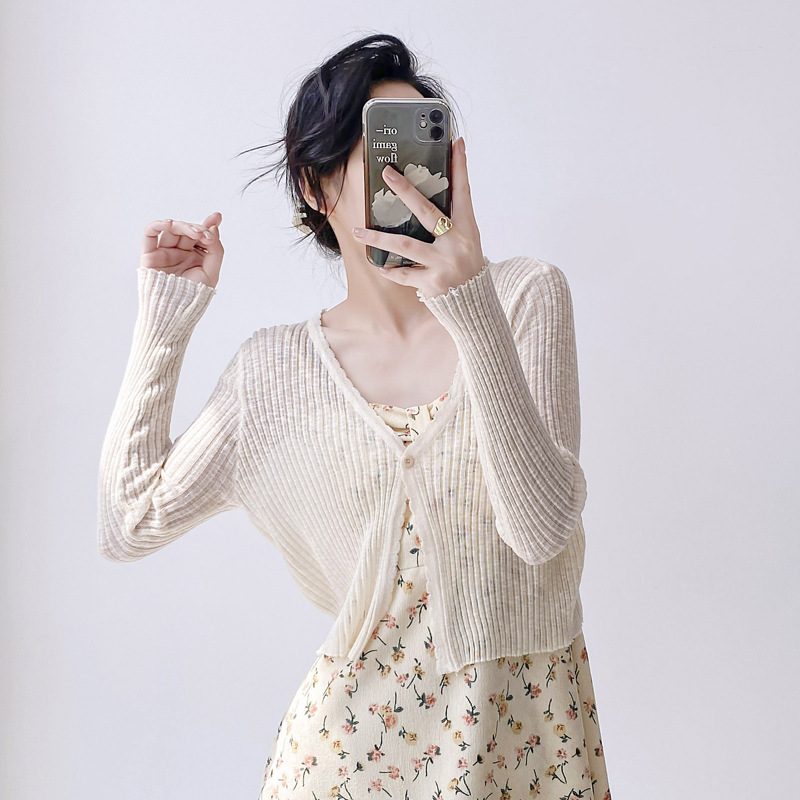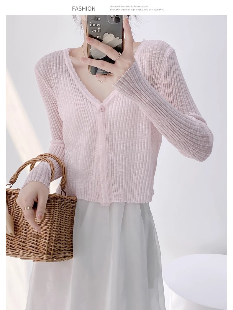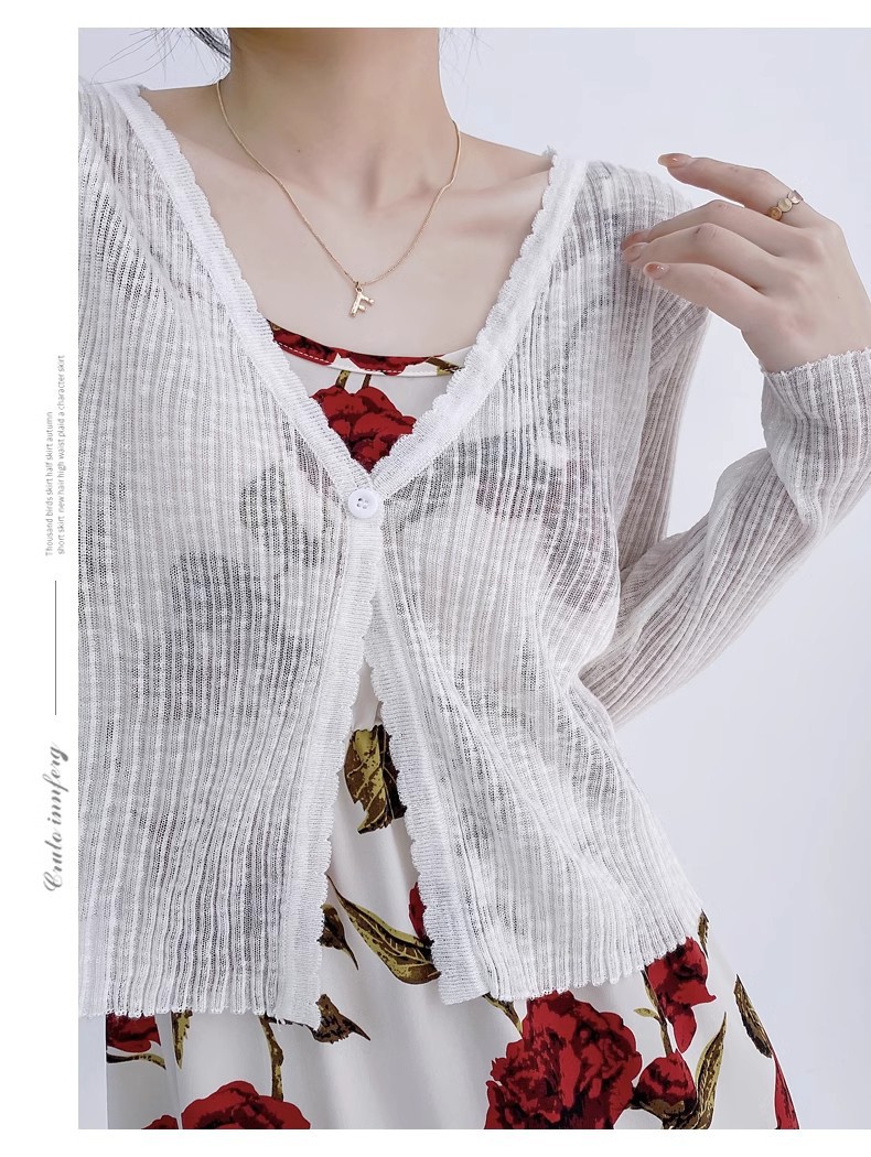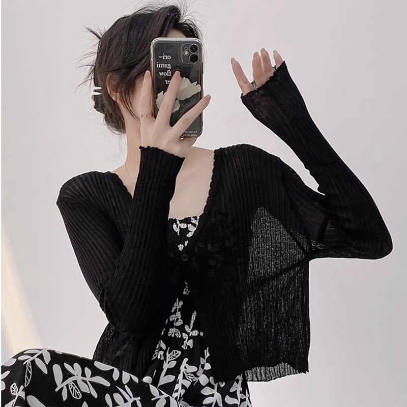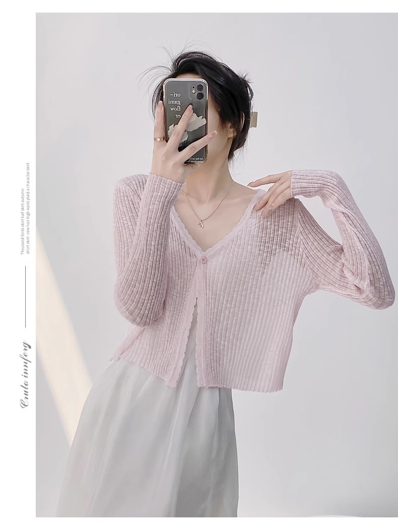 여름 V 넥 니트 카디건 여성의 얇은 부드러운 스타일 긴 소매 짧은 톱 목도리 외부 태양 보호 셔츠 블라우스 코트스토어 가기