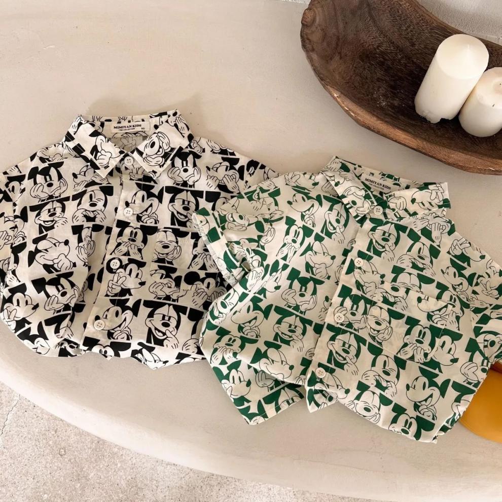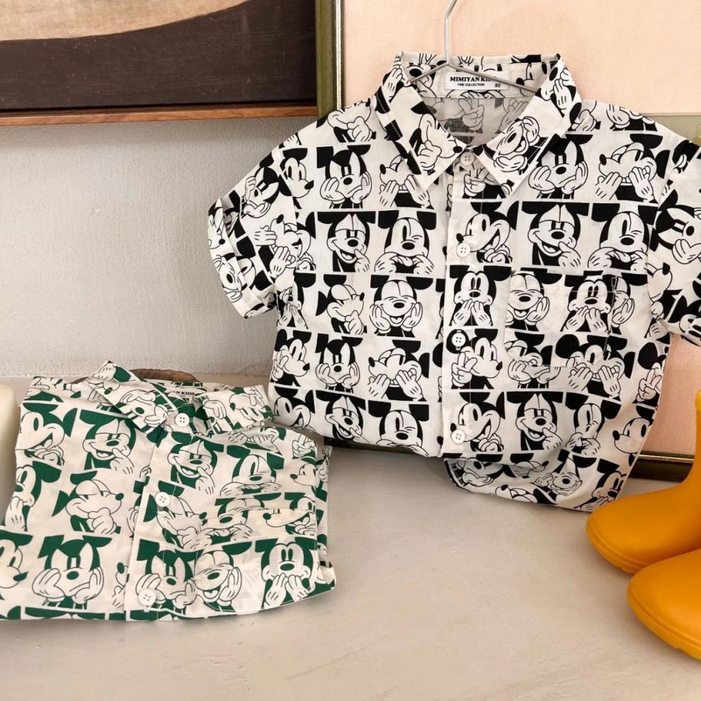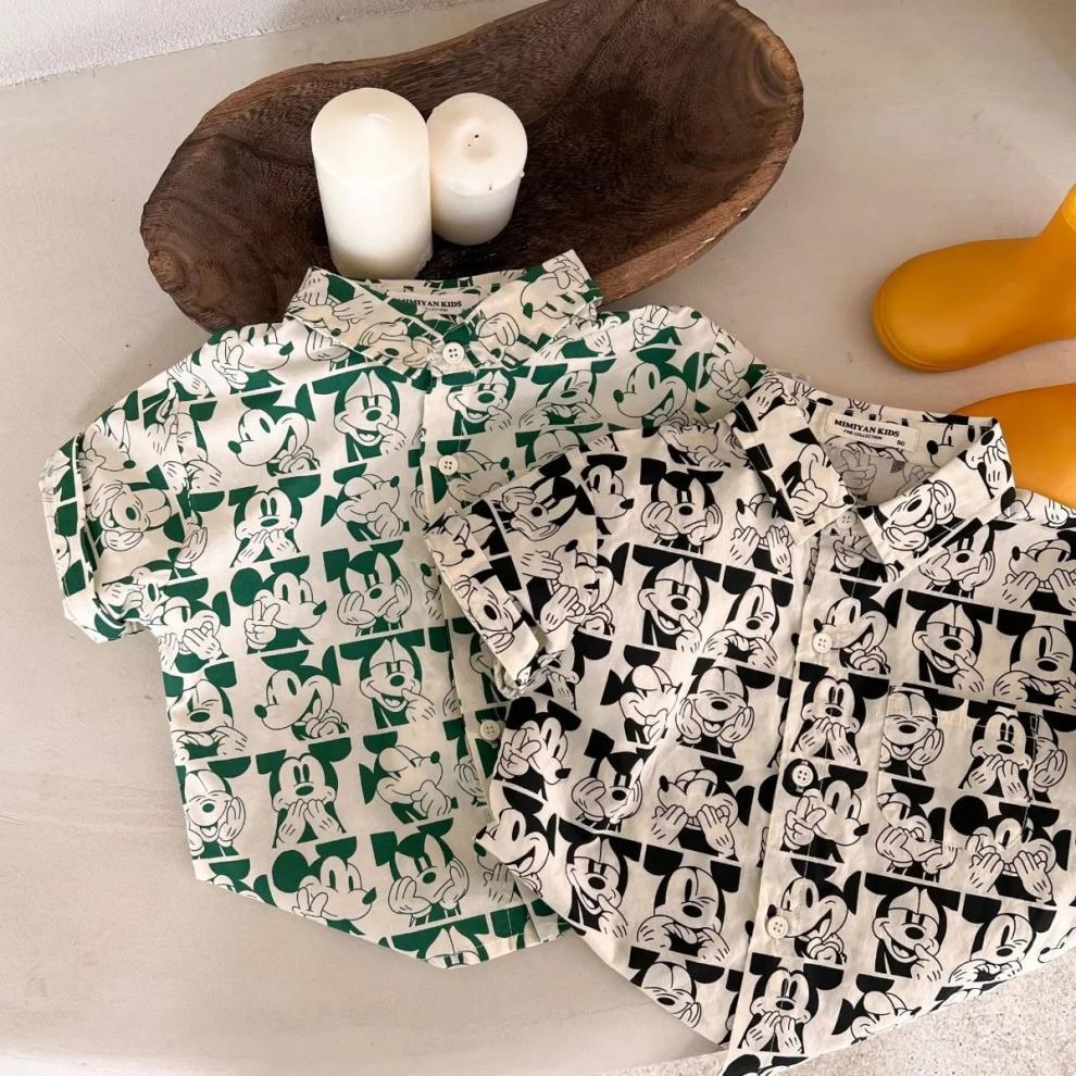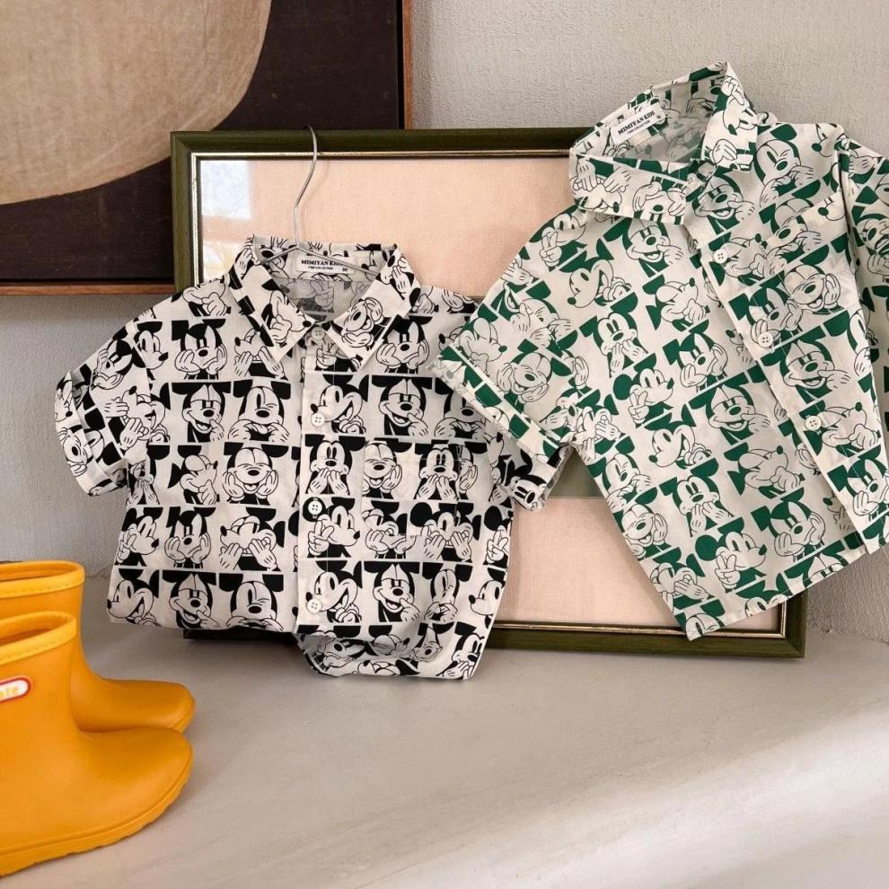 소년 셔츠 2023 어린이 여름 새 소녀 전체 인쇄 만화 셔츠 아기 옷깃 짧은 소매 셔츠
