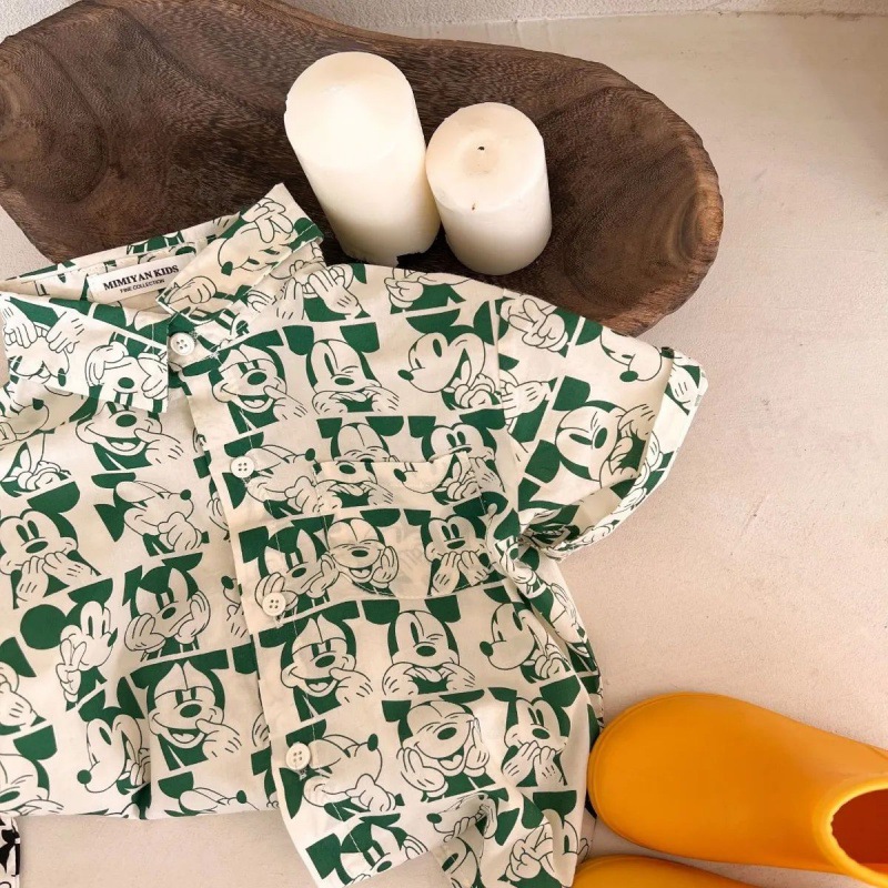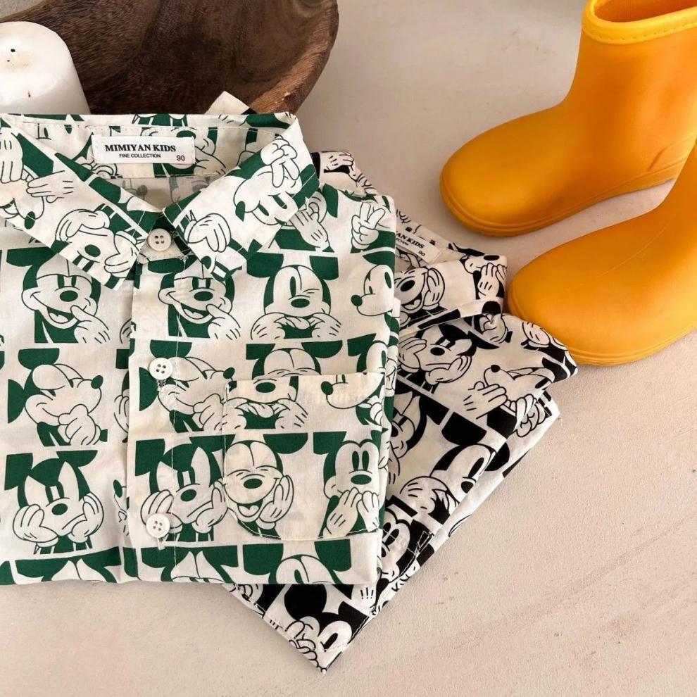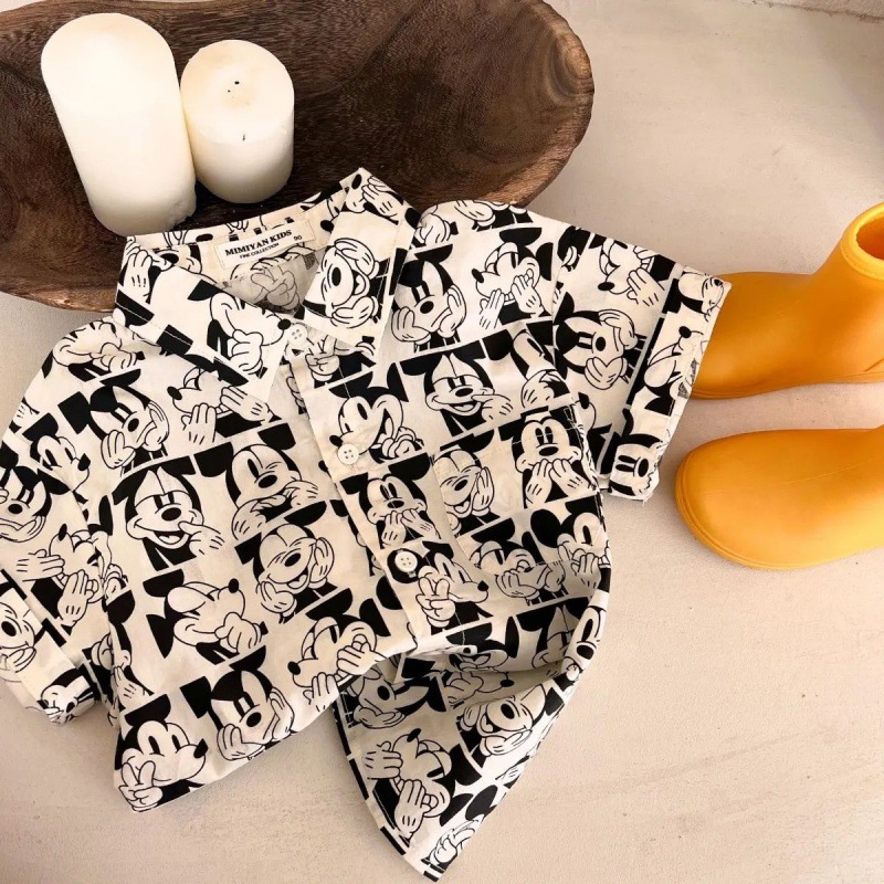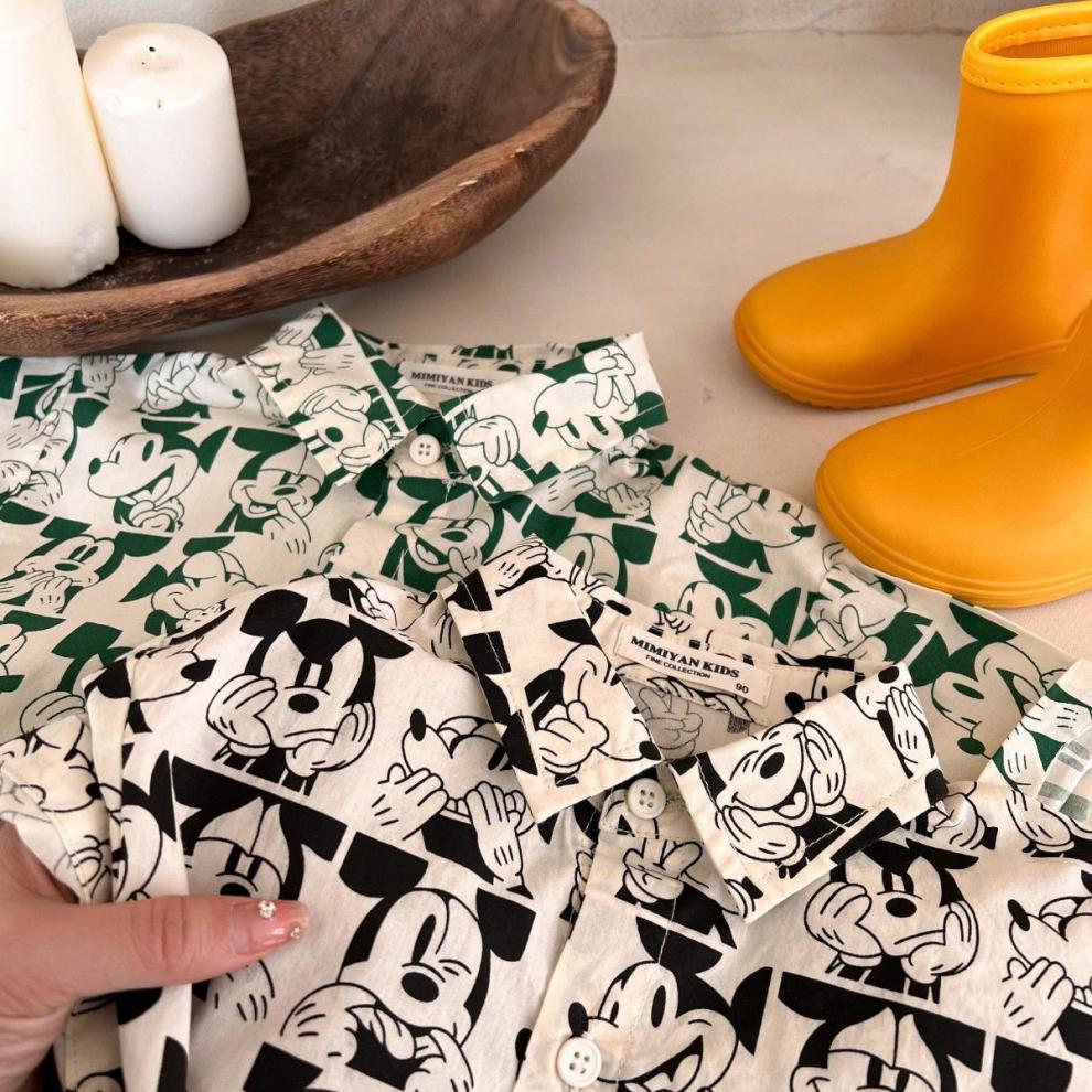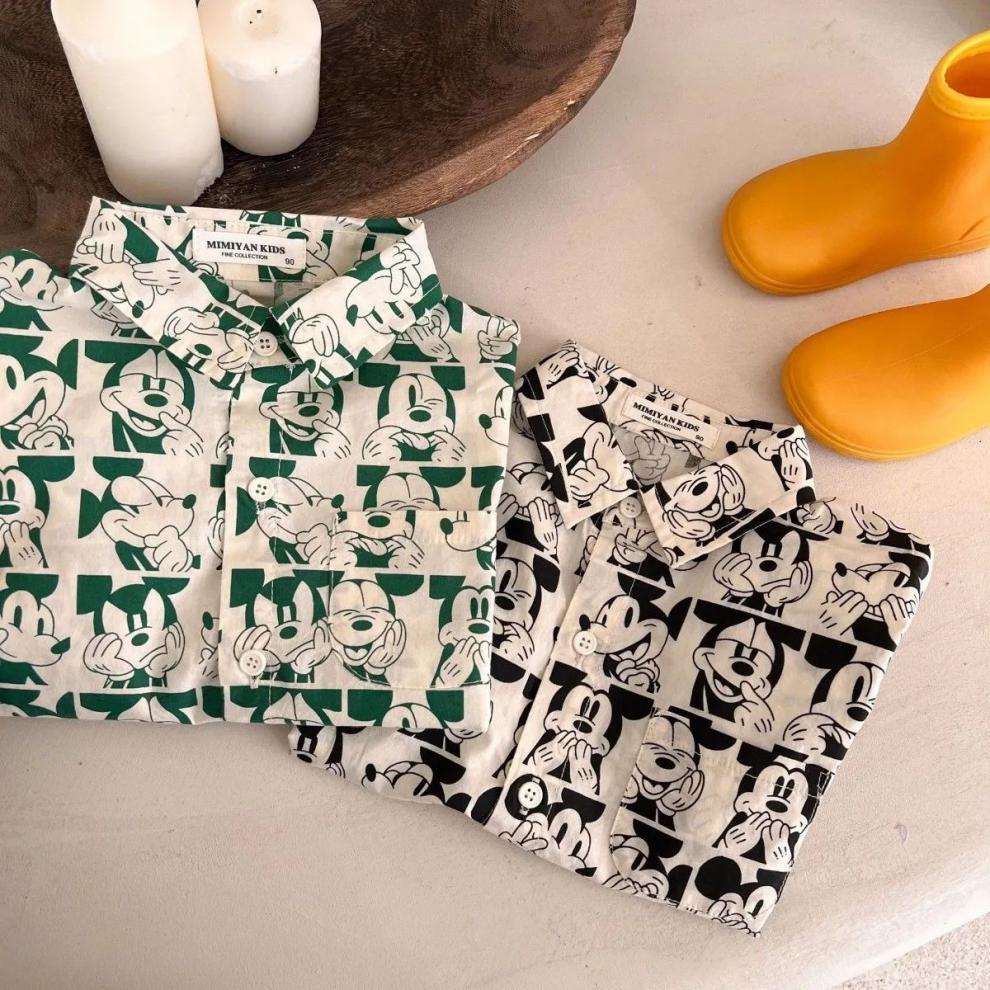 소년 셔츠 2023 어린이 여름 새 소녀 전체 인쇄 만화 셔츠 아기 옷깃 짧은 소매 셔츠