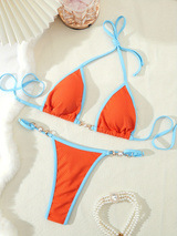 새로운 유럽과 미국의 대외 무역 섹시한 백리스 대비 컬러 에지 진주 보석 비키니 분할 수영복 여성 수영복 비키니