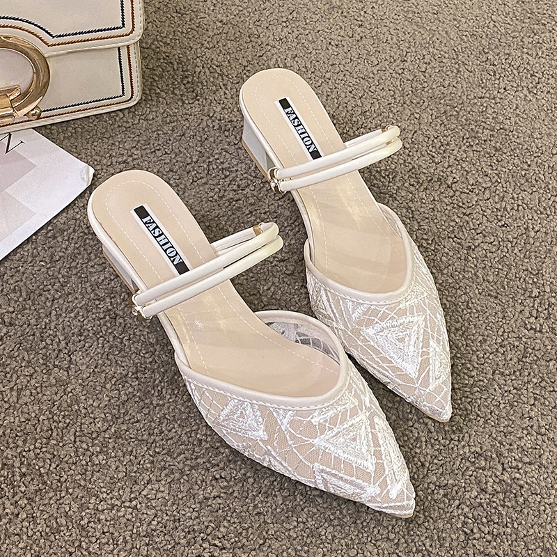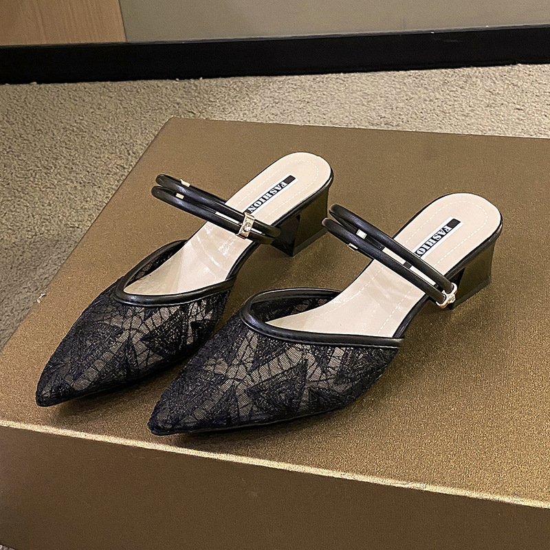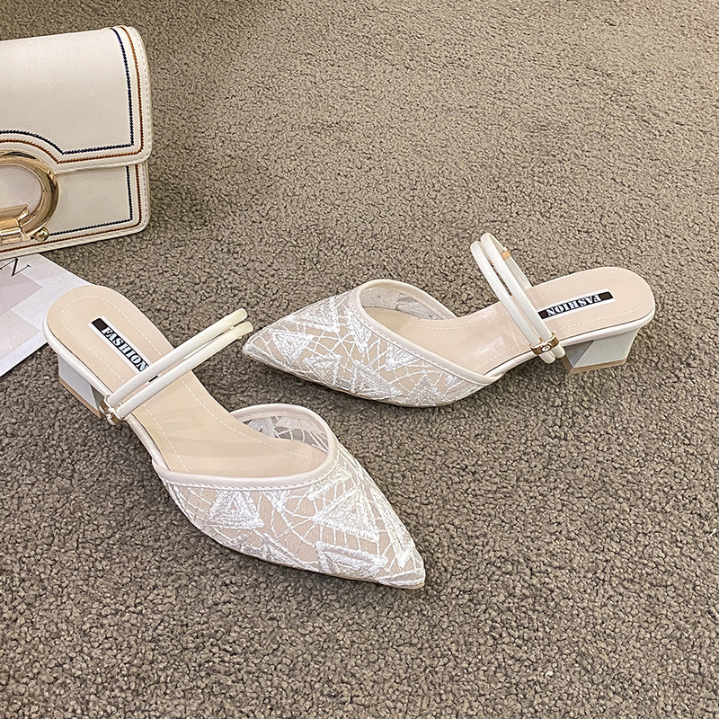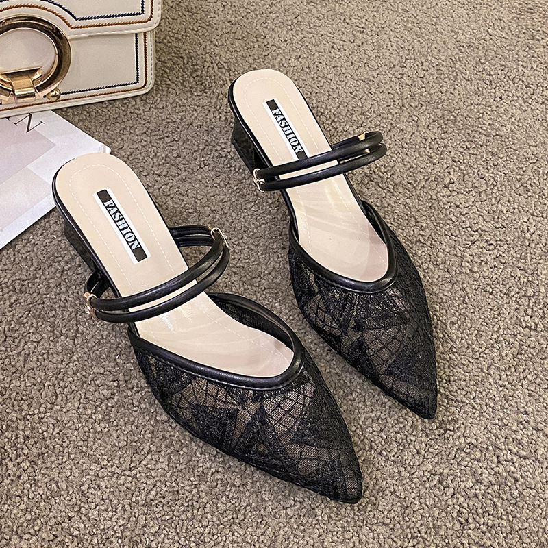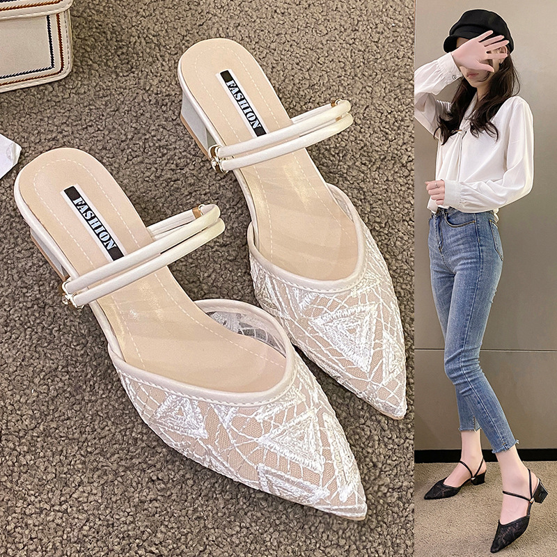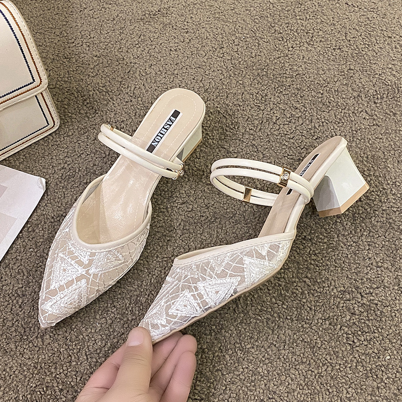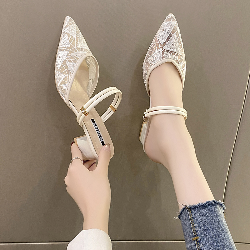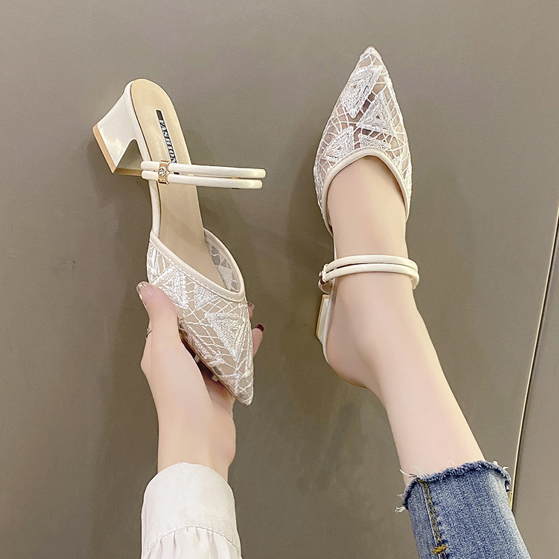 2023 여름 새로운 요정 스타일의 뾰족한 발가락 중간 발 뒤꿈치 닫힌 발가락 샌들 여성용 청키 뒤꿈치 원피스 빈 메쉬 여성용 슬리퍼스토어 가기