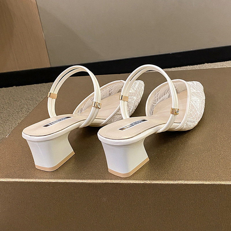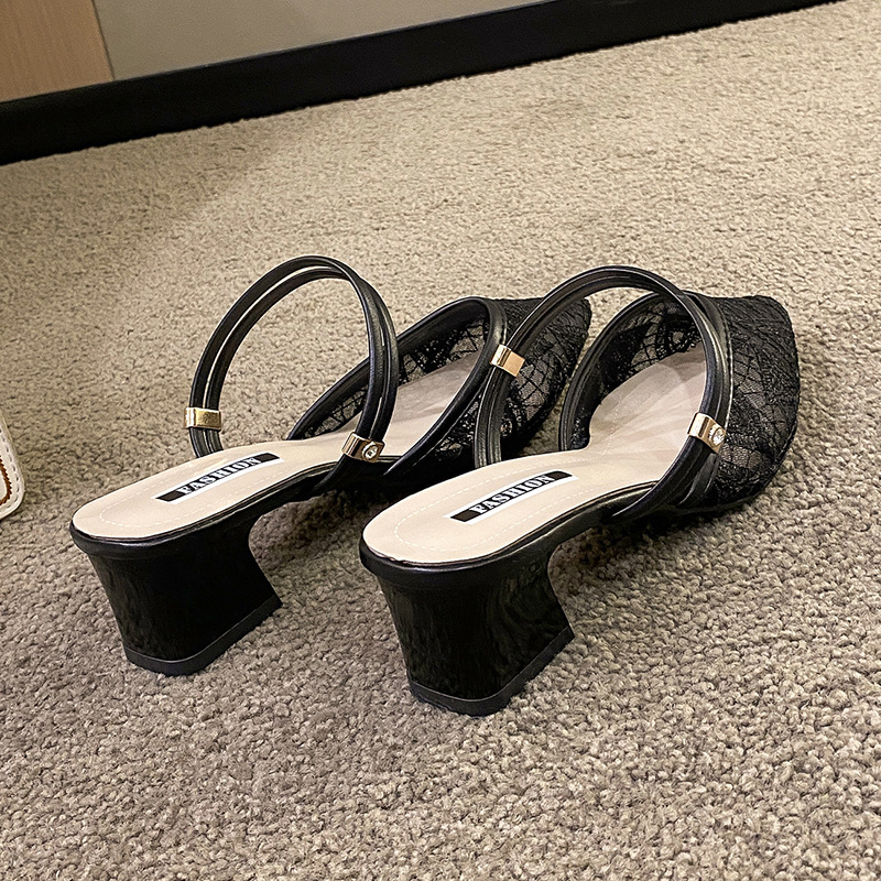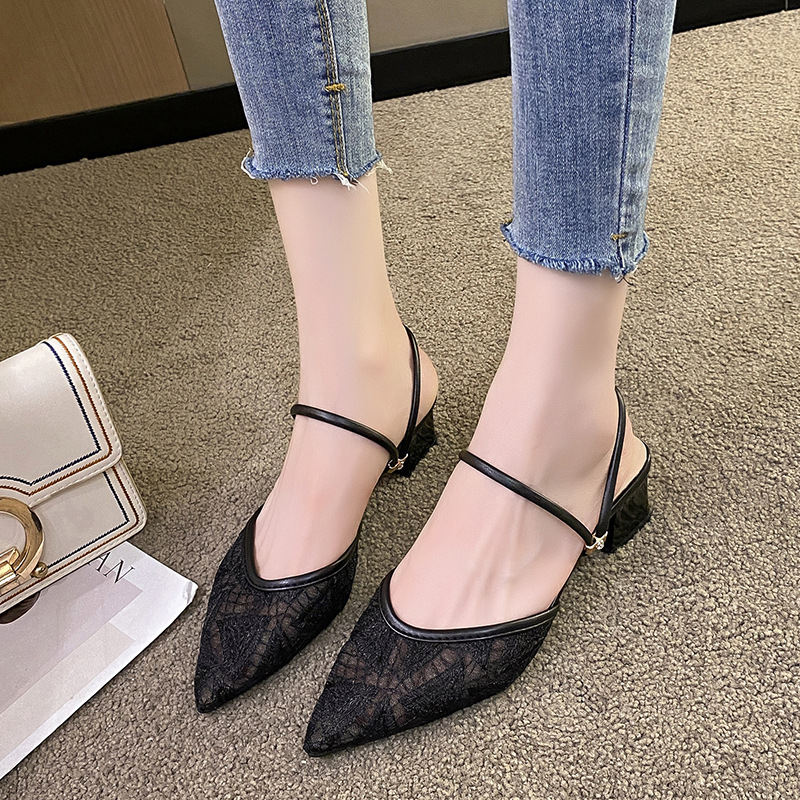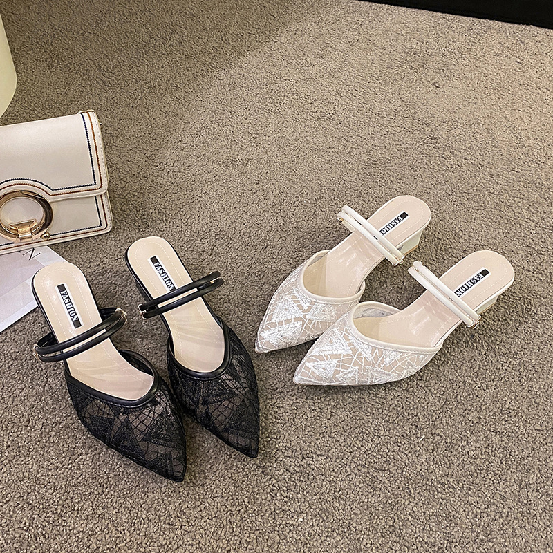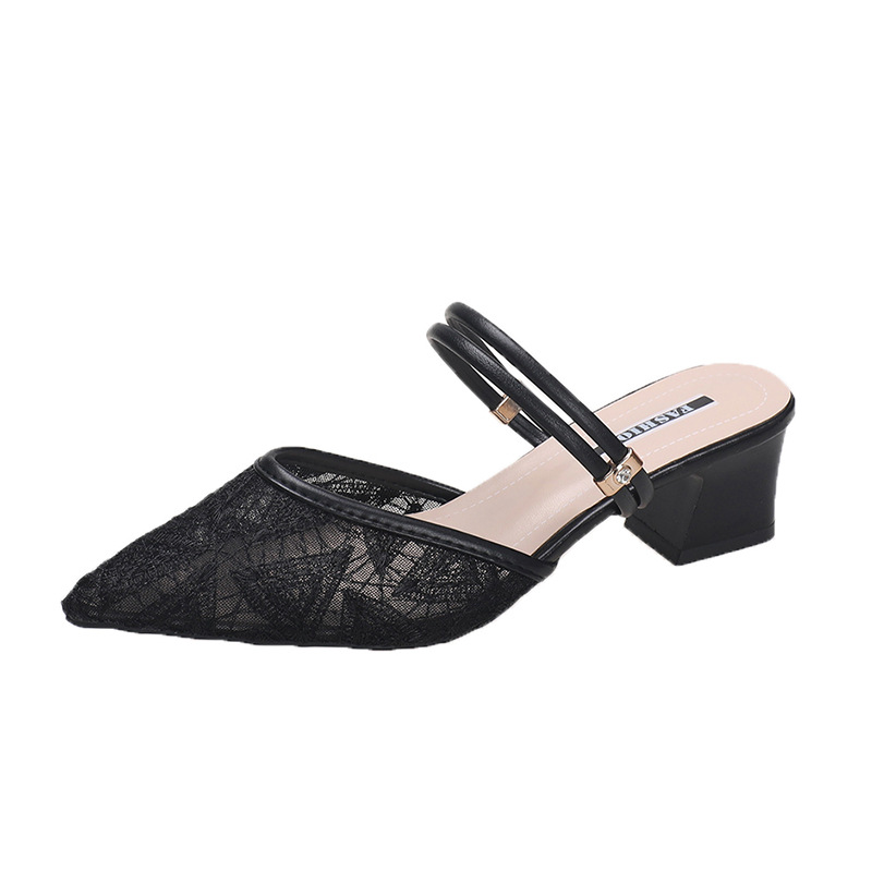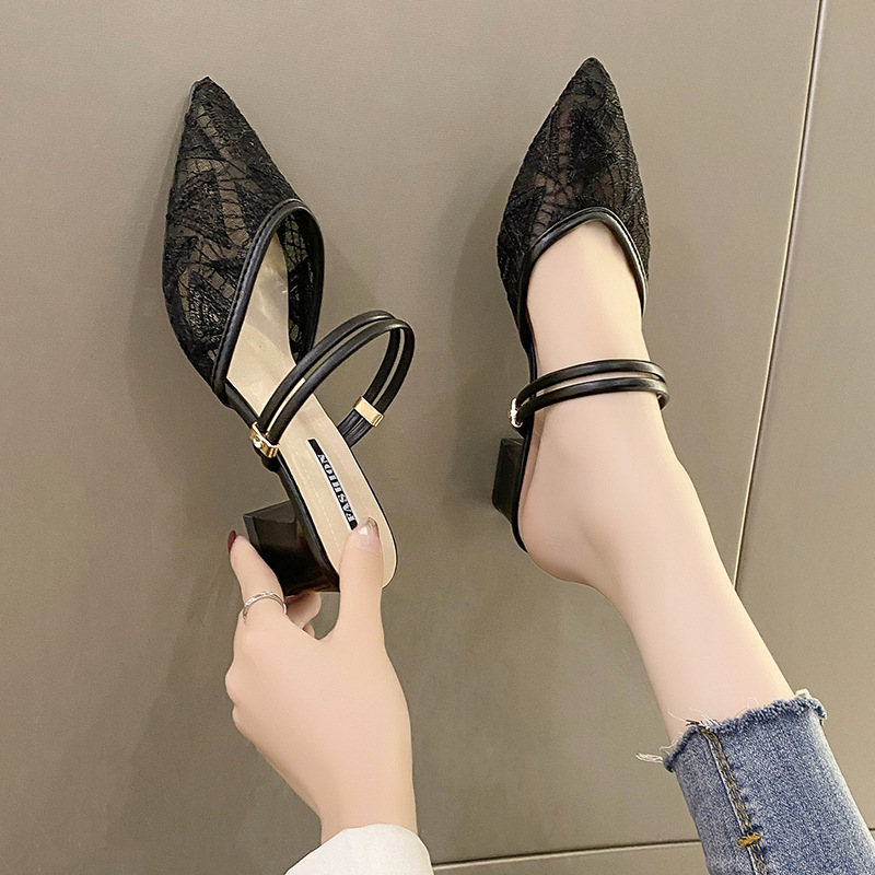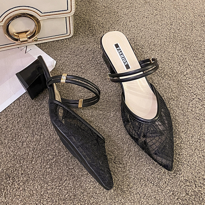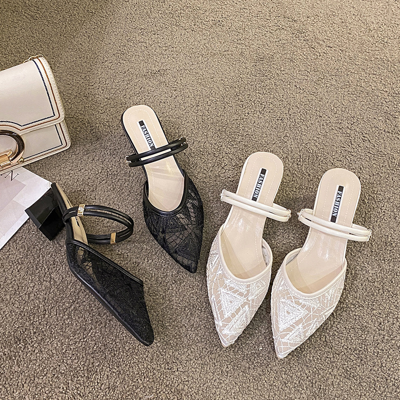 2023 여름 새로운 요정 스타일의 뾰족한 발가락 중간 발 뒤꿈치 닫힌 발가락 샌들 여성용 청키 뒤꿈치 원피스 빈 메쉬 여성용 슬리퍼스토어 가기