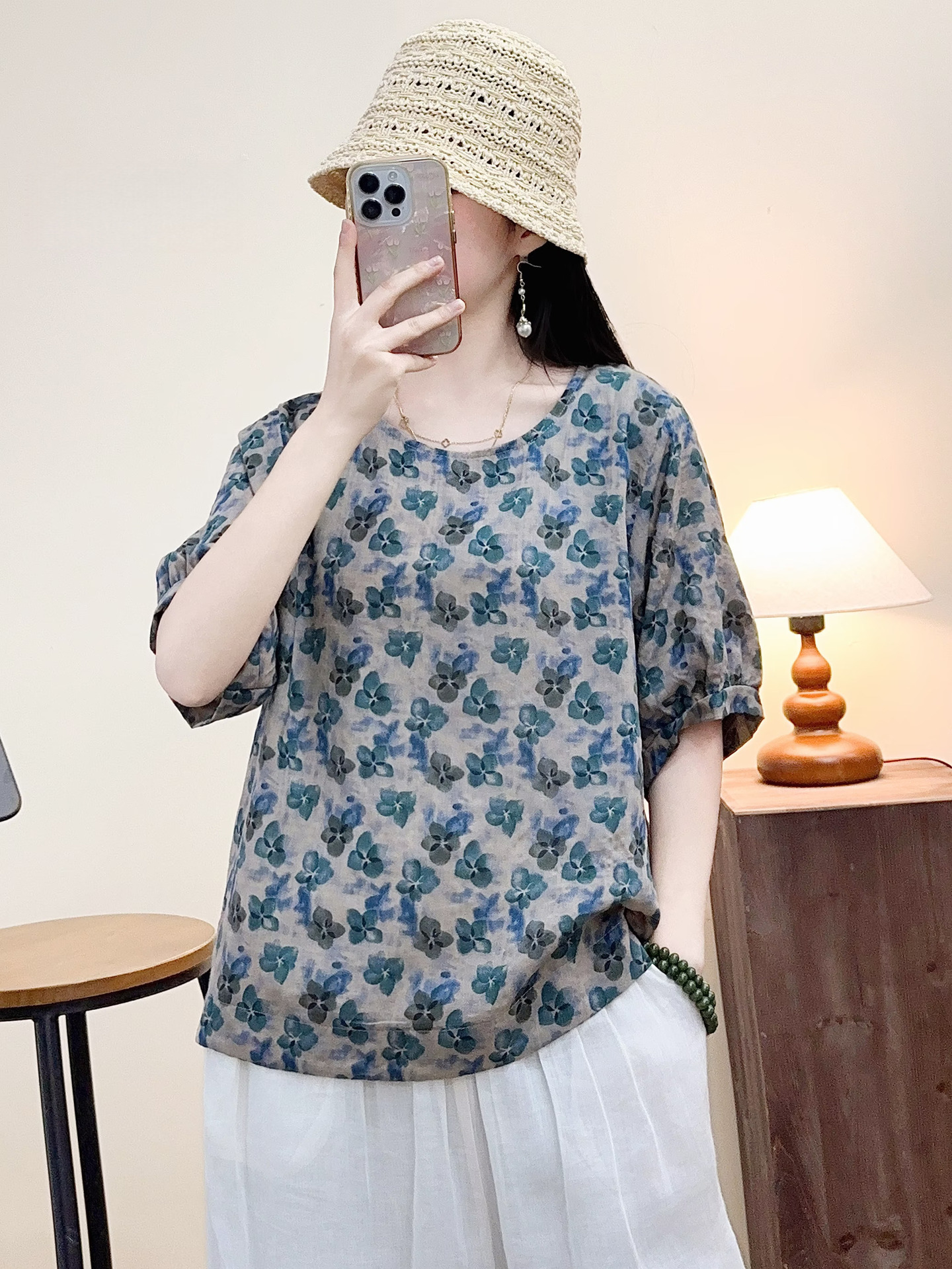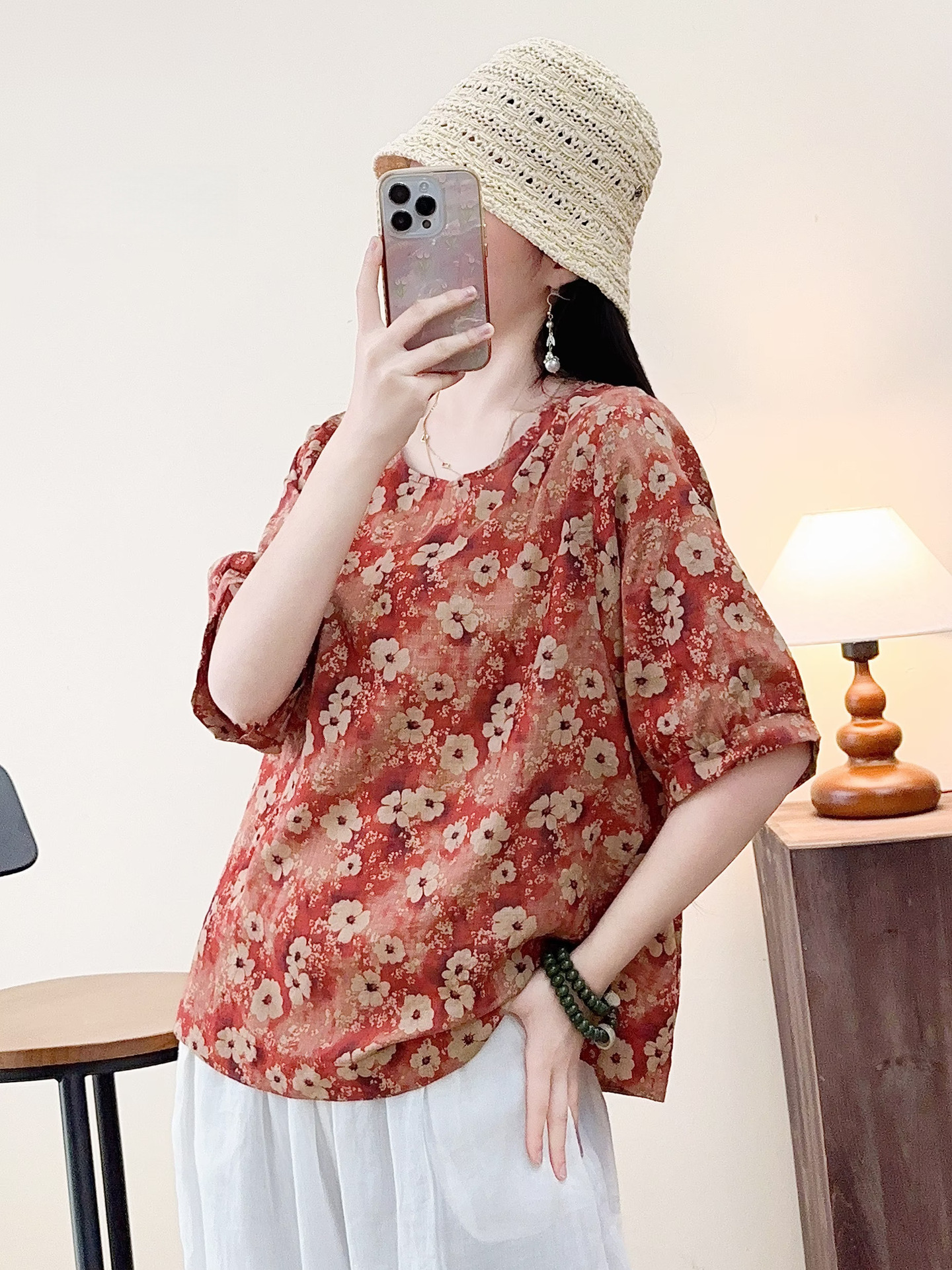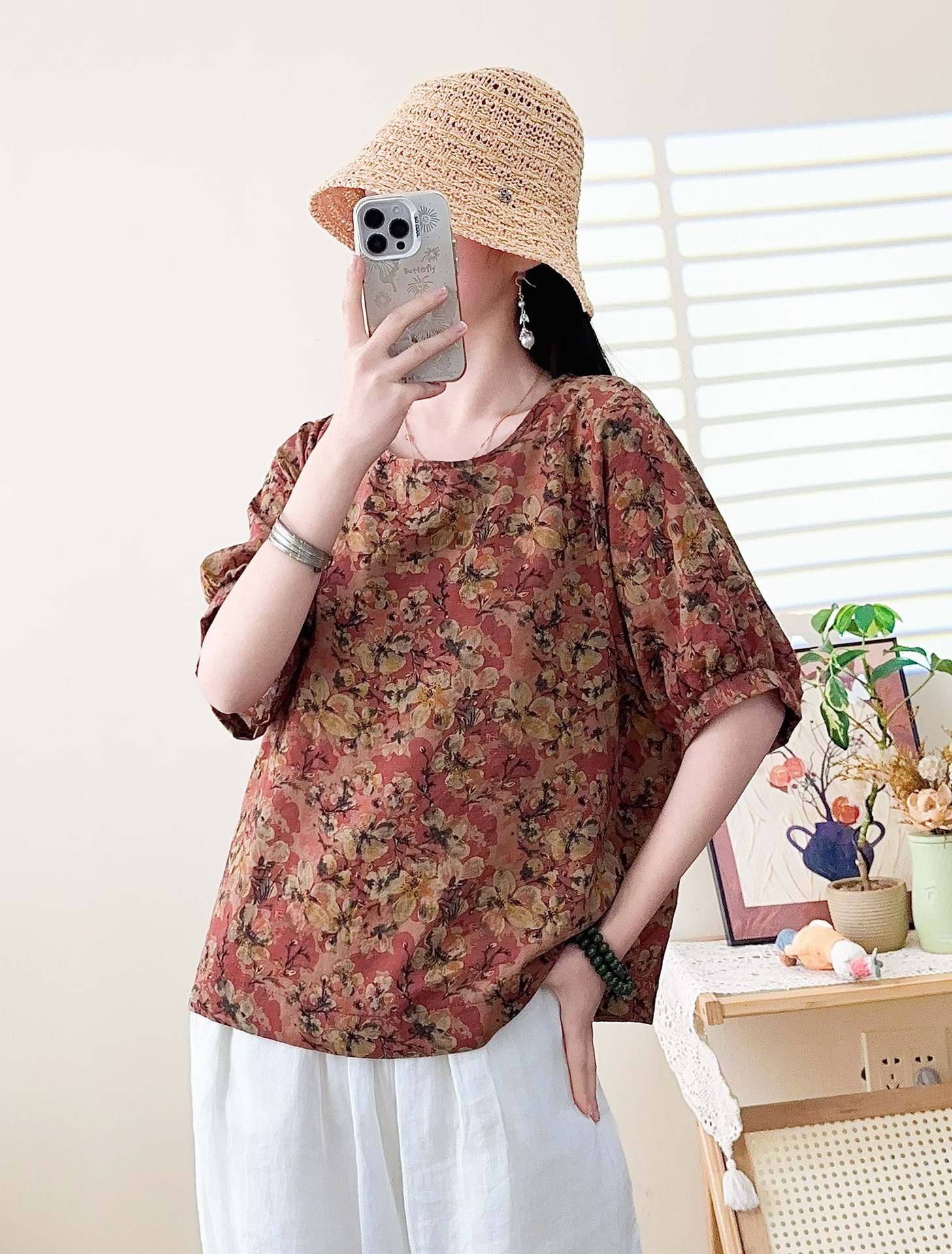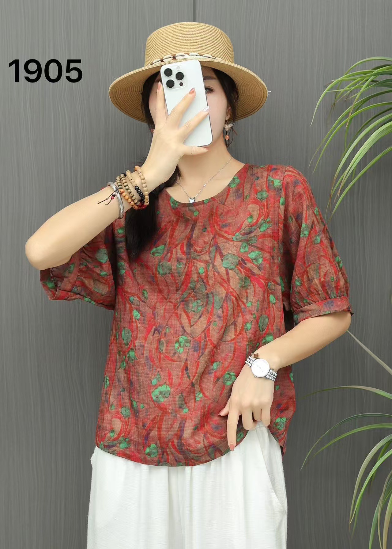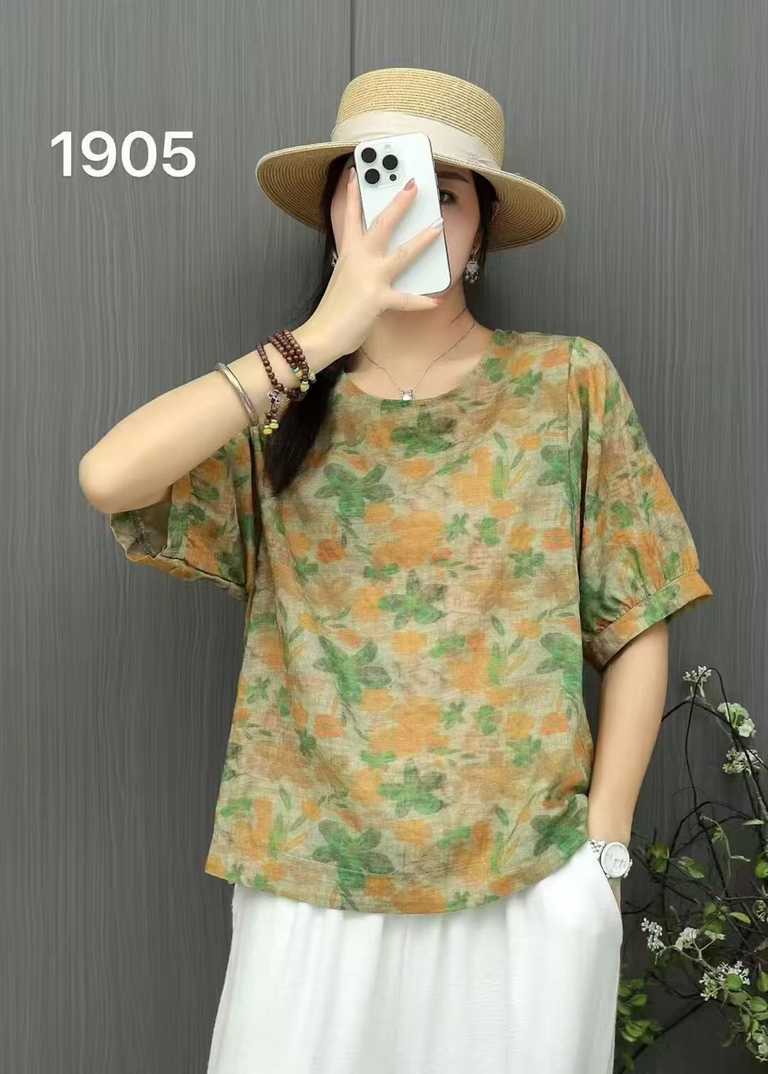 2025夏季新款复古民族风天丝麻短袖T桖圆领印花宽松大码女上衣 RMB:25.00