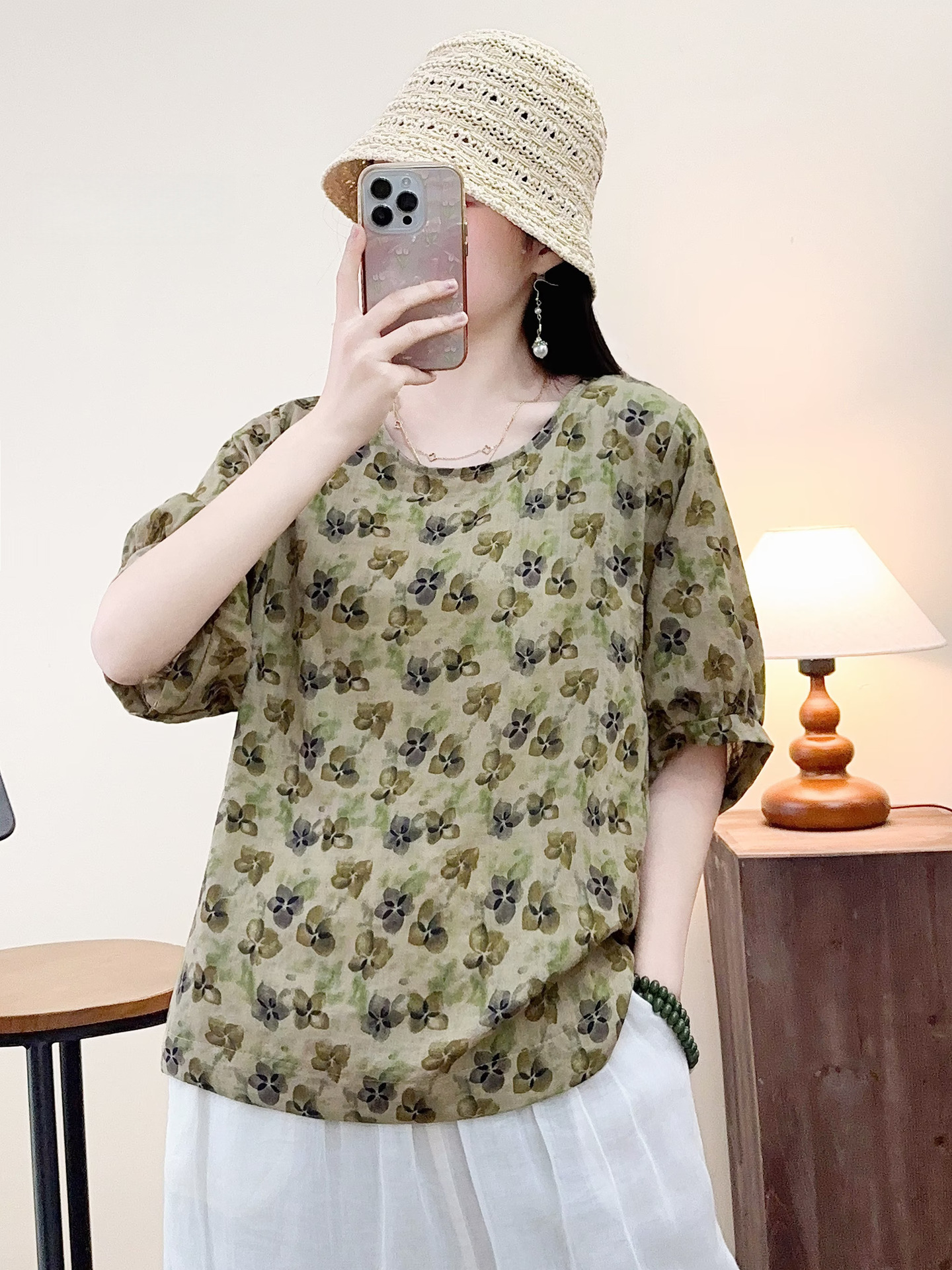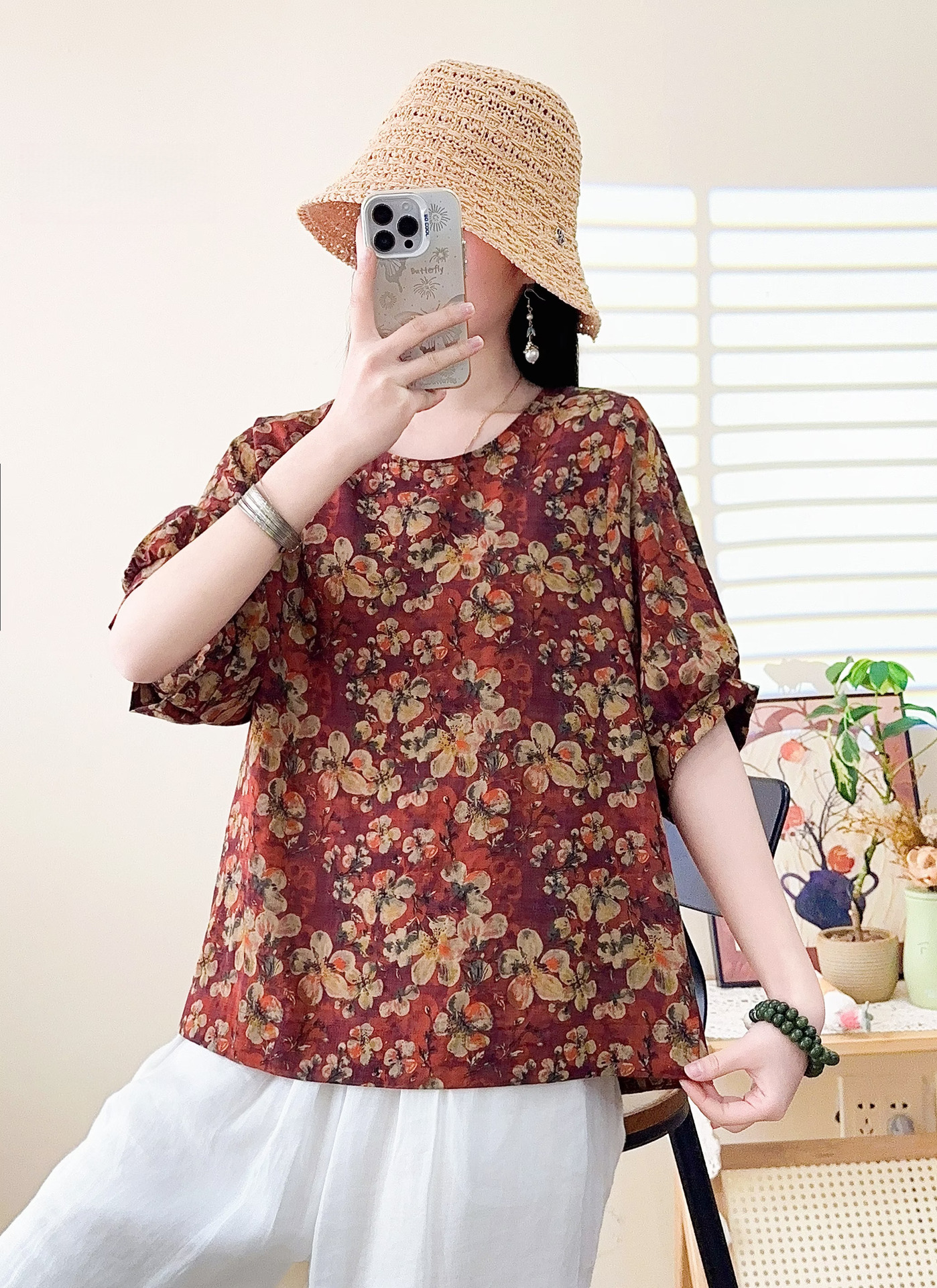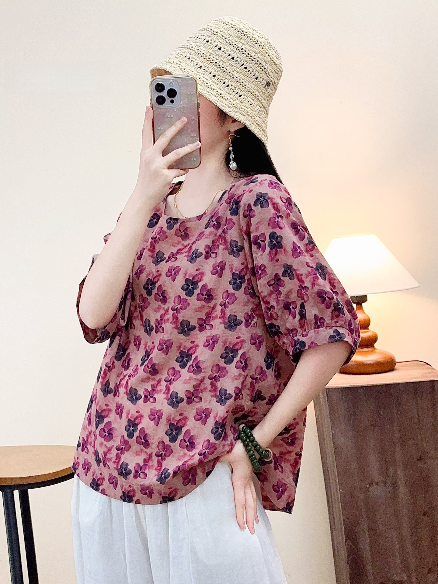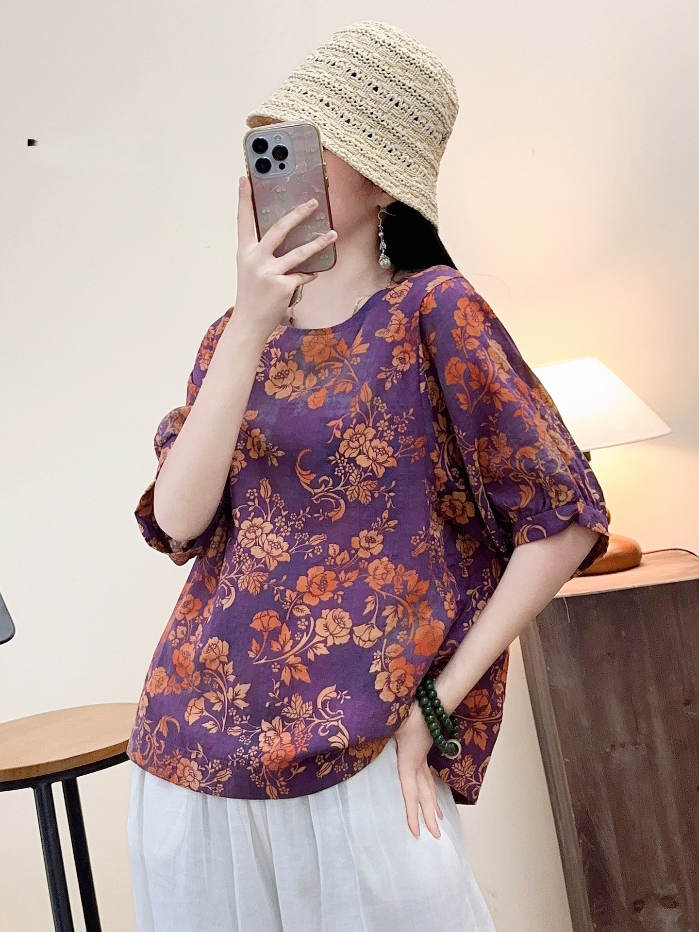 2025夏季新款复古民族风天丝麻短袖T桖圆领印花宽松大码女上衣 RMB:25.00
