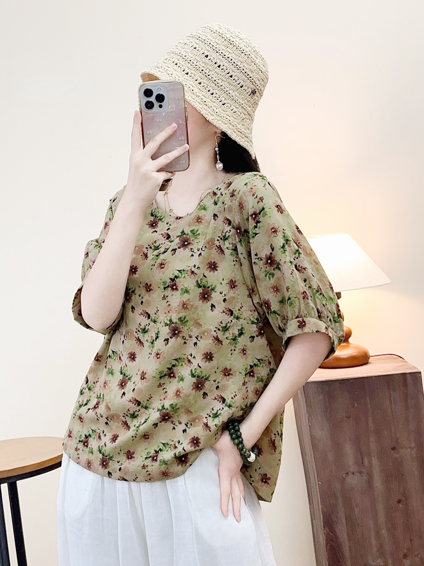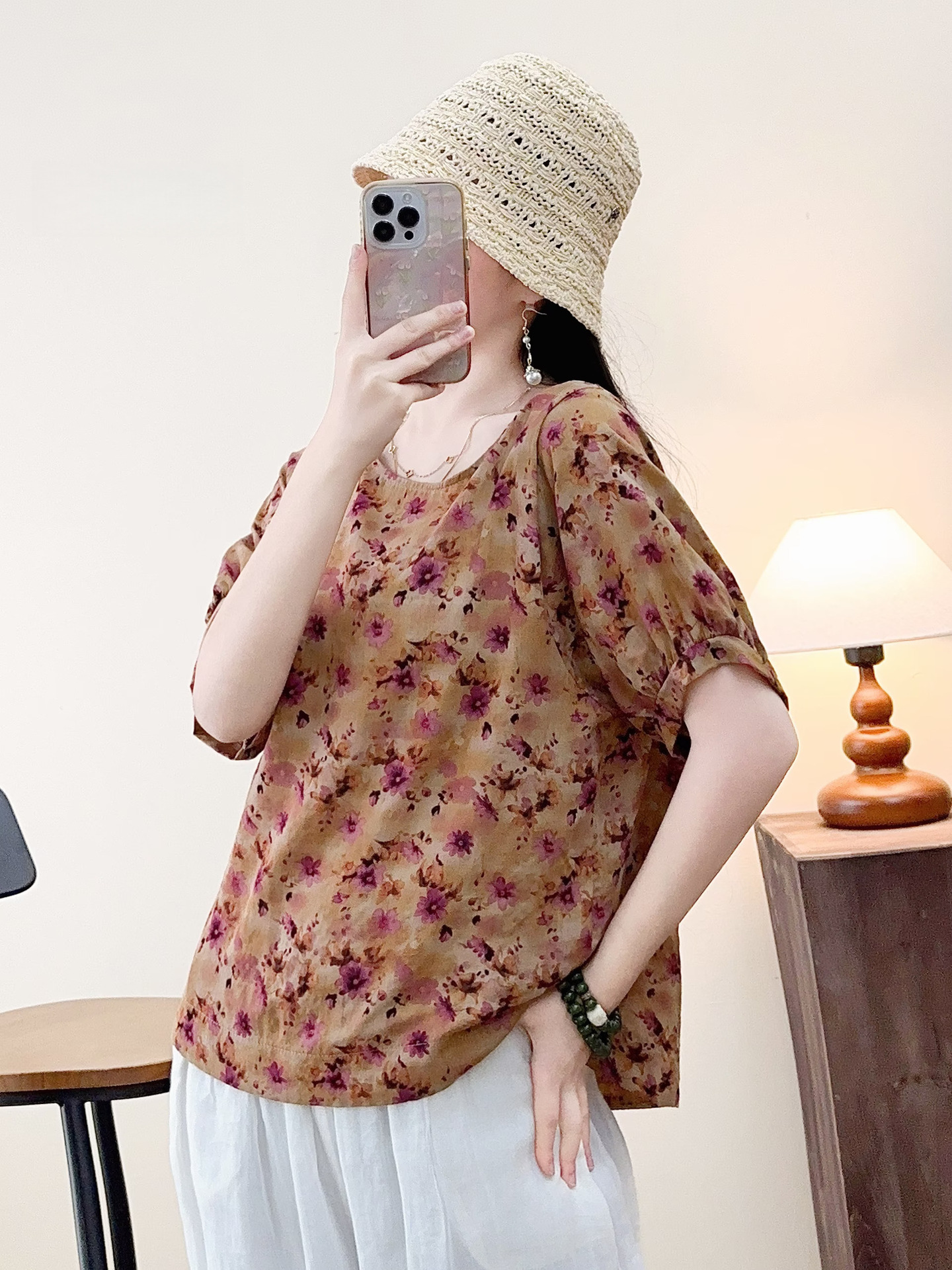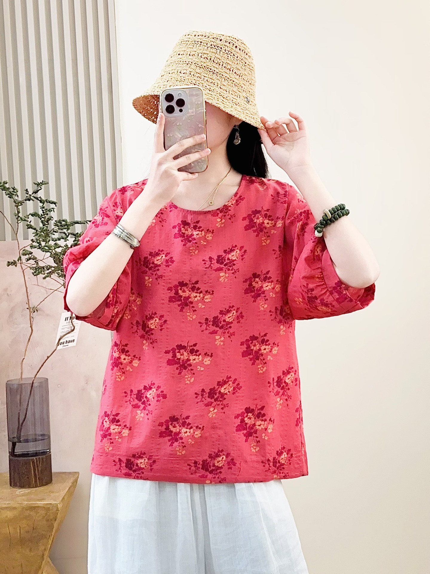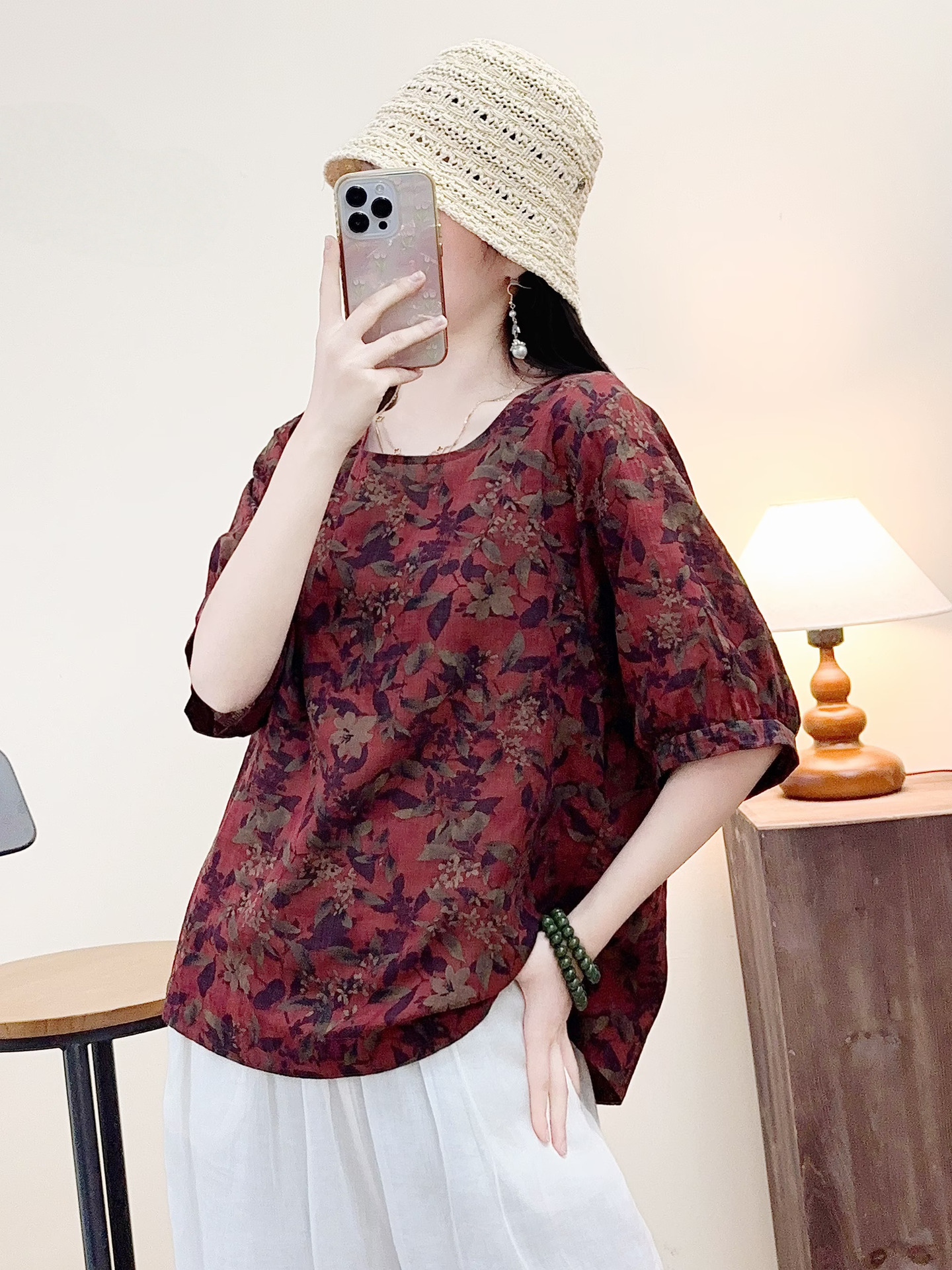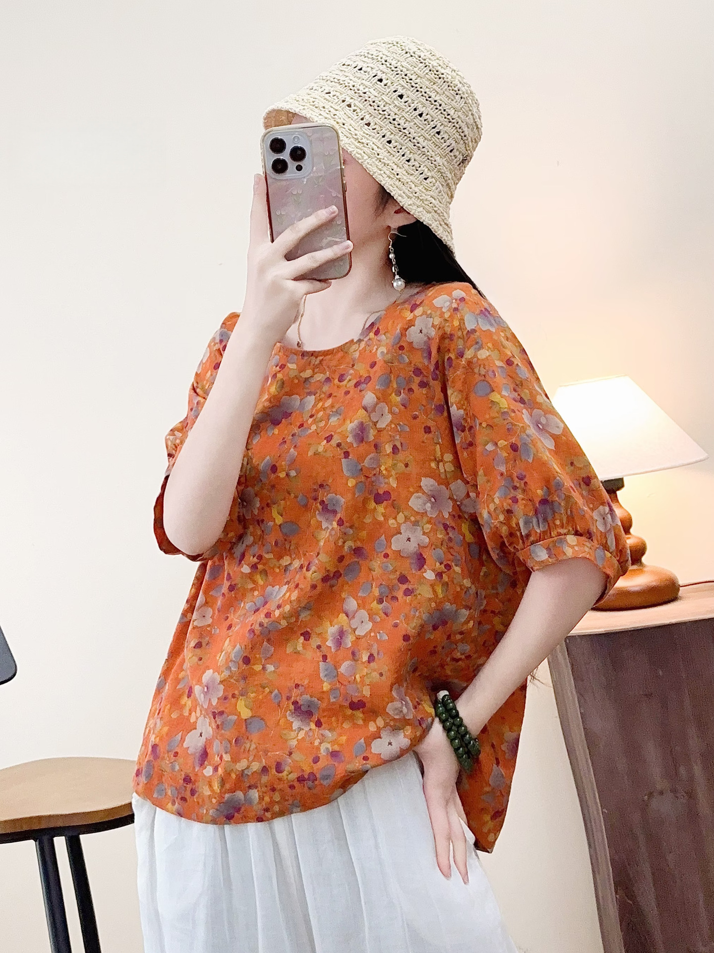 2025夏季新款复古民族风天丝麻短袖T桖圆领印花宽松大码女上衣 RMB:25.00
