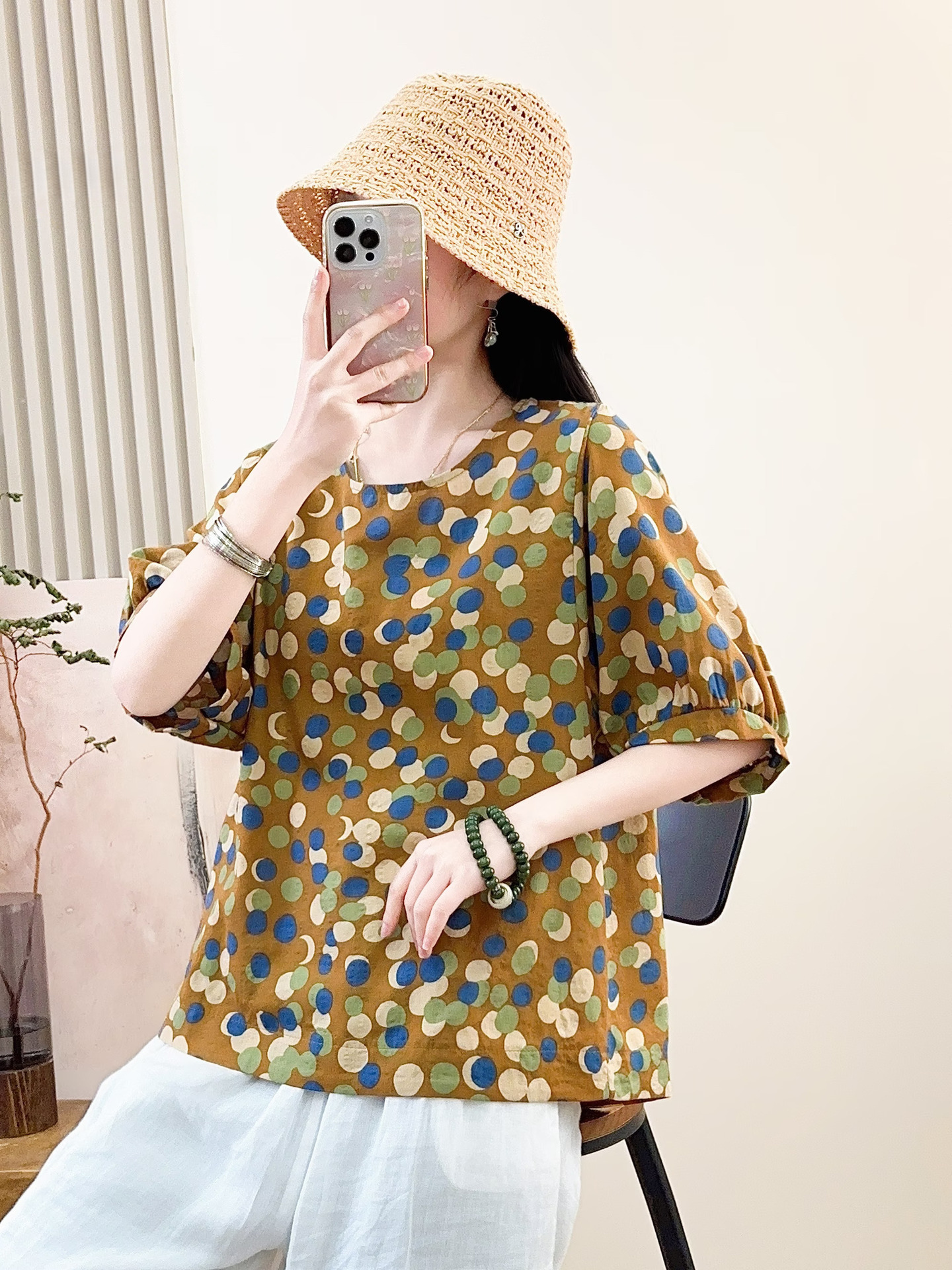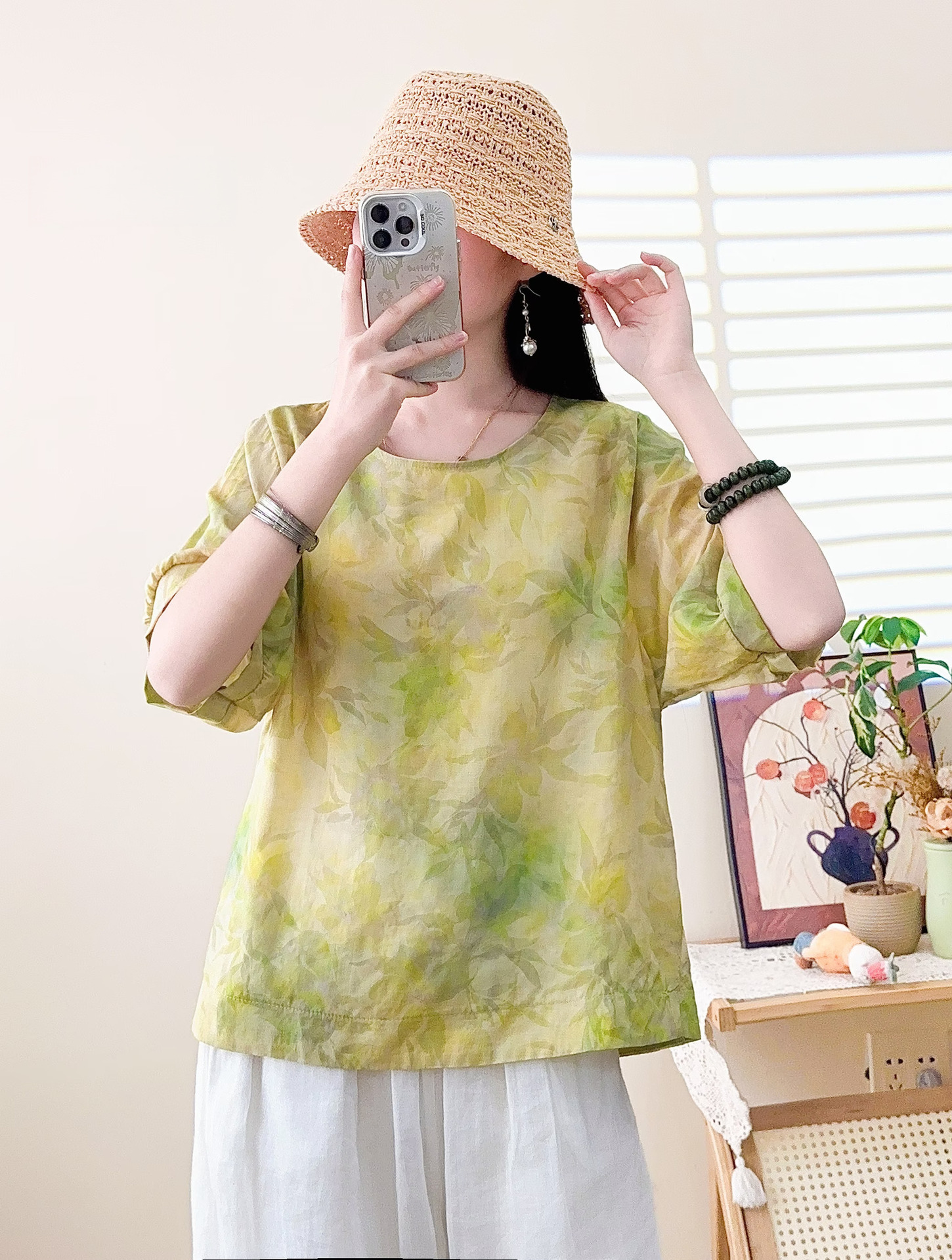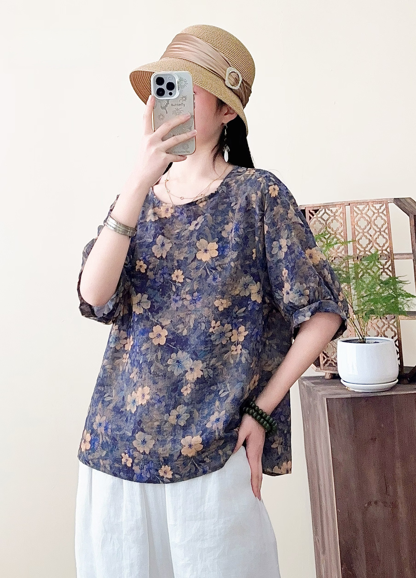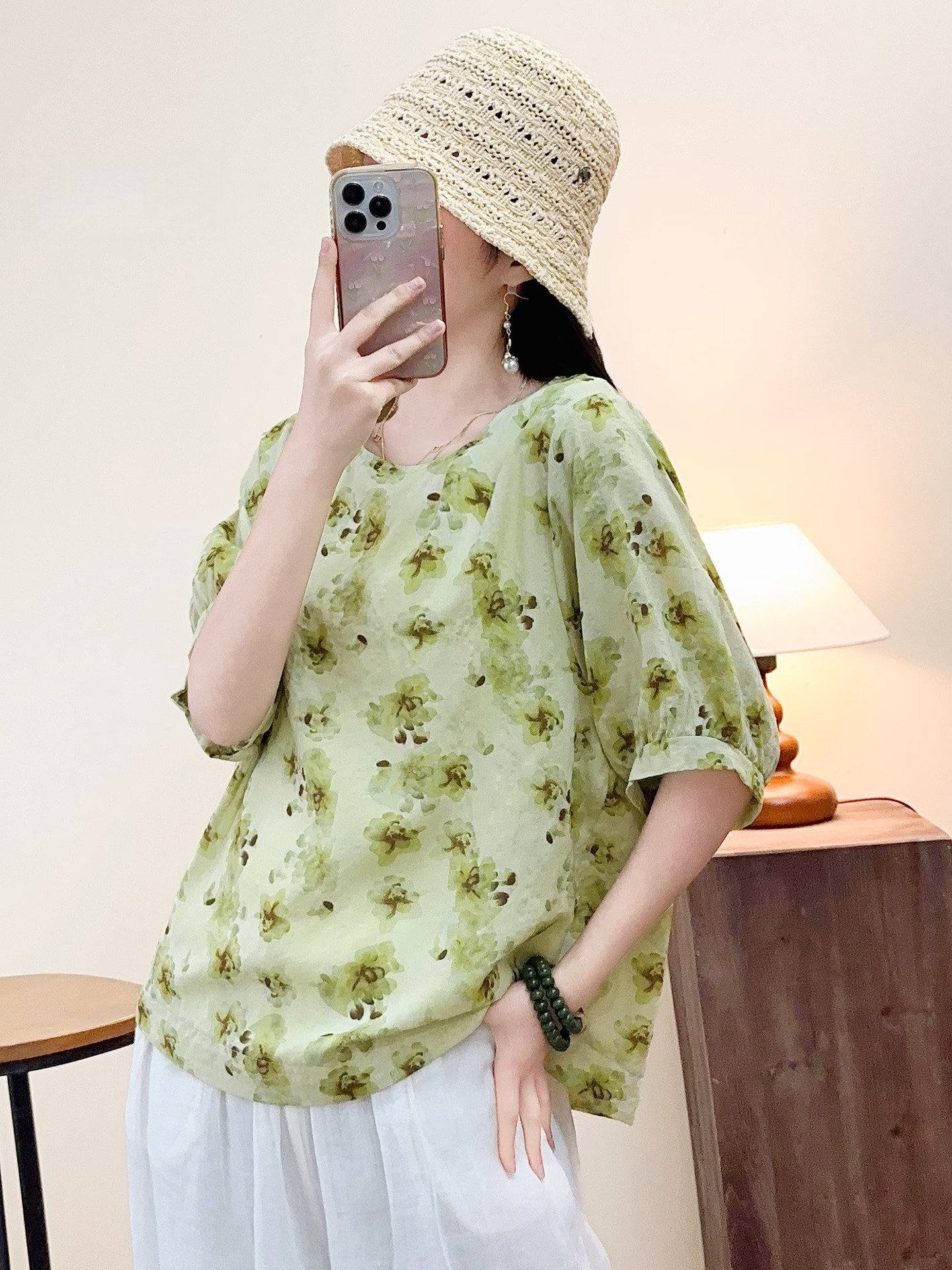 2025夏季新款复古民族风天丝麻短袖T桖圆领印花宽松大码女上衣 RMB:25.00